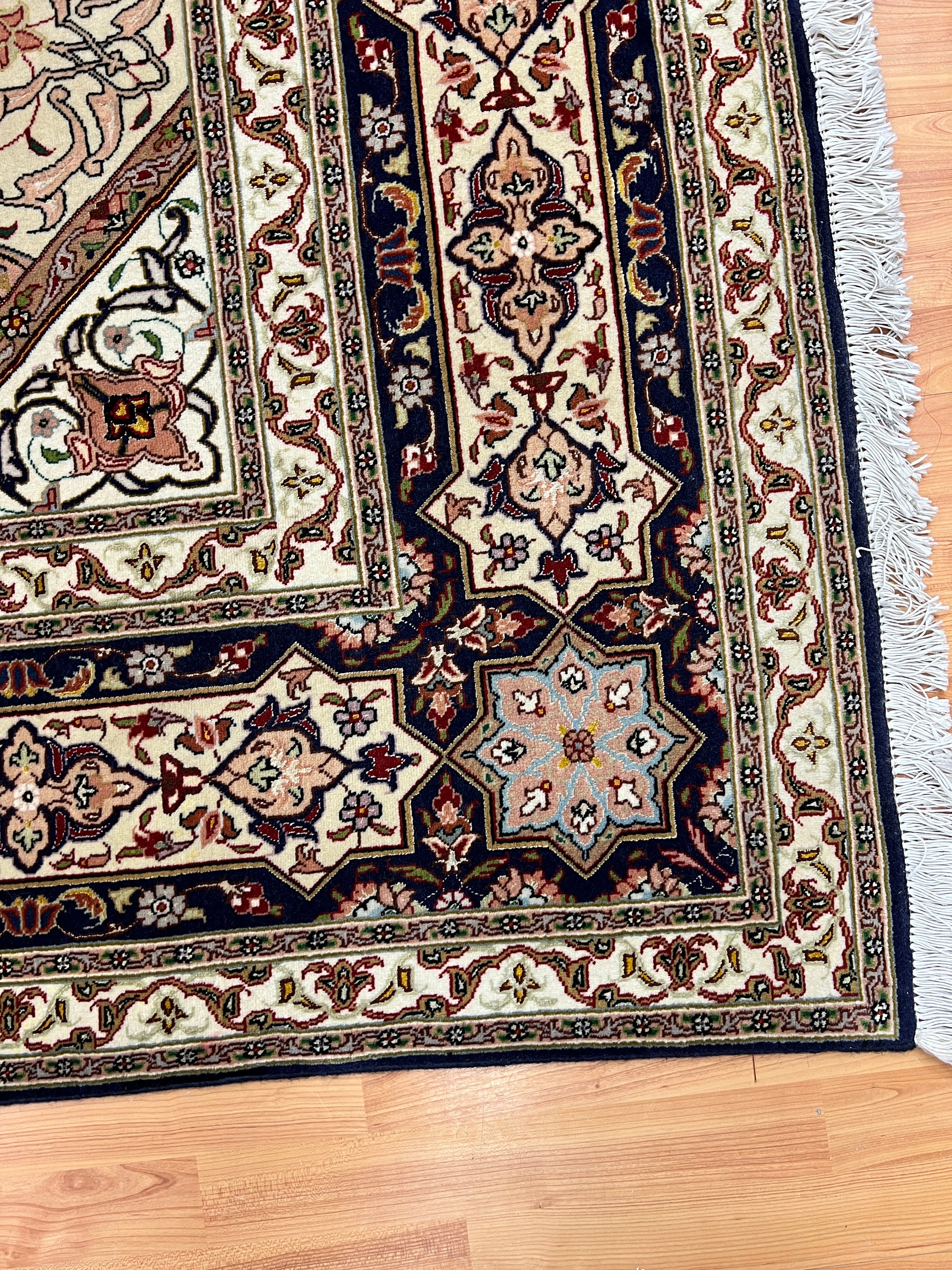 This beautiful Oriental rug is a brand new 8' x 11'5" Turkish with an arch design. This hand knotted rug is made with a wool and silk pile made at 500 KPSI (knots per square inch)/60 Raj.