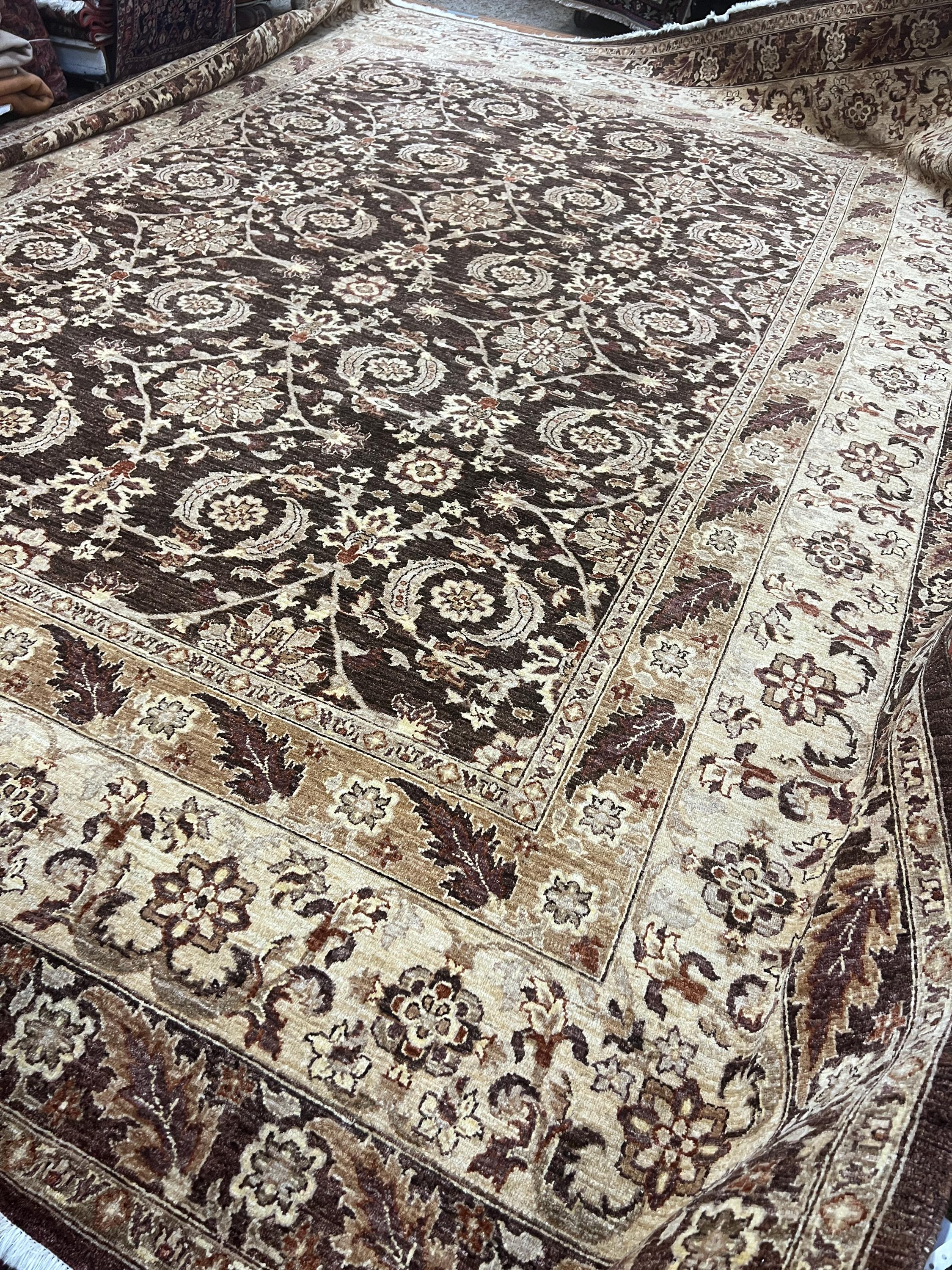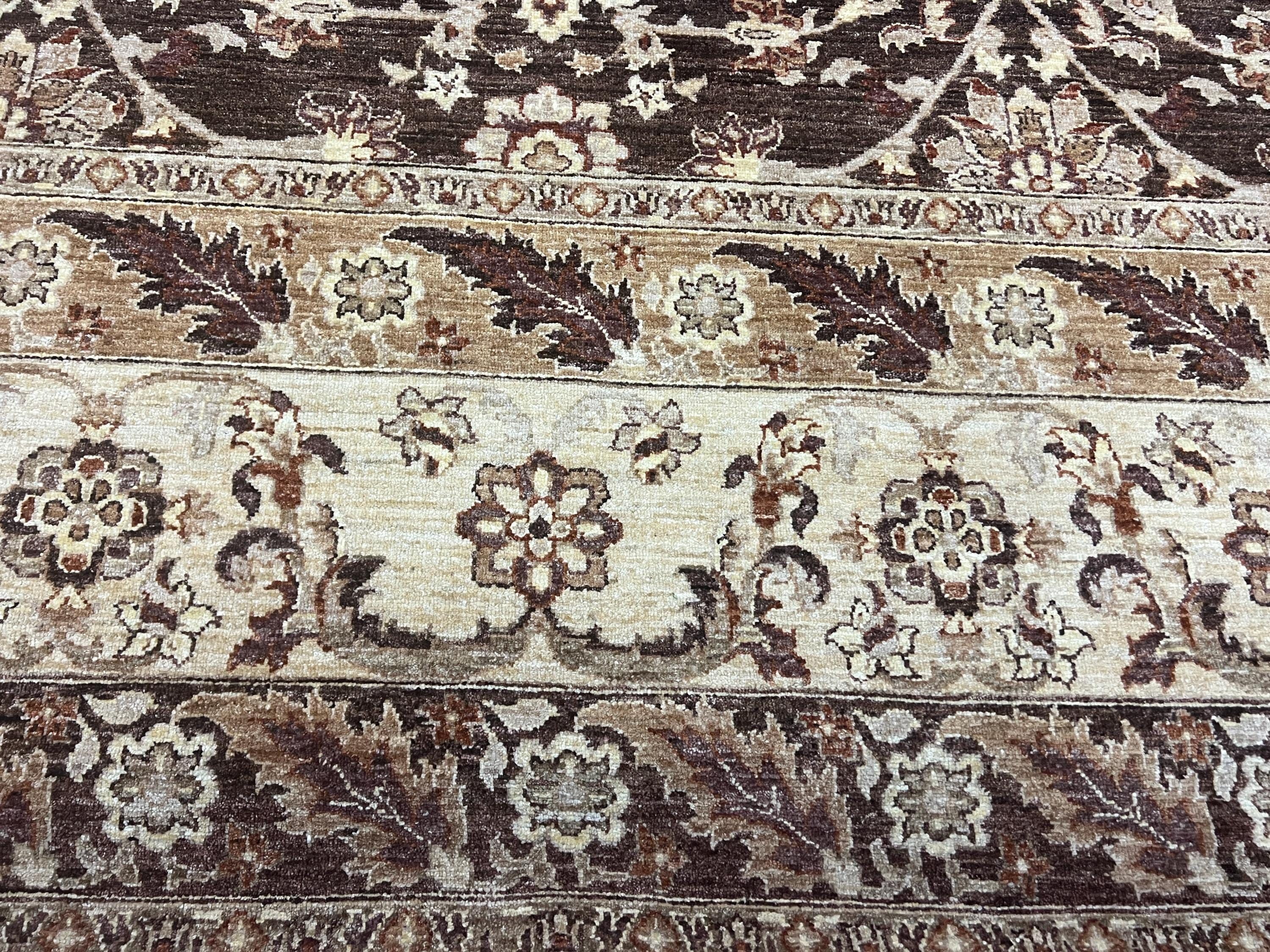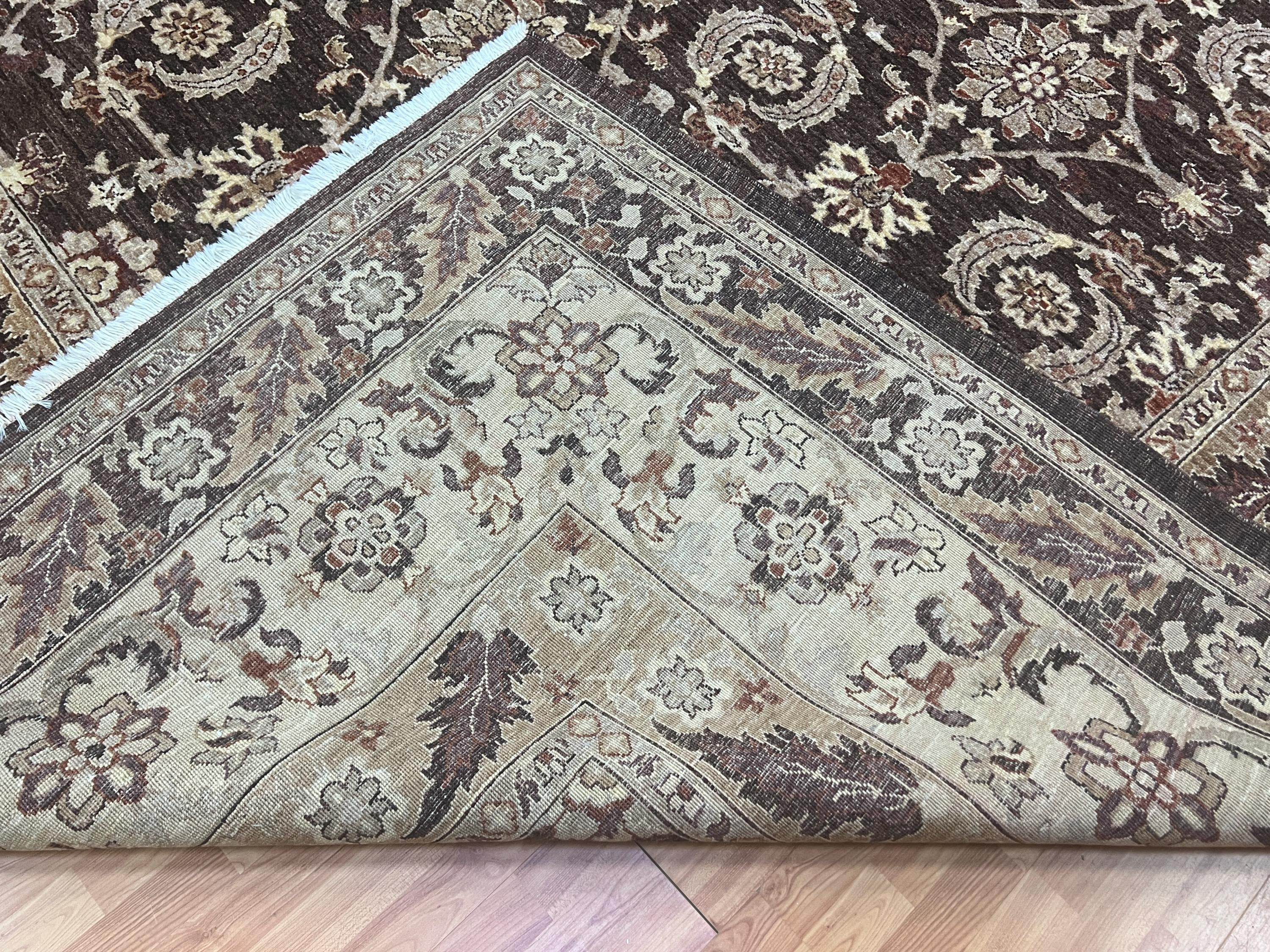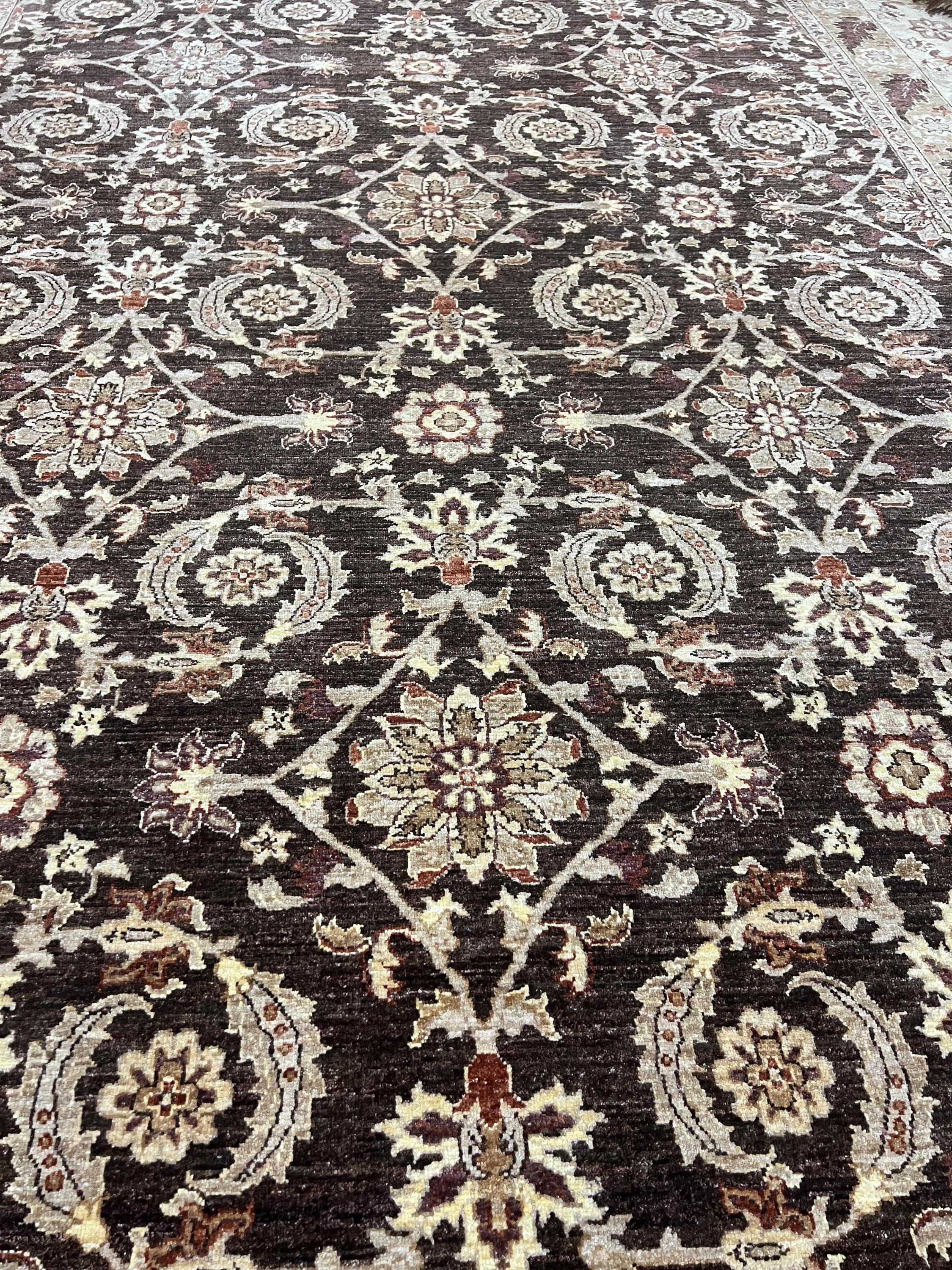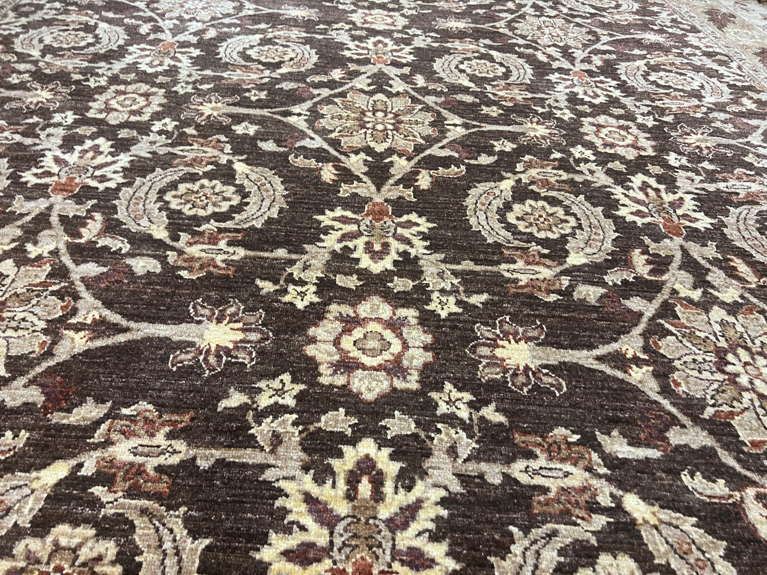 This gorgeous Oriental rug is a 12' x 16'3" Pakistani Peshawar with a dark brown background, circa 2020s. This hand knotted Pakistani rug is made with 100% wool using vegetable dye, has a full pile and is in good condition.