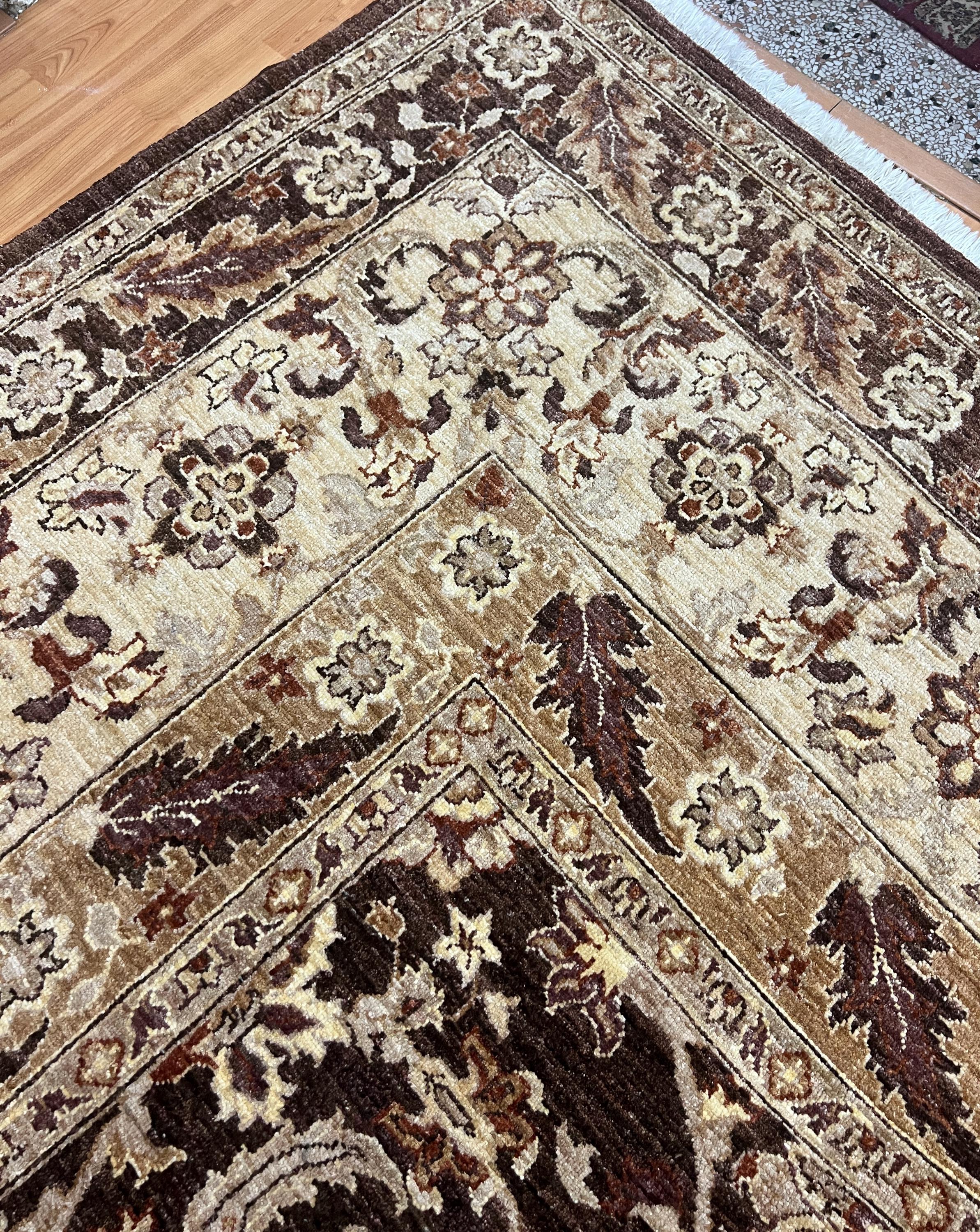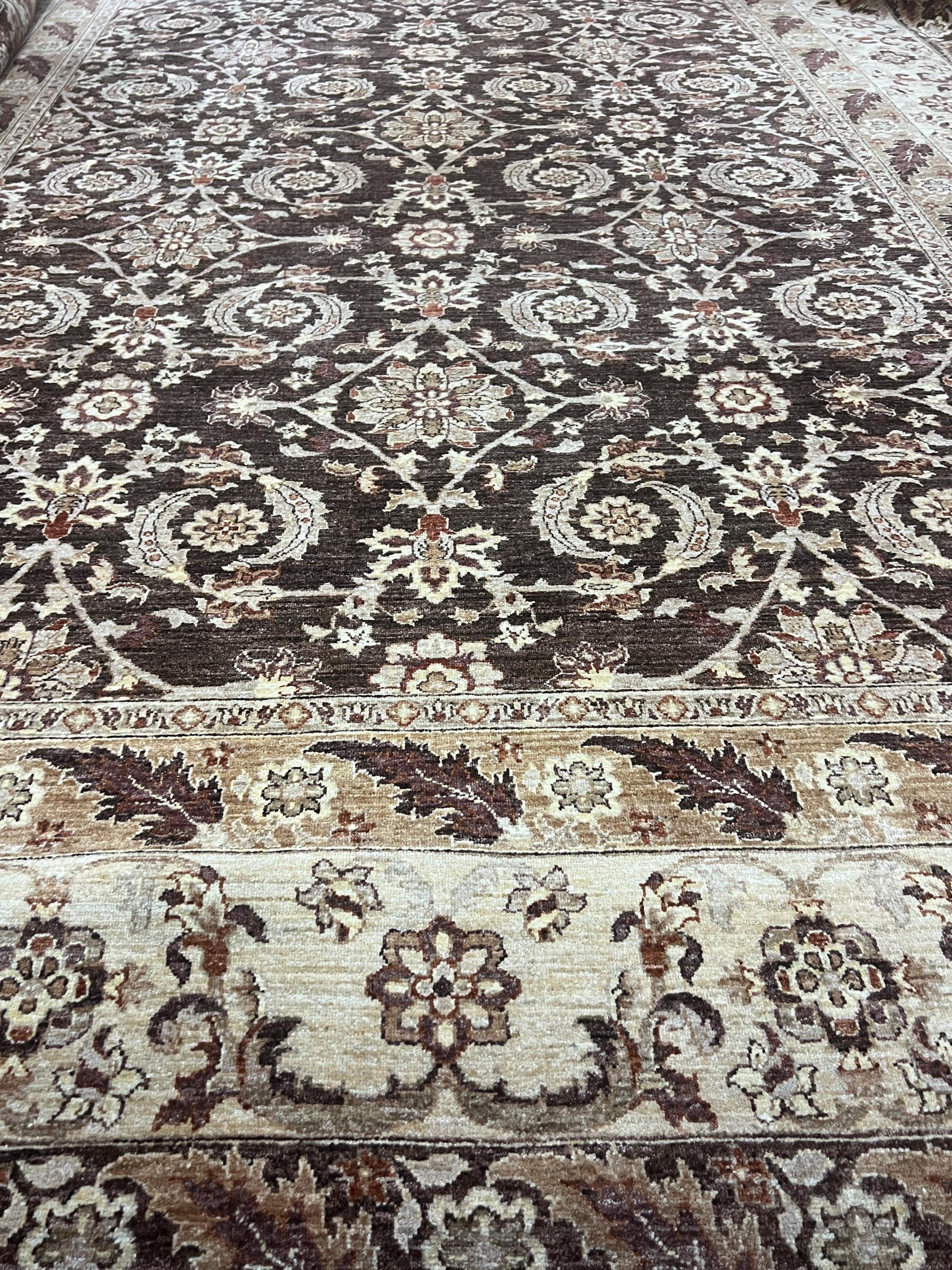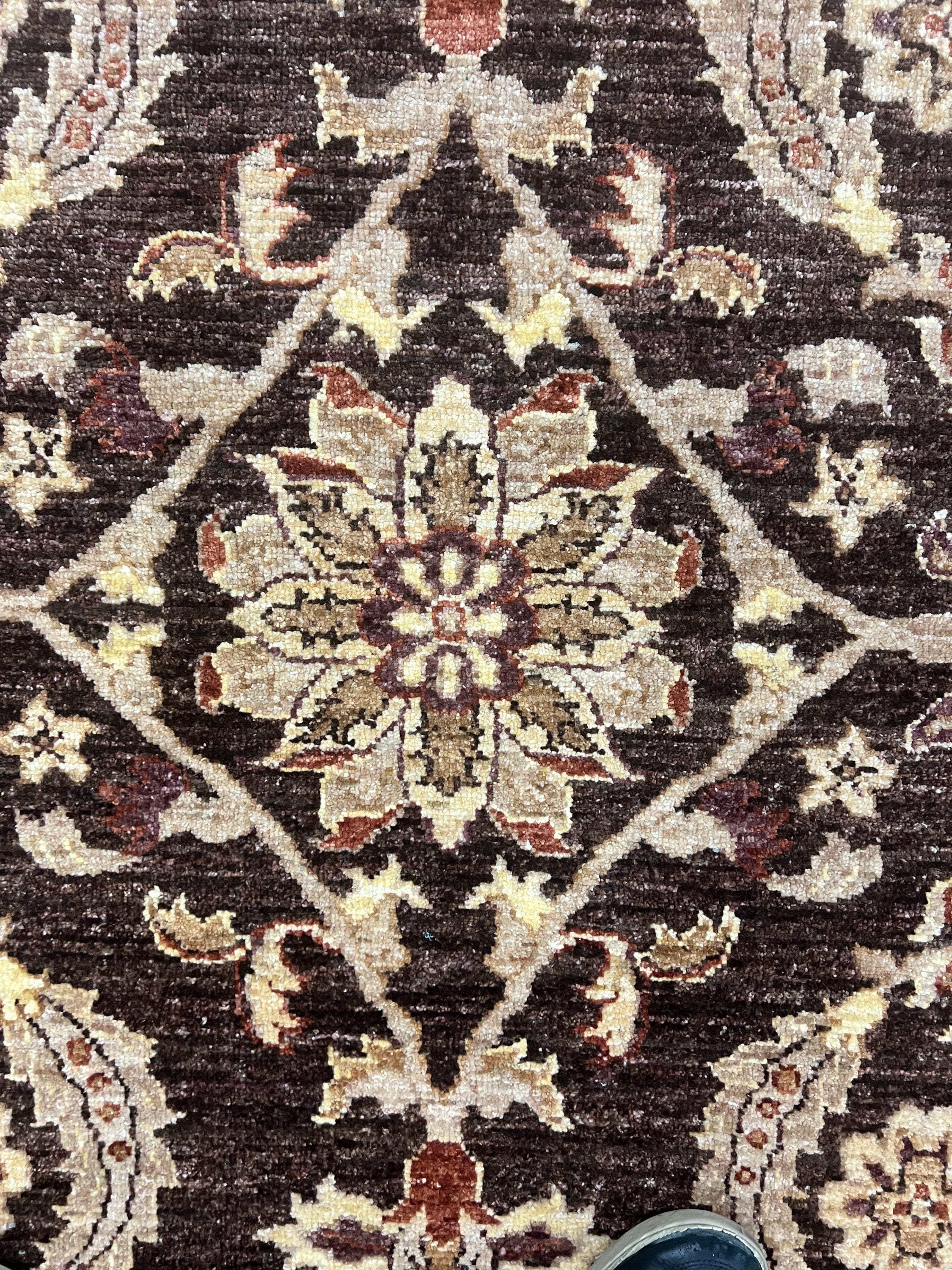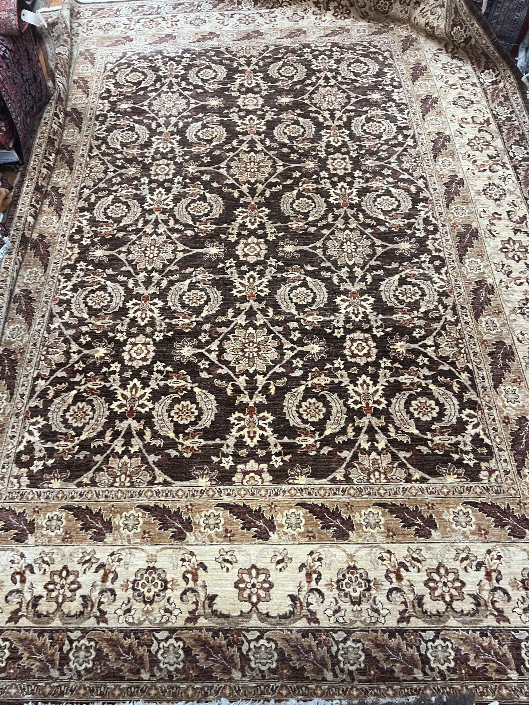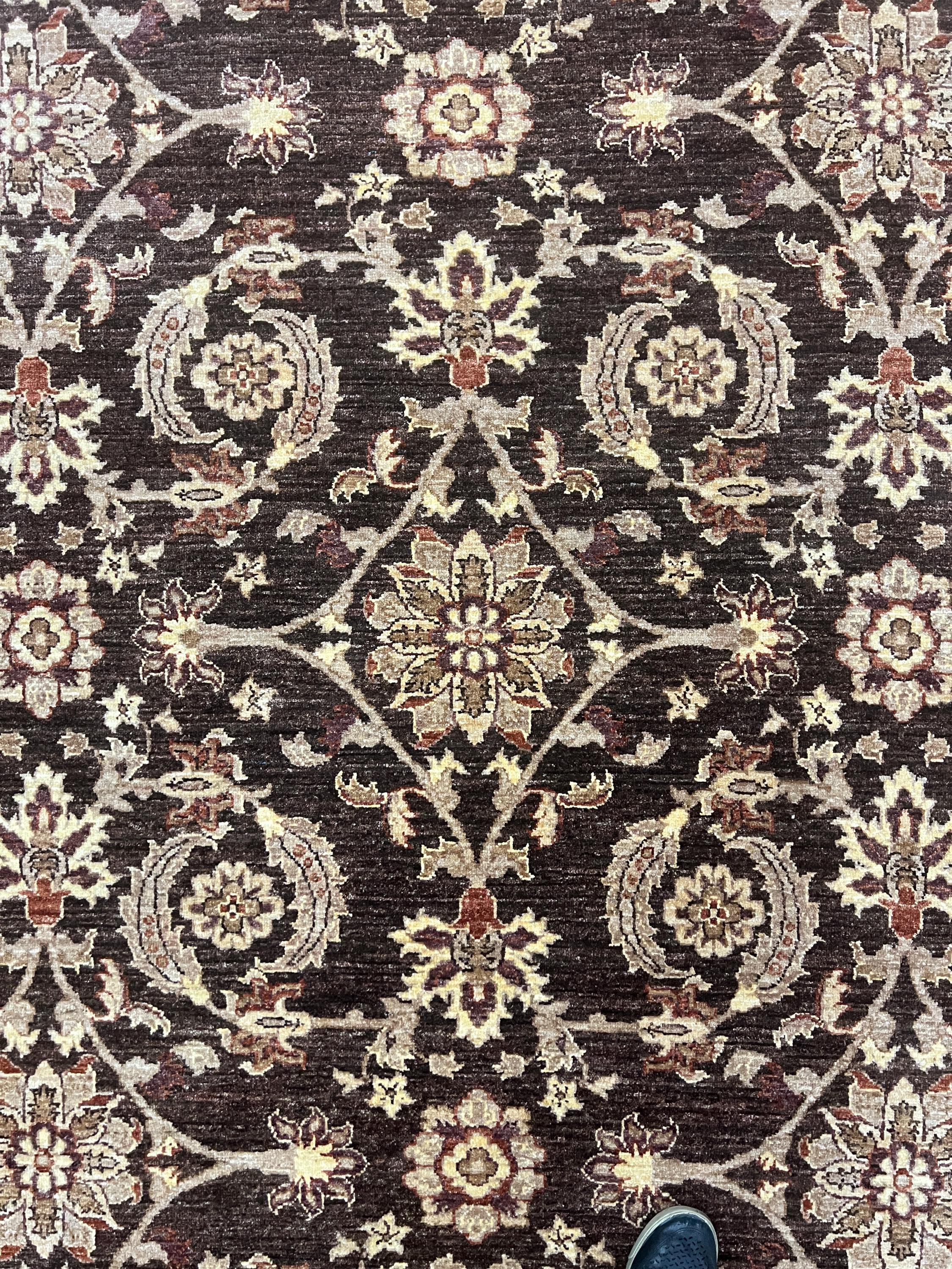 This gorgeous Oriental rug is a 12' x 16'3" Pakistani Peshawar with a dark brown background, circa 2020s. This hand knotted Pakistani rug is made with 100% wool using vegetable dye, has a full pile and is in good condition.