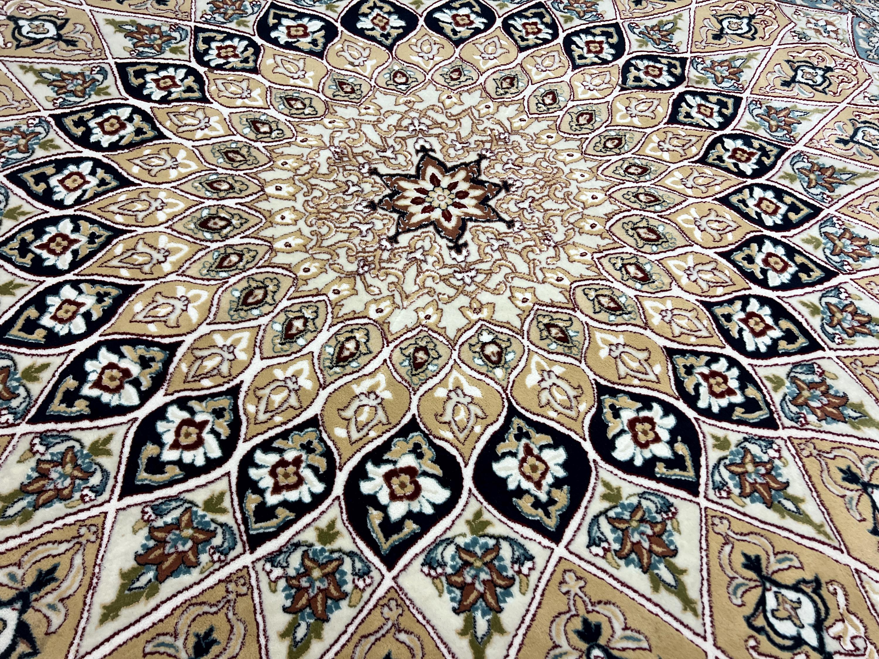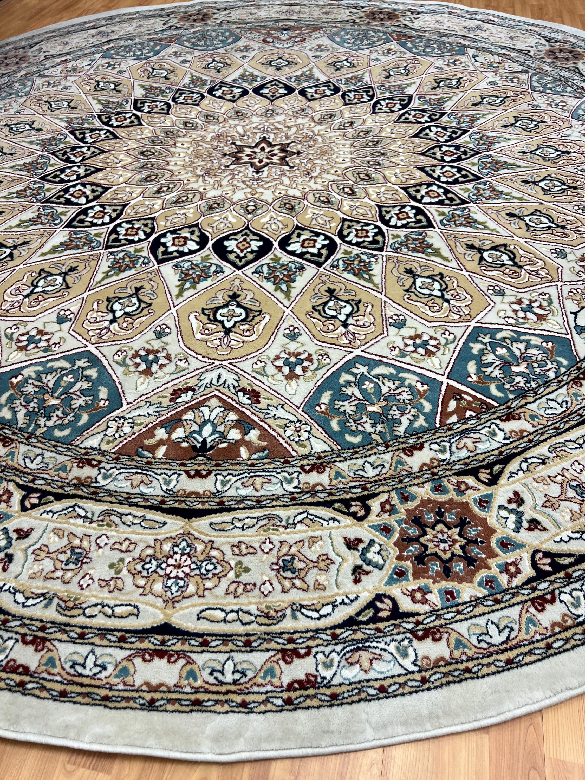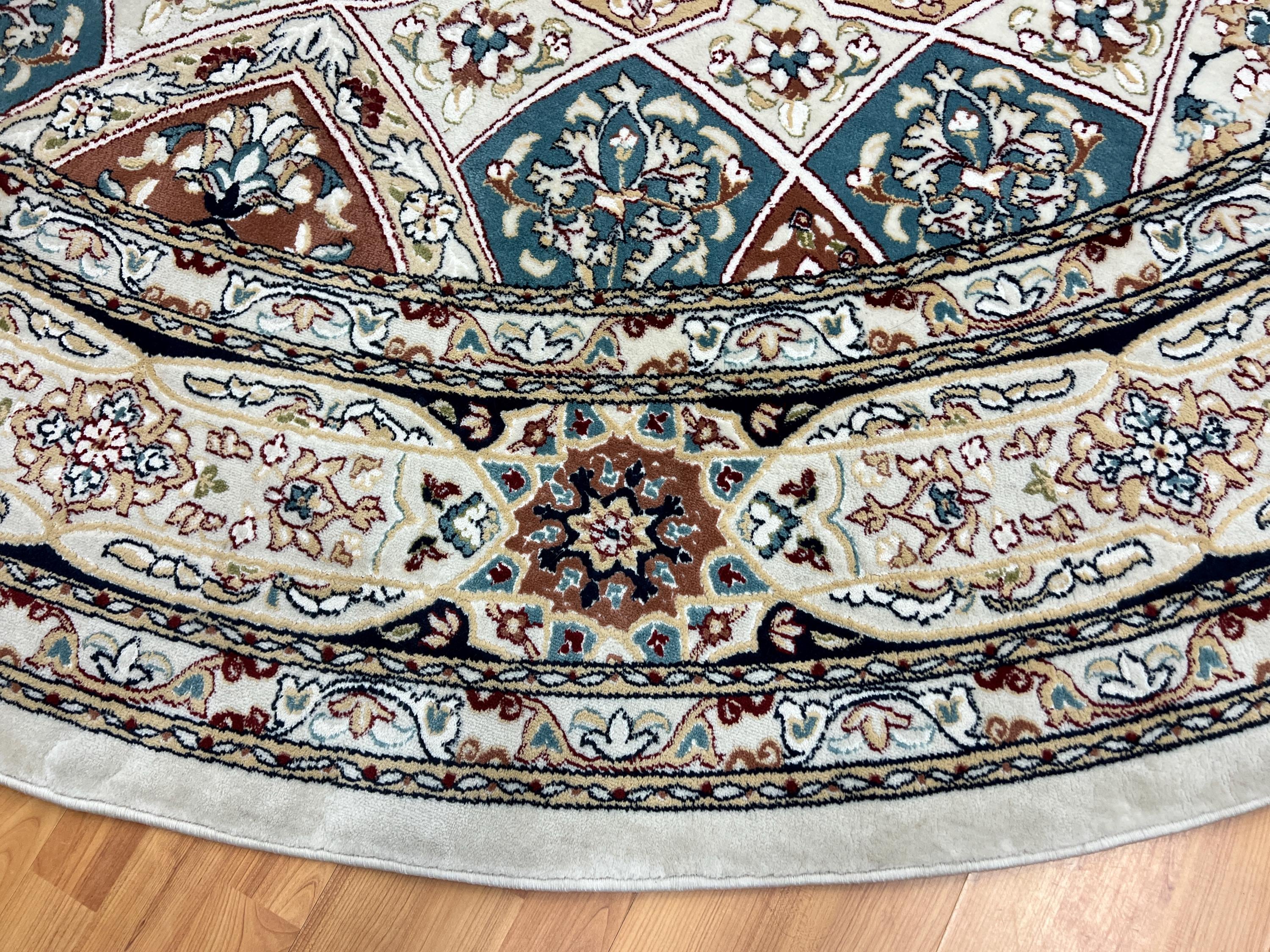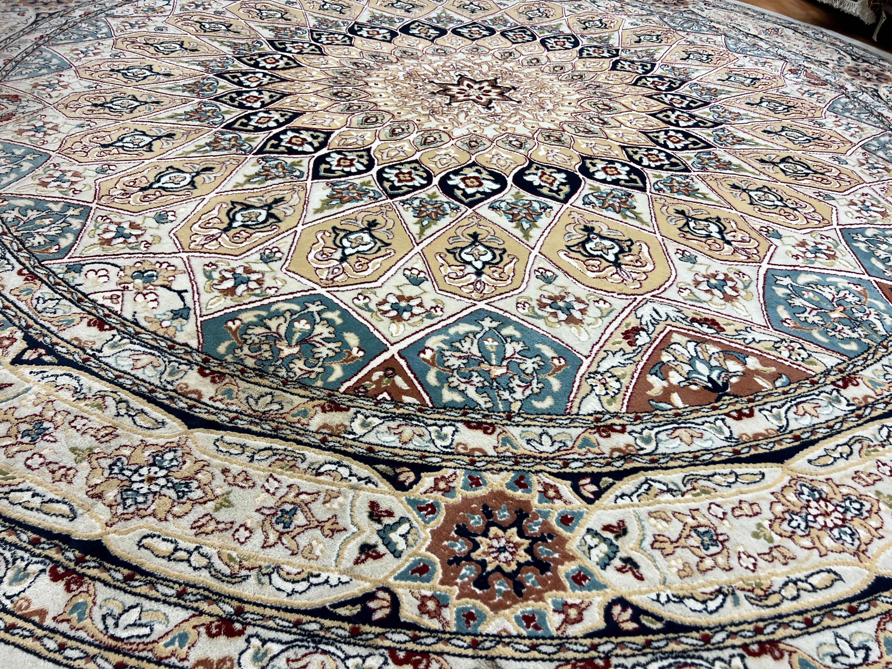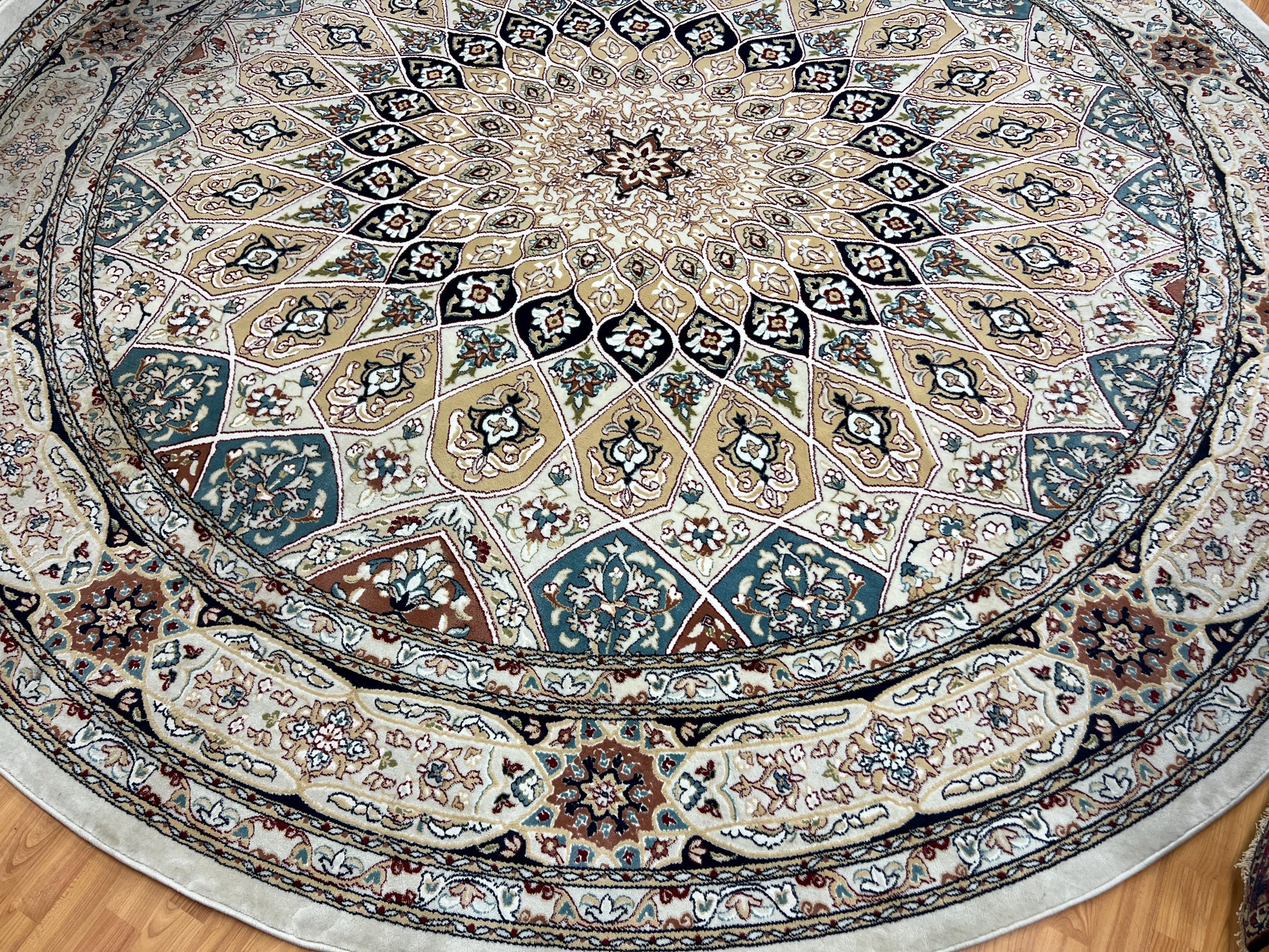 This gorgeous rug is a round 10' x 10’ Turkish with an arch design, circa 2020s. This Turkish rug is made with 100% wool and is in good condition. This rug is sold as a final sale, no returns accepted.