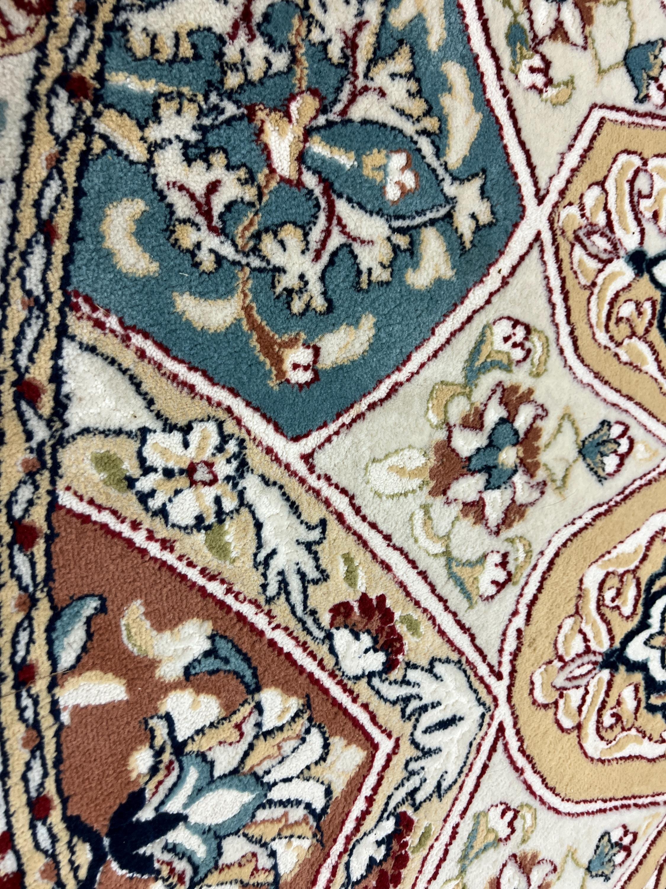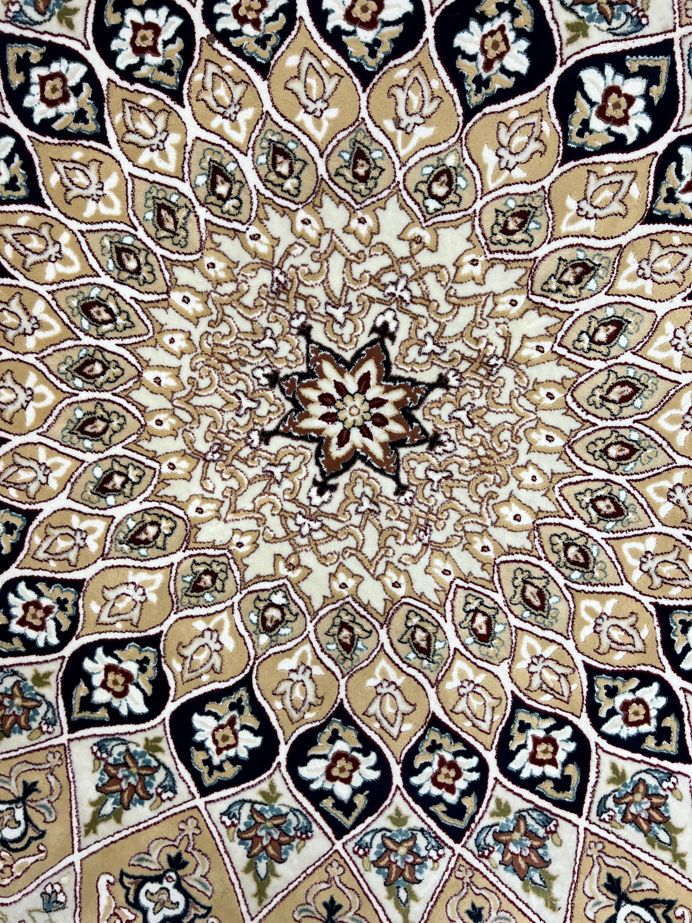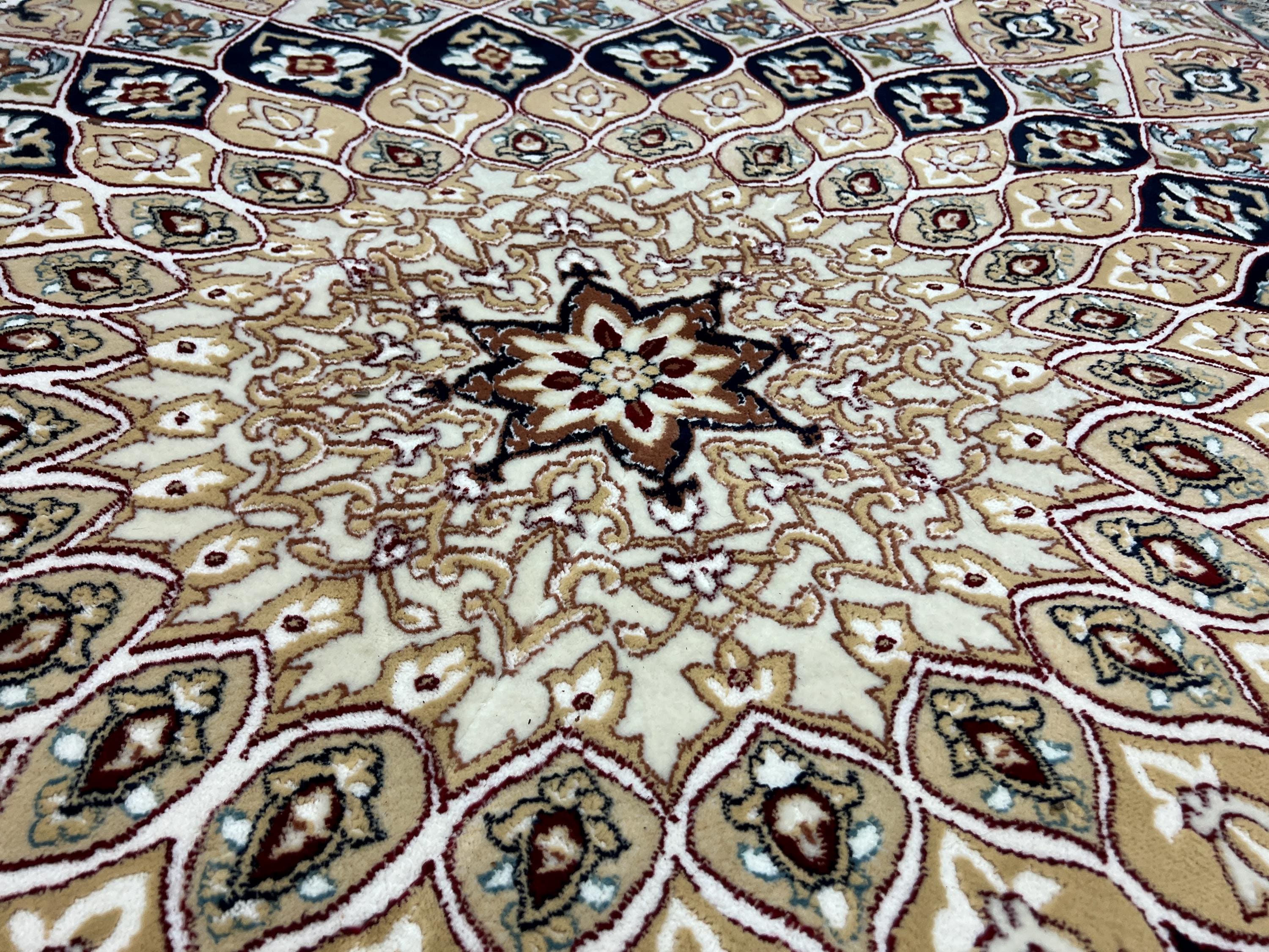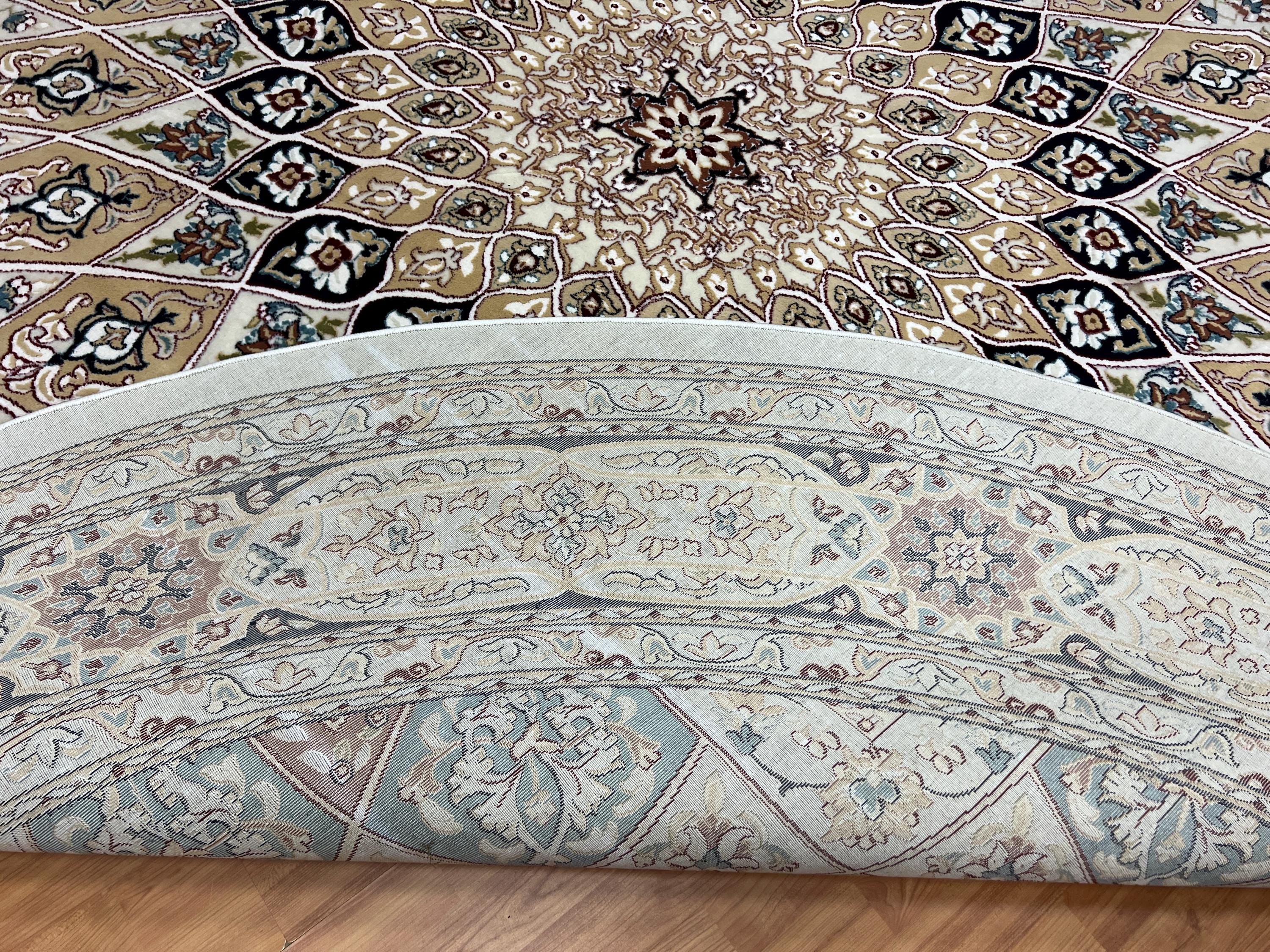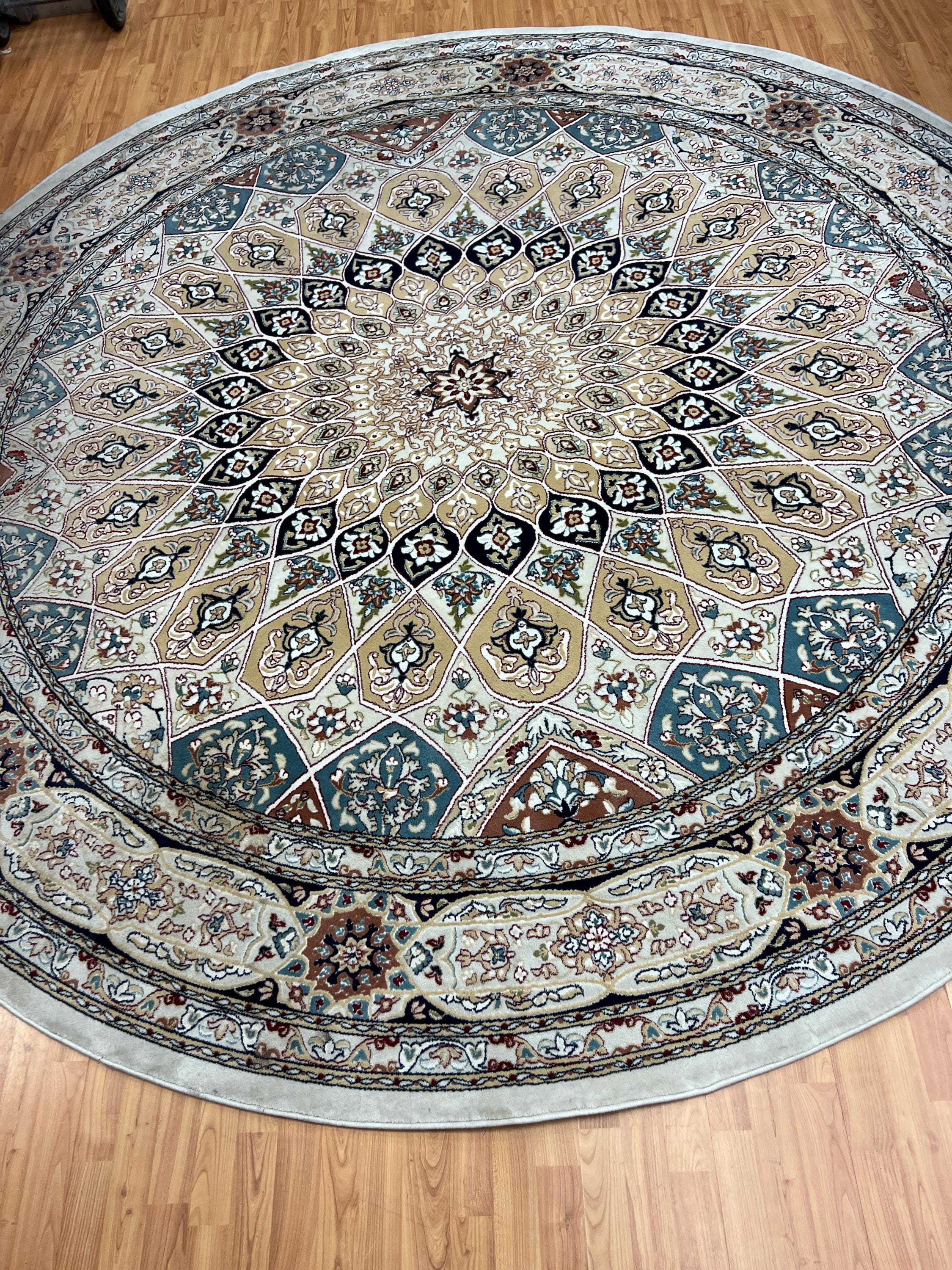 This gorgeous rug is a round 10' x 10’ Turkish with an arch design, circa 2020s. This Turkish rug is made with 100% wool and is in good condition. This rug is sold as a final sale, no returns accepted.