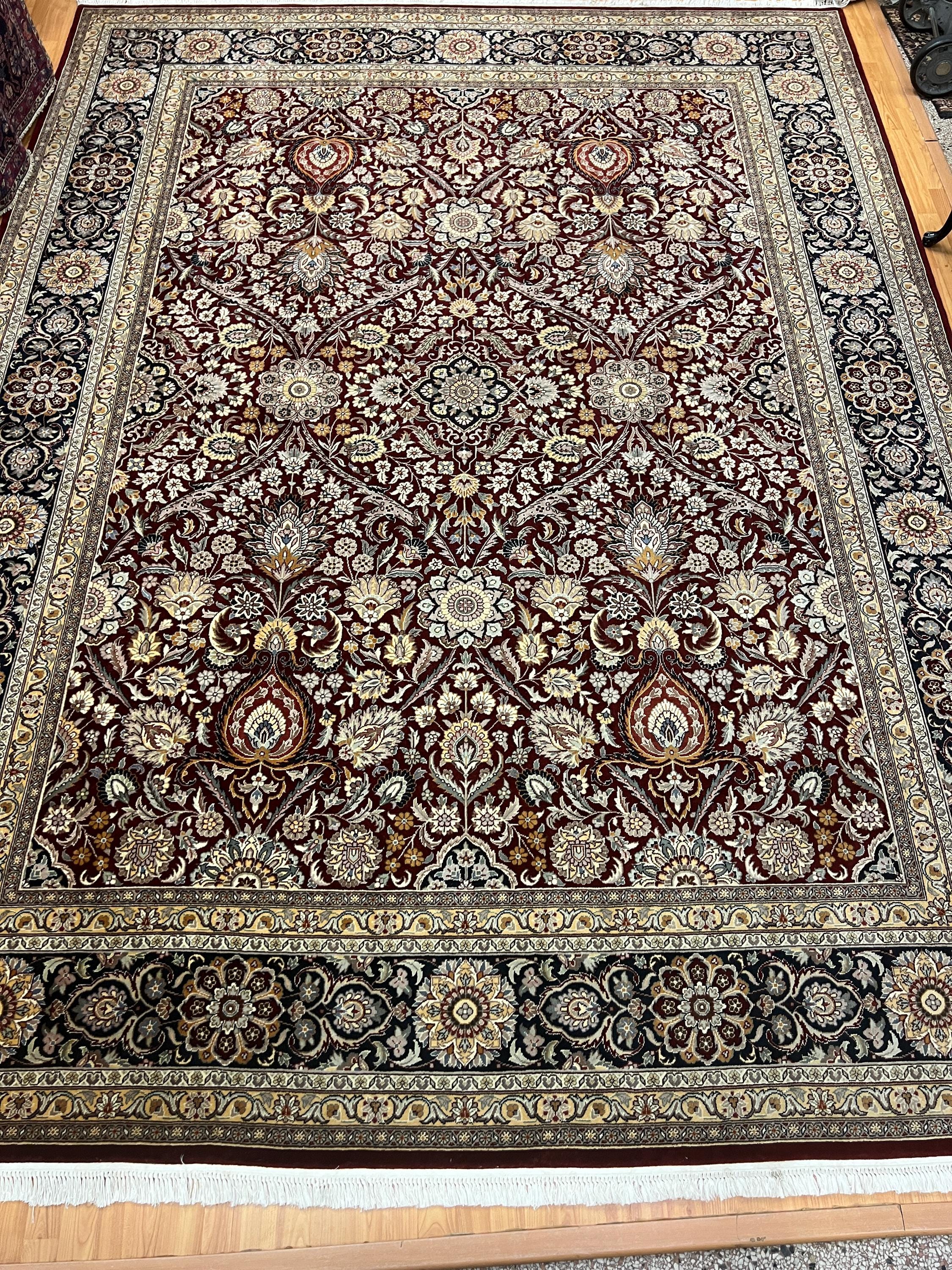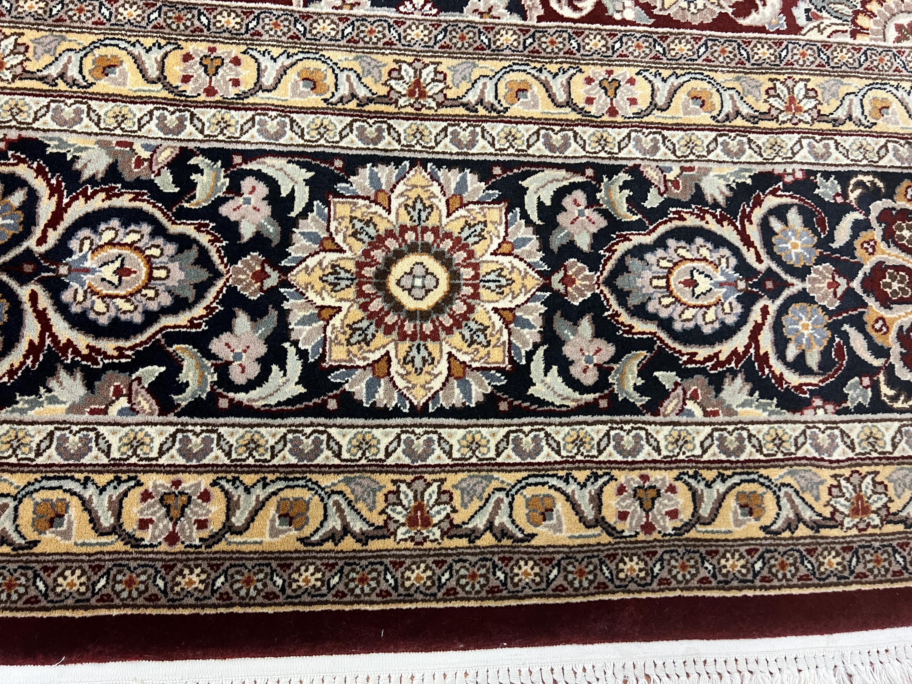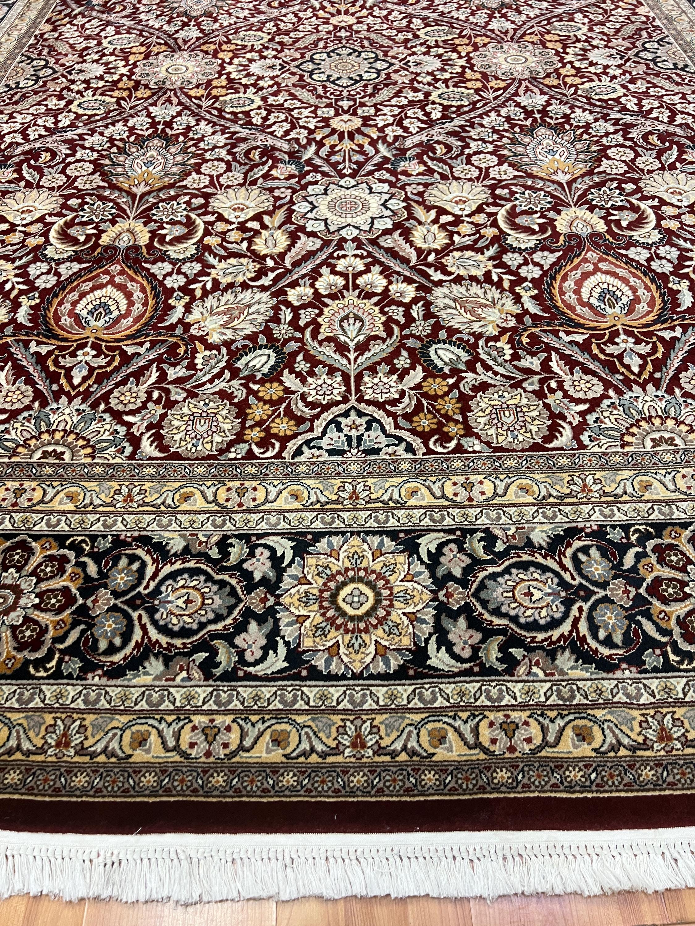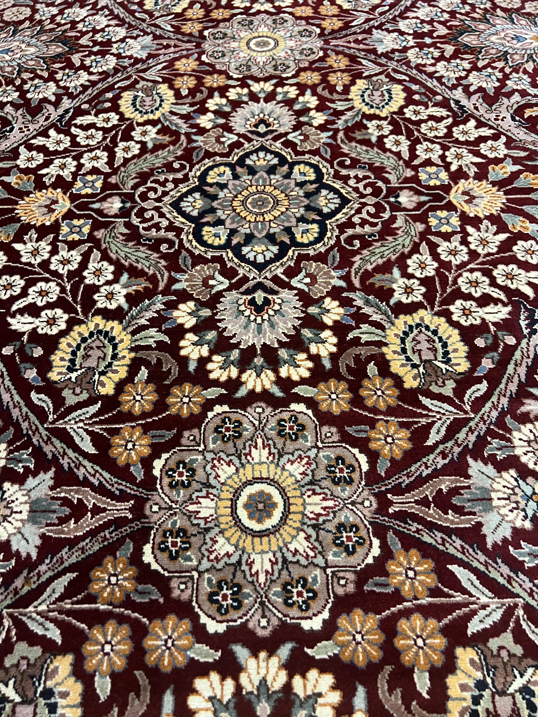 This gorgeous Oriental rug is a new 9'1" x 12'1" Indian Jaipur with a burgundy background, circa 2010s. This hand made Indian Jaipur is very finely made with 100% wool.