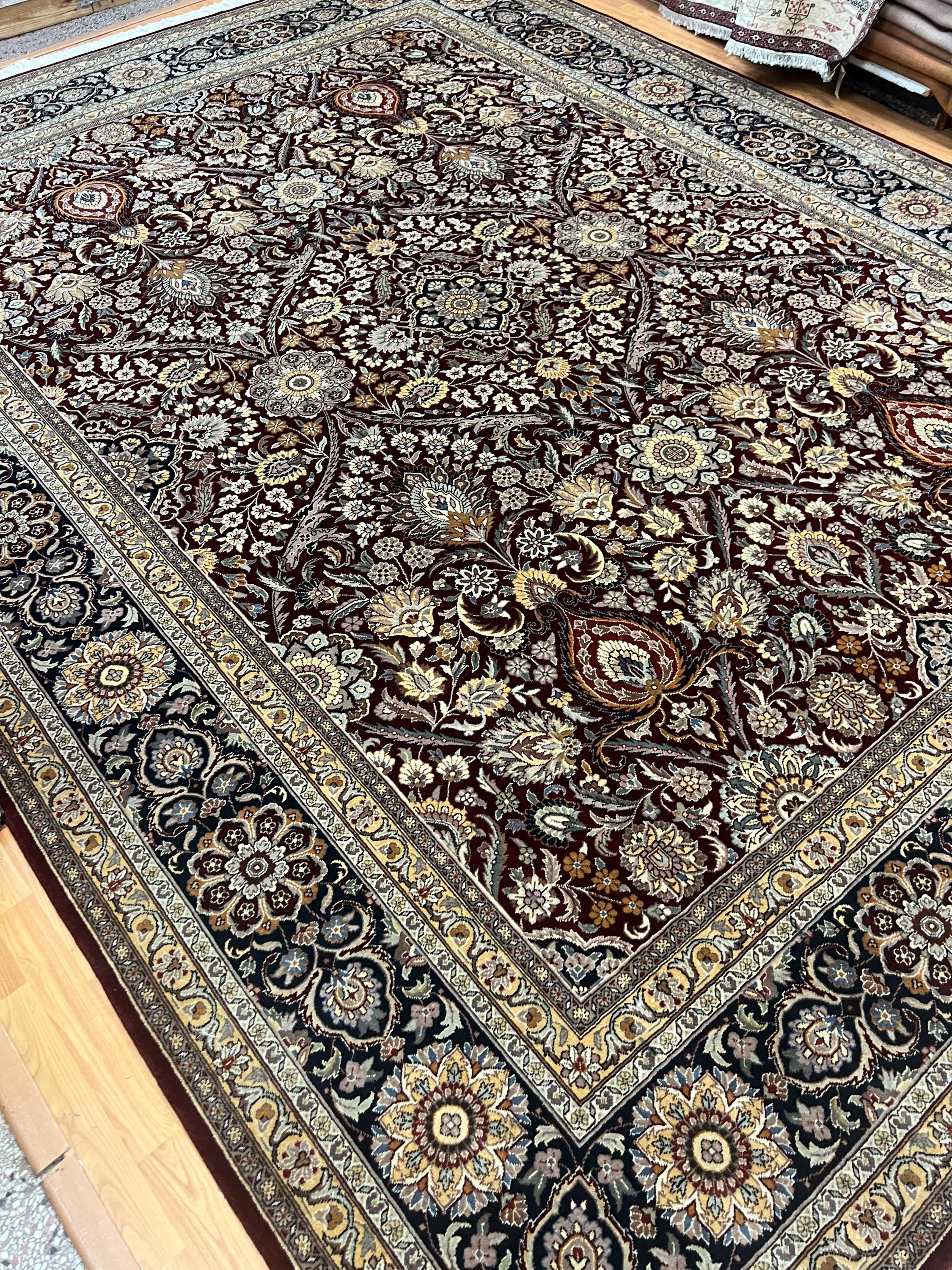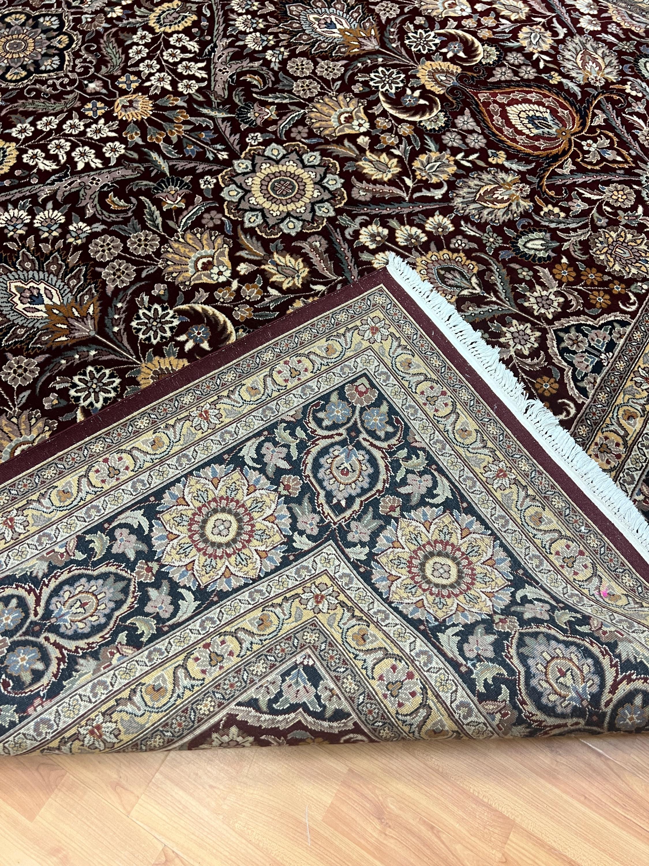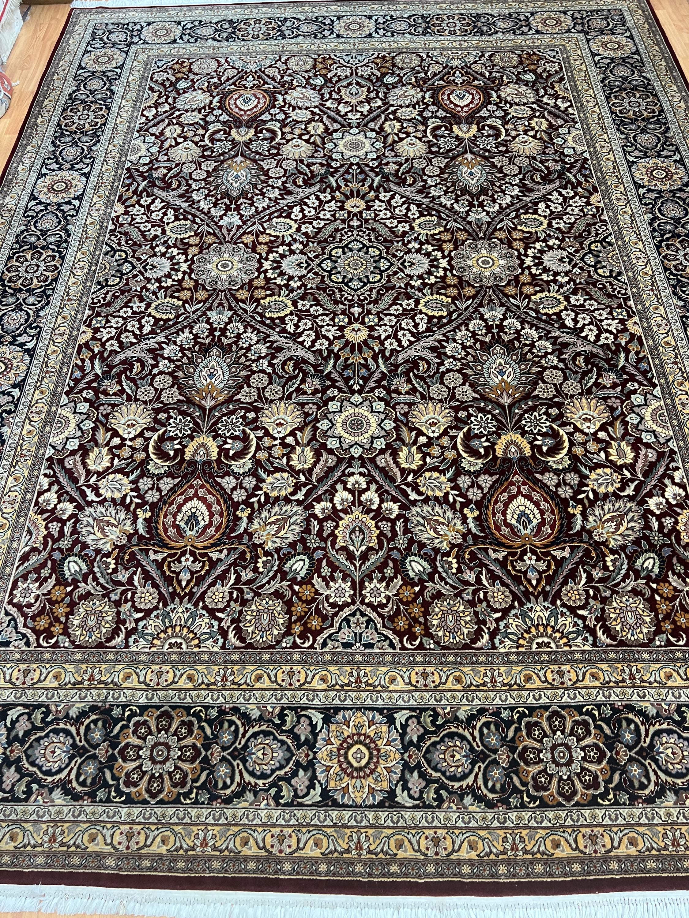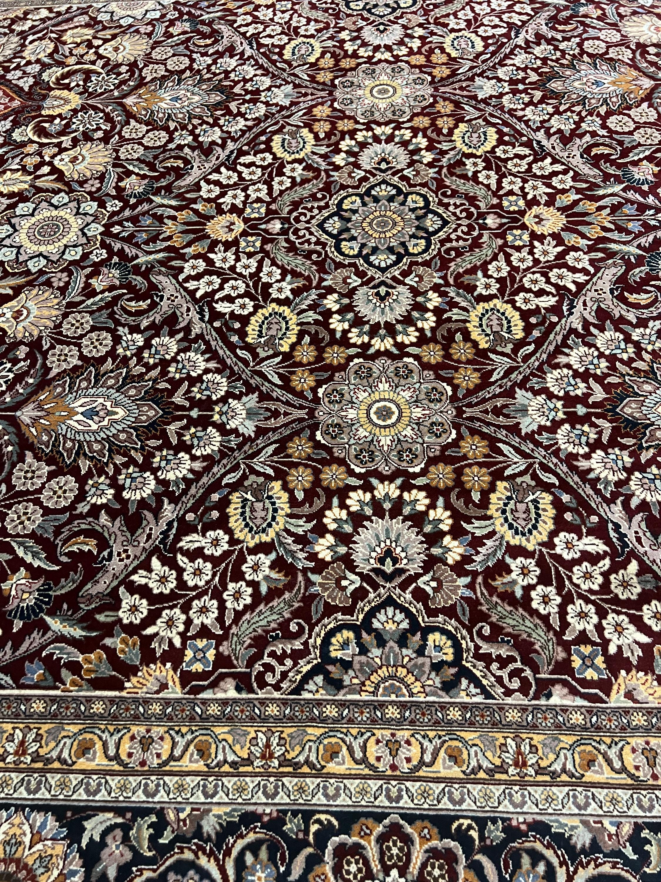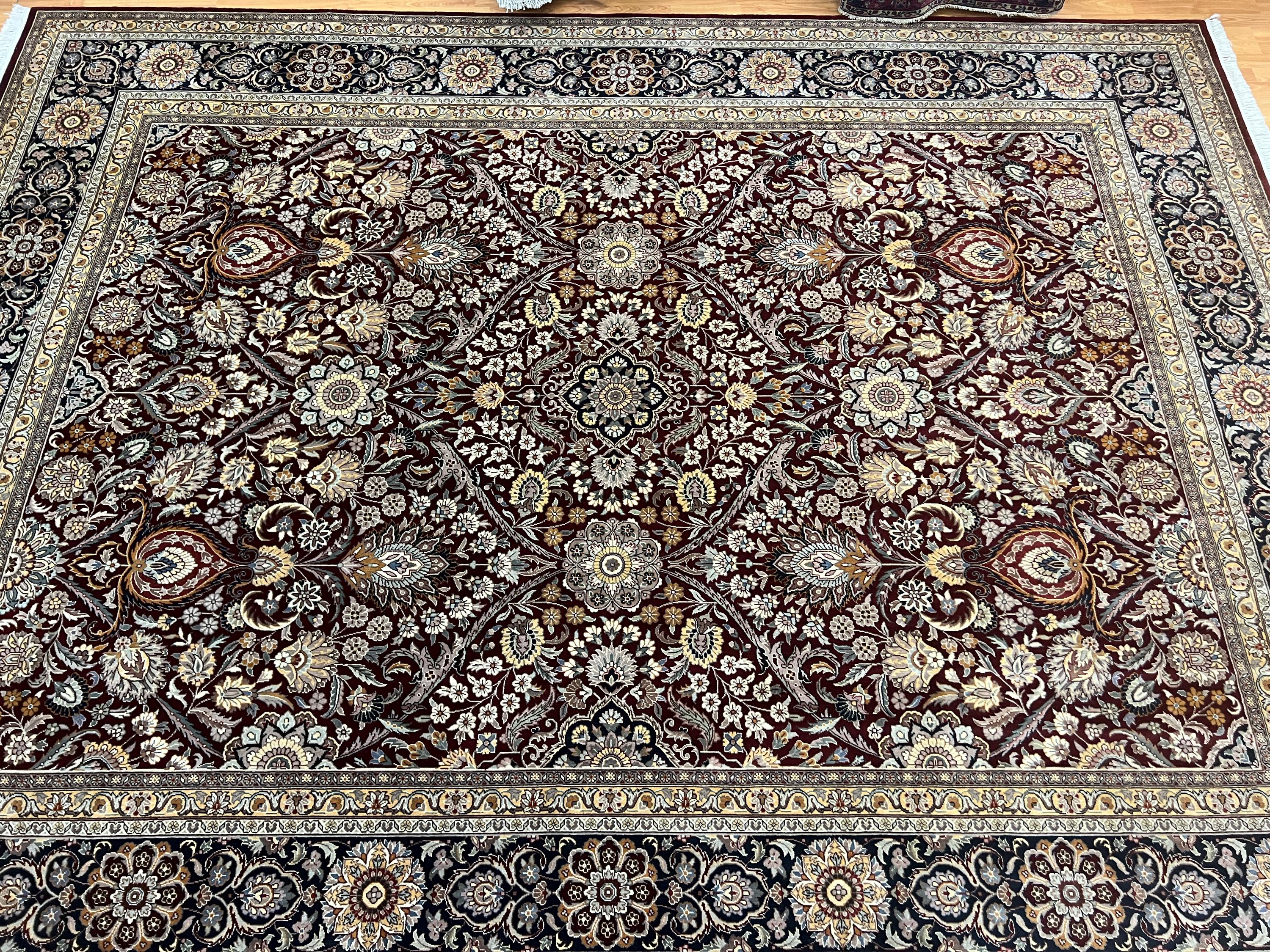 This gorgeous Oriental rug is a new 9'1" x 12'1" Indian Jaipur with a burgundy background, circa 2010s. This hand made Indian Jaipur is very finely made with 100% wool.