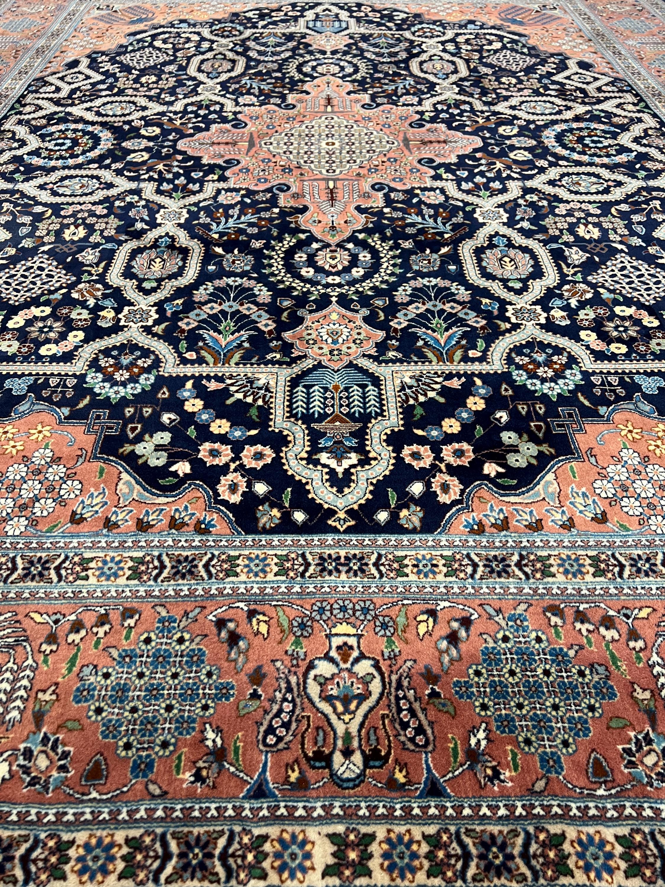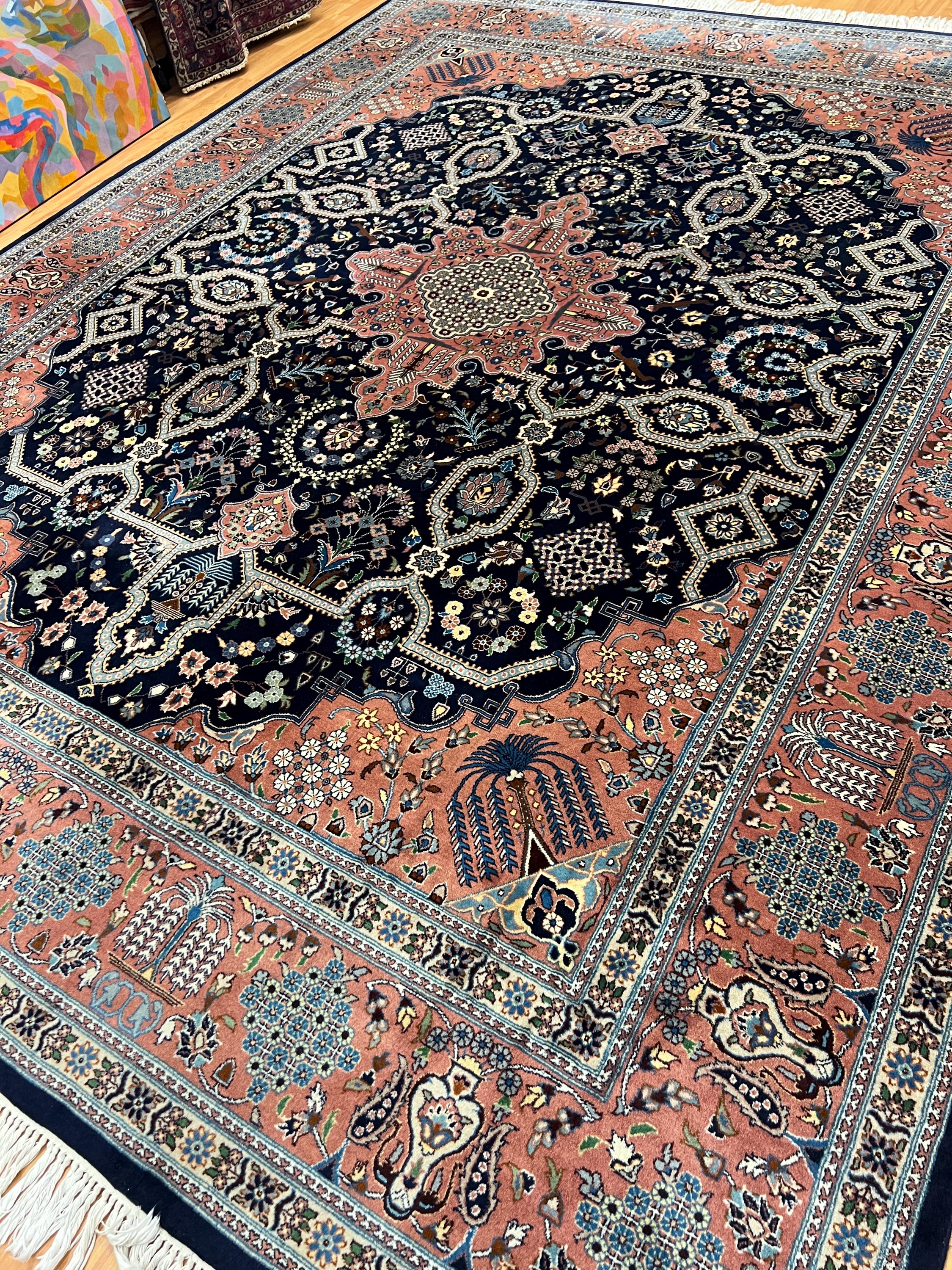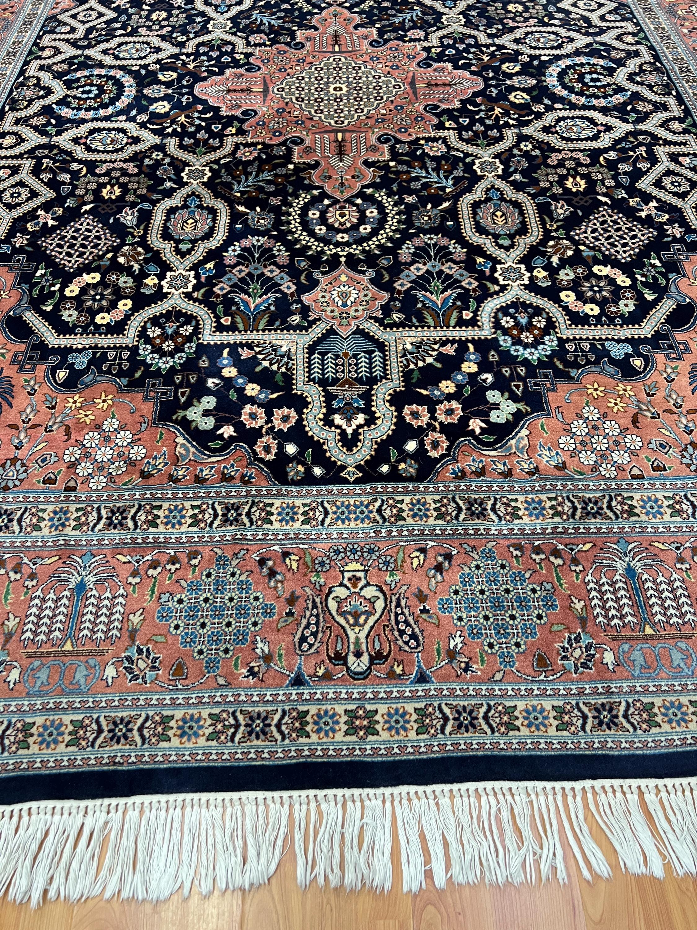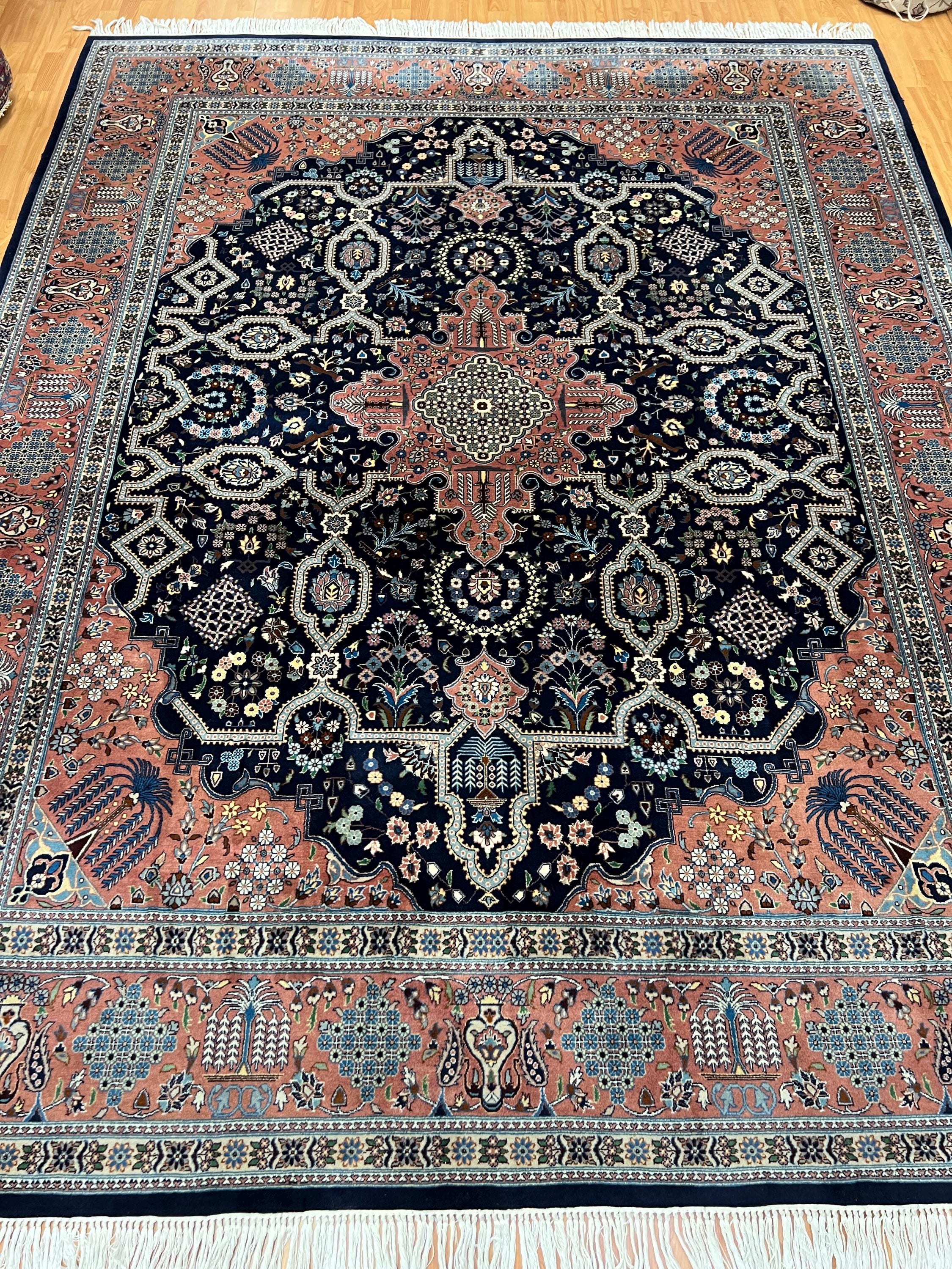 This gorgeous Oriental rug is an 8'1" x 10'5" Pakistani Tabriz with a dark blue background and rust colored border, circa 2020s. This hand knotted Pakistani Tabriz has is made with 100% wool, has full pile and is good condition.