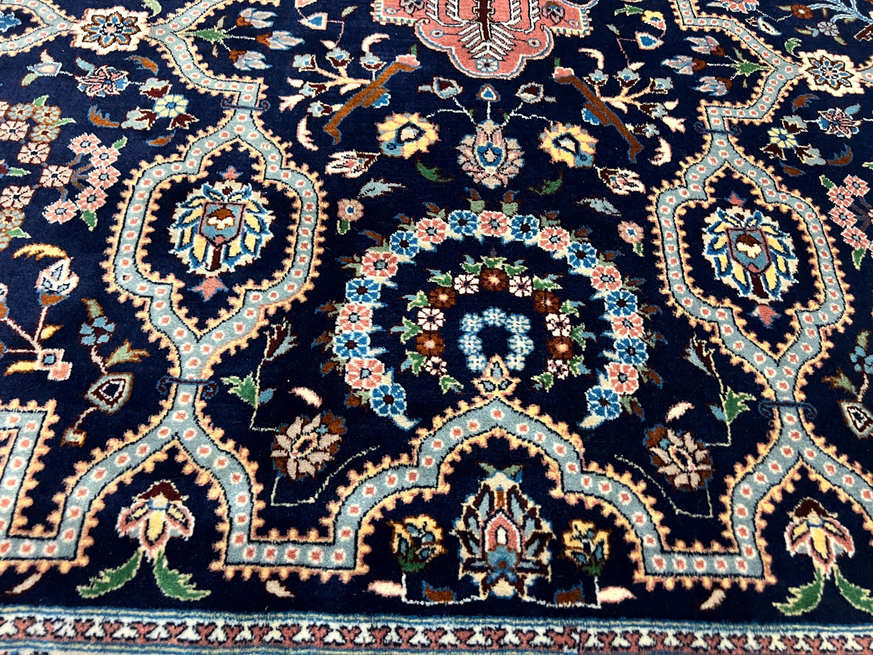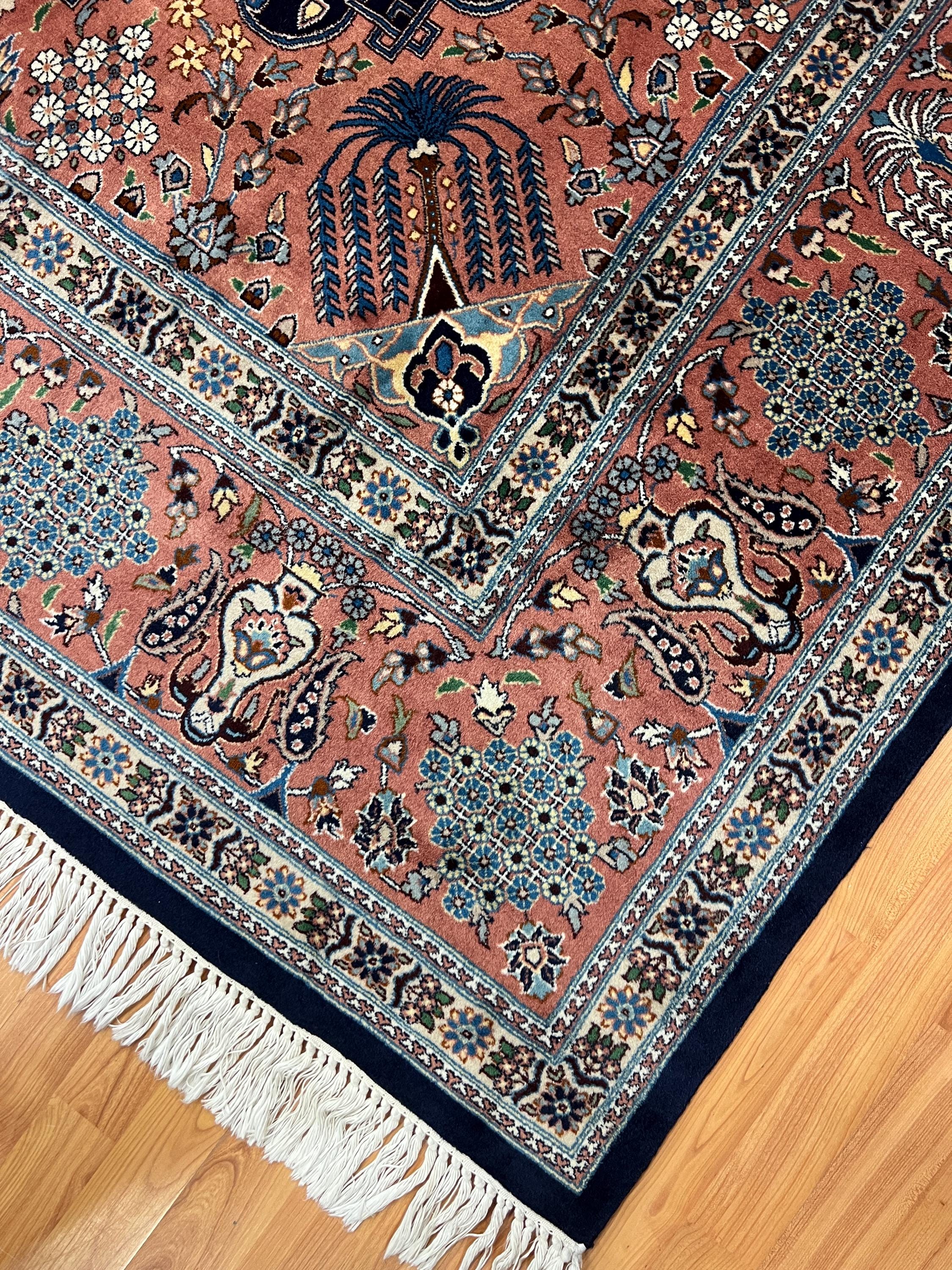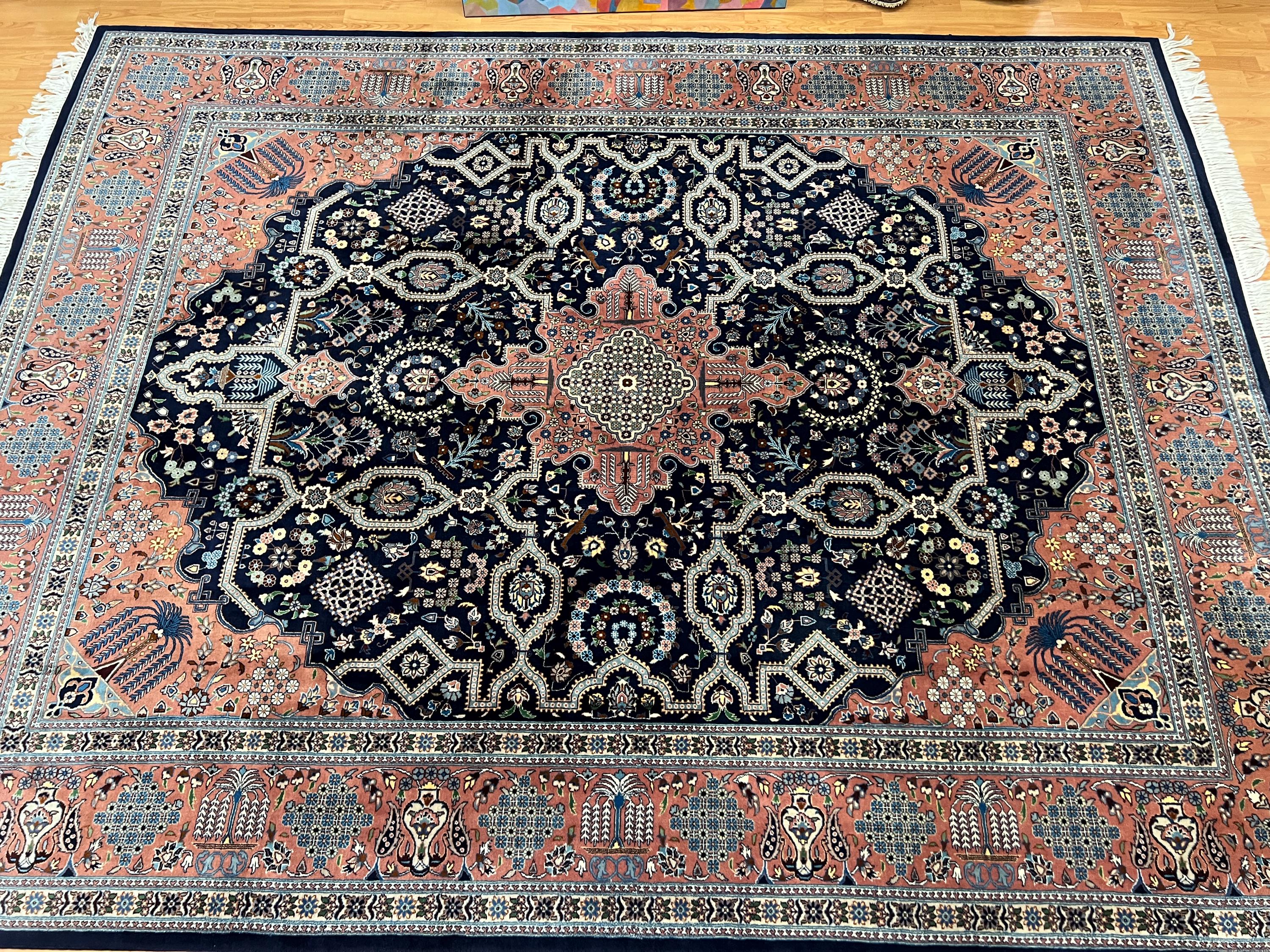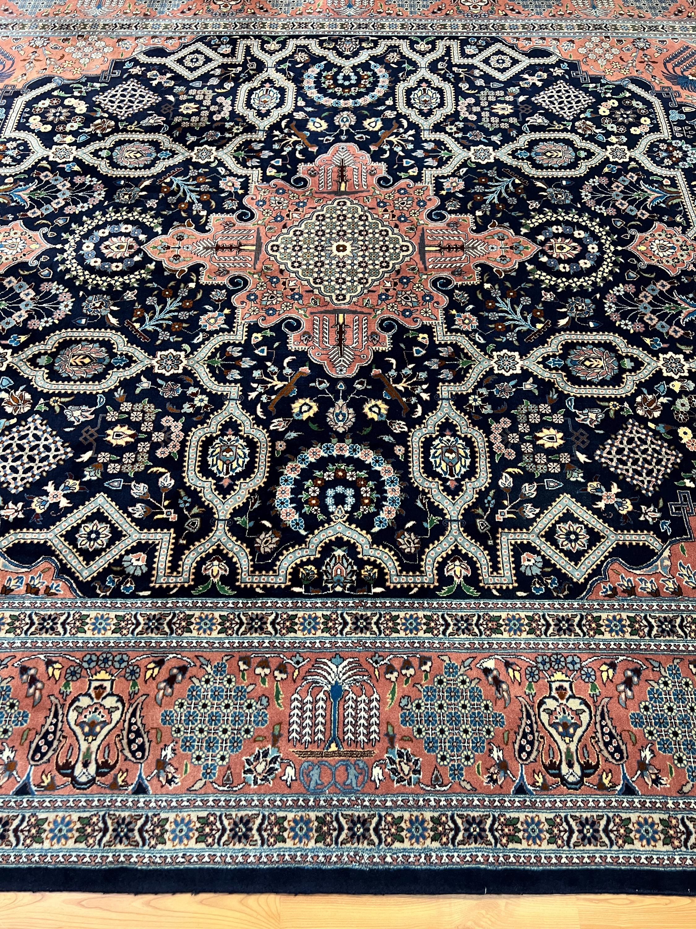 This gorgeous Oriental rug is an 8'1" x 10'5" Pakistani Tabriz with a dark blue background and rust colored border, circa 2020s. This hand knotted Pakistani Tabriz has is made with 100% wool, has full pile and is good condition.
