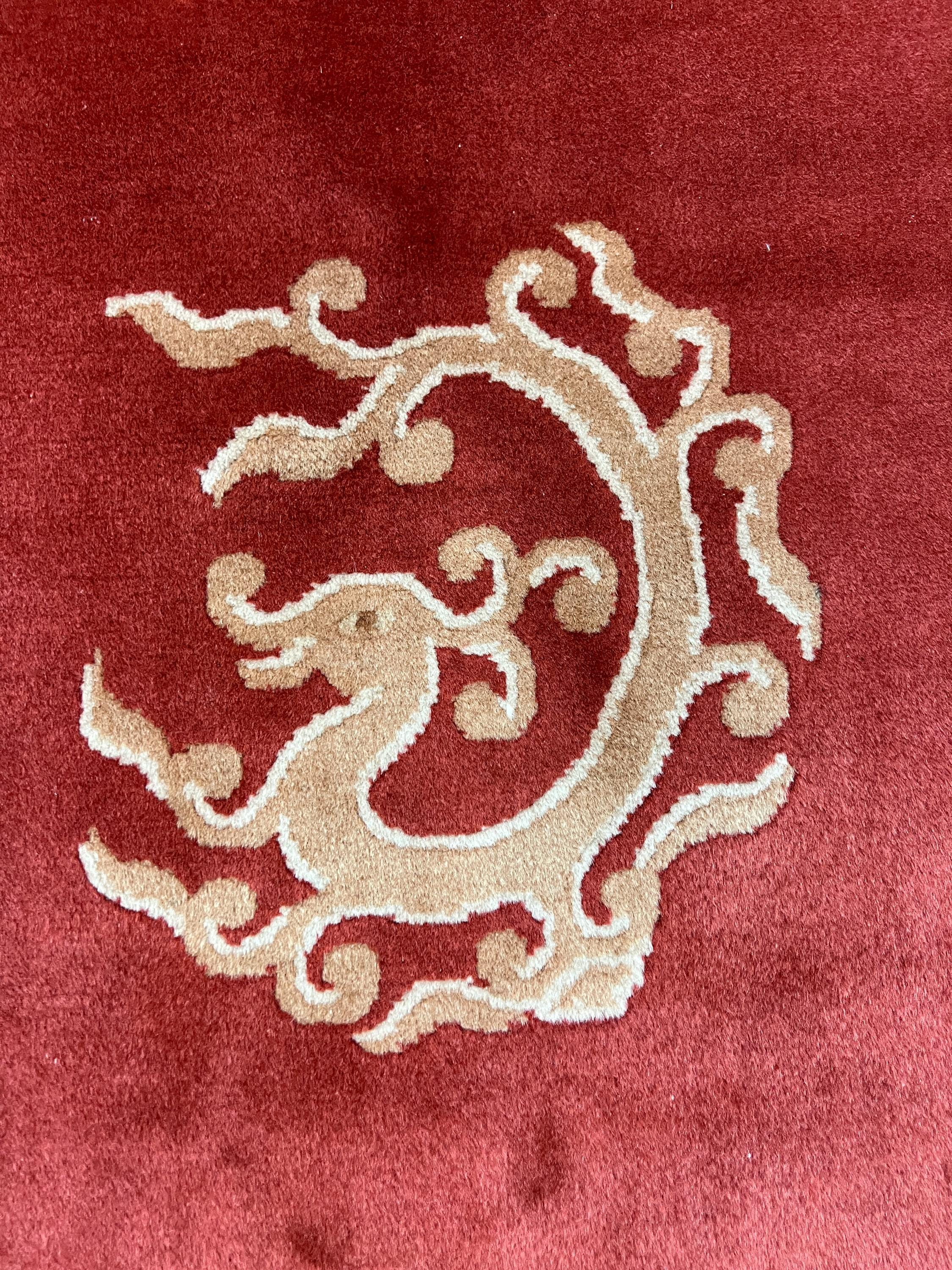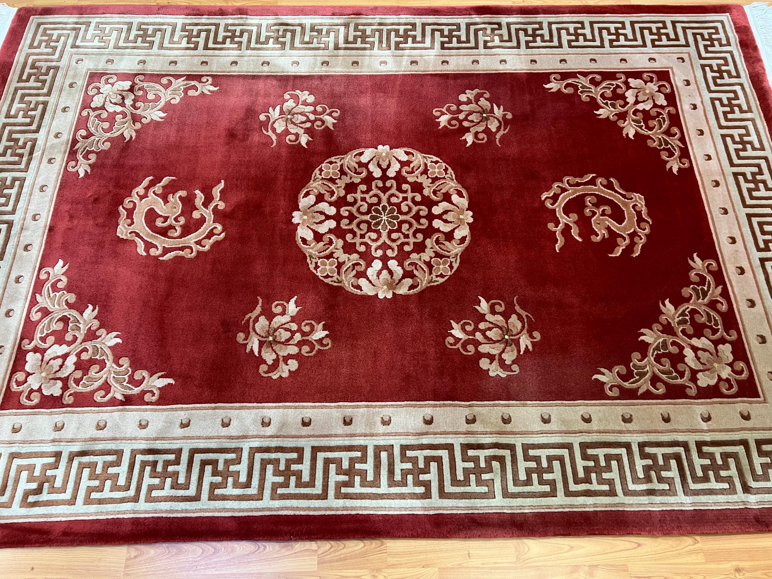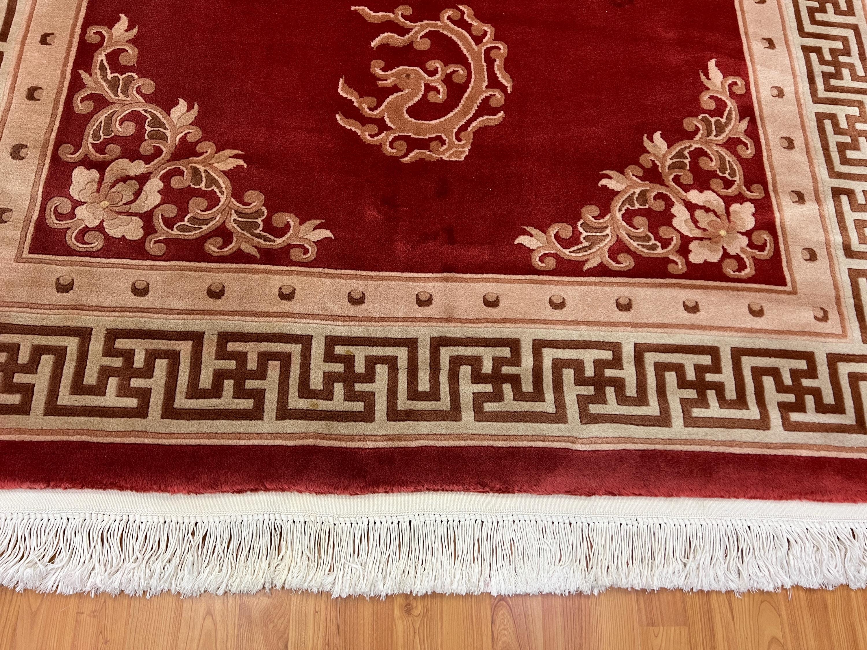 This gorgeous Oriental rug is a 5'6" x 8'5" Chinese Art Deco with a dragon design, circa 2010s. This hand knotted rug is made with a 100% wool, has a full pile and is in good condition.