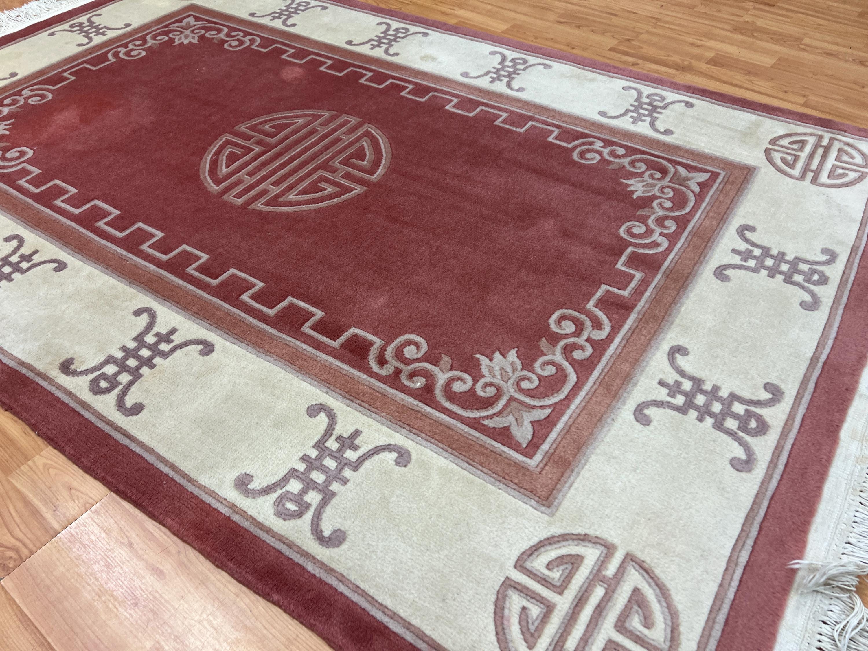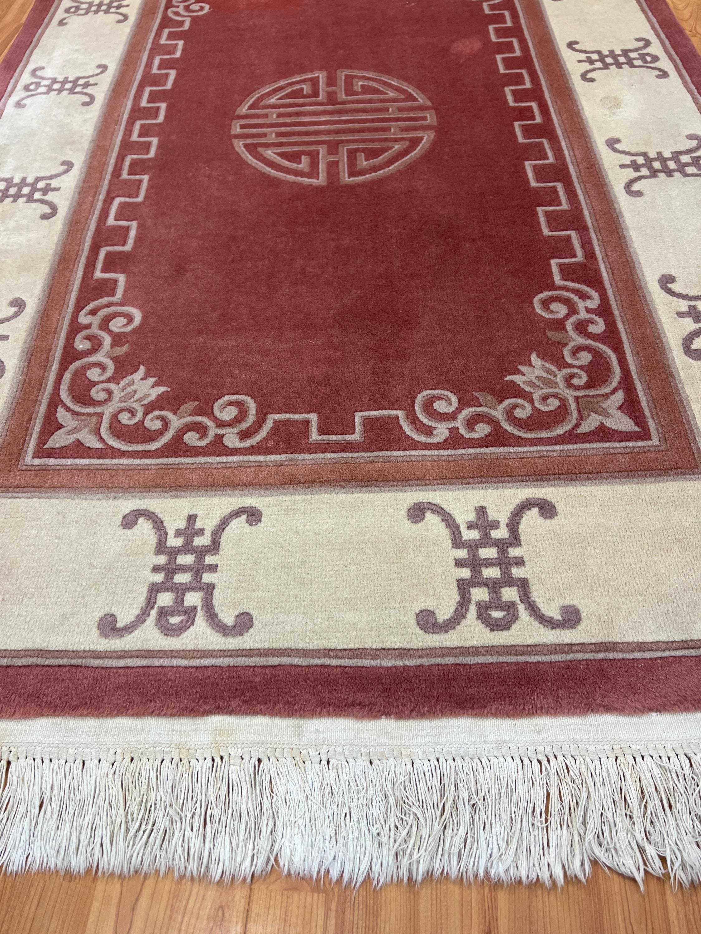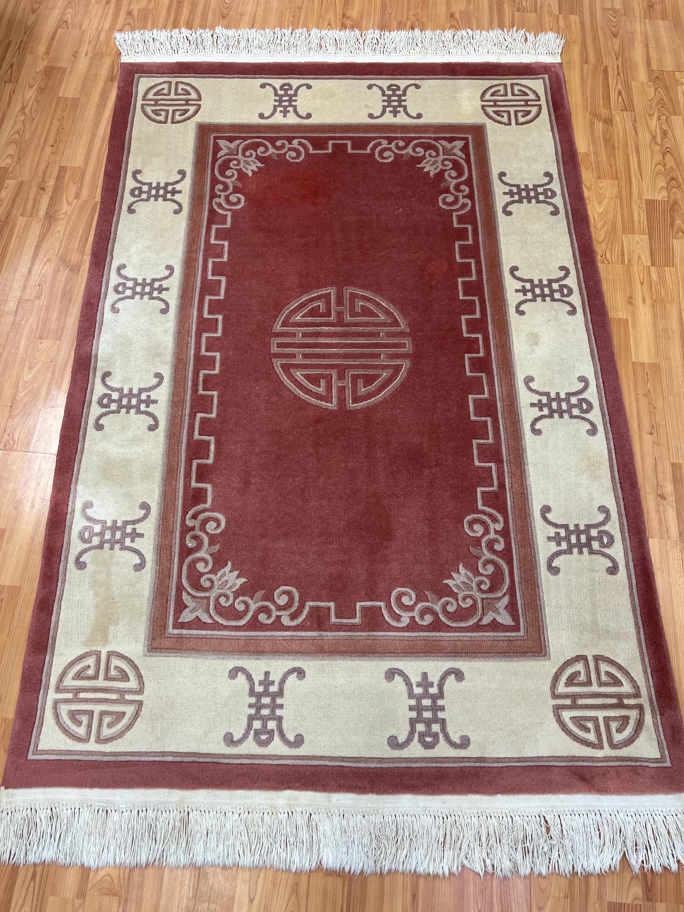 This beautiful Oriental rug is a 4' x 6'2" Chinese Art Deco, circa 2000s. This hand knotted Chinese rug is made with 100% wool, has a full pile and is in good condition.