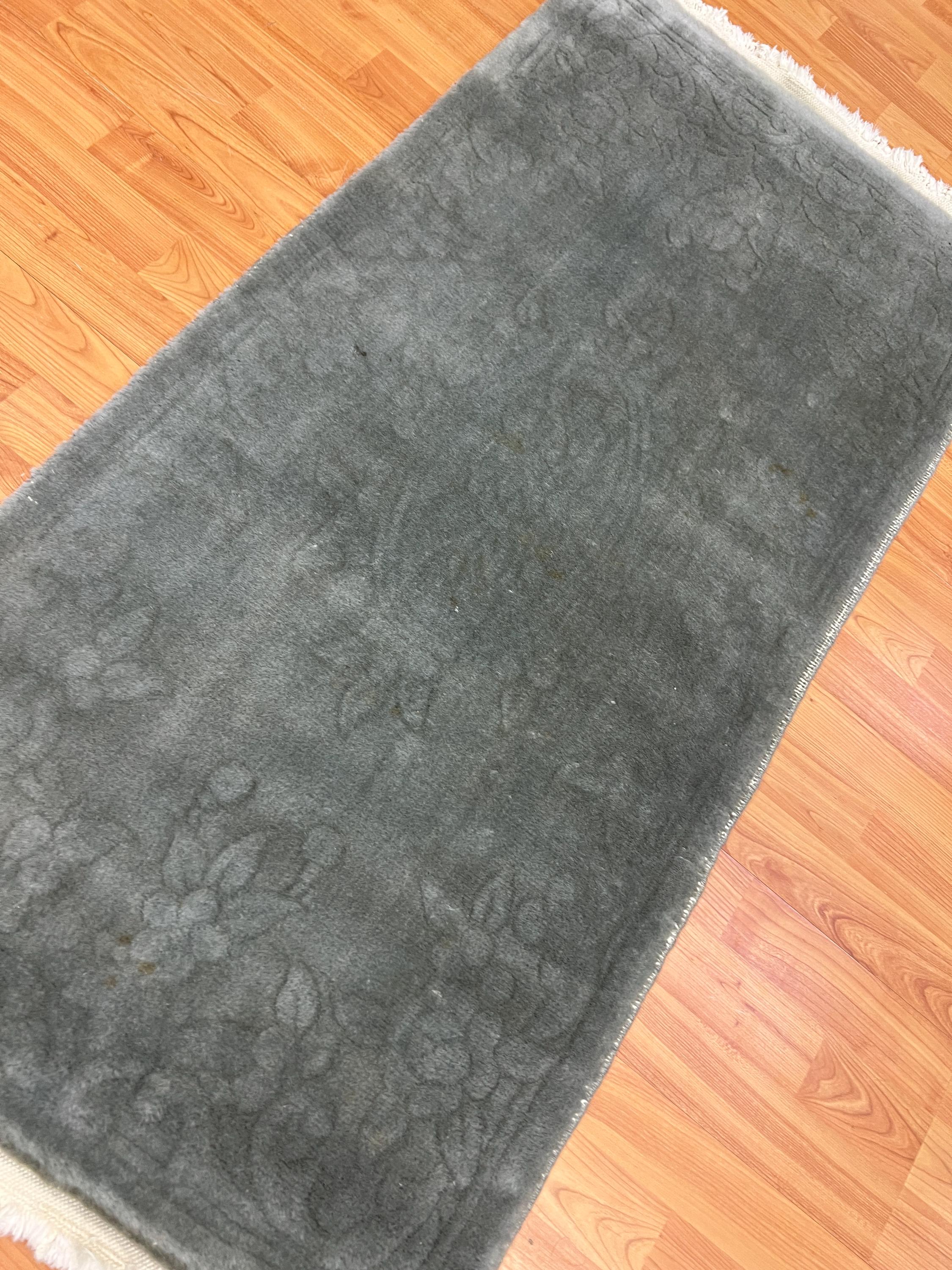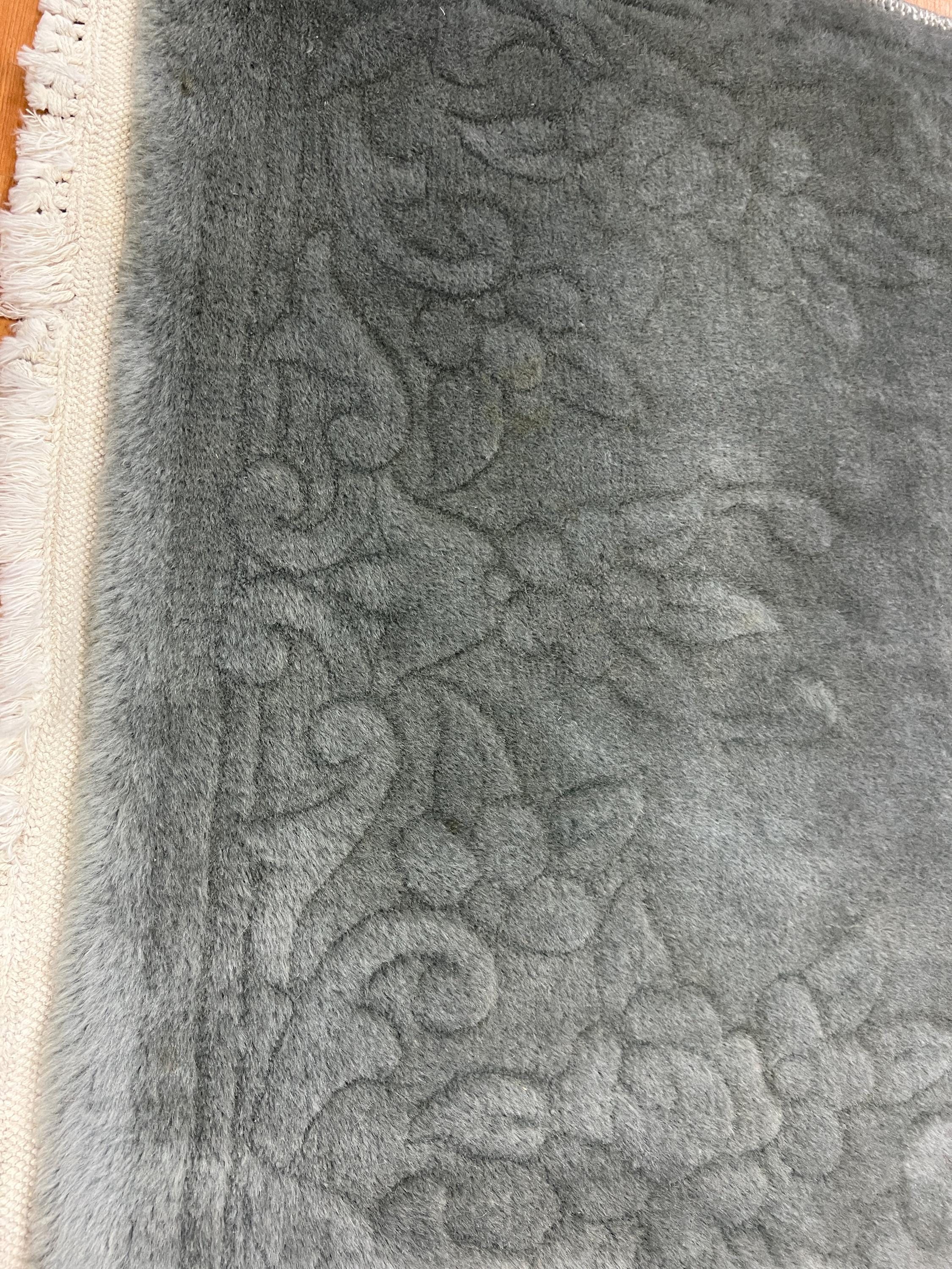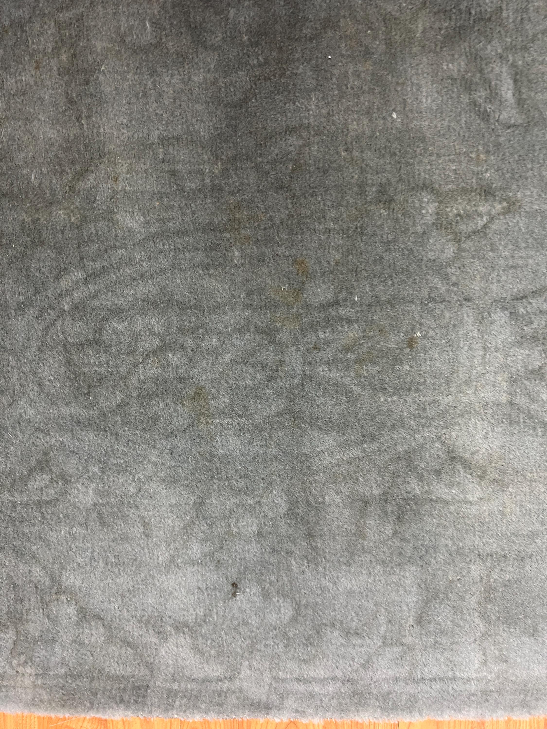 This gorgeous Oriental rug is a 2' x 4' Chinese Art Deco with a carved design and grey background, circa 2010s. This hand knotted rug is made with a 100% wool, has a full pile and is in good condition.