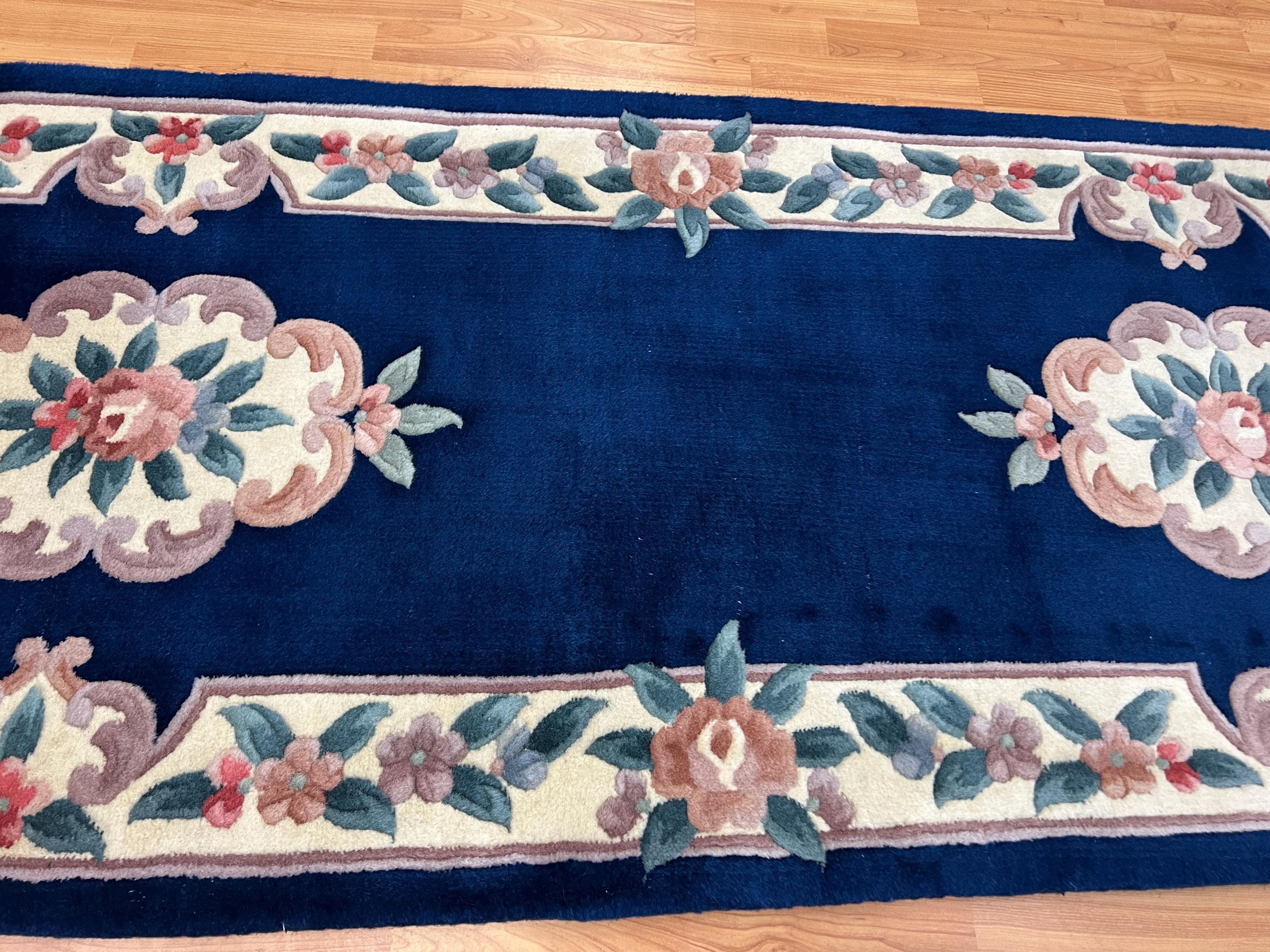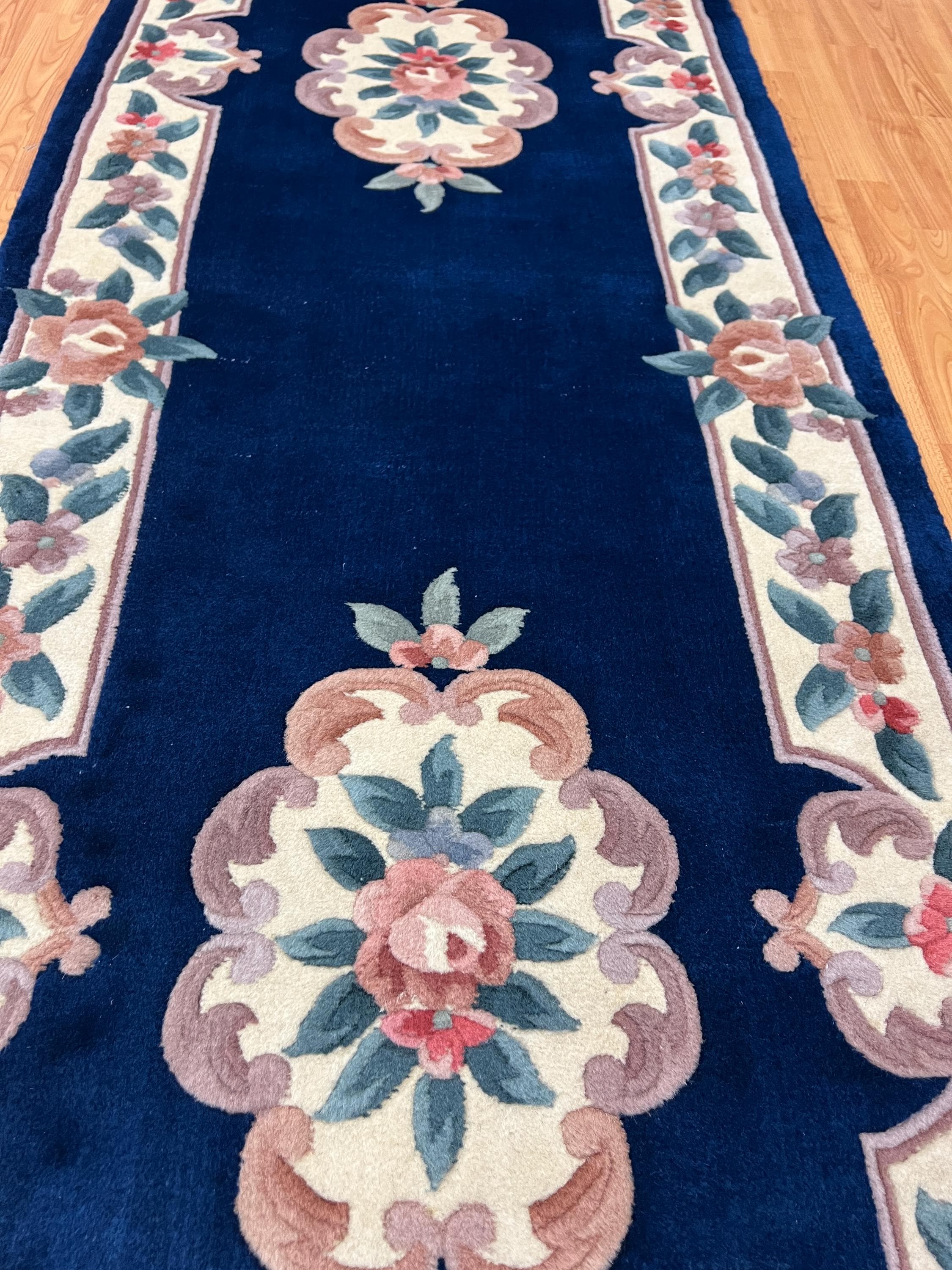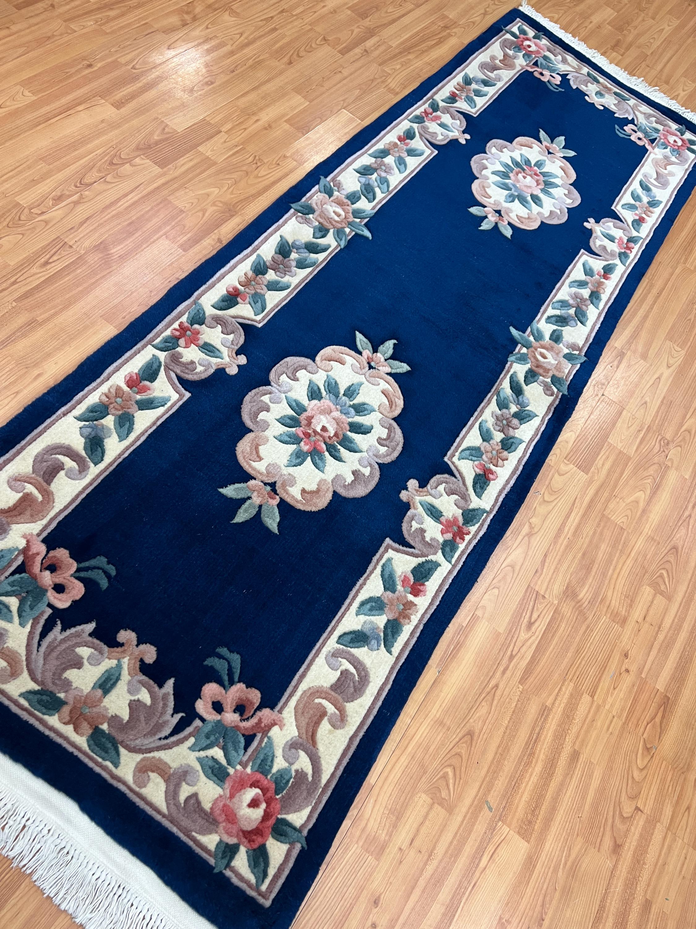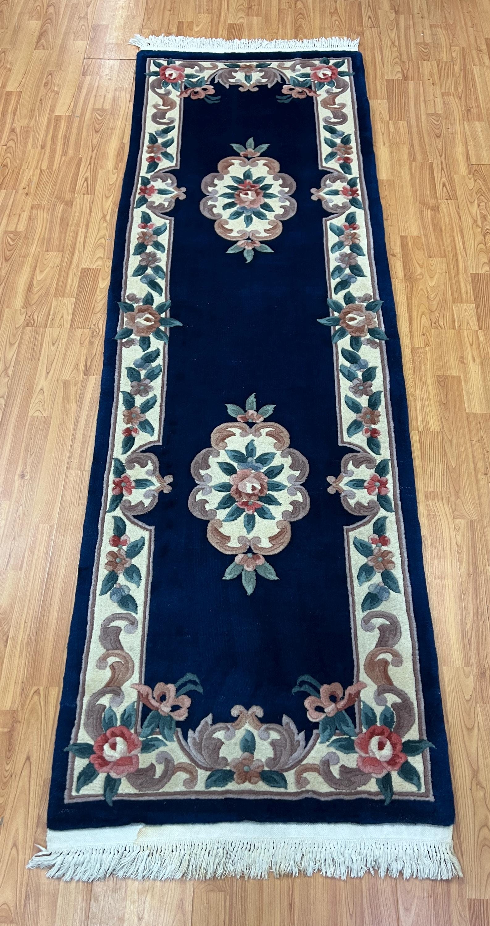 This beautiful Oriental rug is a brand new 2'7" x 8'1" Chinese Aubusson floor runner. This hand made Chinese rug is made with 100% wool.