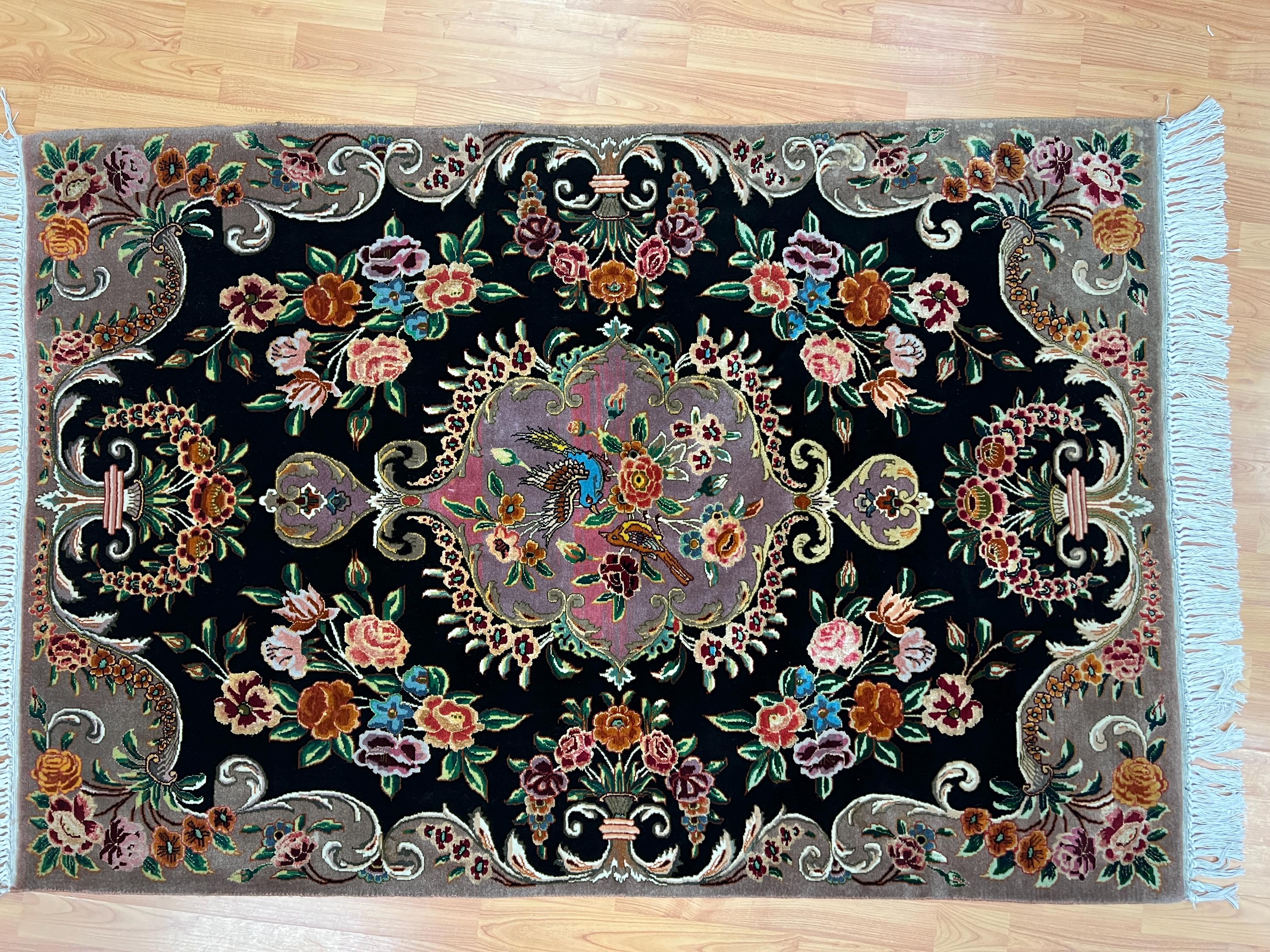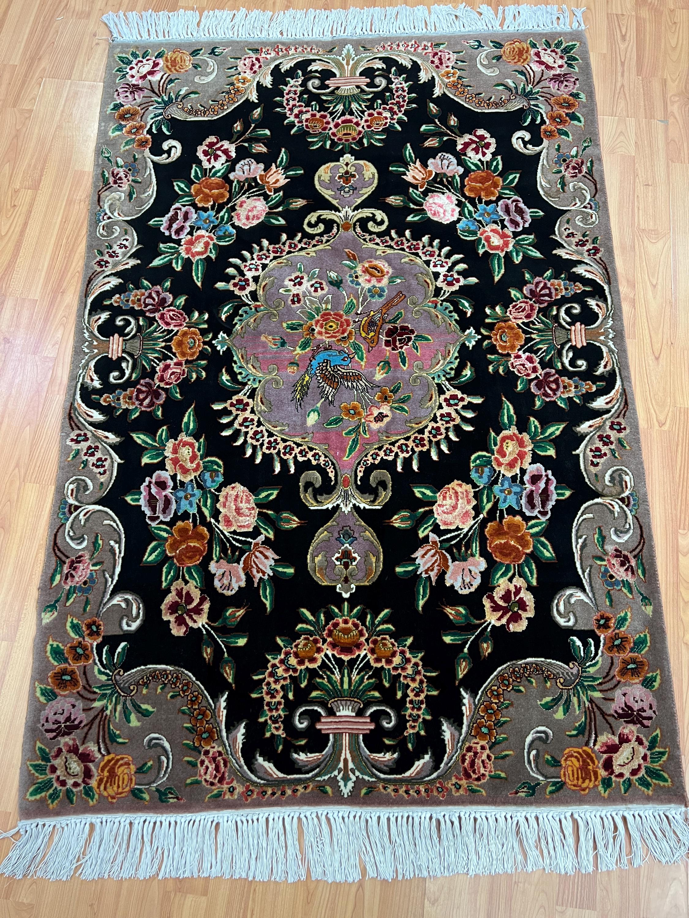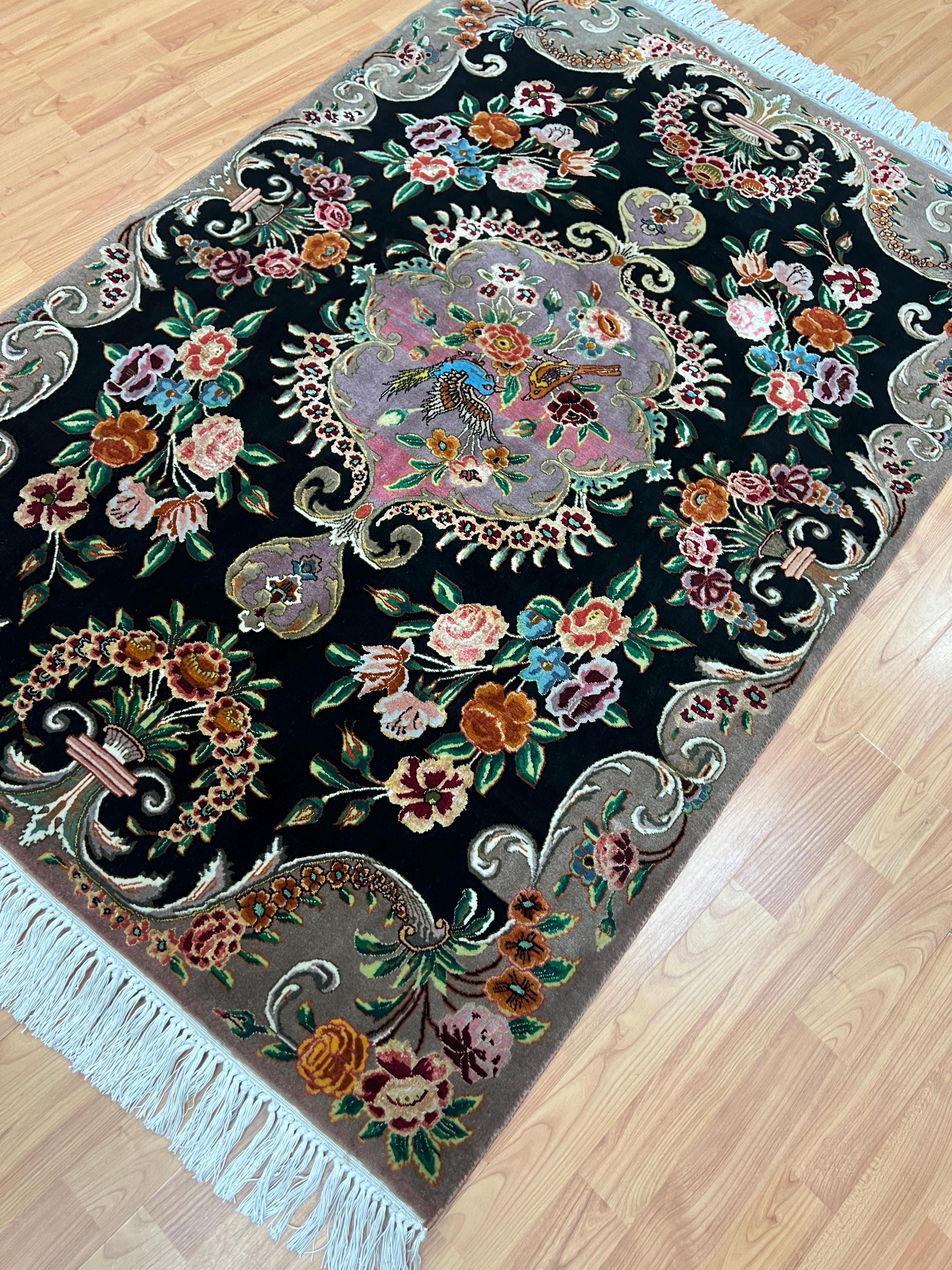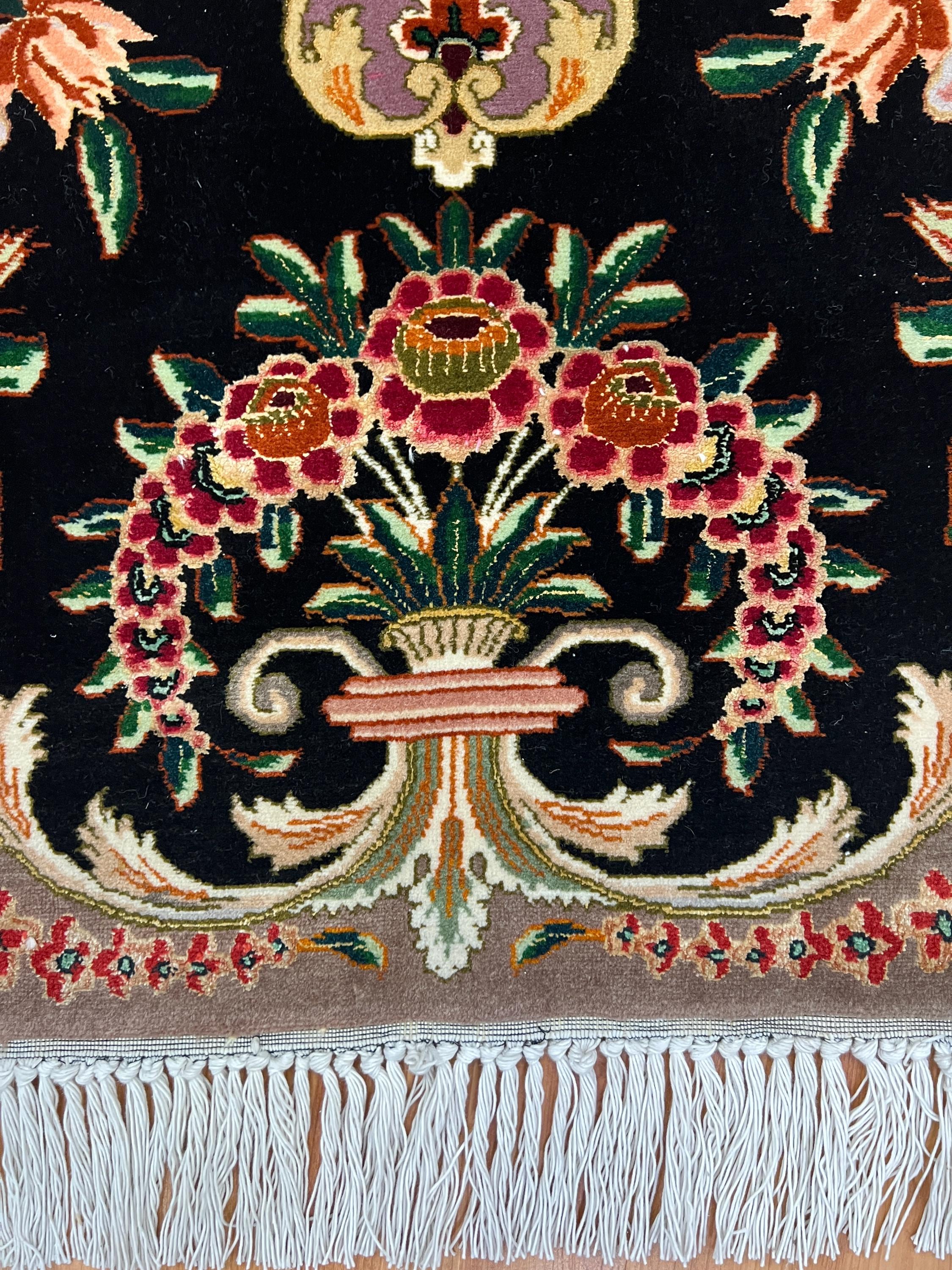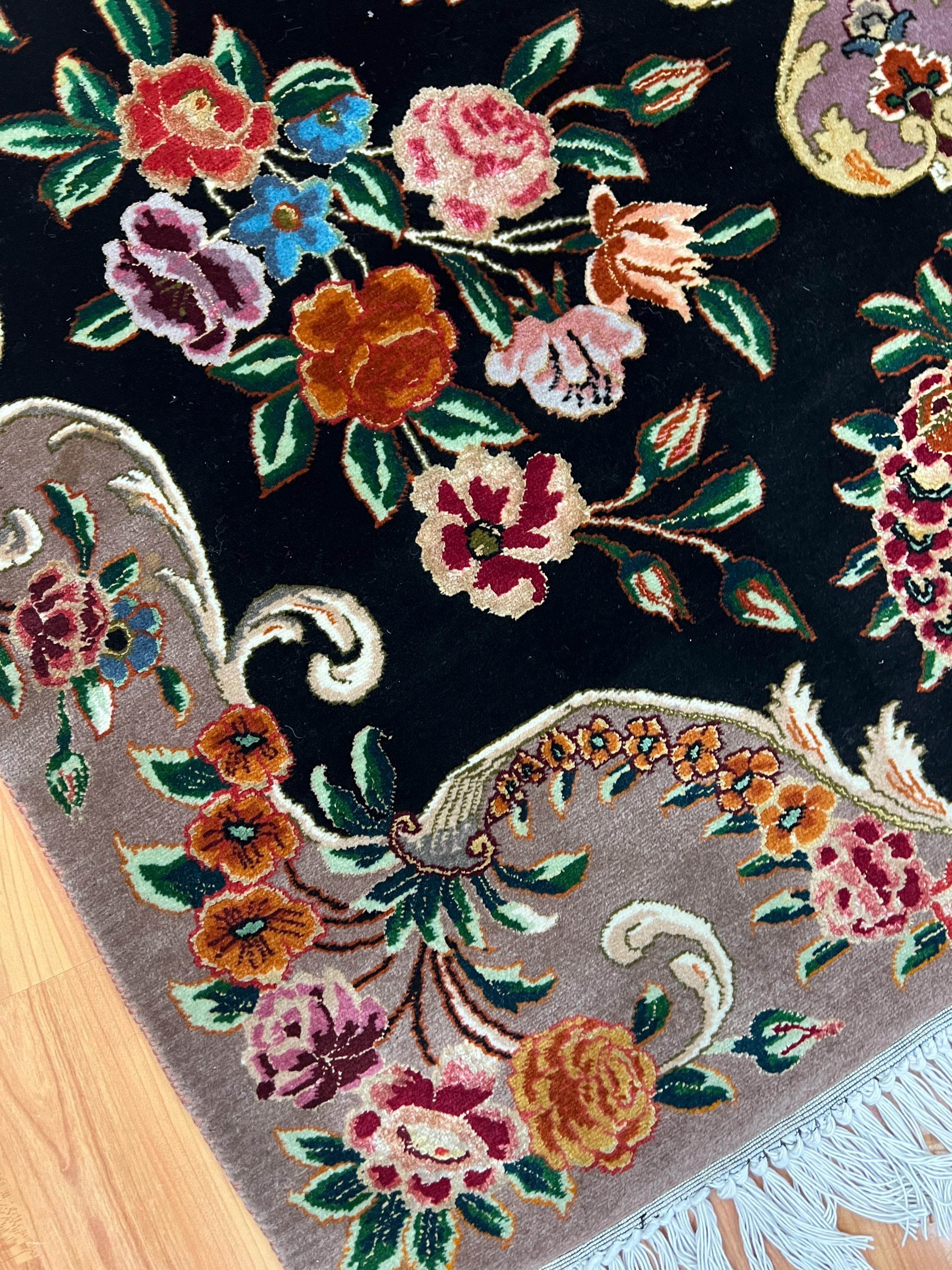 This marvelous Oriental rug is a fine 3'4" x 5' floral Turkish with a black background, circa 2000s. This hand knotted rug is made with wool and silk pile at 400 KPSI (knots per square inch) and is in good condition.