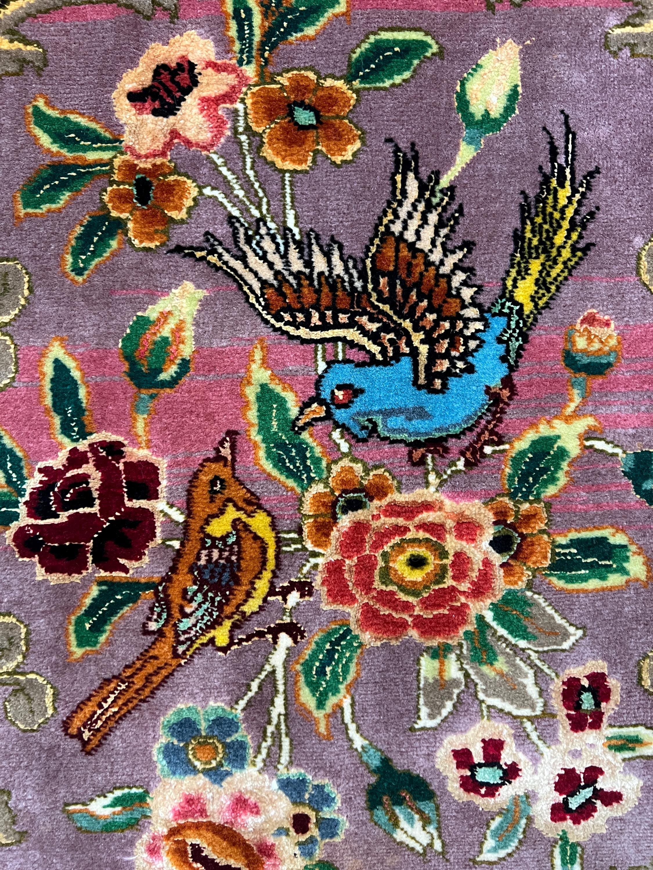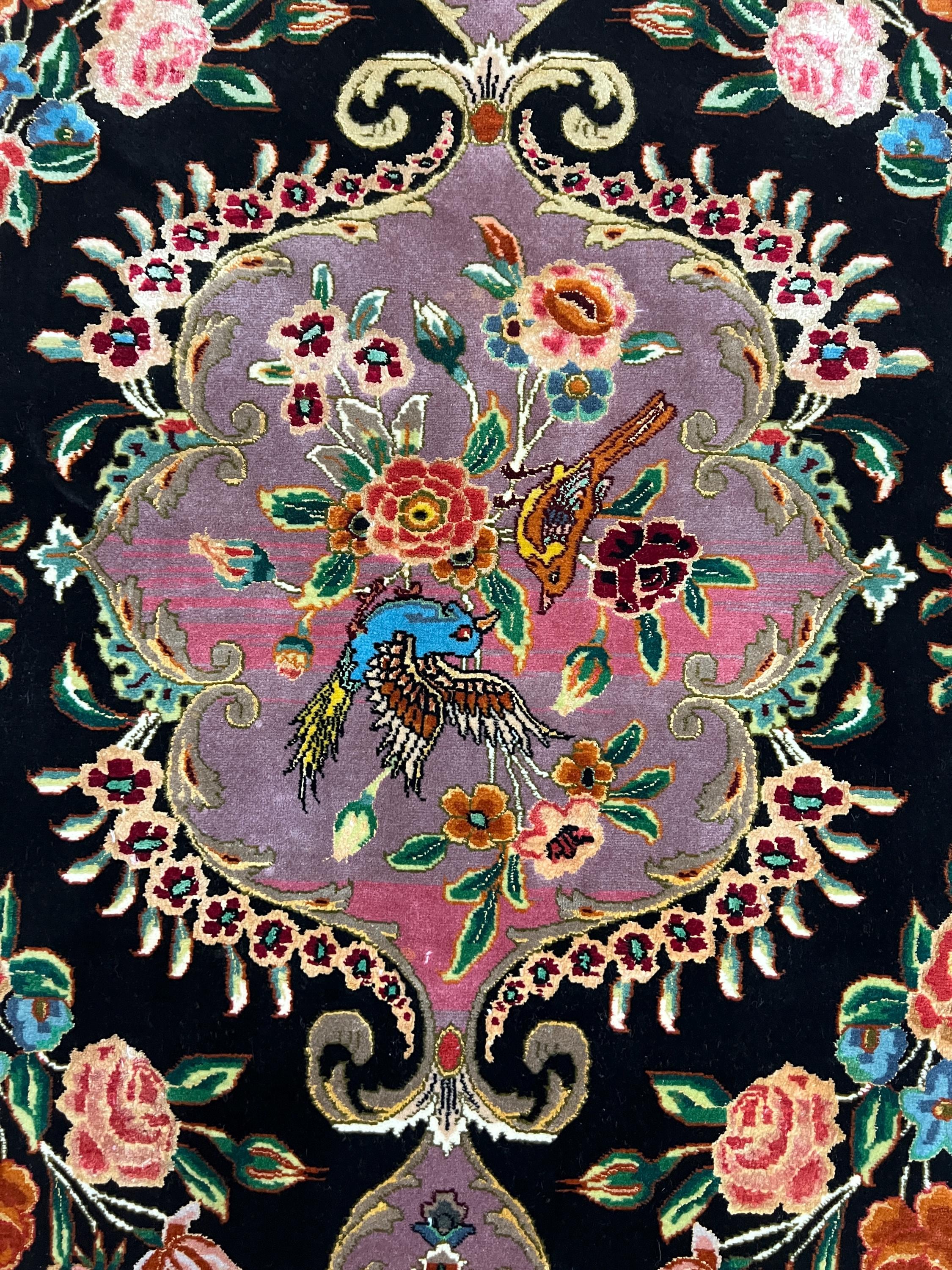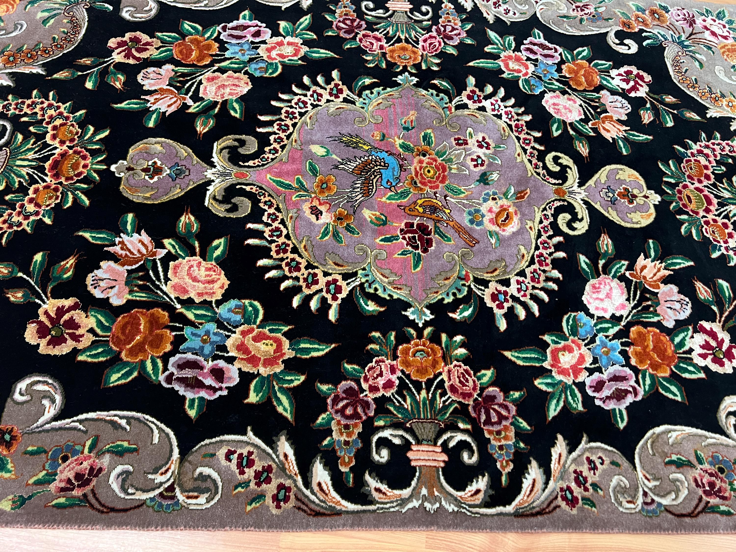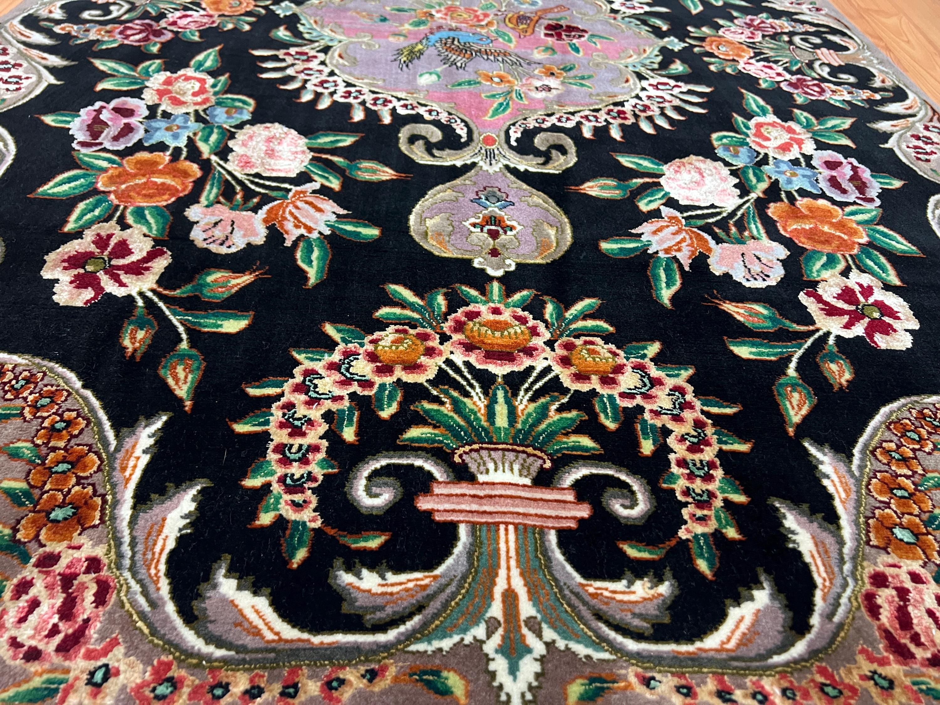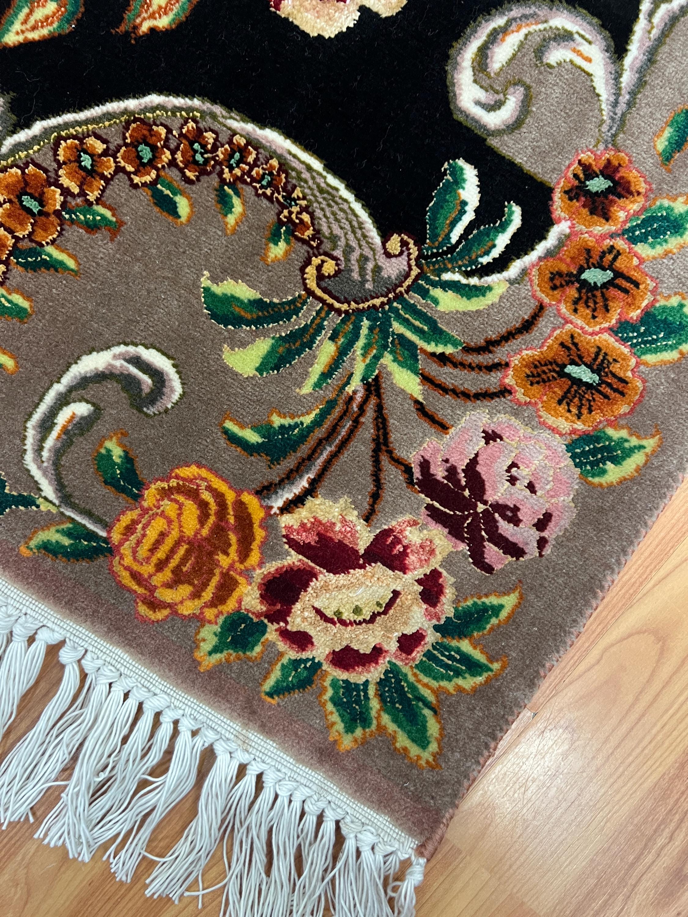 This marvelous Oriental rug is a fine 3'4" x 5' floral Turkish with a black background, circa 2000s. This hand knotted rug is made with wool and silk pile at 400 KPSI (knots per square inch) and is in good condition.