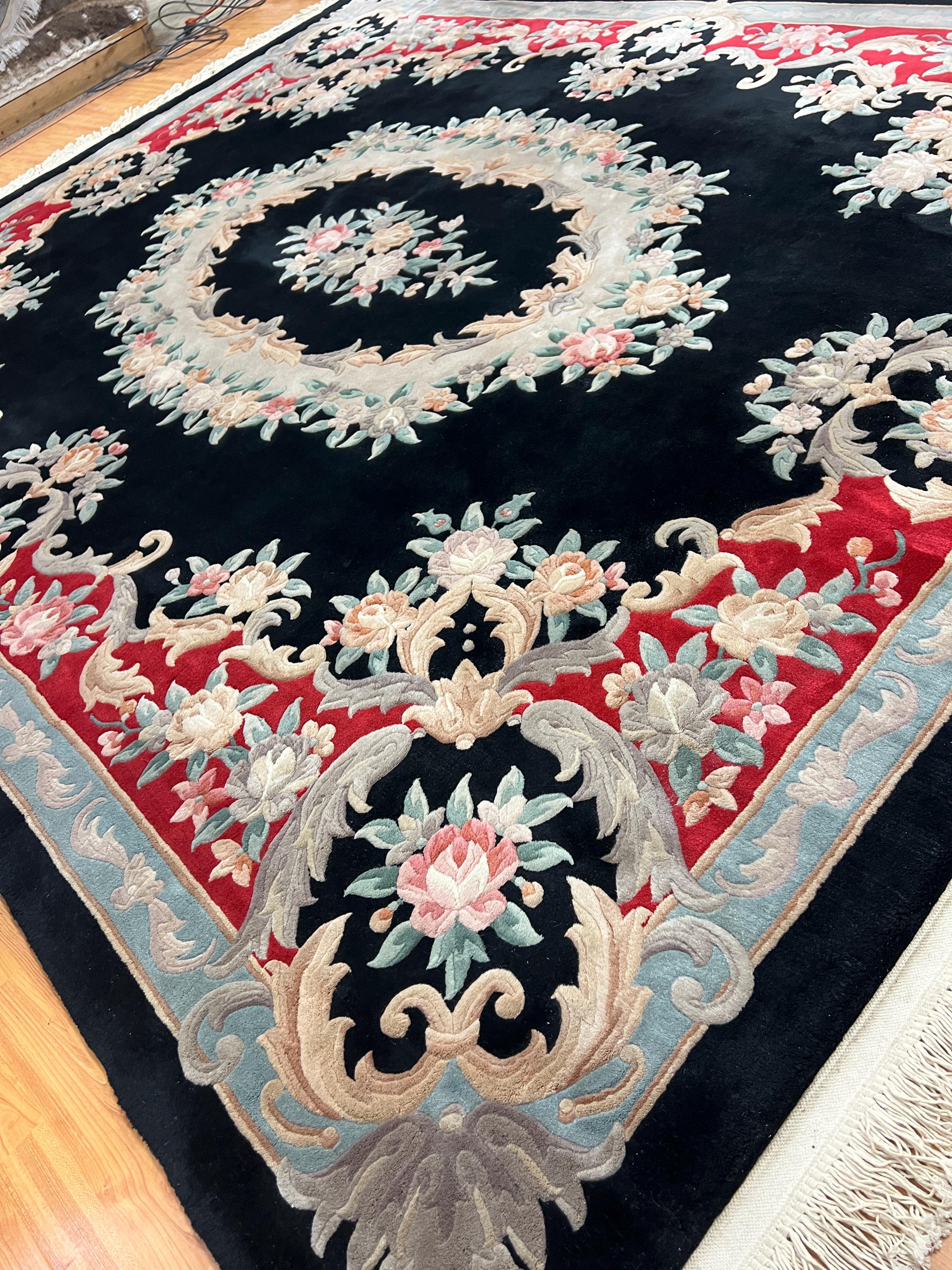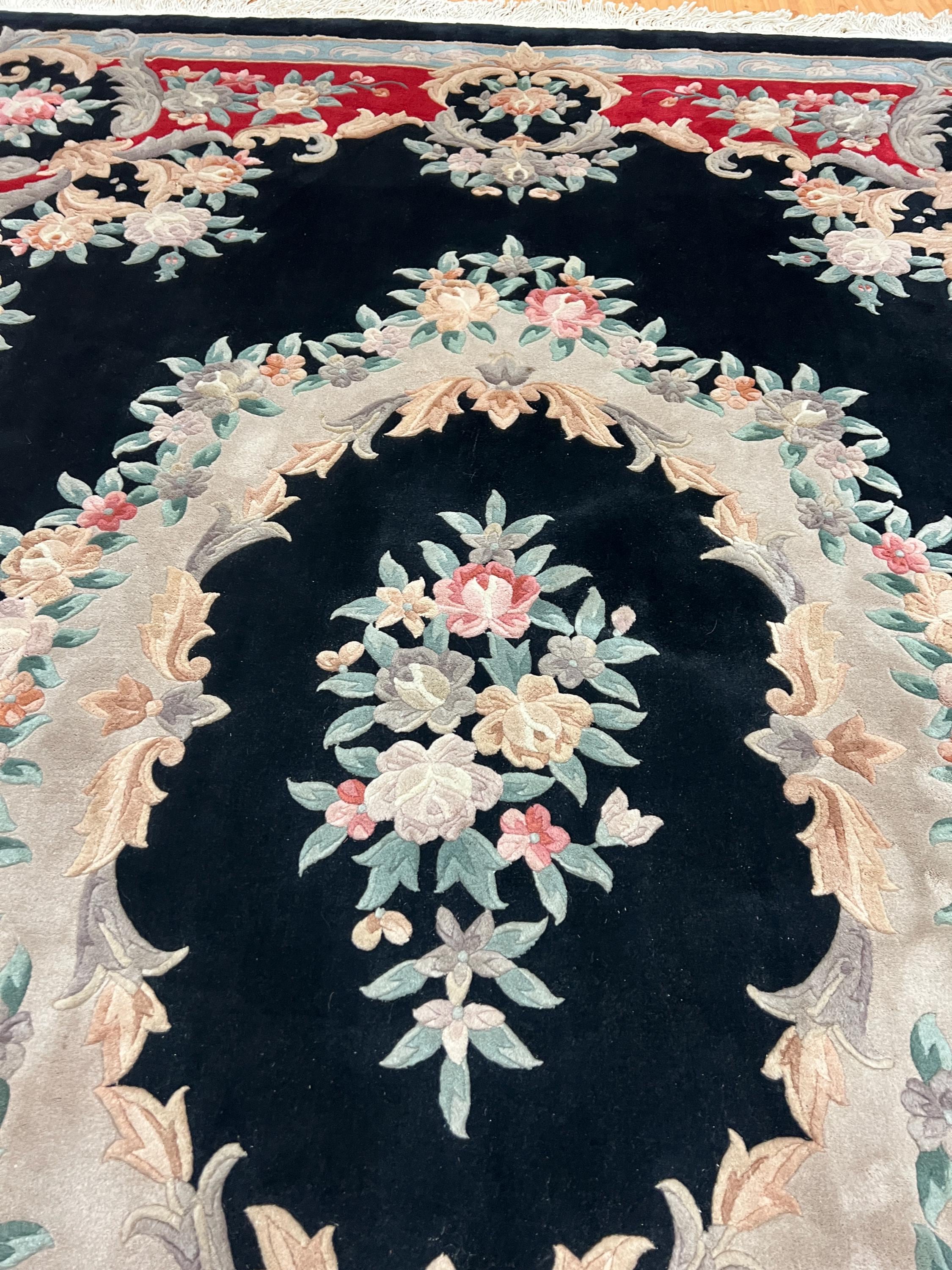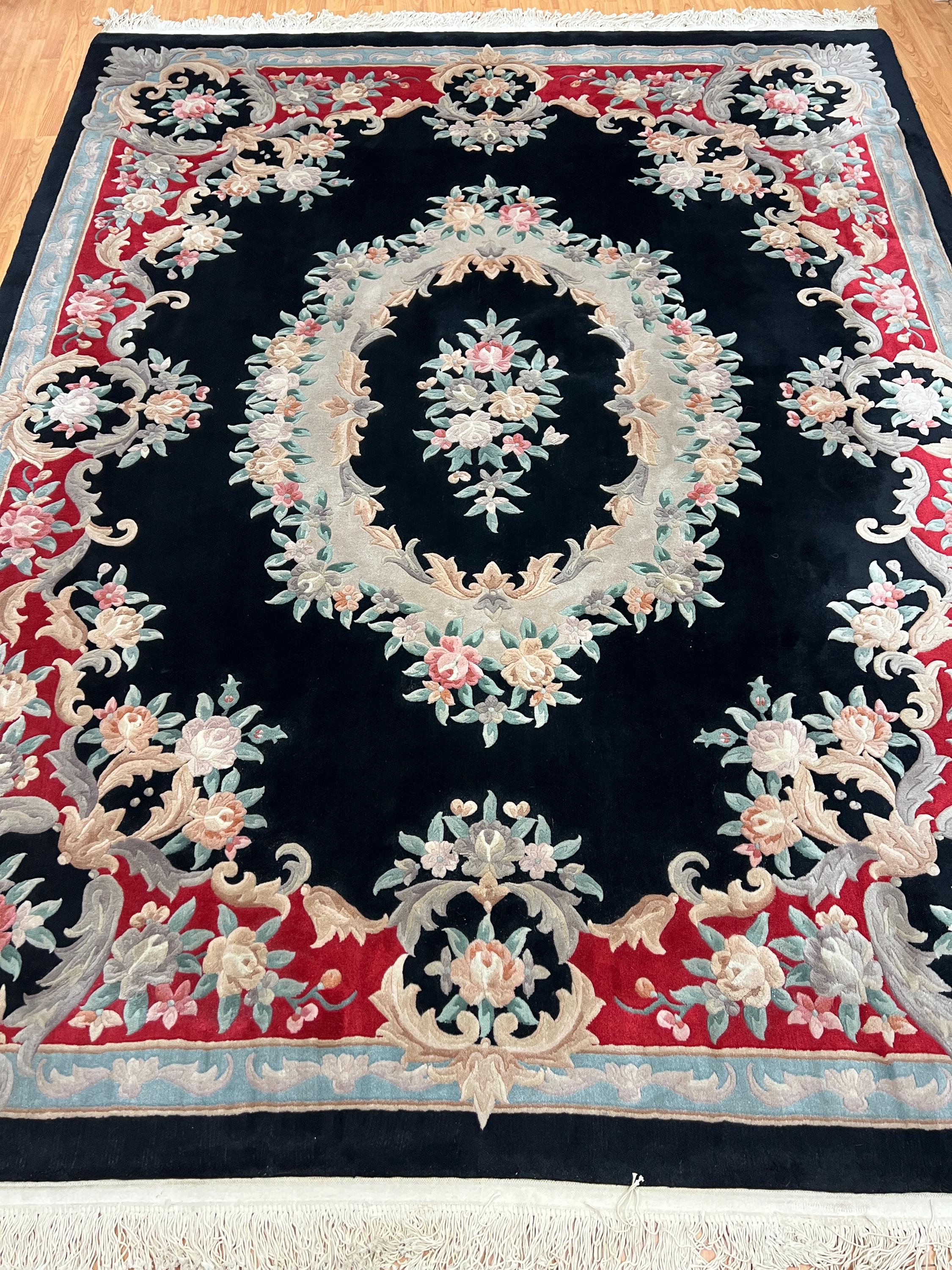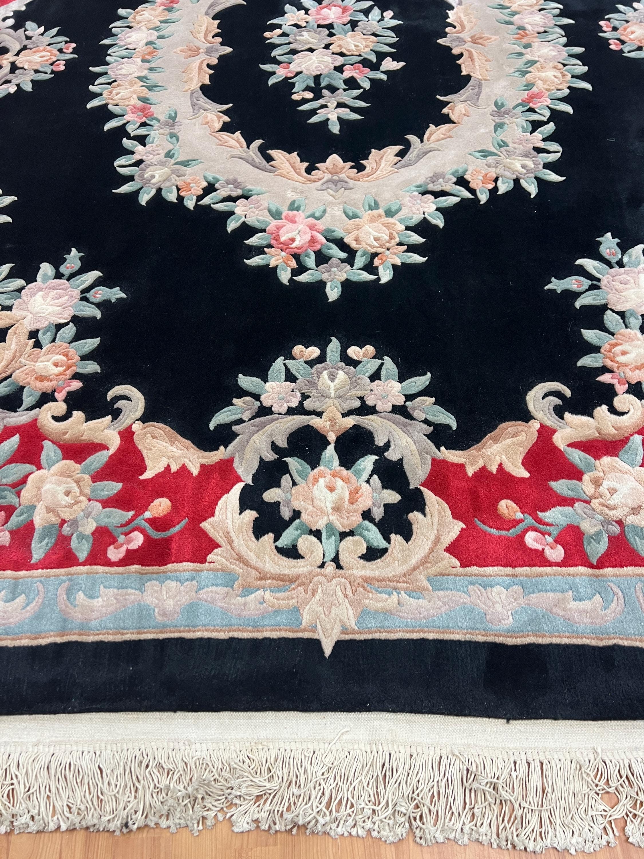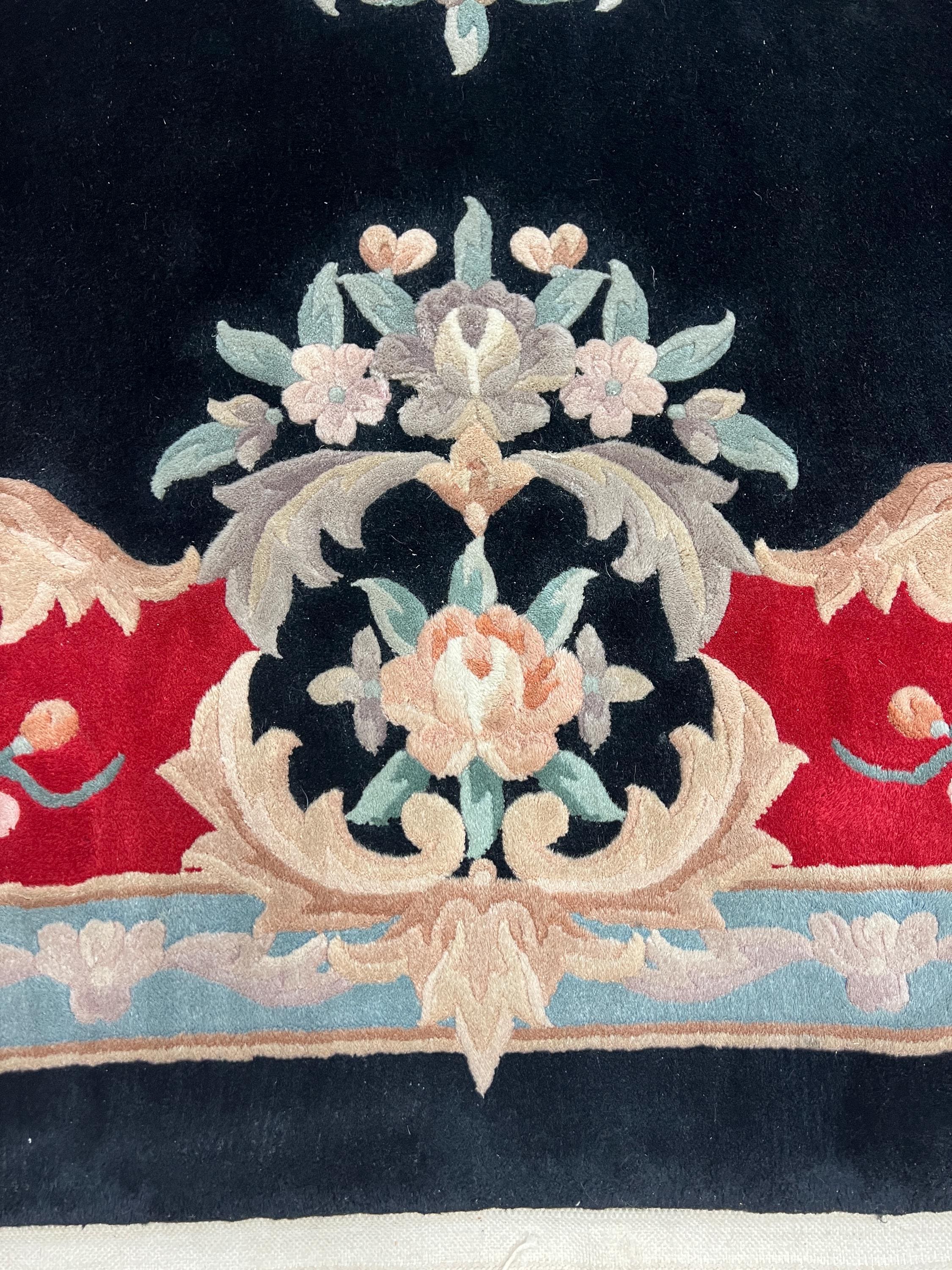 This gorgeous Oriental rug is an 8' x 10'3" Chinese Aubusson with a black background, circa 2000s. This Chinese rug is hand knotted with 100% wool and is in perfect condition.