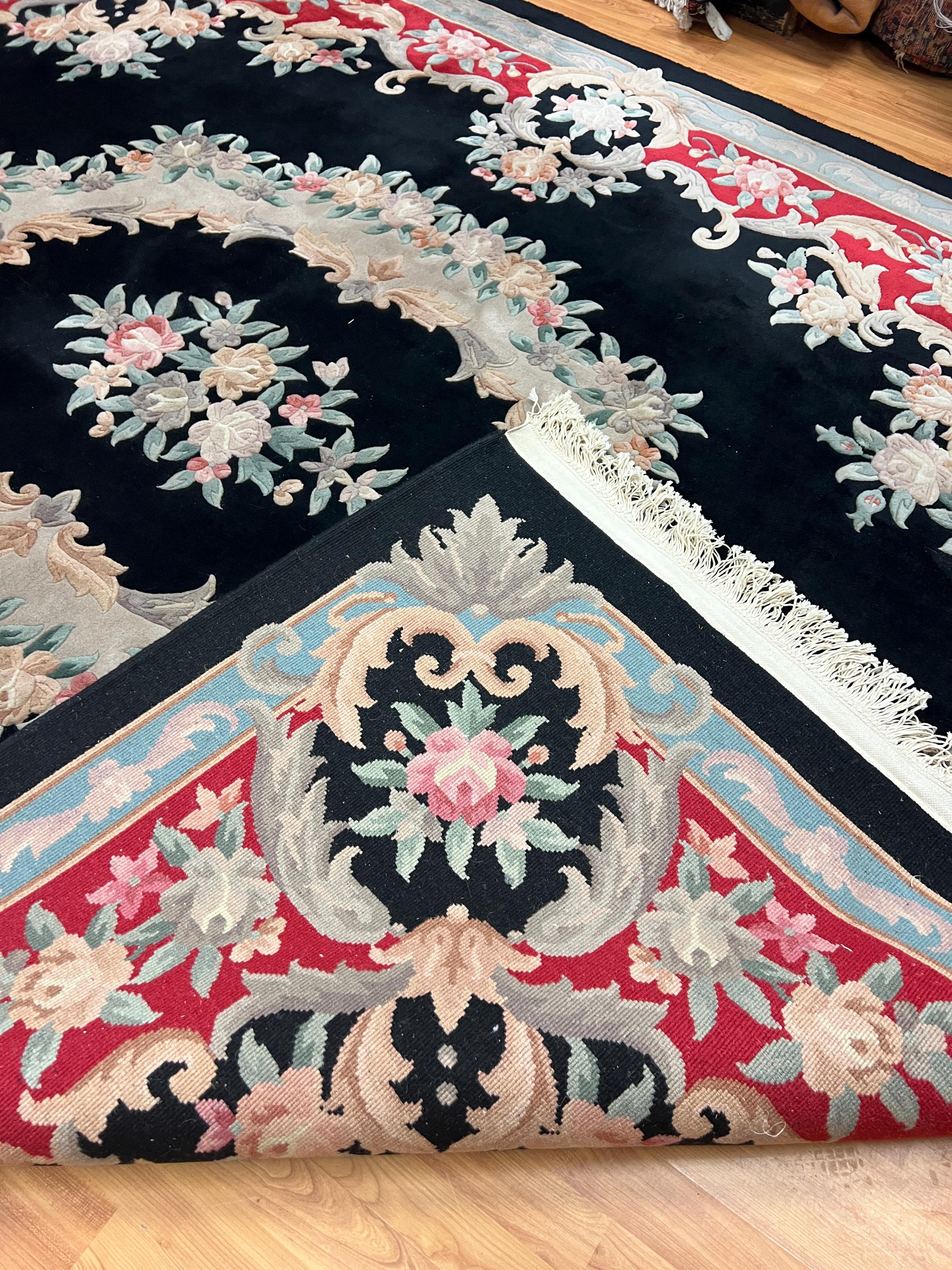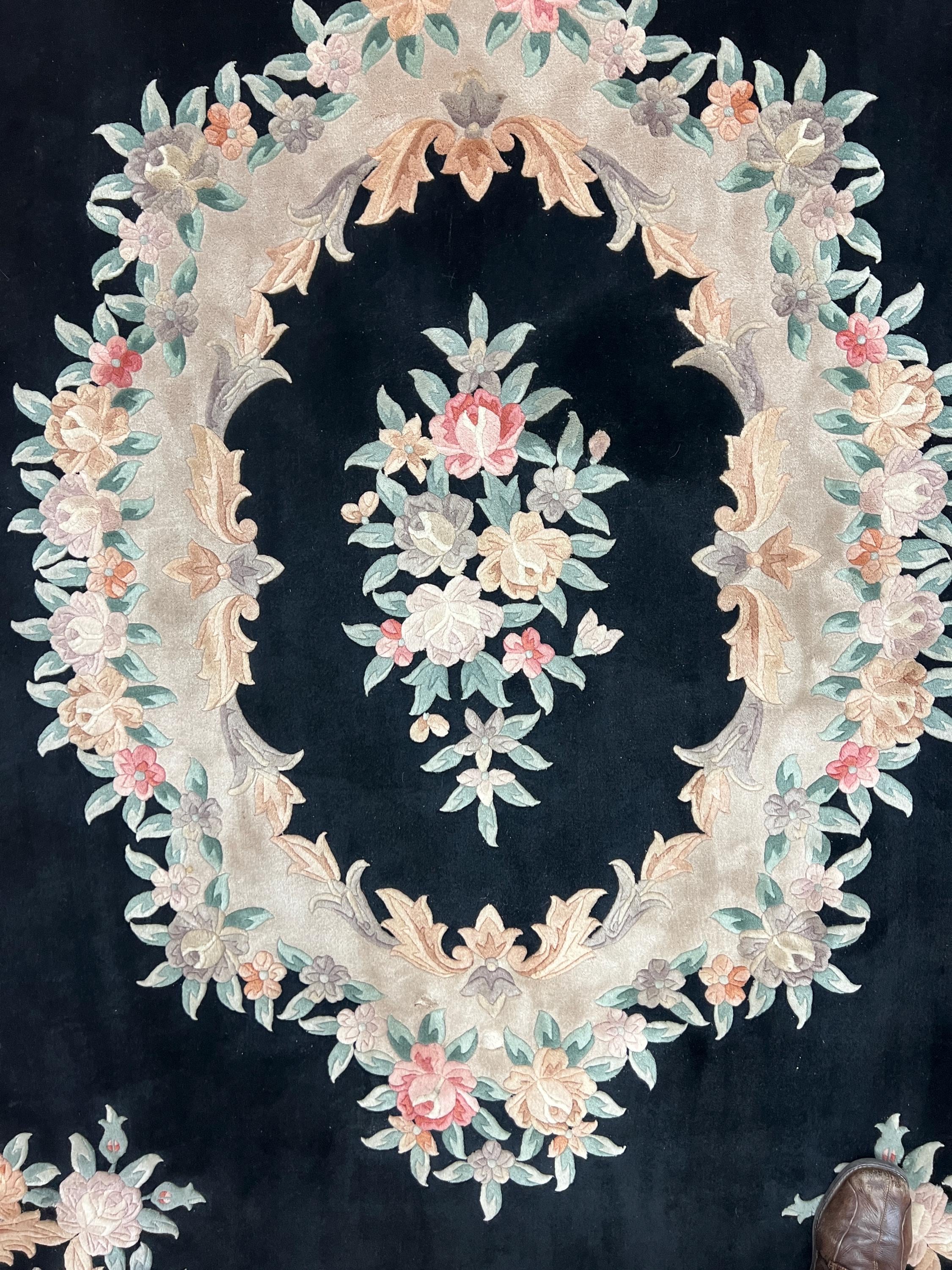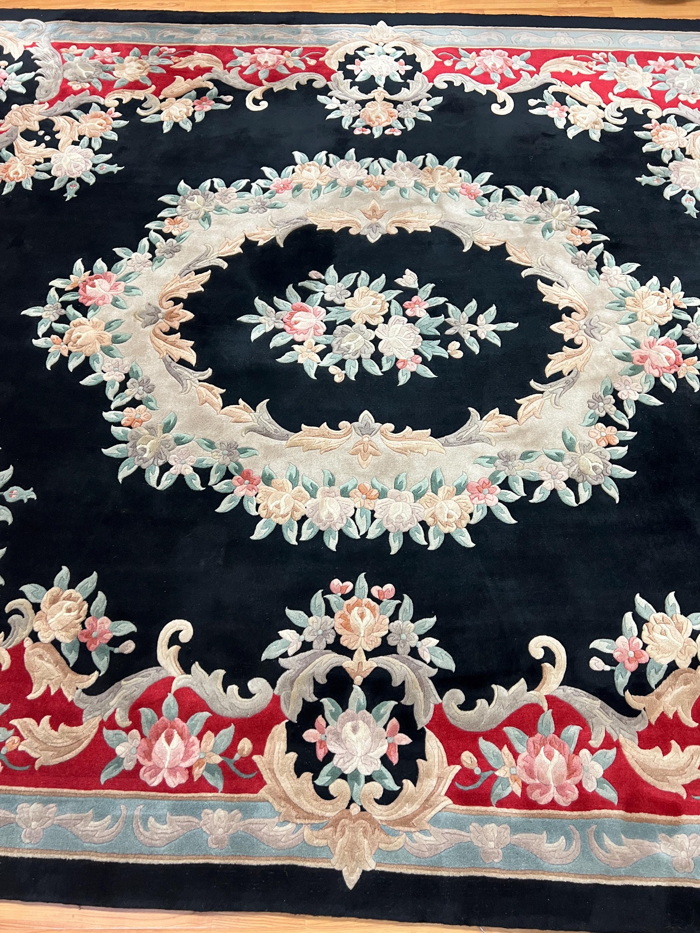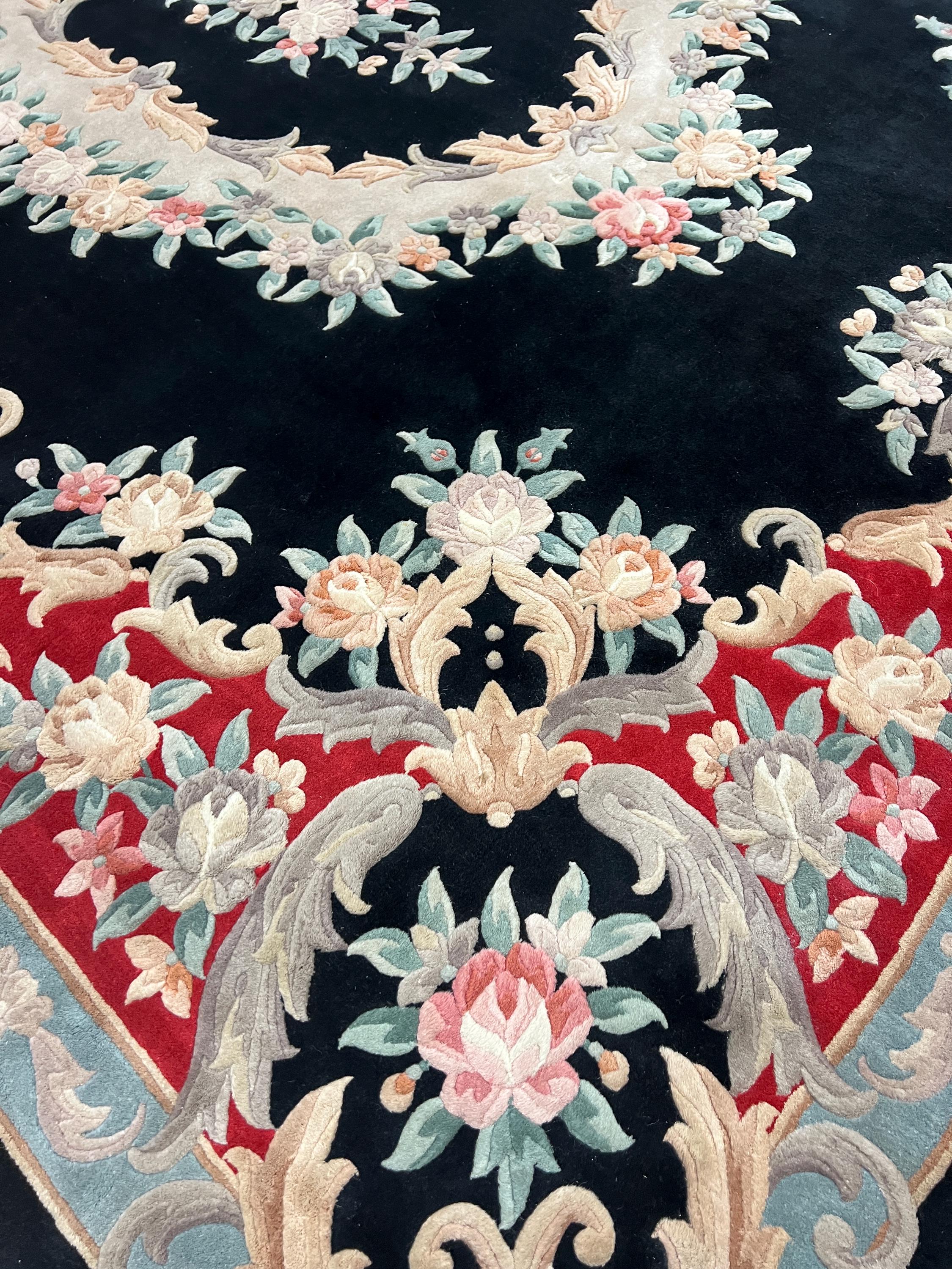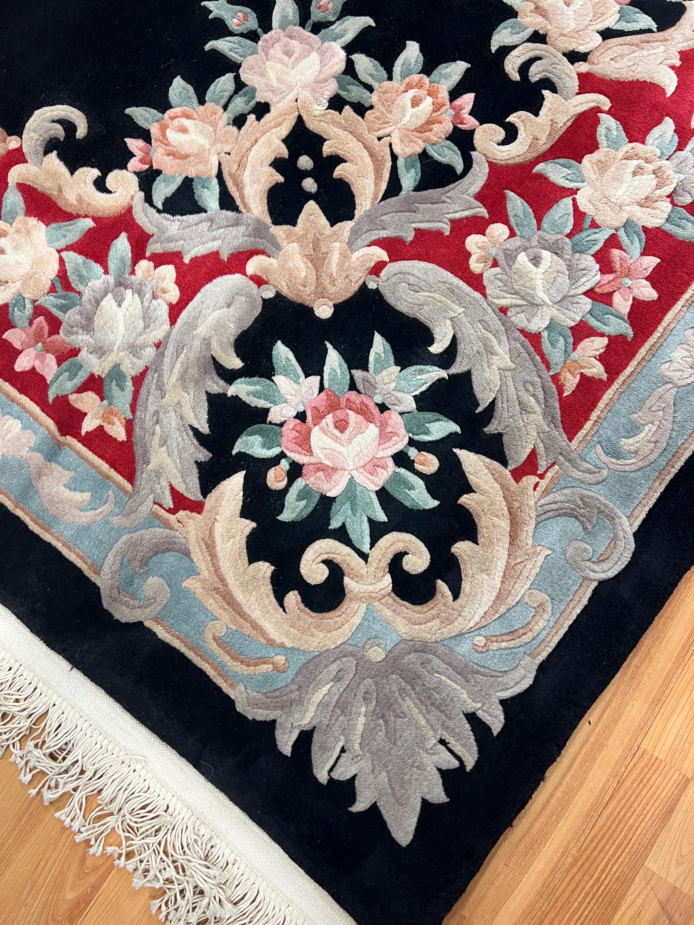 This gorgeous Oriental rug is an 8' x 10'3" Chinese Aubusson with a black background, circa 2000s. This Chinese rug is hand knotted with 100% wool and is in perfect condition.
