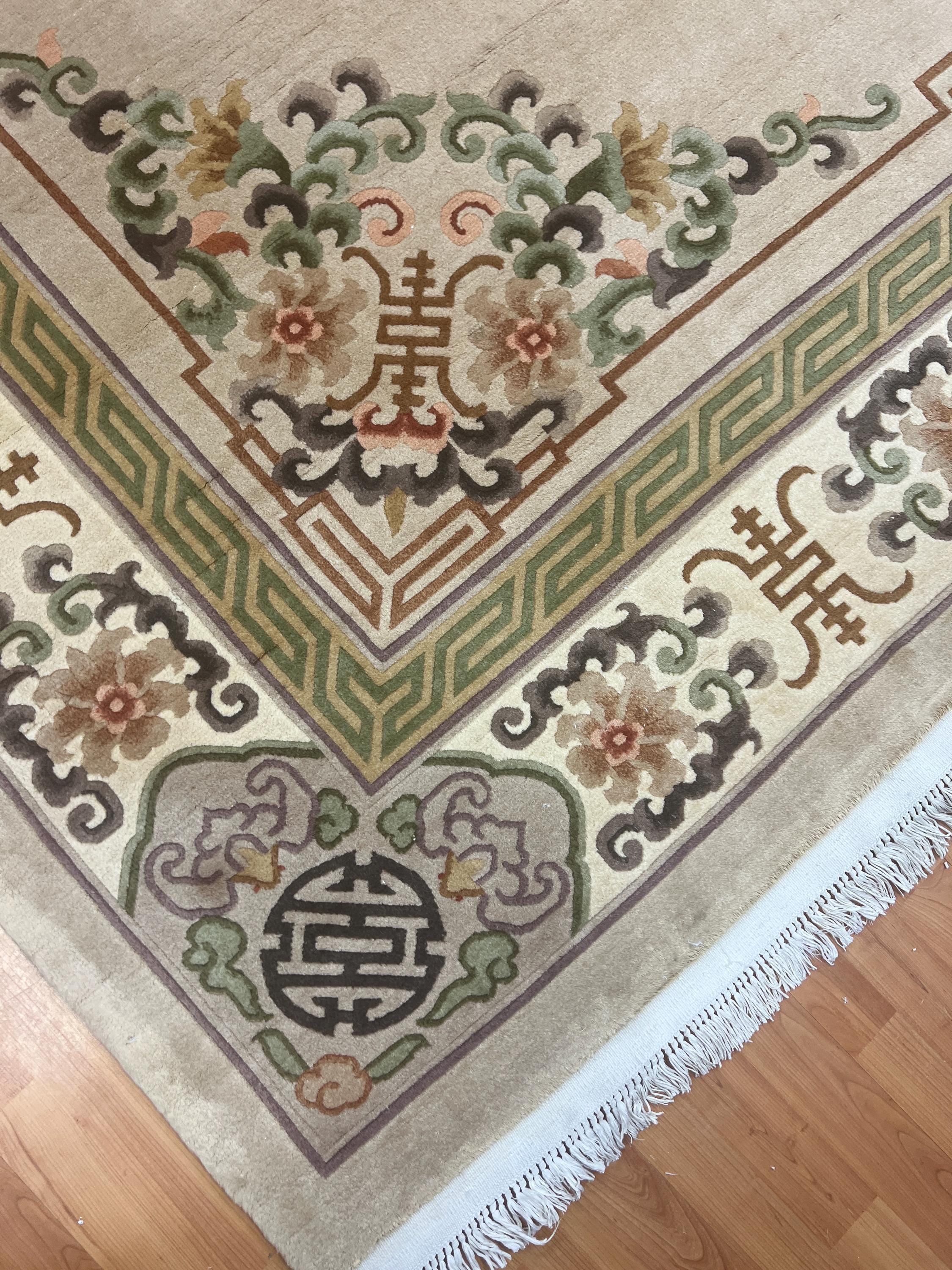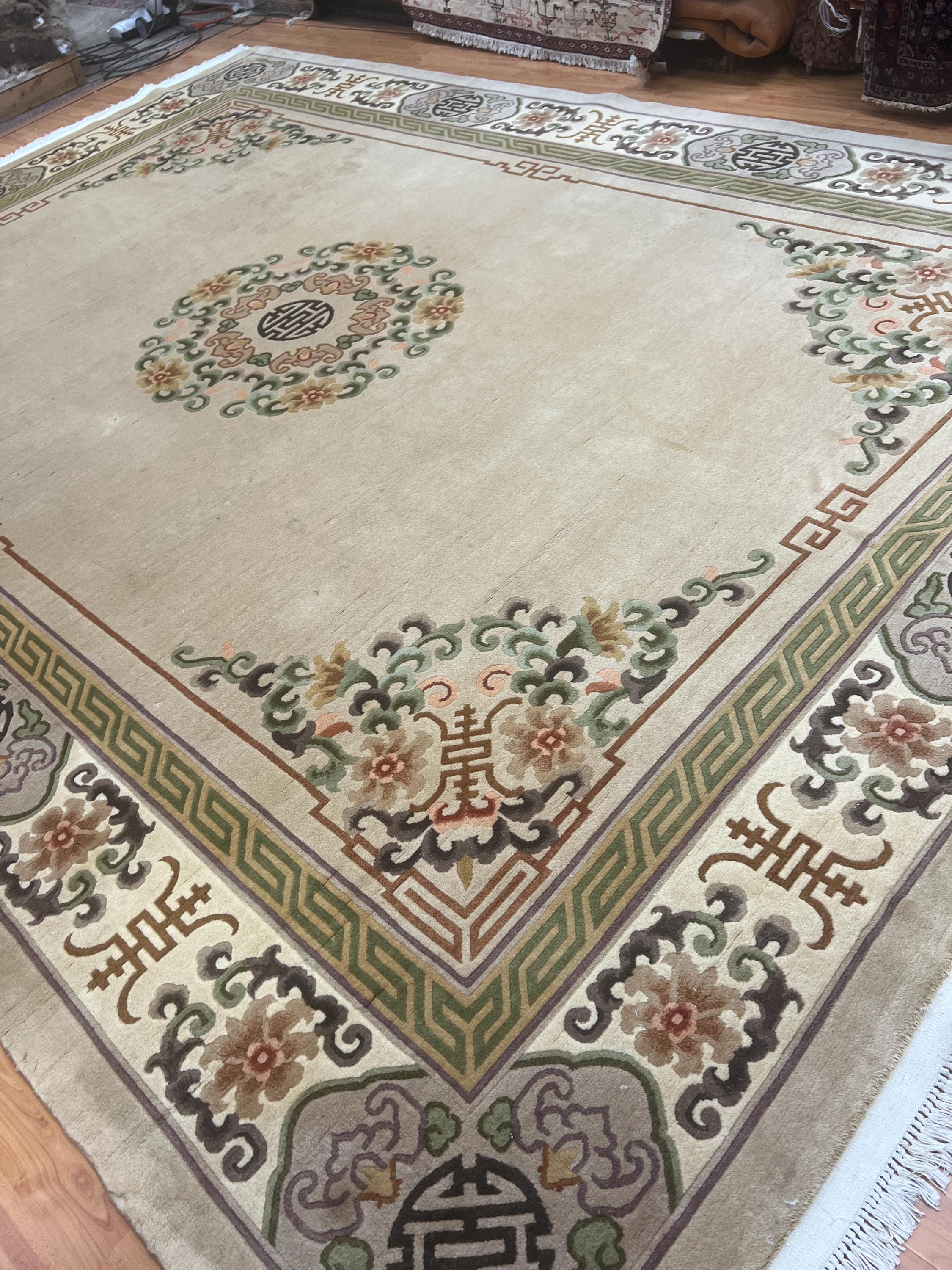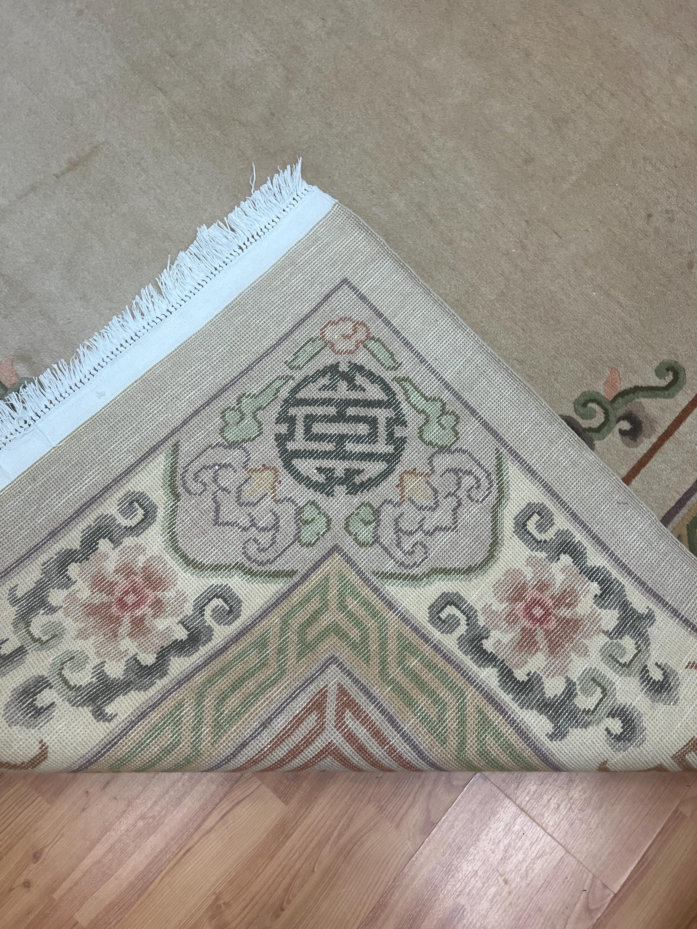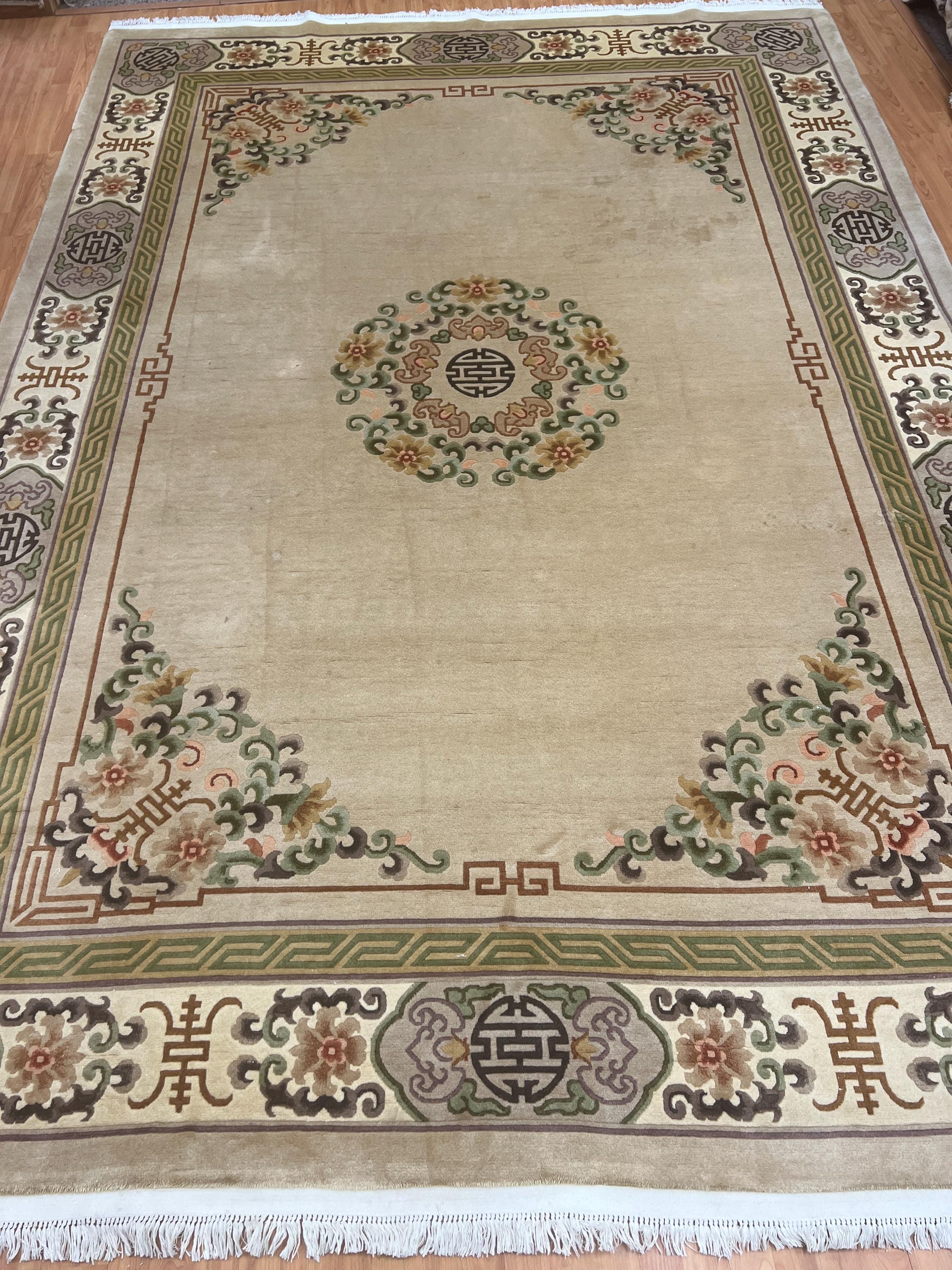 This gorgeous Oriental rug is an 8'2" x 11'6" Chinese Aubusson, circa 2000s. This Chinese rug is hand knotted with 100% wool, has a full pile and is in good condition.