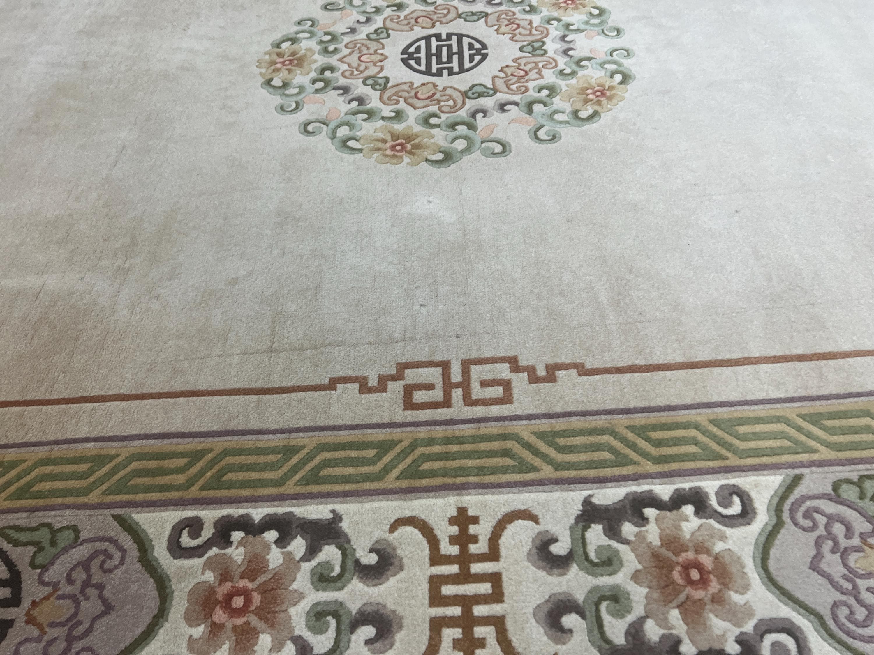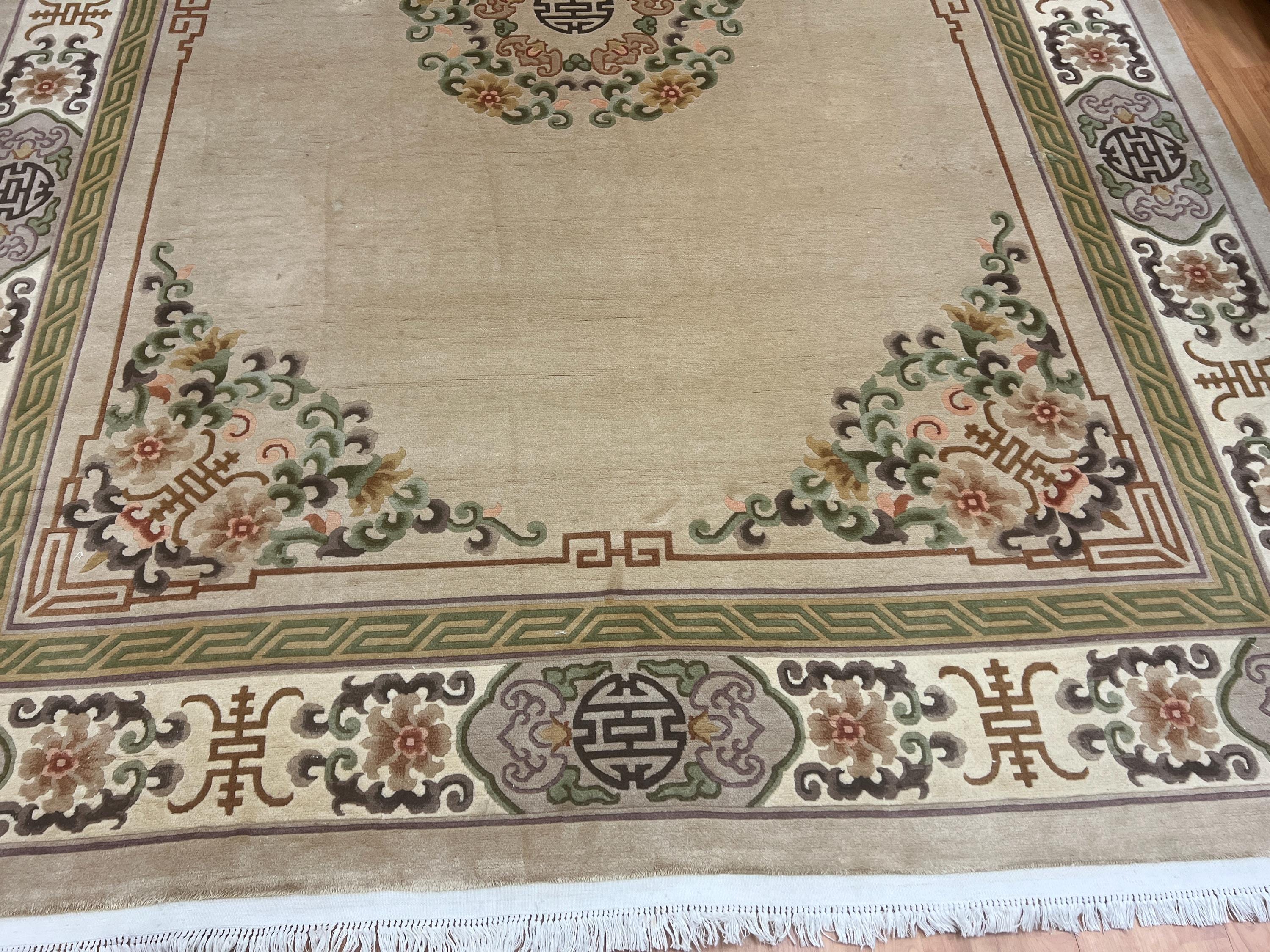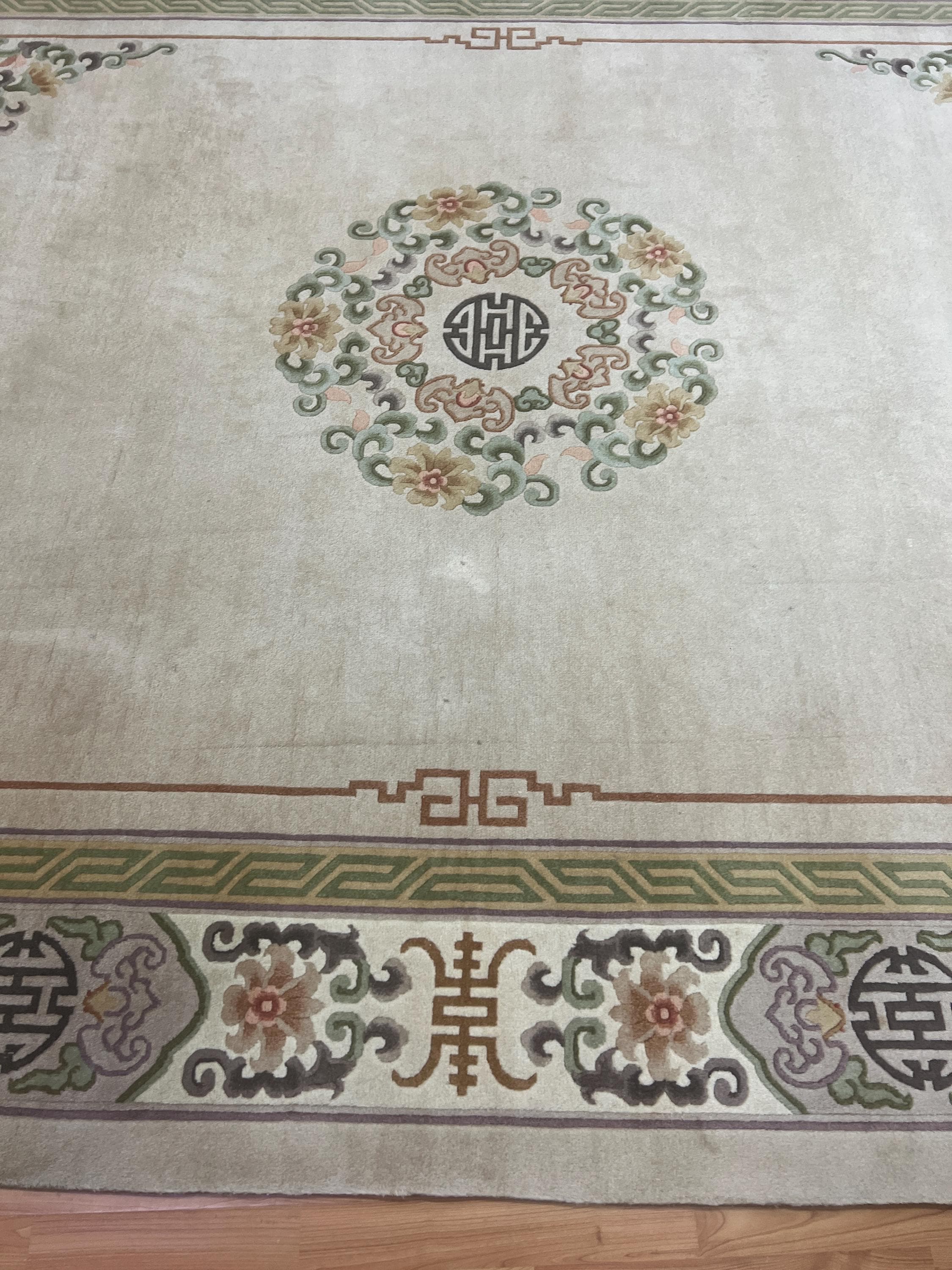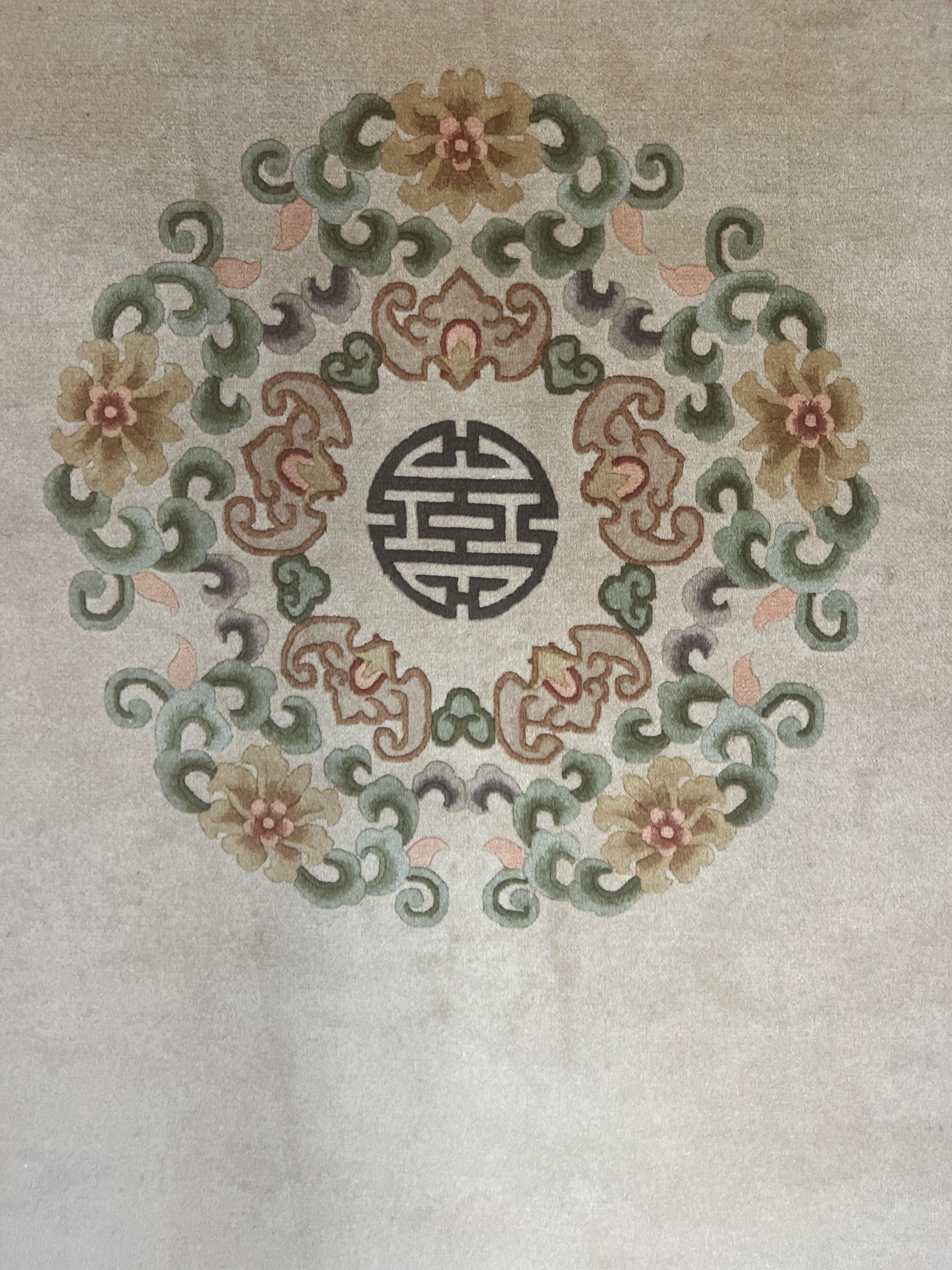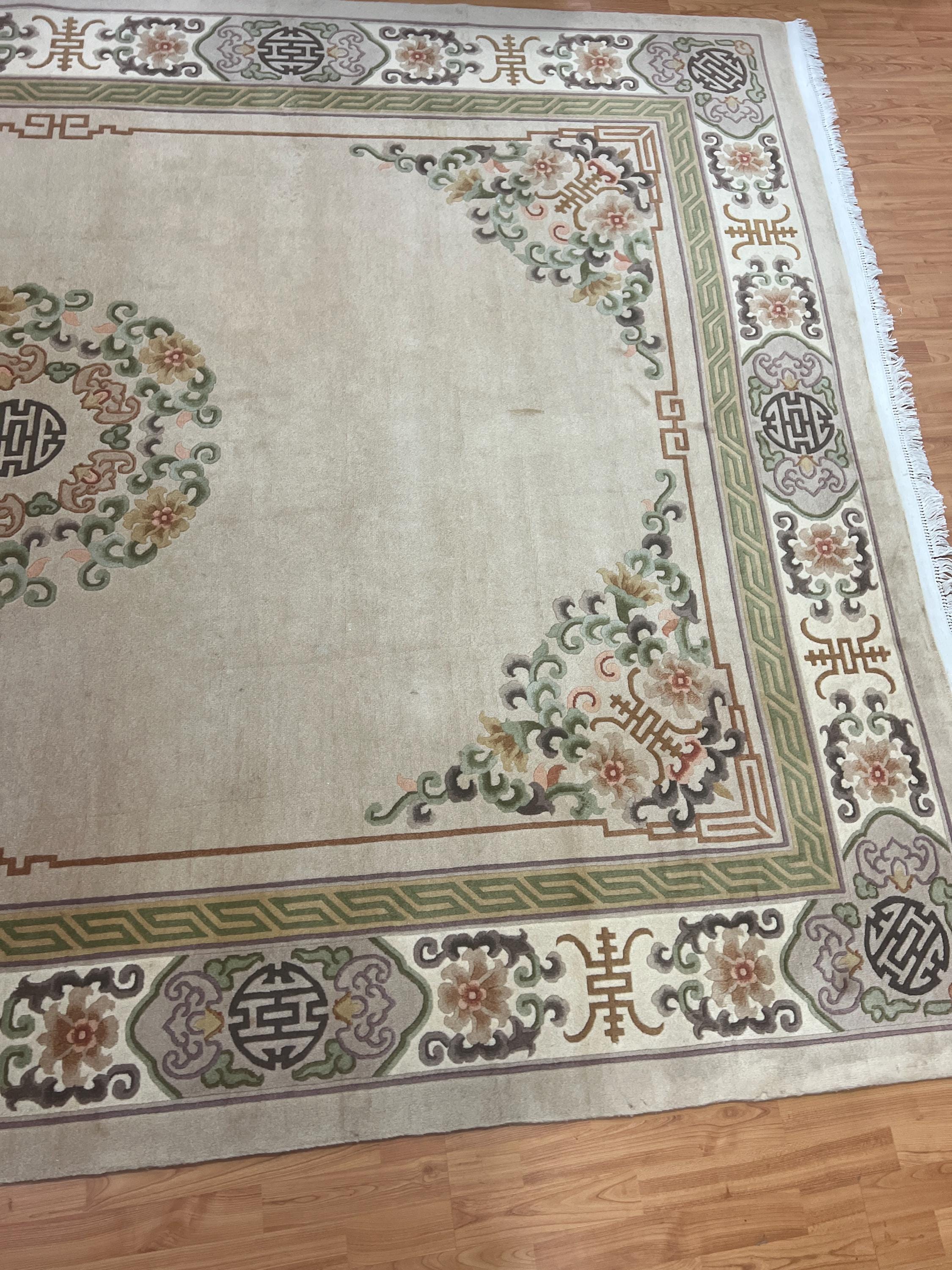 This gorgeous Oriental rug is an 8'2" x 11'6" Chinese Aubusson, circa 2000s. This Chinese rug is hand knotted with 100% wool, has a full pile and is in good condition.