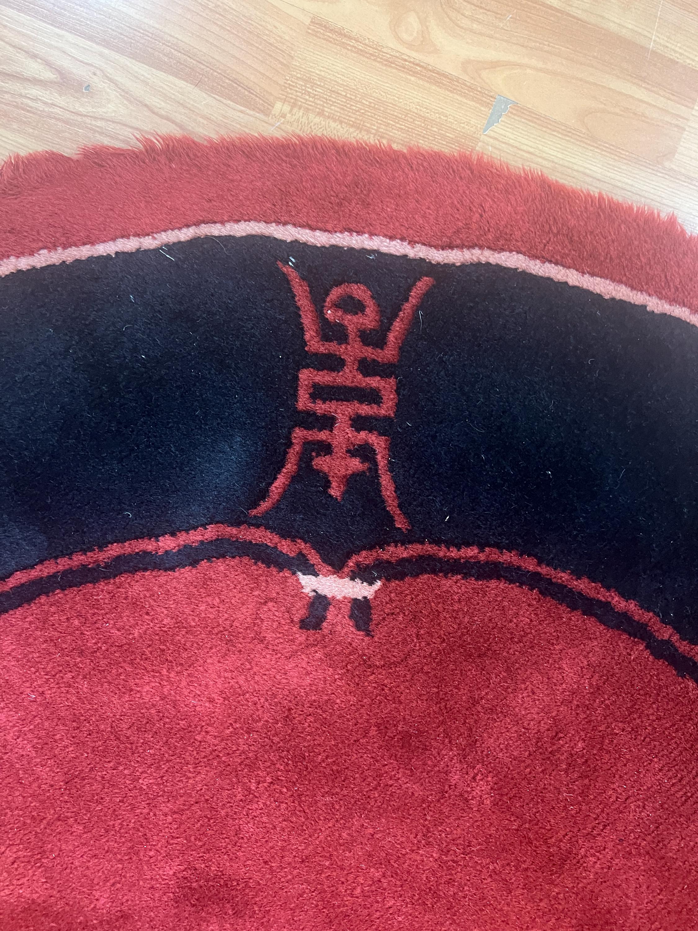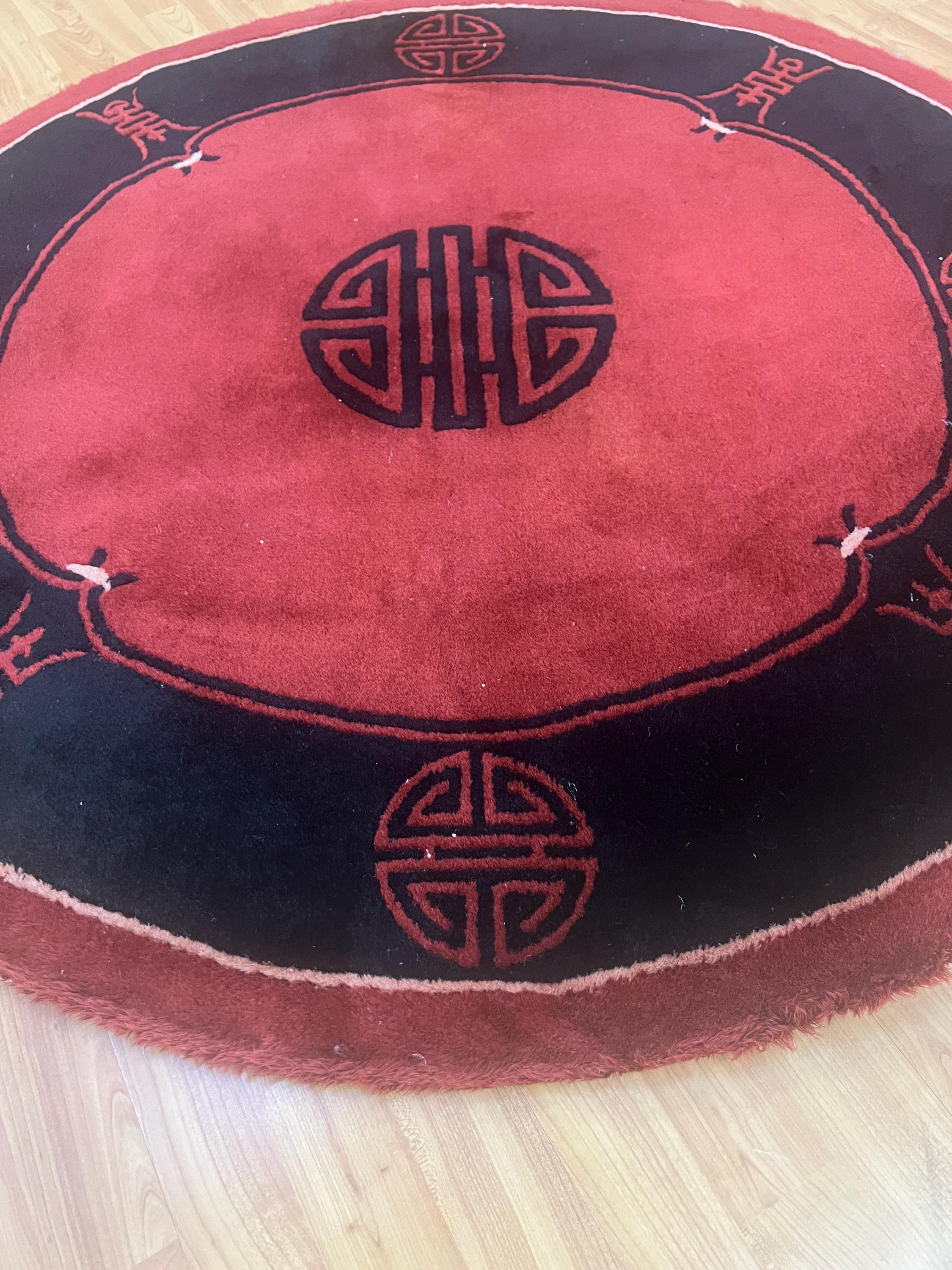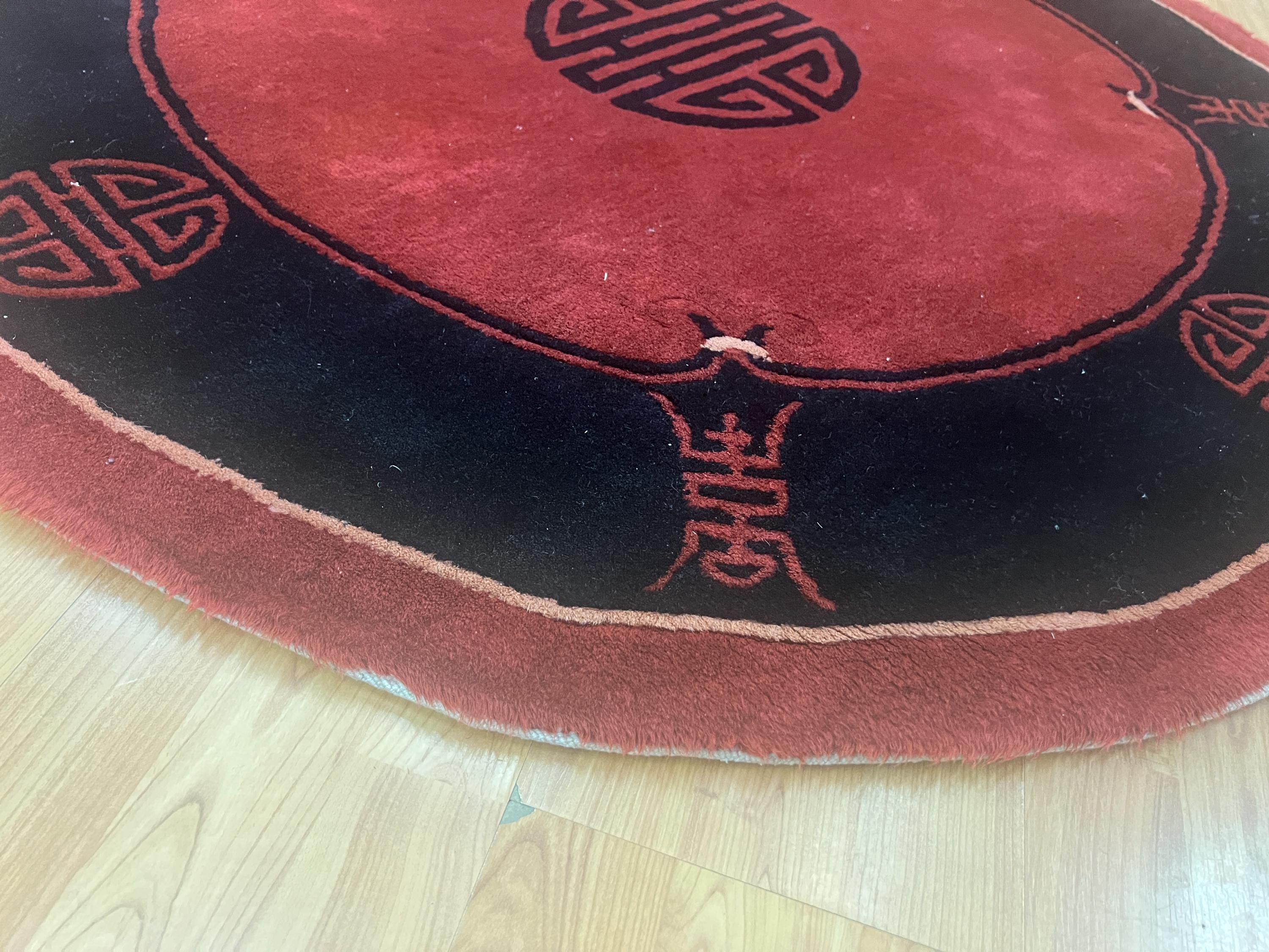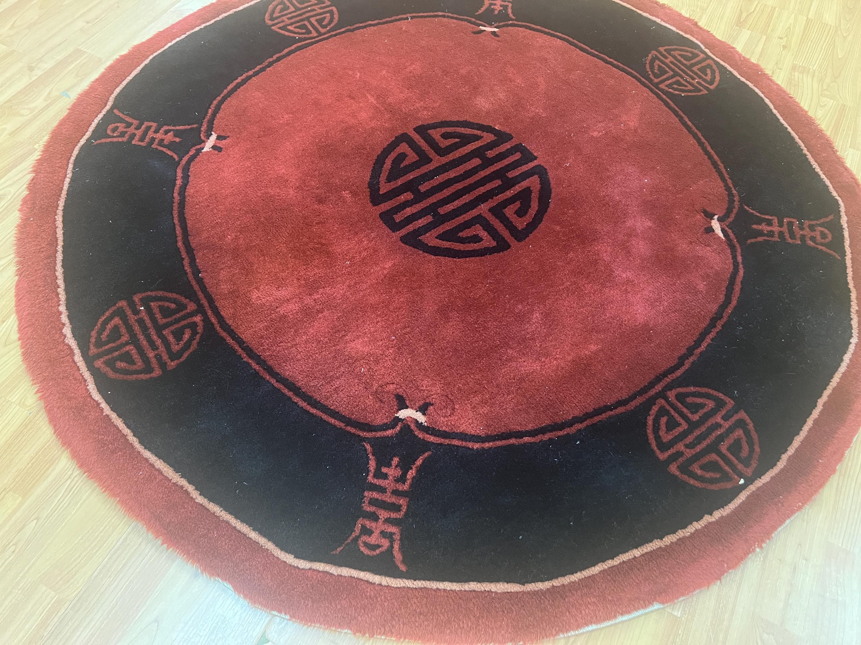 This beautiful Oriental rug is a round 4'1" x 4'1" Chinese Art Deco with a red and black border, circa 2010s. This hand made Chinese rug is made with 100% wool, has a full pile and is in good condition. This rug was recently professionally hand washed.
