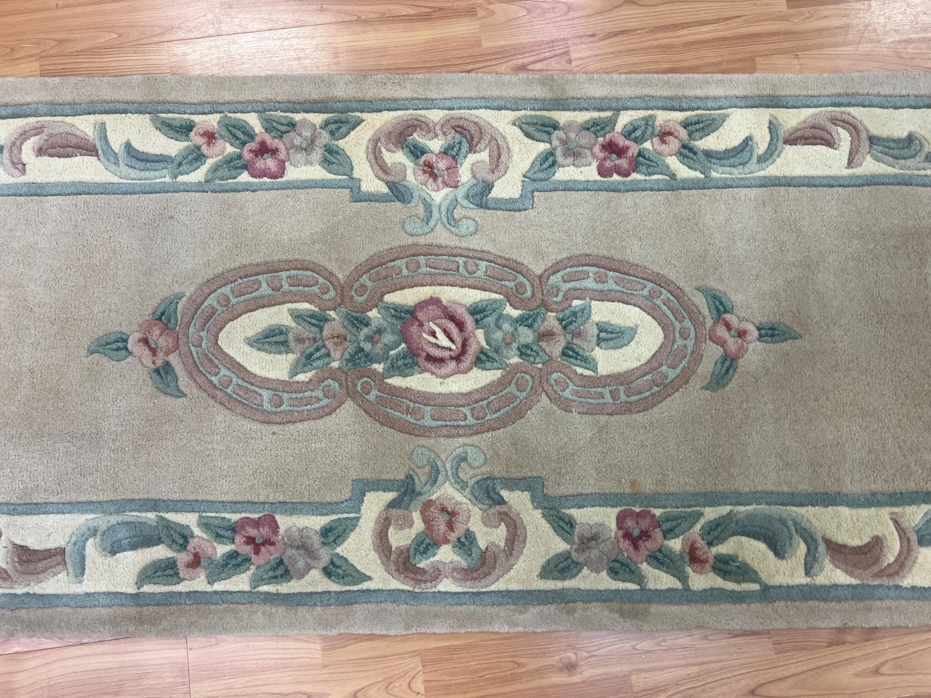 This gorgeous Oriental rug is a 2'3" x 8' Chinese Art Deco floor runner, circa 2000s. This hand tufted Chinese rug is made with 100% wool and is in good condition.