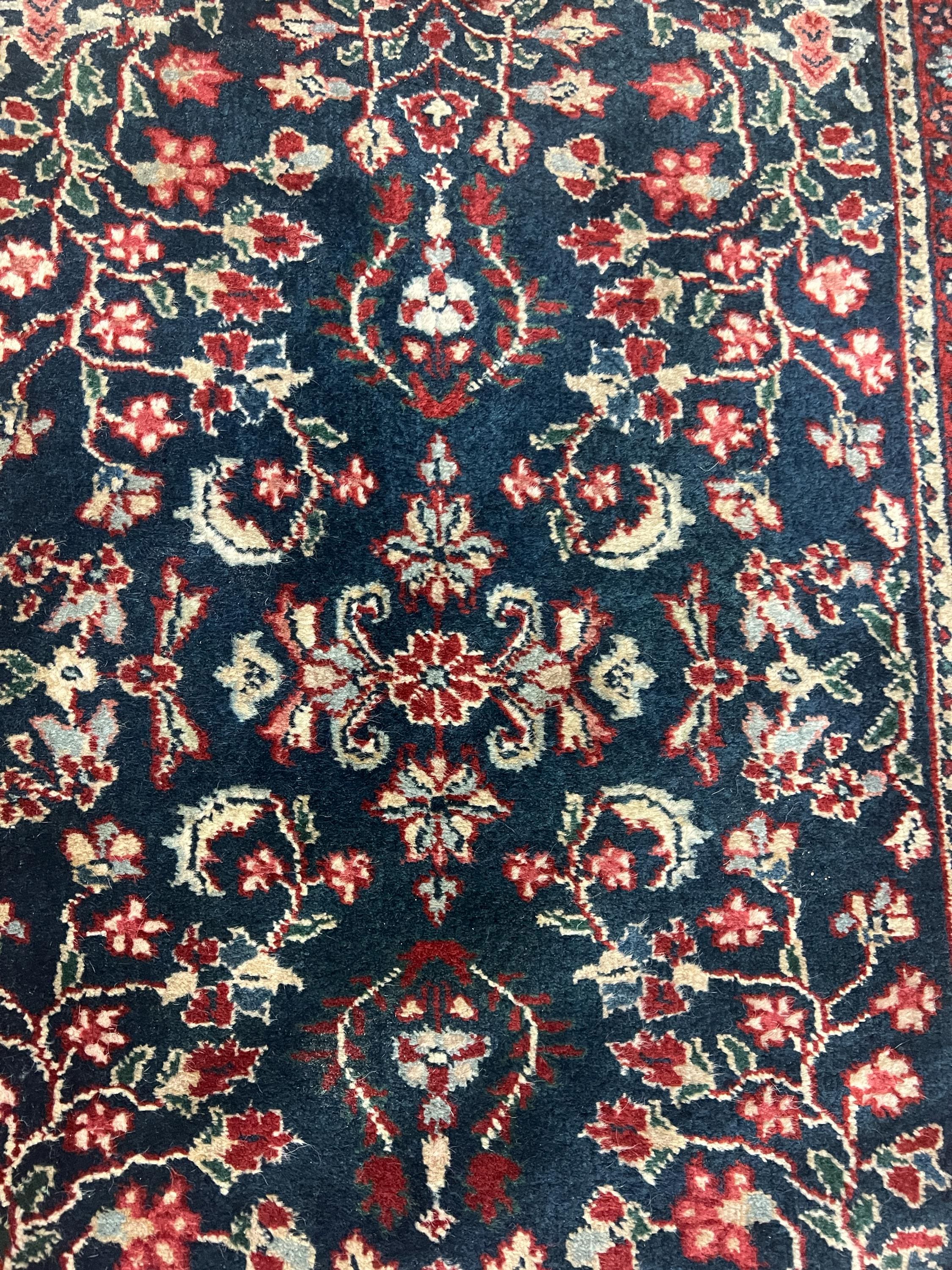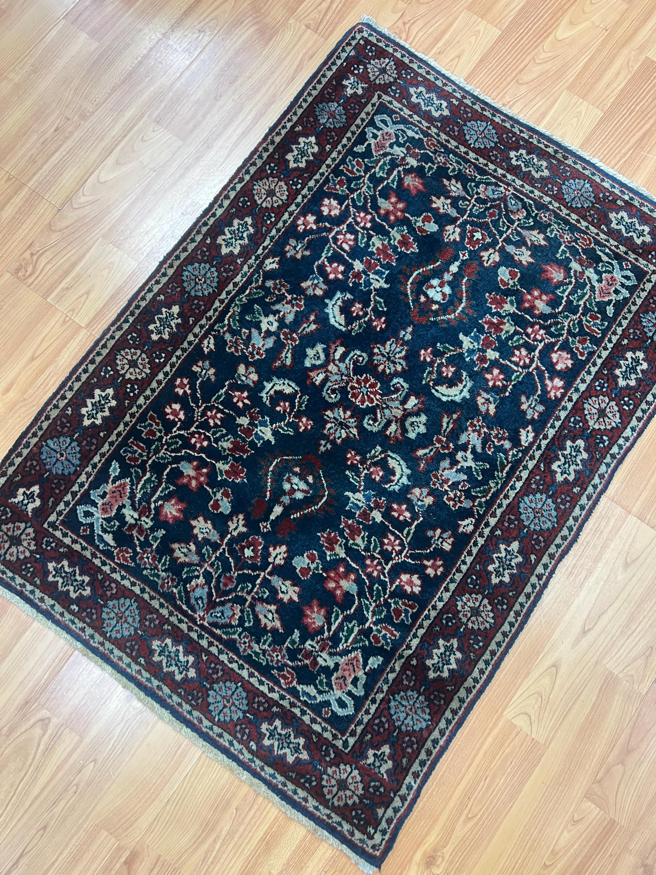 This beautiful Oriental rug is an antique 2'1" x 2'10" Turkish with a dark blue background, circa 1950s. This hand knotted rug is made with 100% wool, has a full pile and is in perfect condition.