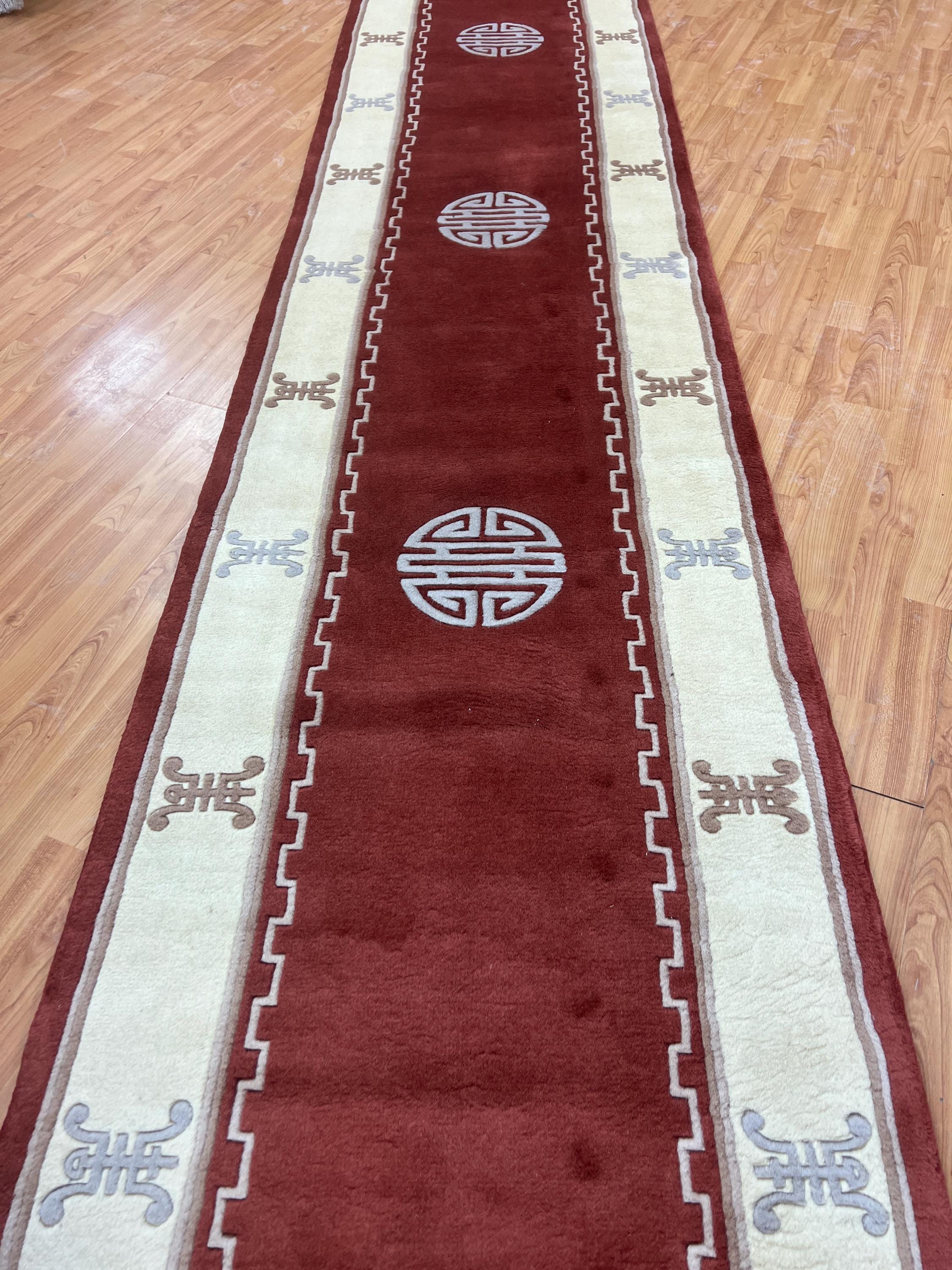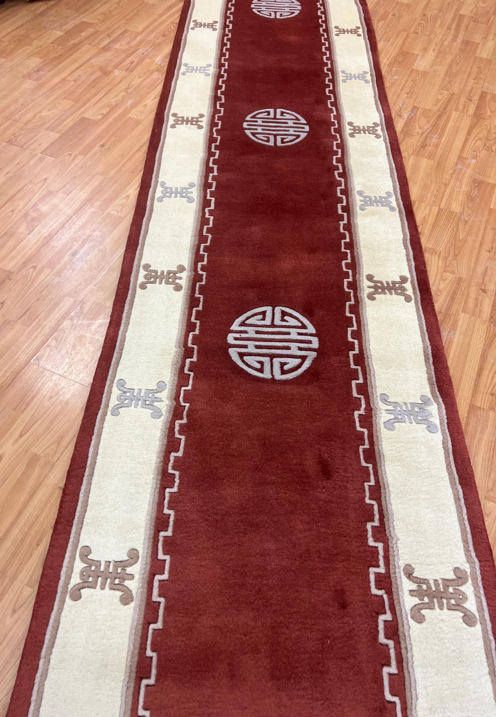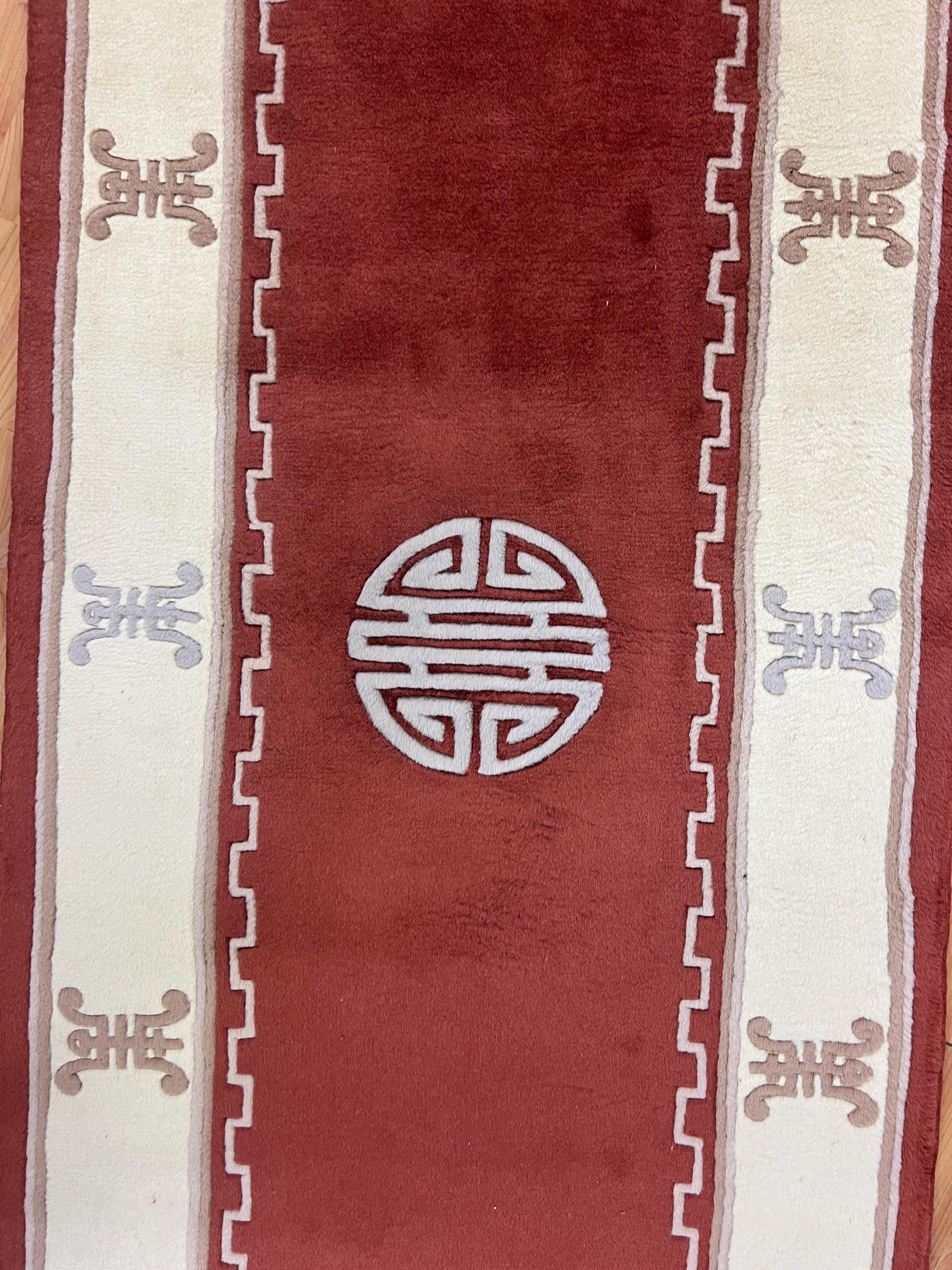 This beautiful Oriental rug is a 2'6" x 19" Chinese Art Deco floor runner, circa 2010s. This hand knotted rug is made with a 100% wool, has a full pile and is in perfect condition.