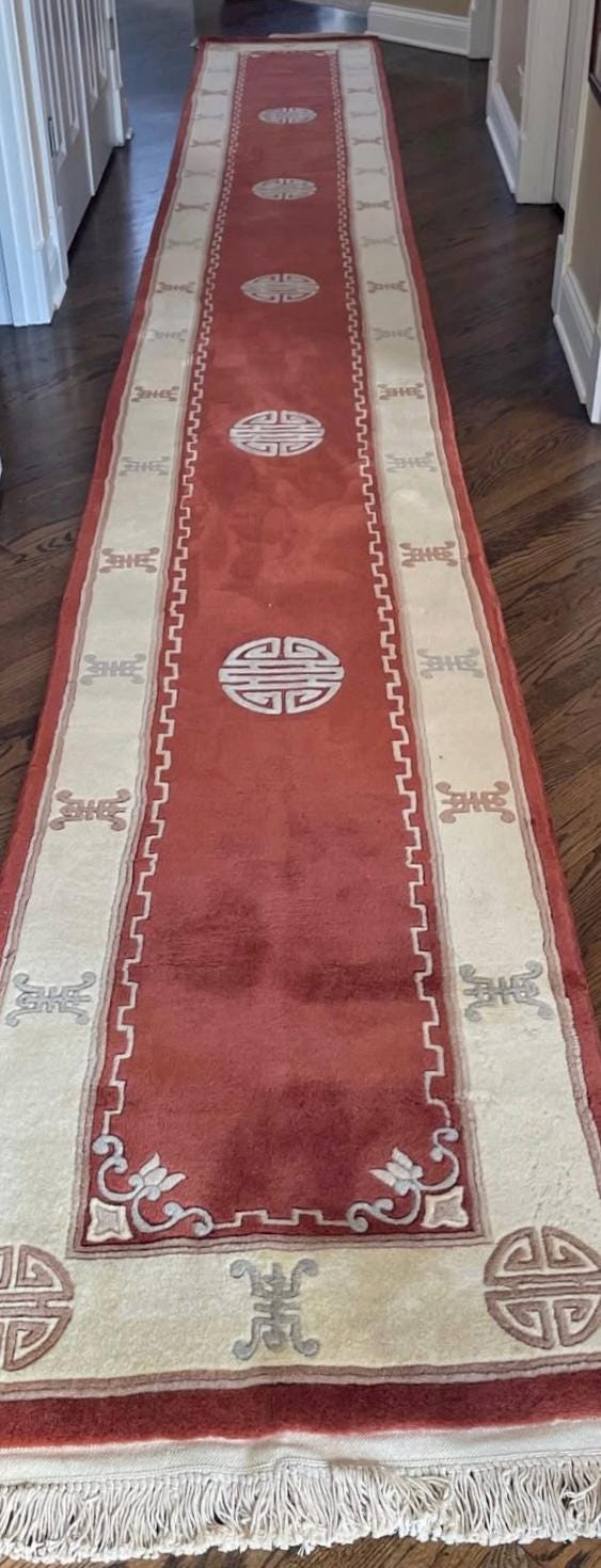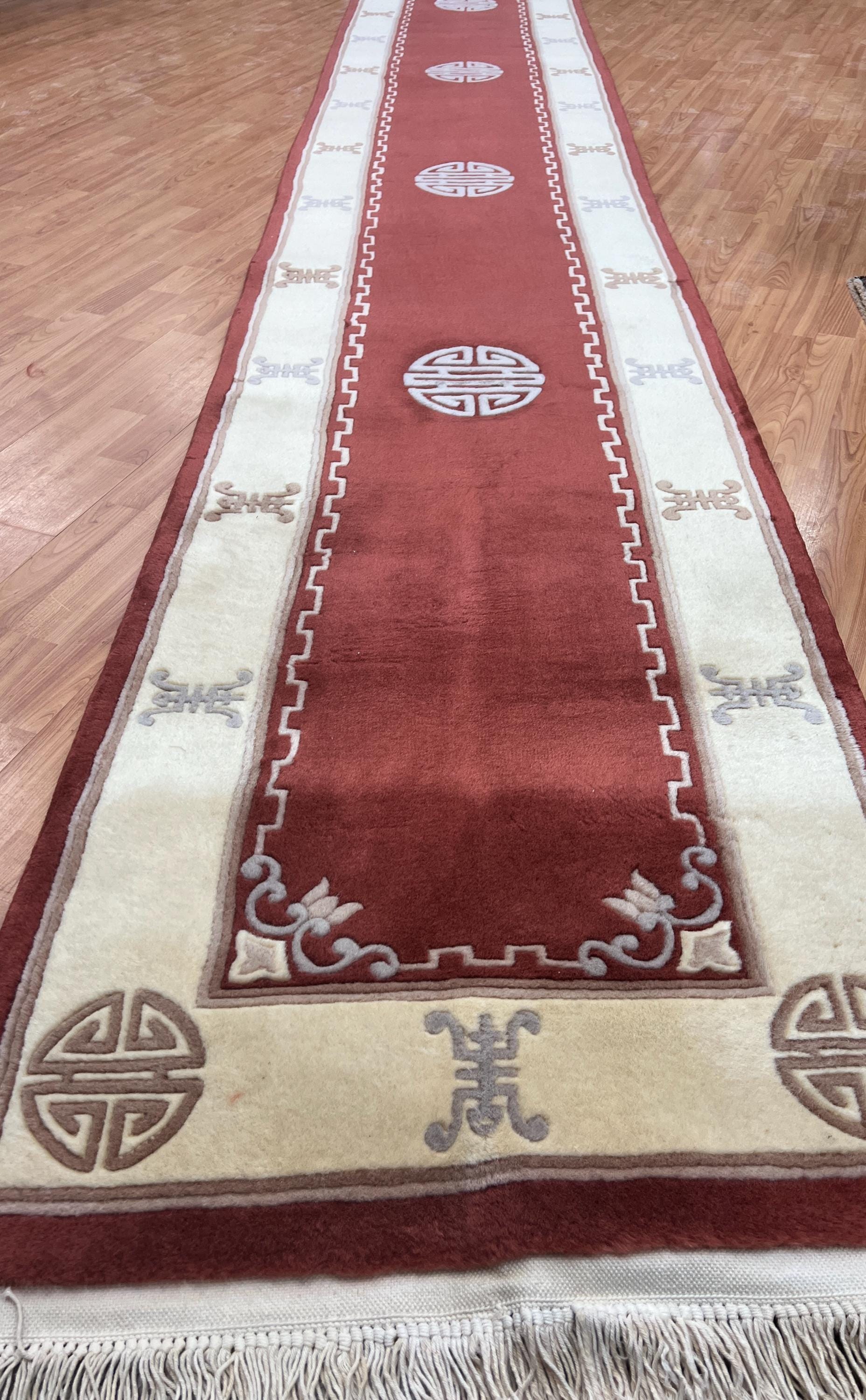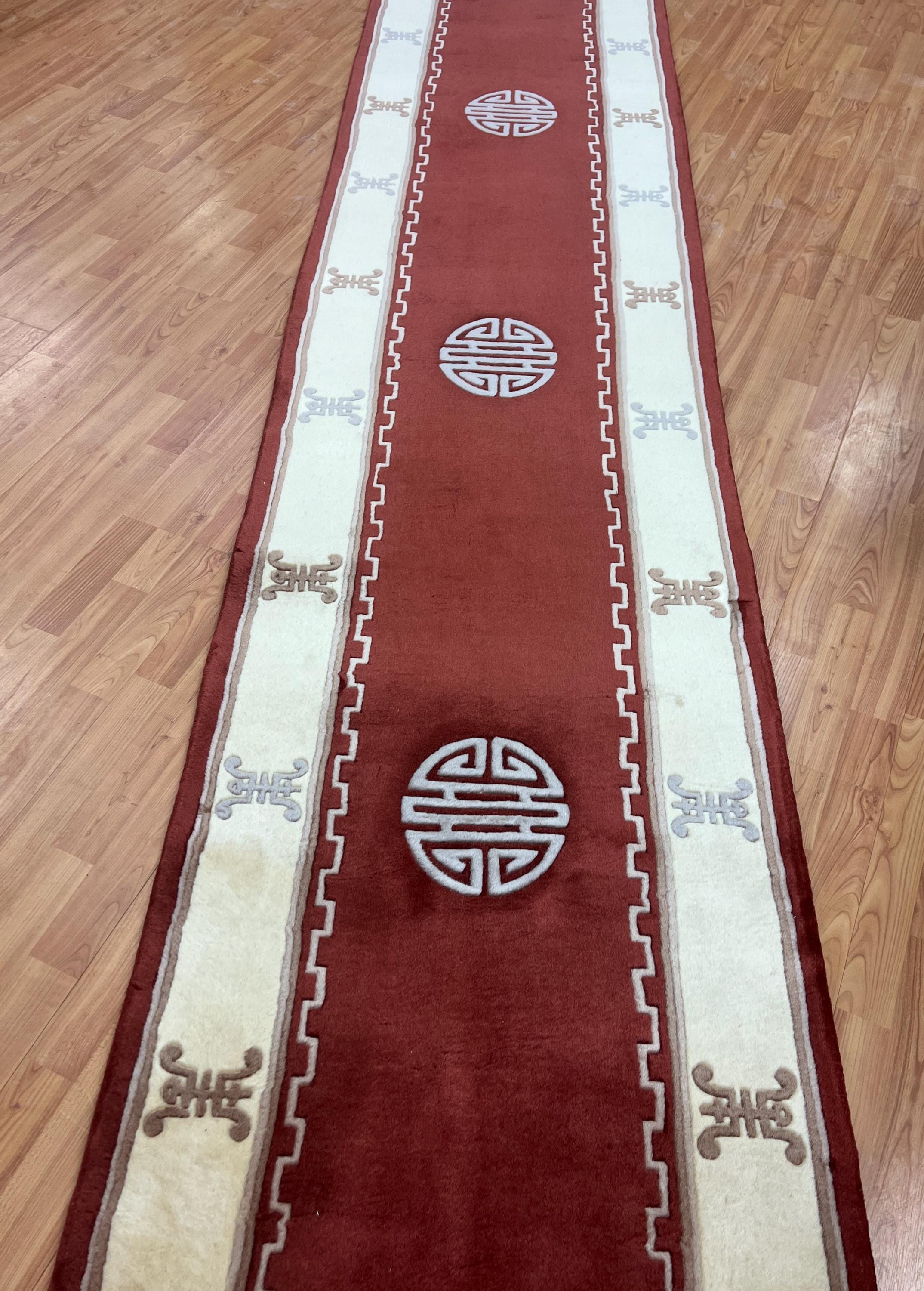 This beautiful Oriental rug is a 2'6" x 19" Chinese Art Deco floor runner, circa 2010s. This hand knotted rug is made with a 100% wool, has a full pile and is in perfect condition.