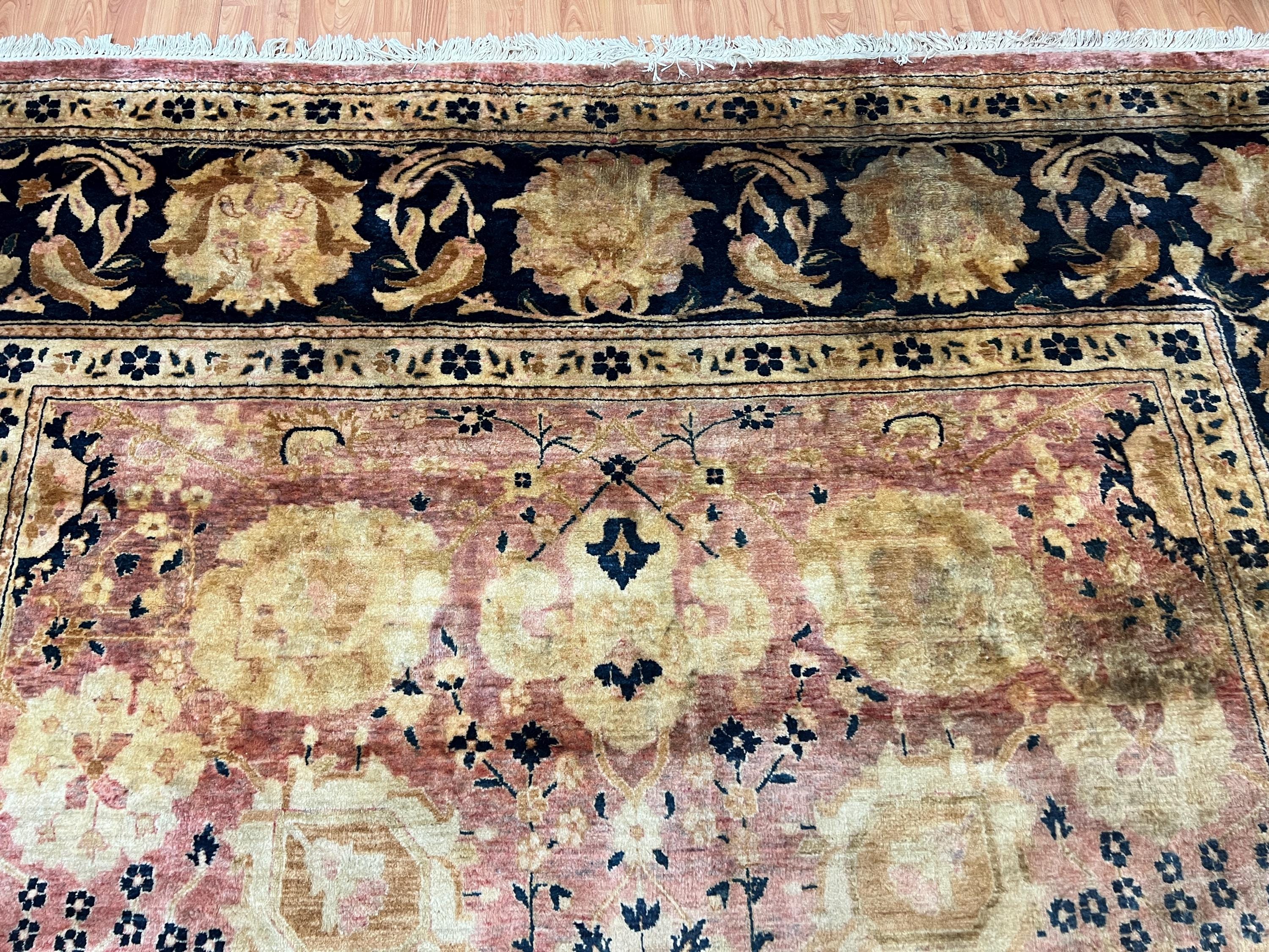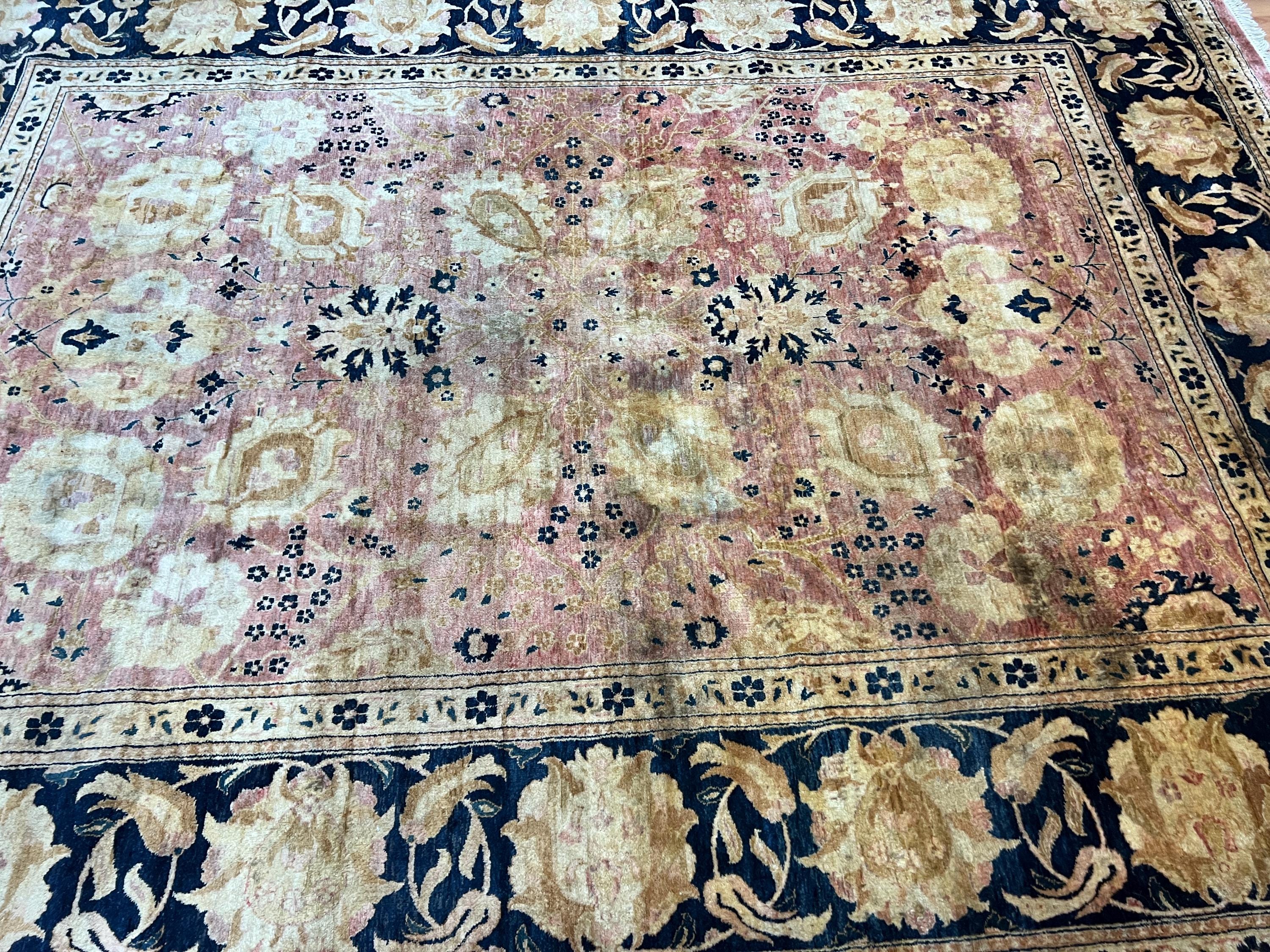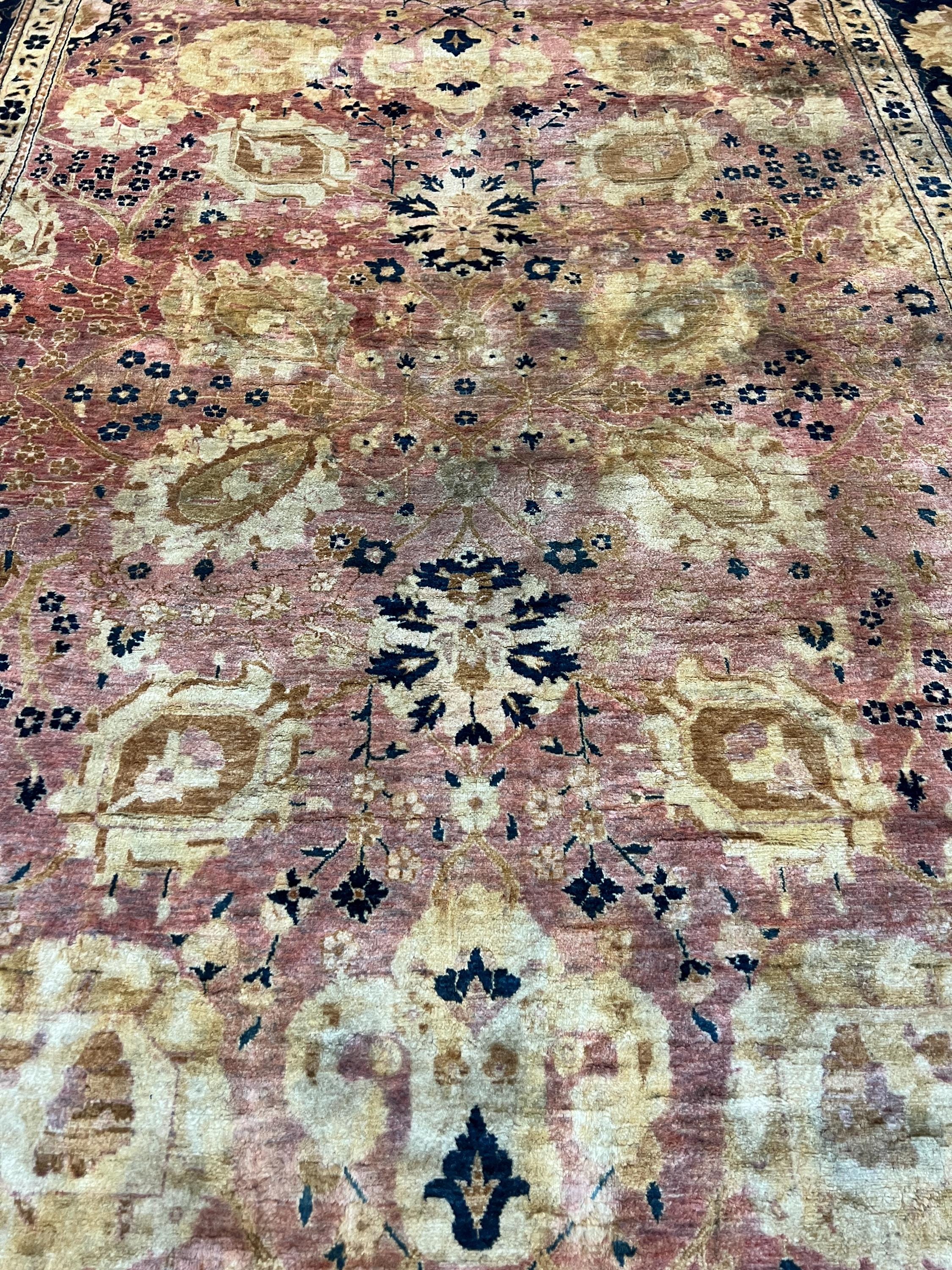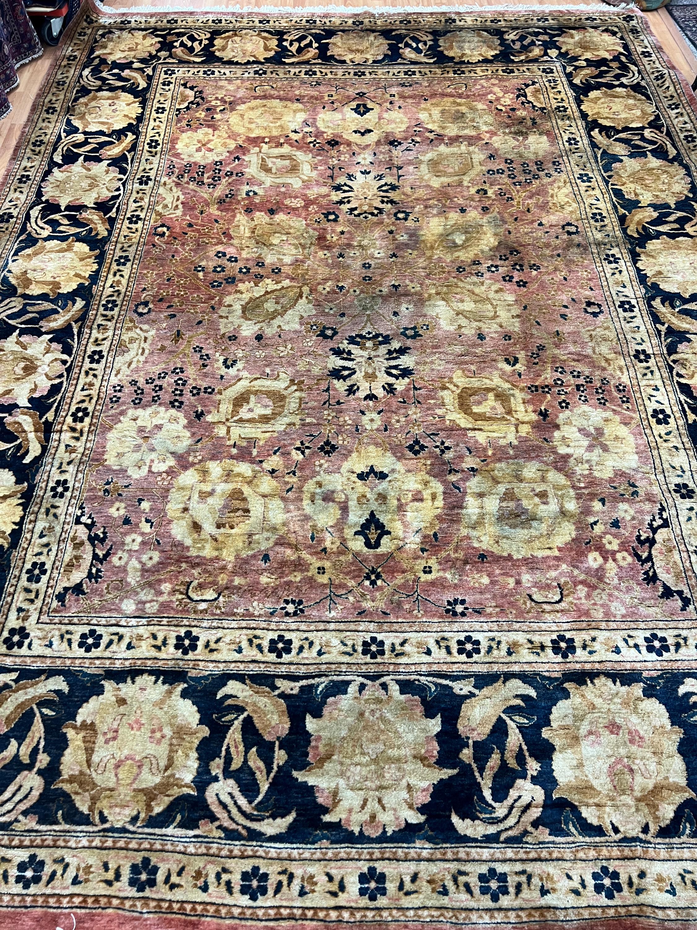 This gorgeous Oriental rug is a 9' x 12' Indian Agra, circa 1950s. This hand knotted Indian rug is made with a 100% wool and has a full pile. This rug is in fair condition and was recently professionally hand washed. This rug is sold as is, no returns accepted.