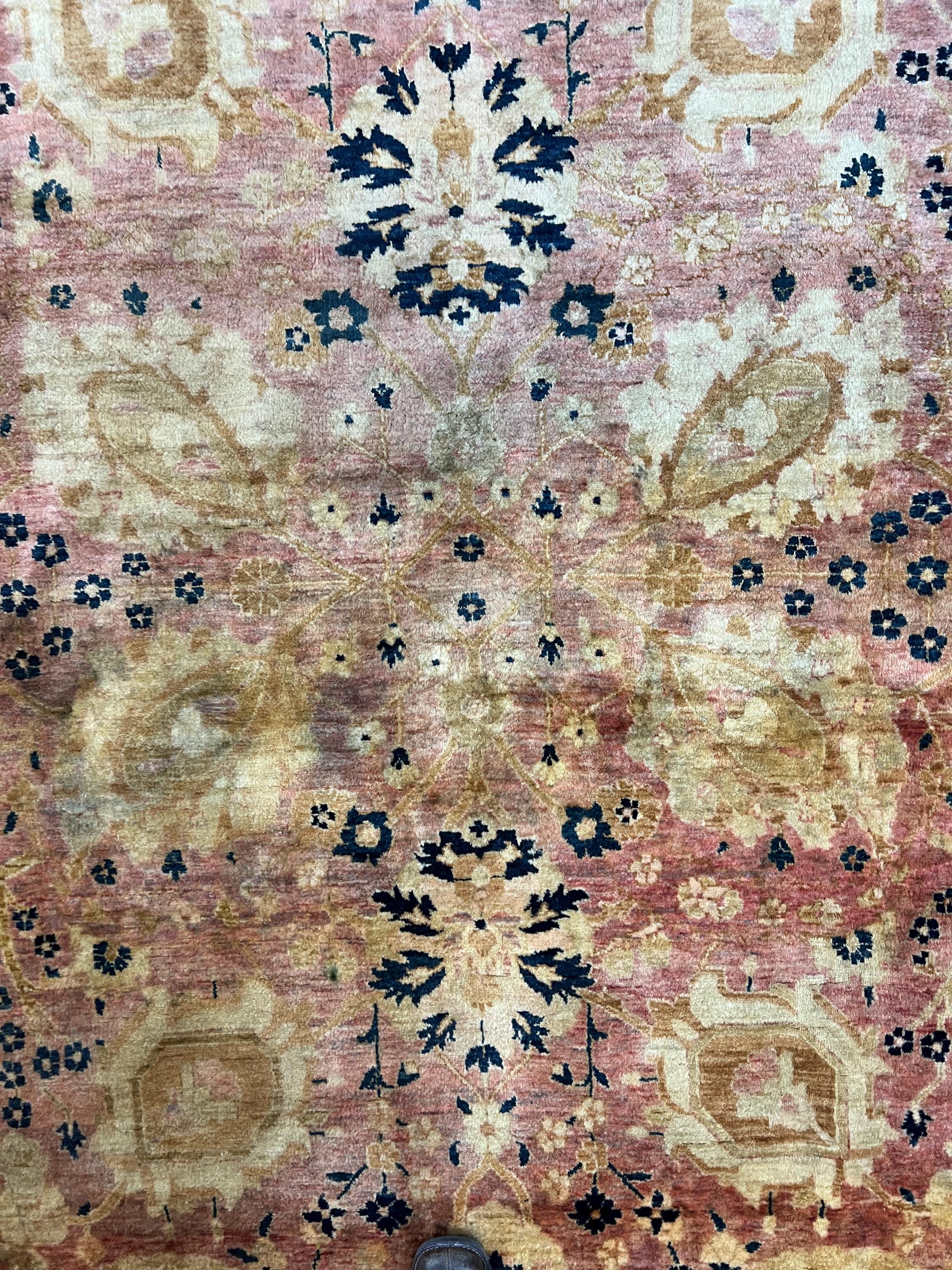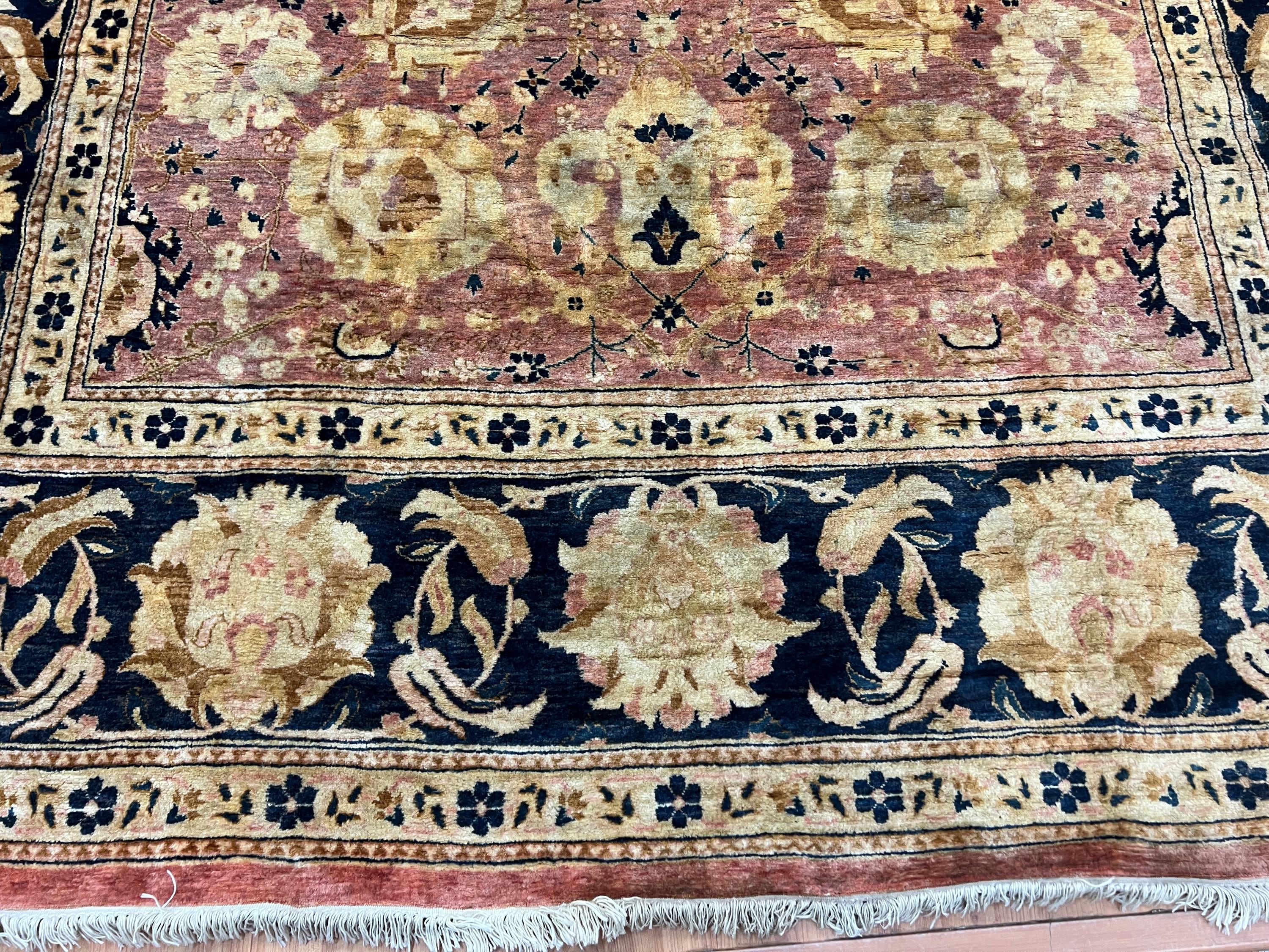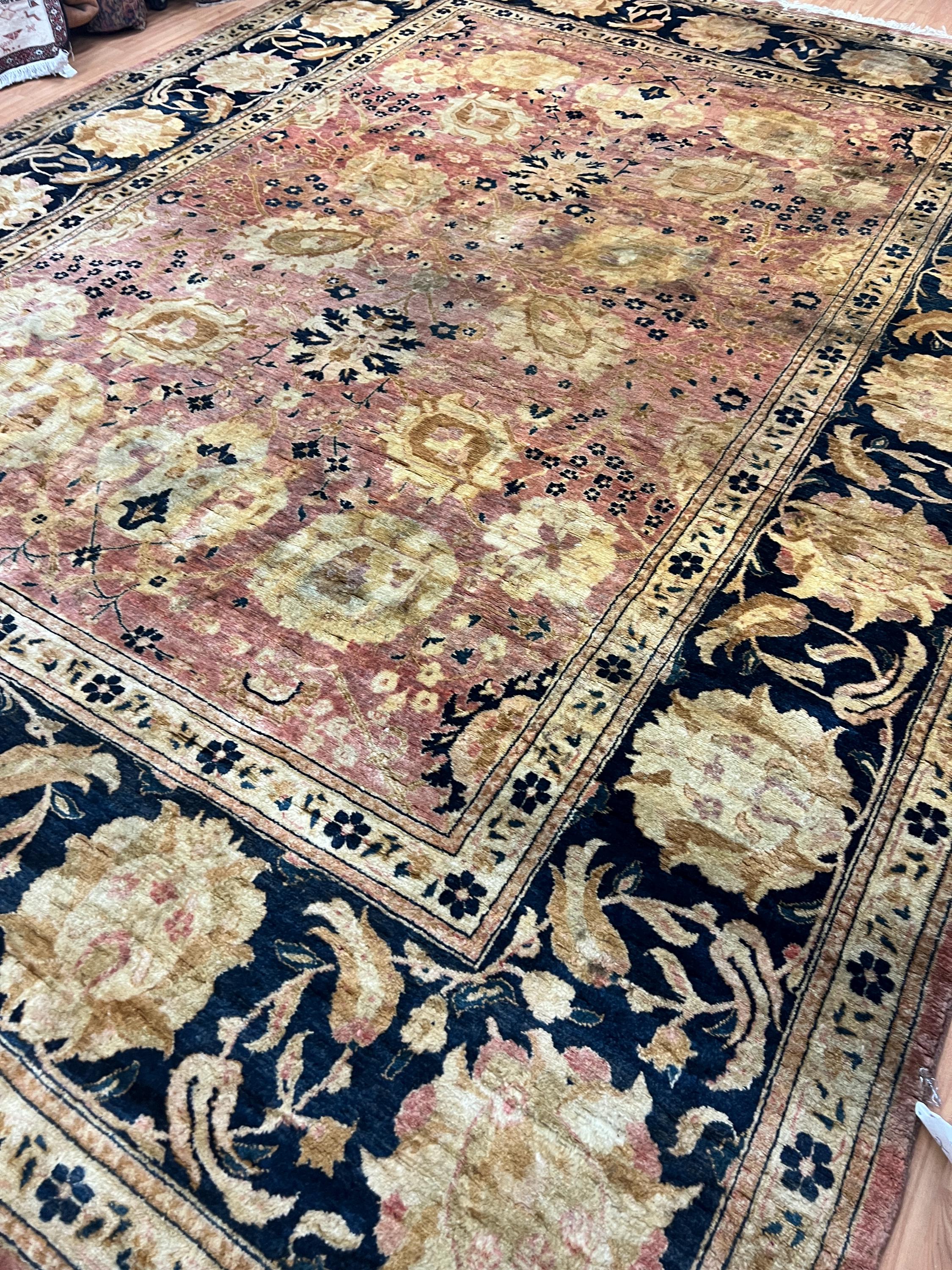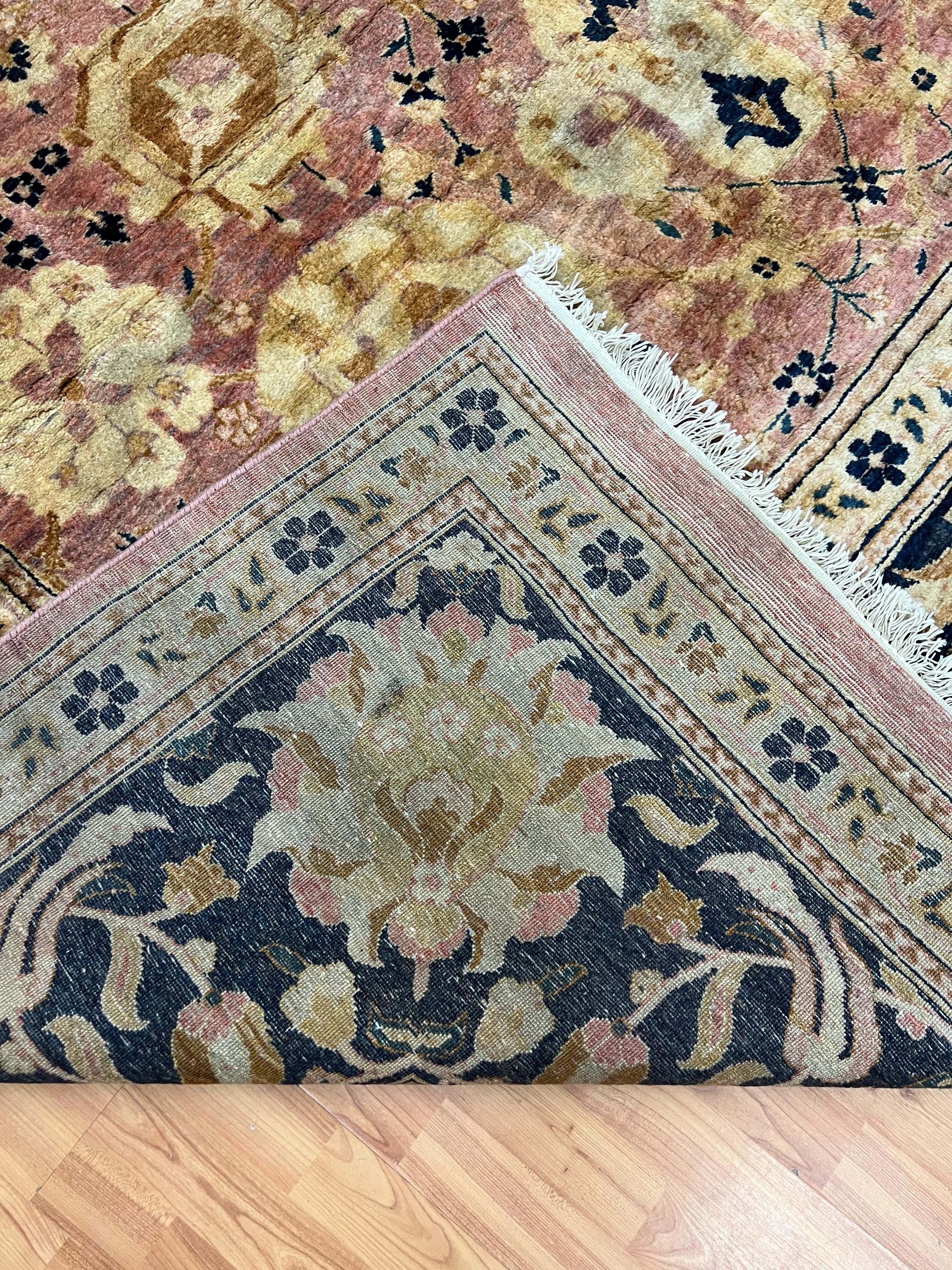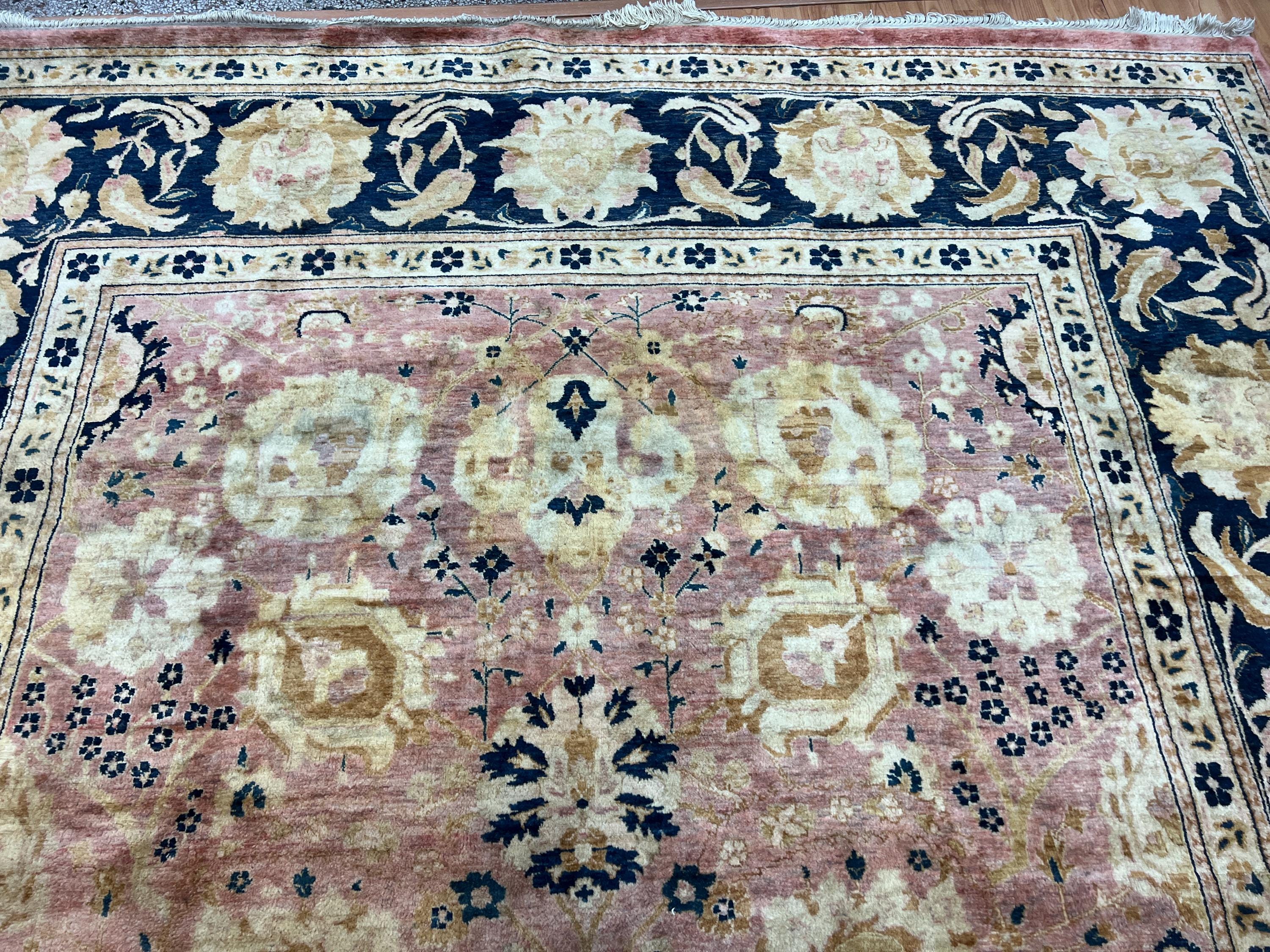 This gorgeous Oriental rug is a 9' x 12' Indian Agra, circa 1950s. This hand knotted Indian rug is made with a 100% wool and has a full pile. This rug is in fair condition and was recently professionally hand washed. This rug is sold as is, no returns accepted.