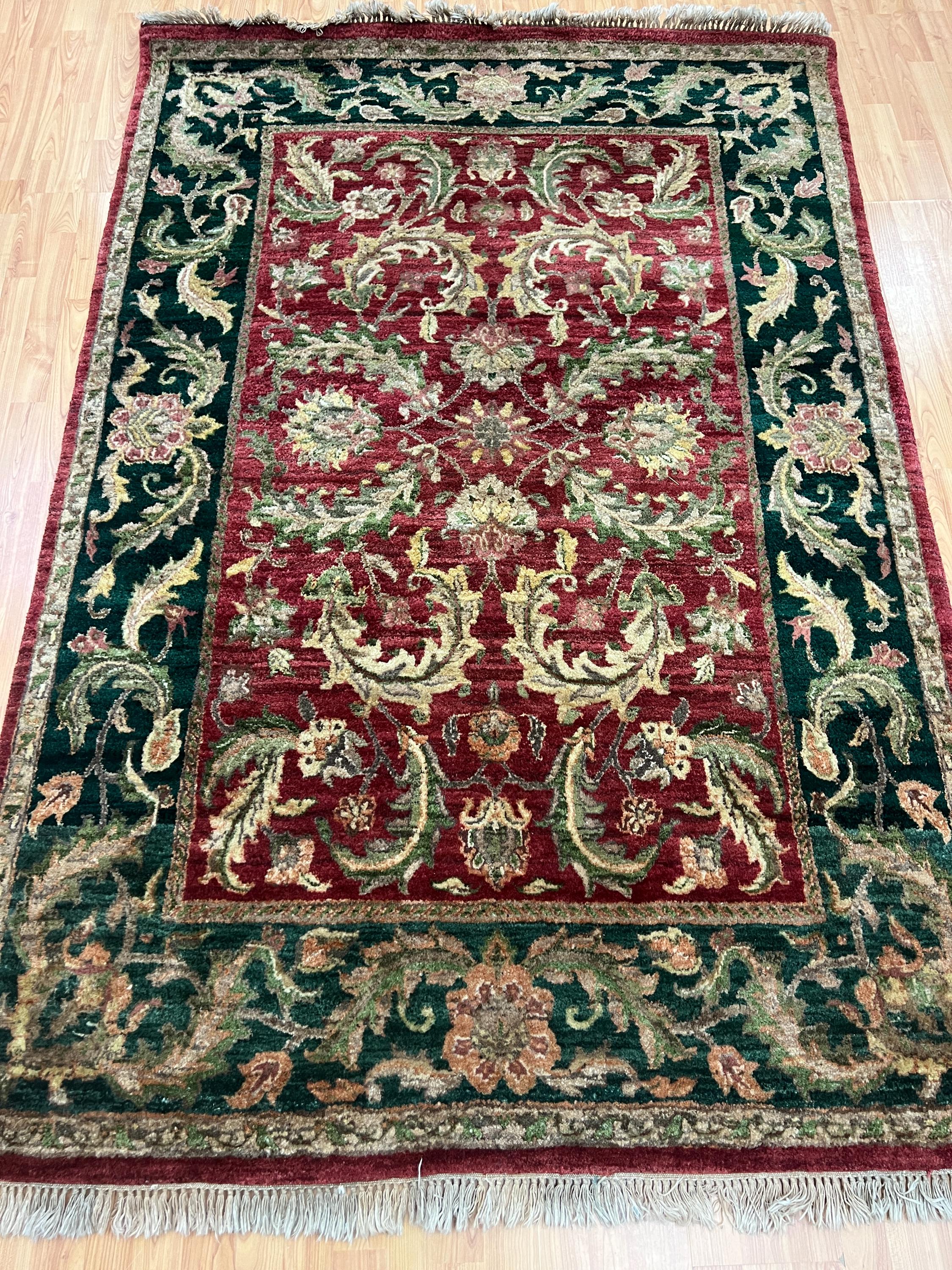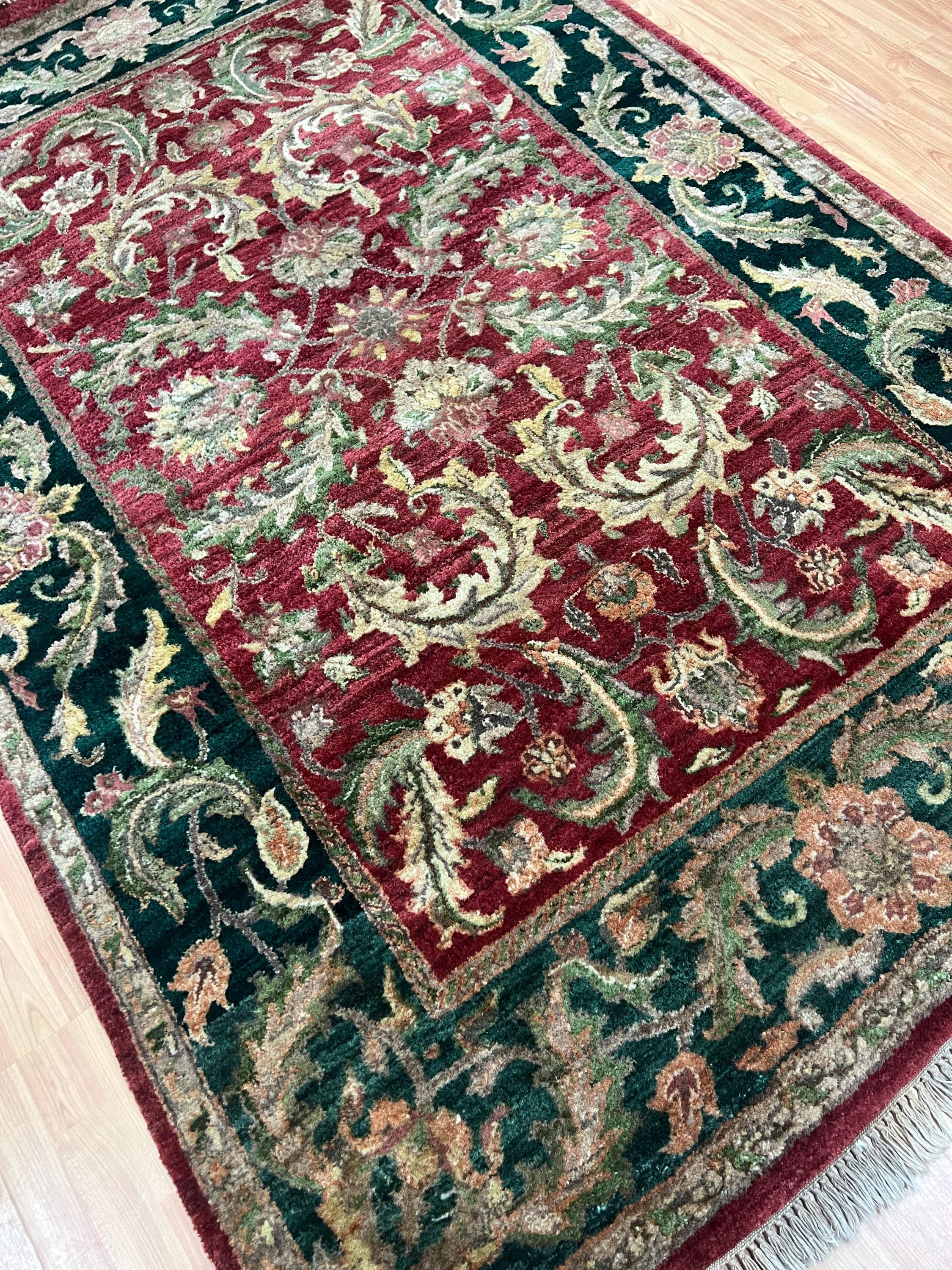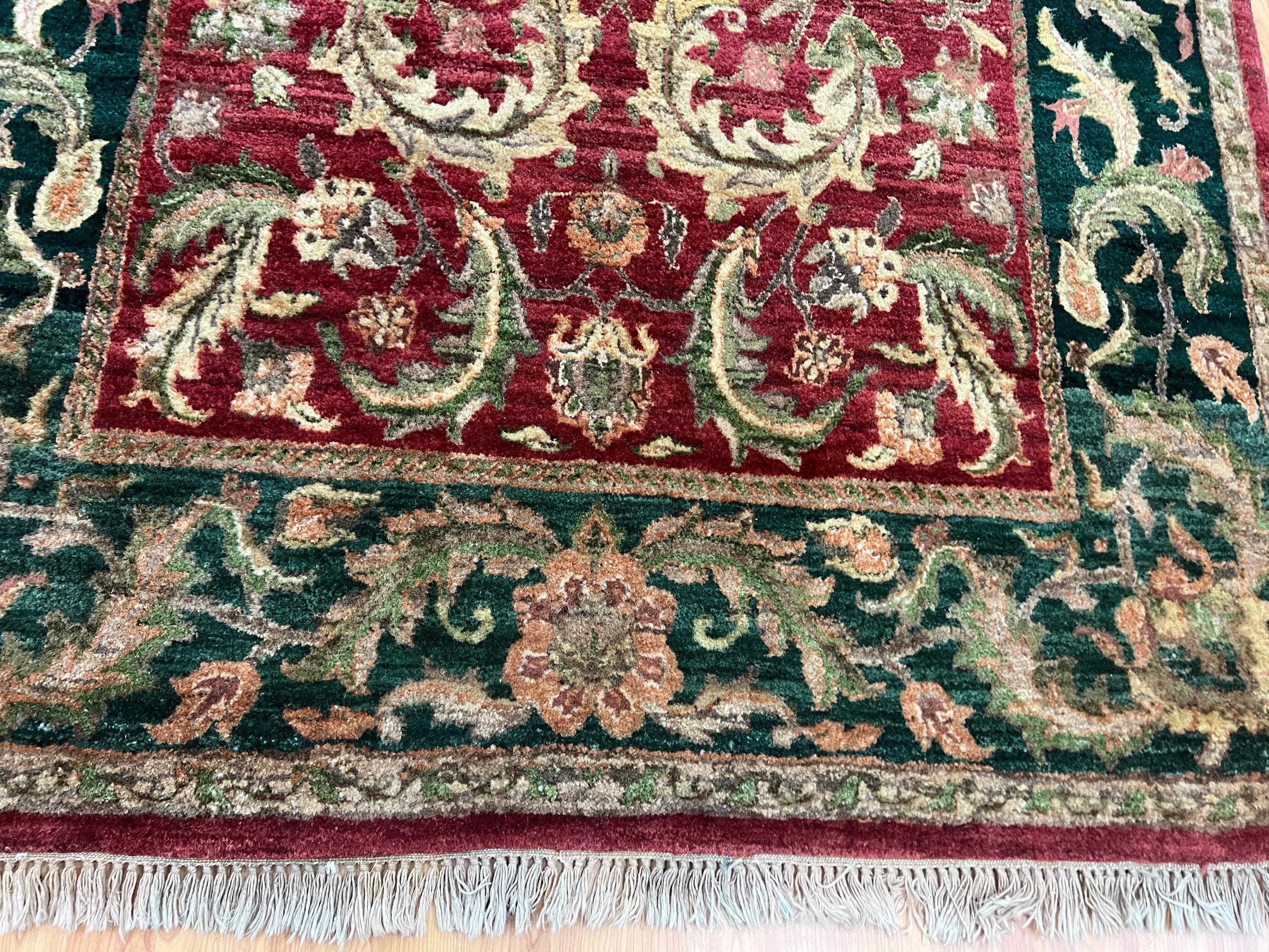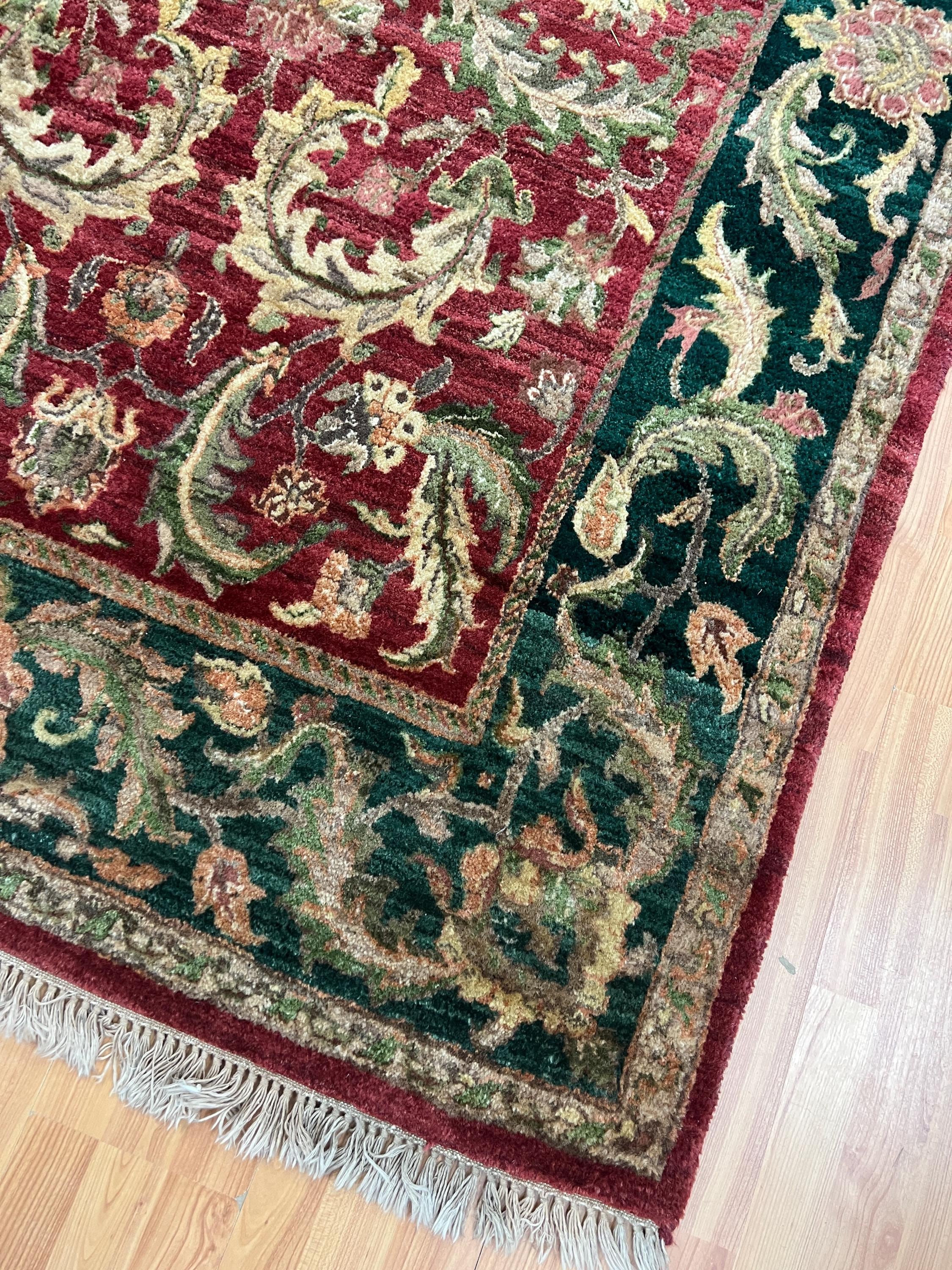 This marvelous Oriental rug is a brand new 5' x 7’ Indian Agra with a burgandy background and green borders. This hand knotted Indian Agra rug is made with 100% wool.