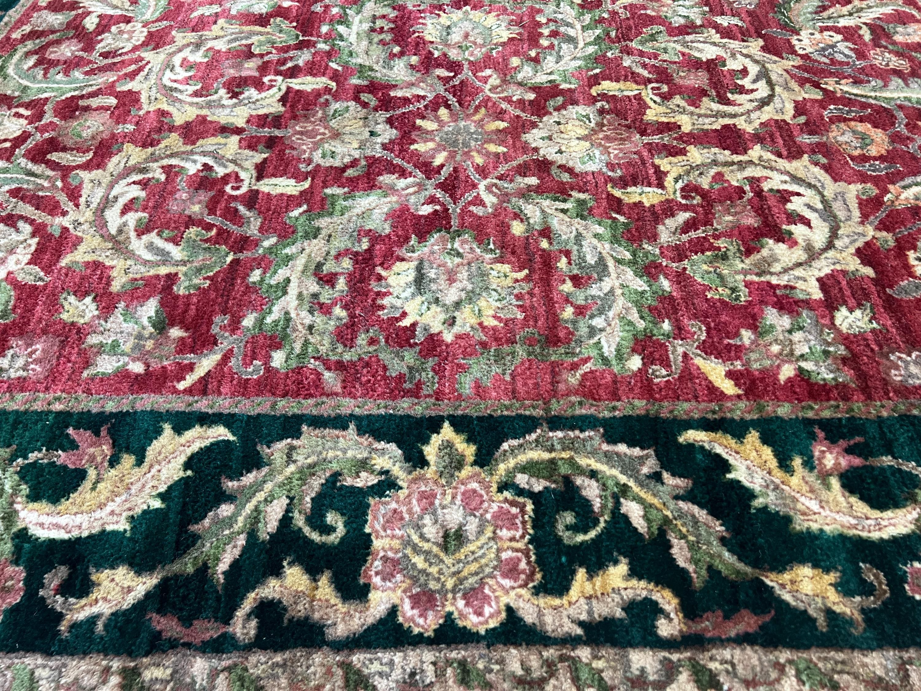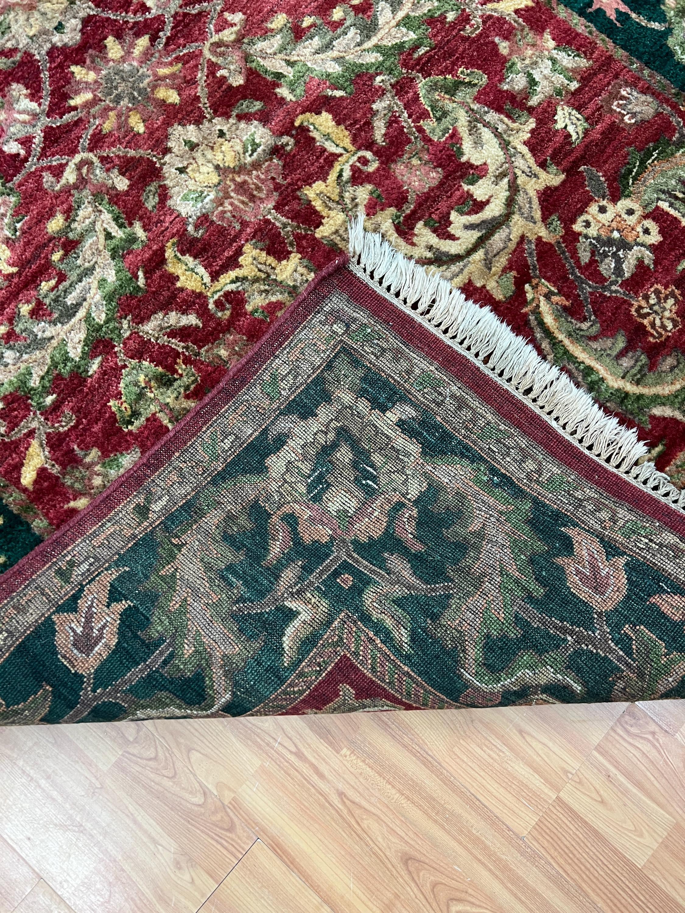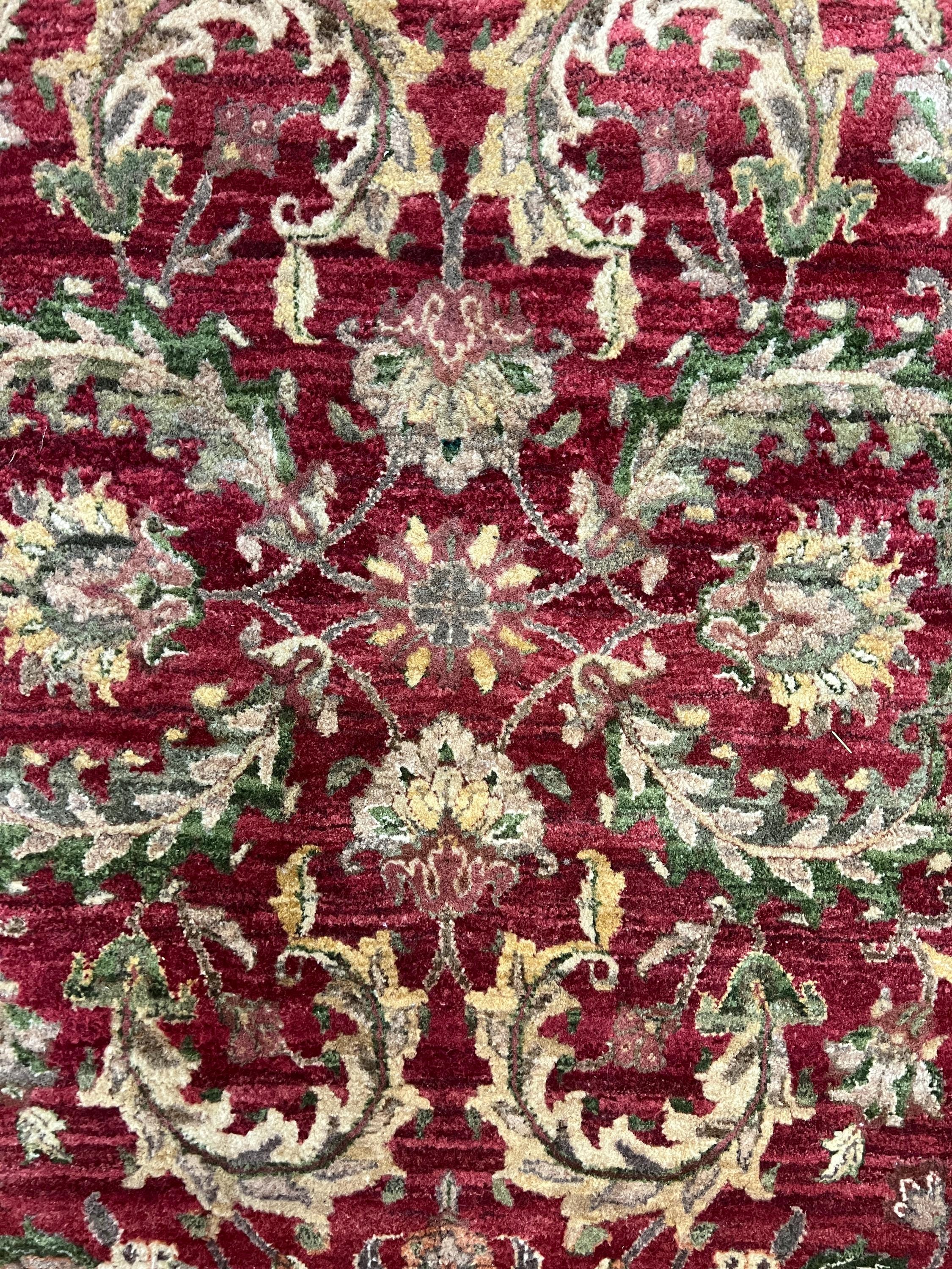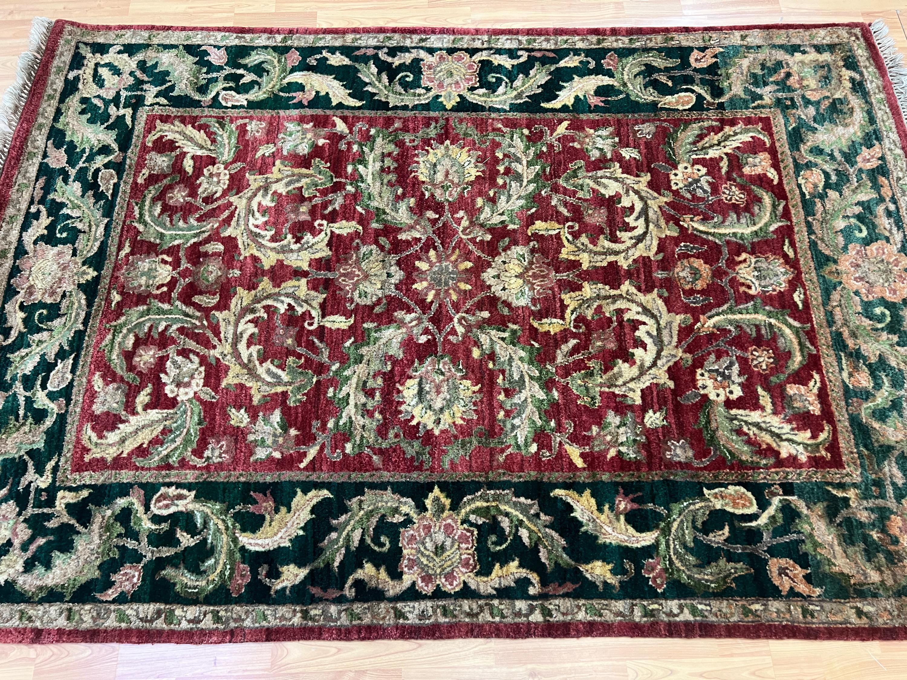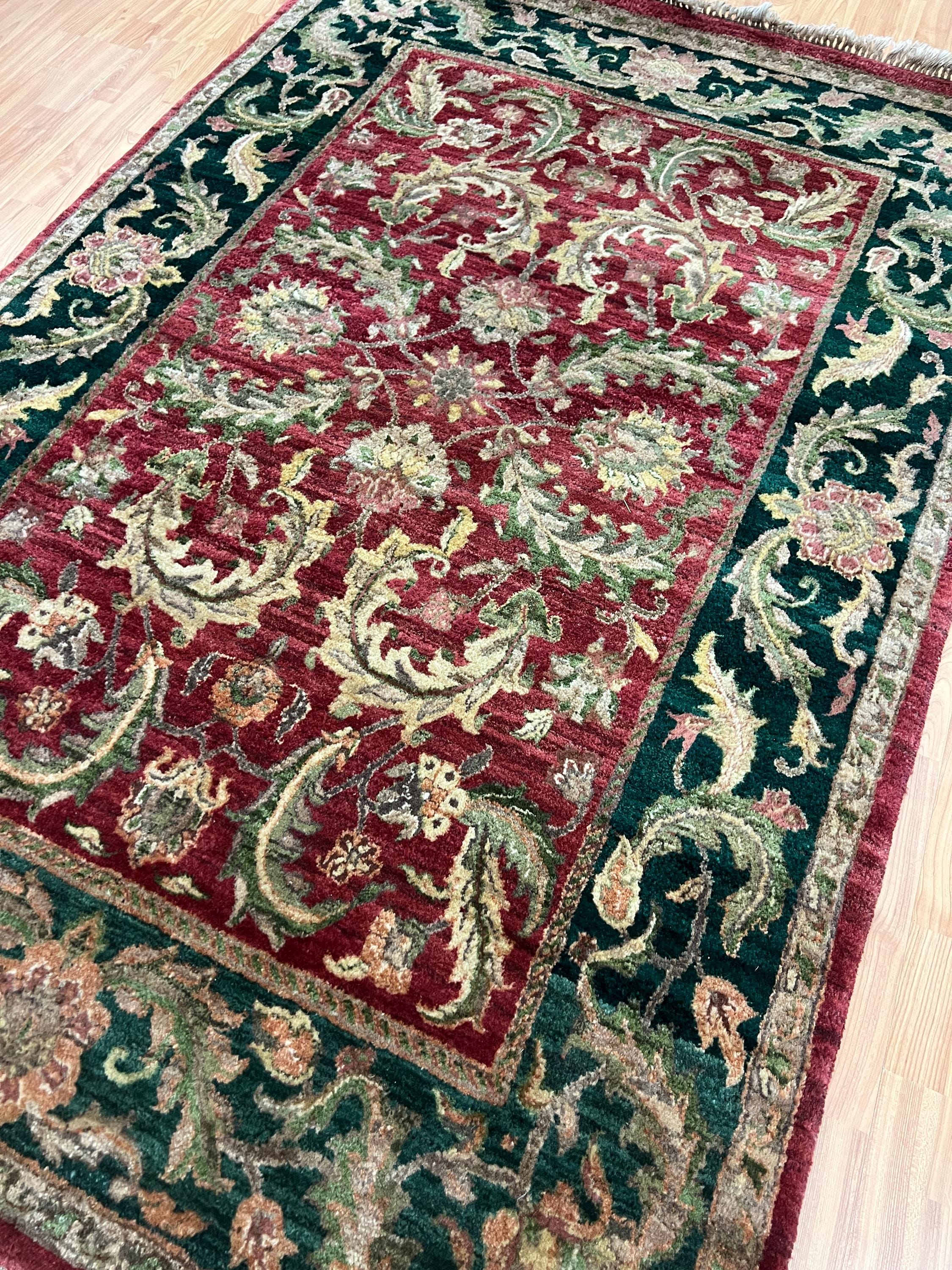 This marvelous Oriental rug is a brand new 5' x 7’ Indian Agra with a burgandy background and green borders. This hand knotted Indian Agra rug is made with 100% wool.