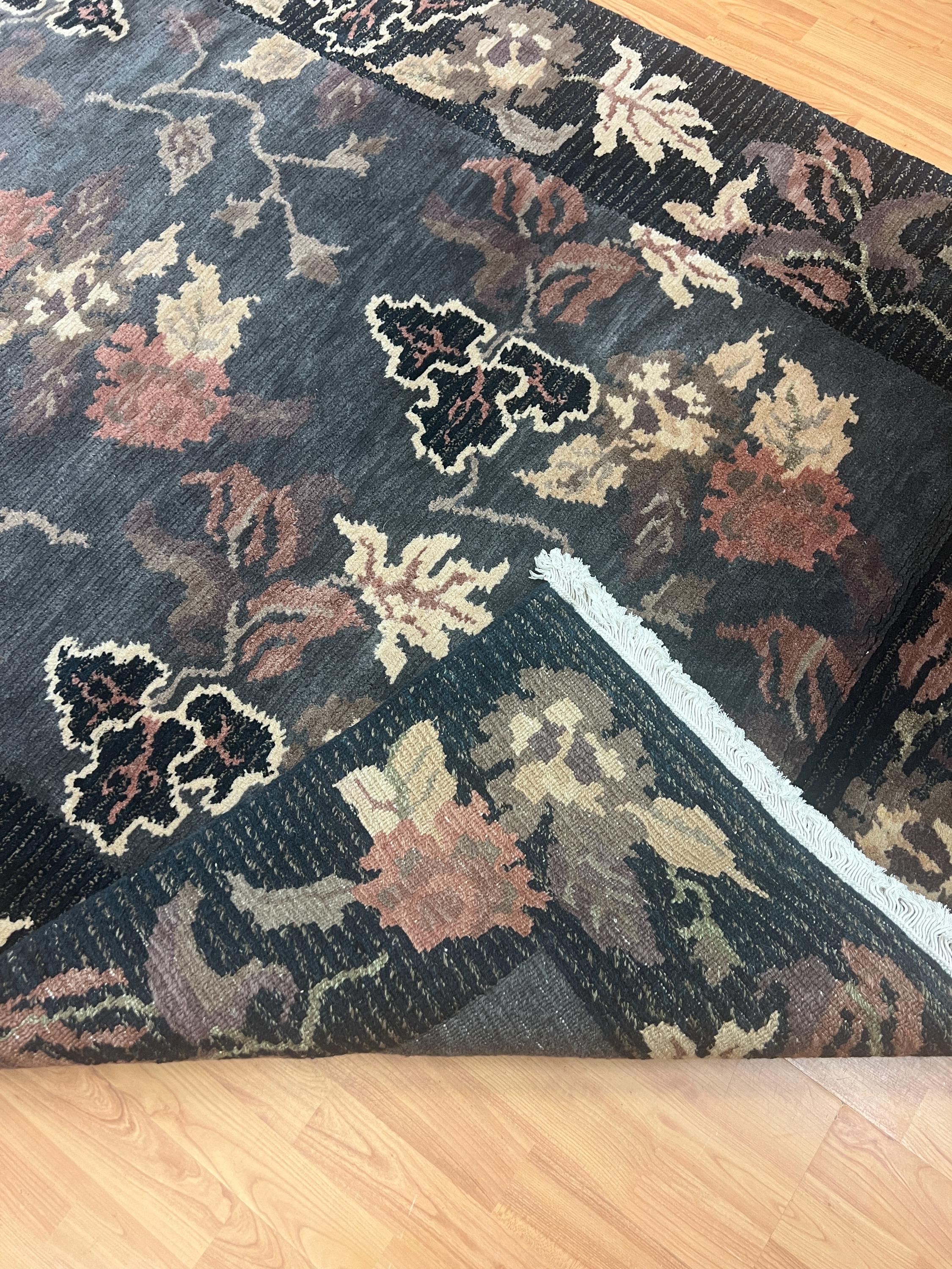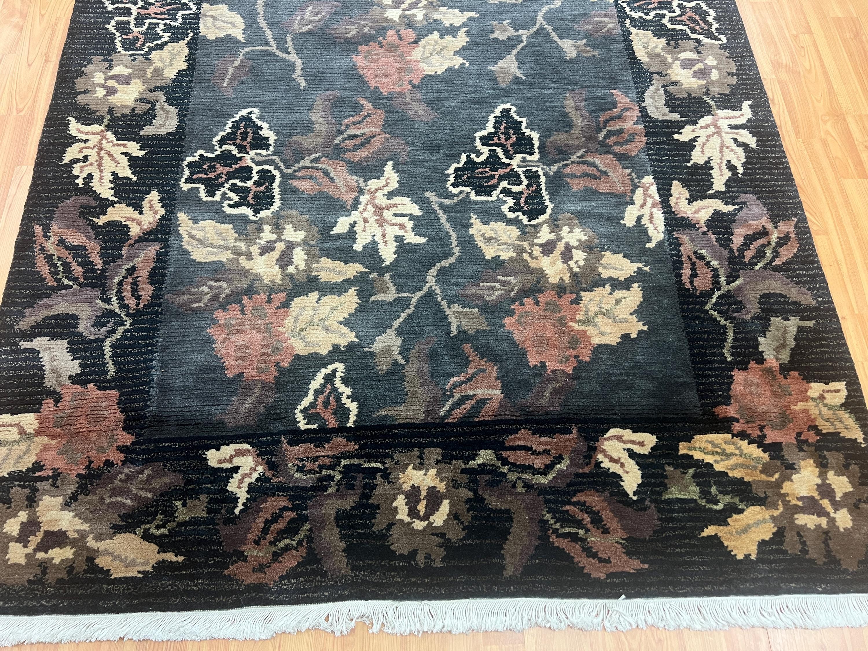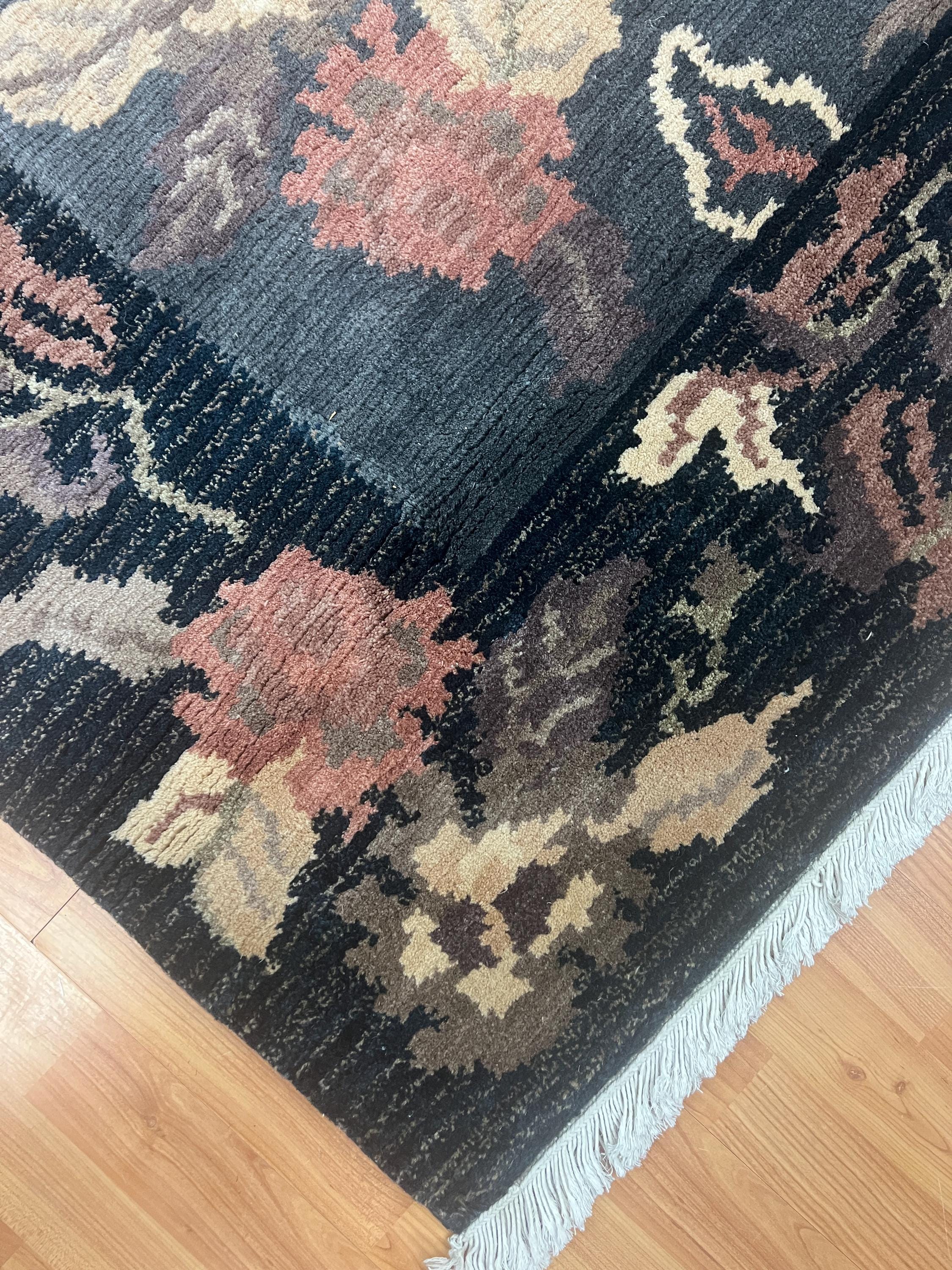 This beautiful modern Oriental rug is a brand new black 5’ x 8’ Indian Nepal. This hand made Indian Nepal rug is made with a 100% wool pile.