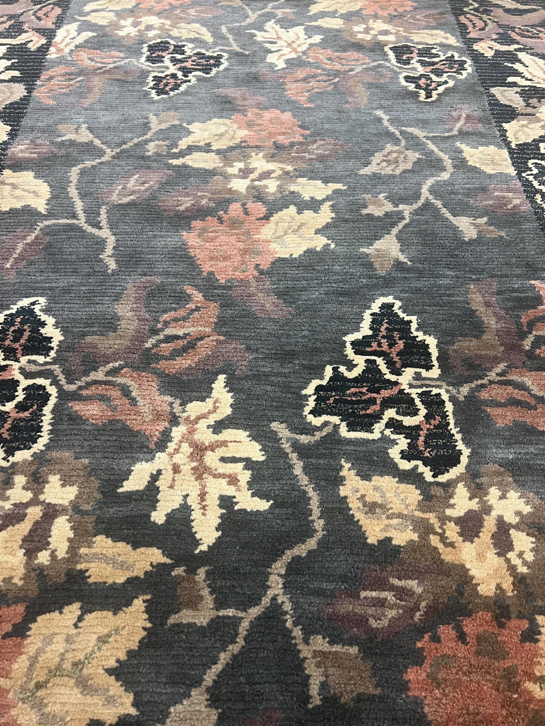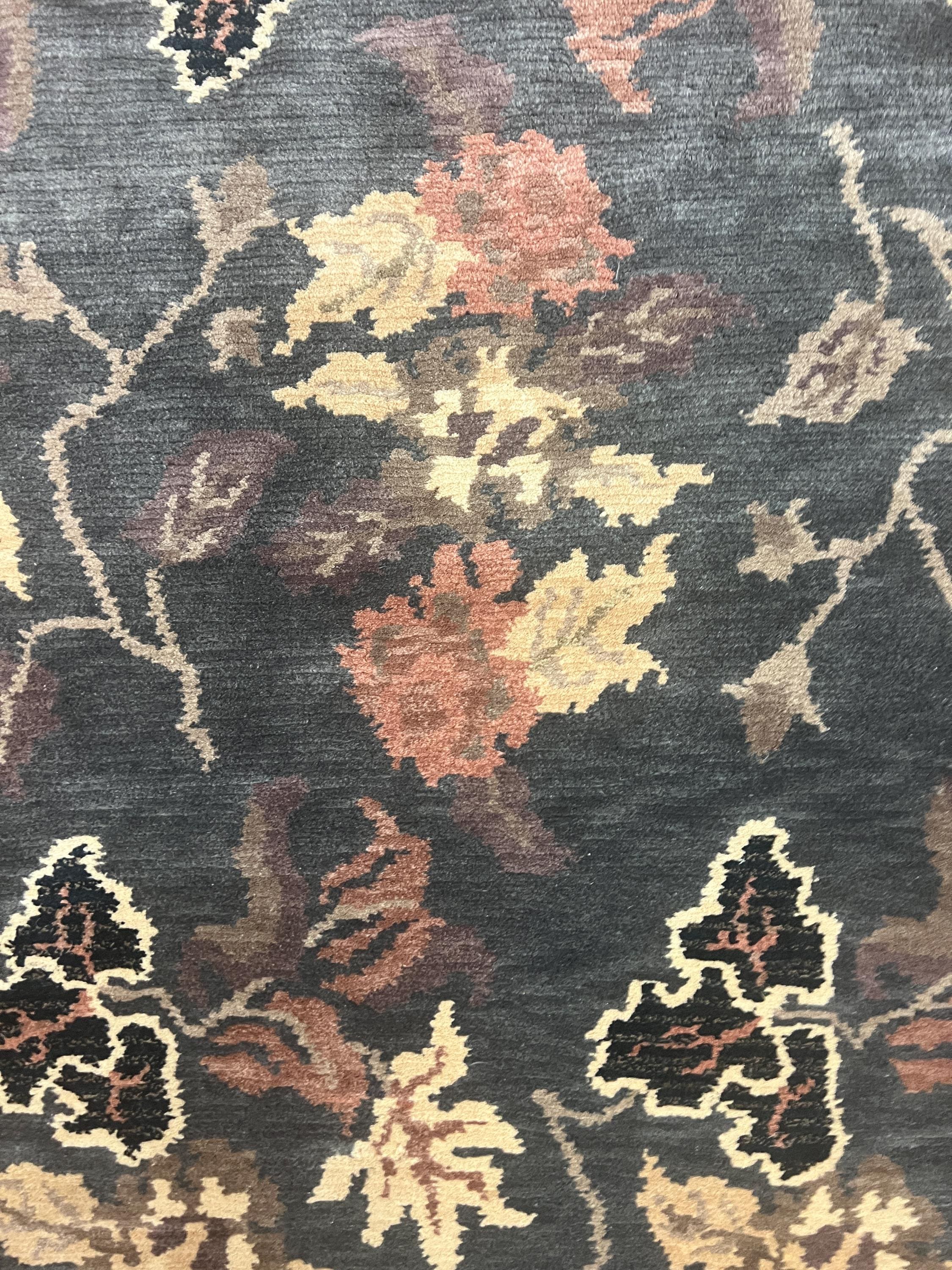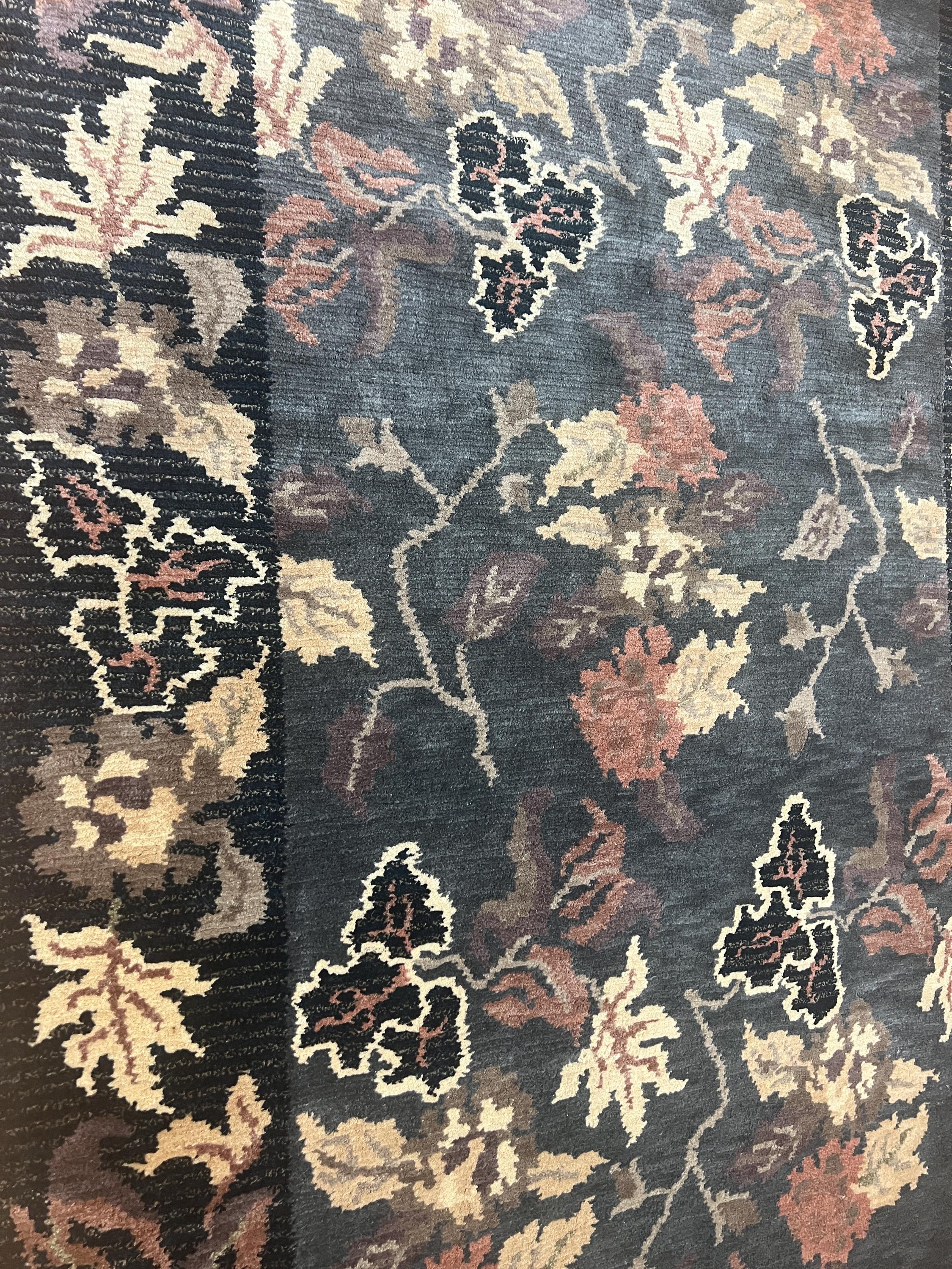 This beautiful modern Oriental rug is a brand new black 5’ x 8’ Indian Nepal. This hand made Indian Nepal rug is made with a 100% wool pile.