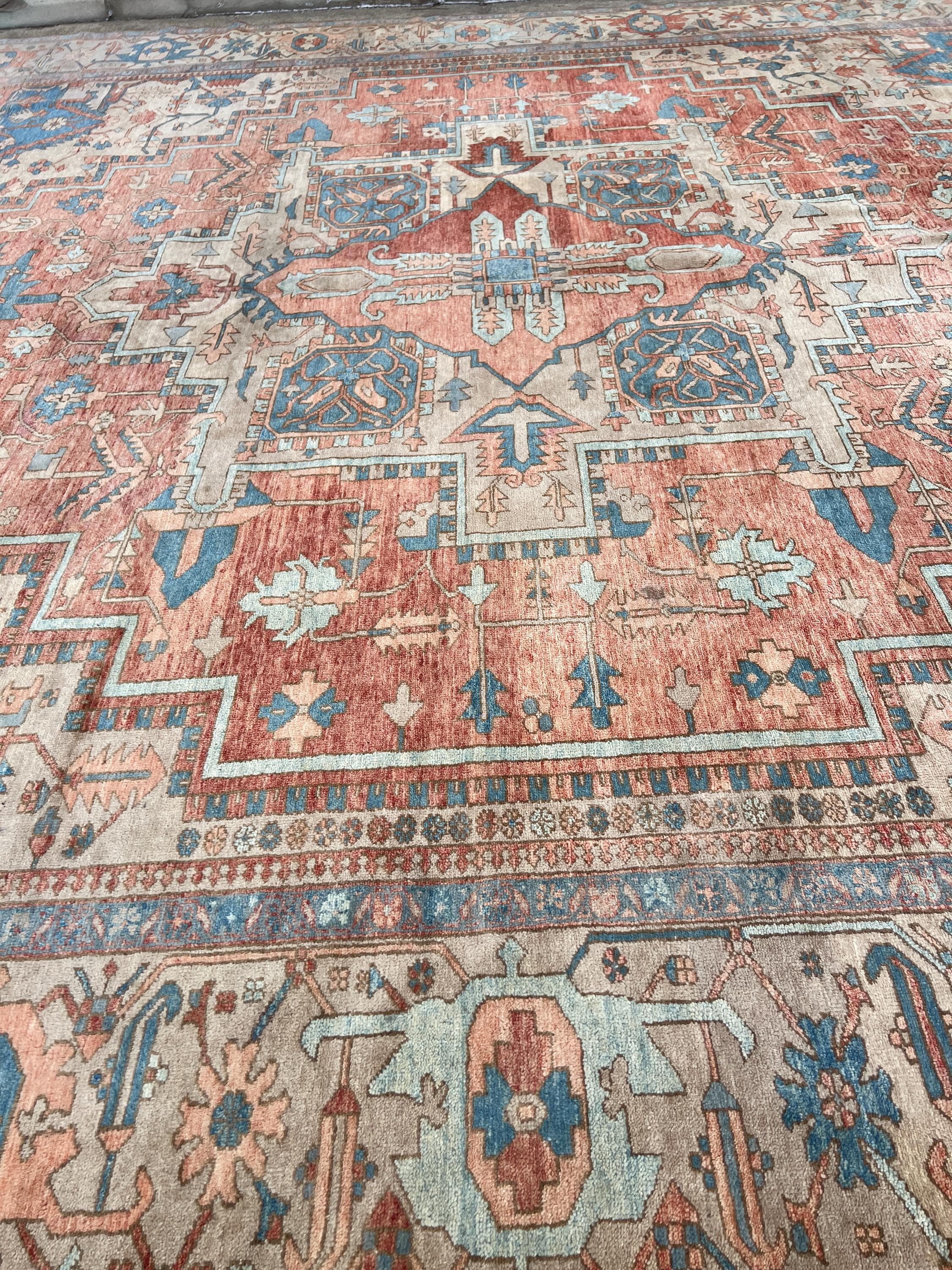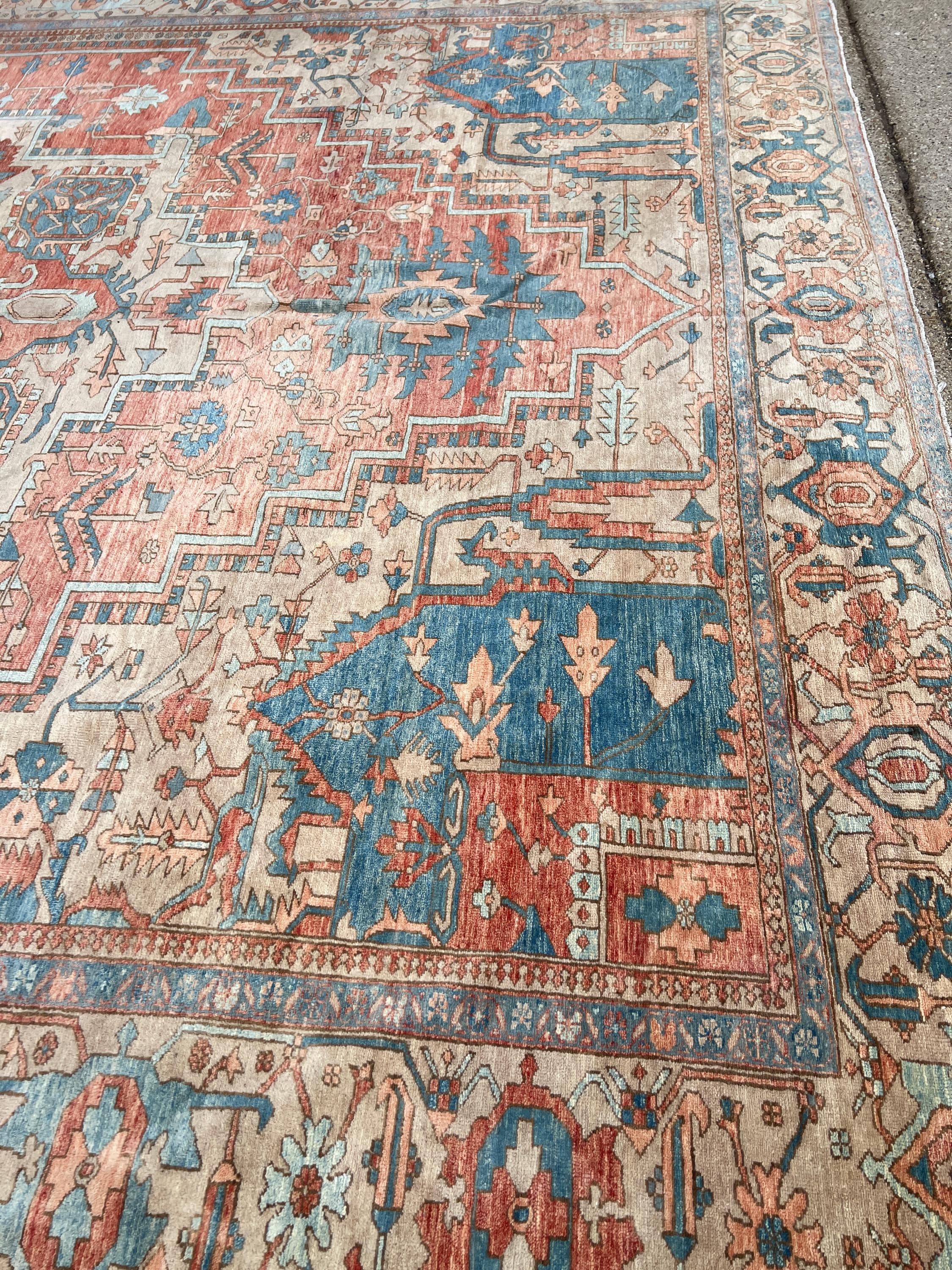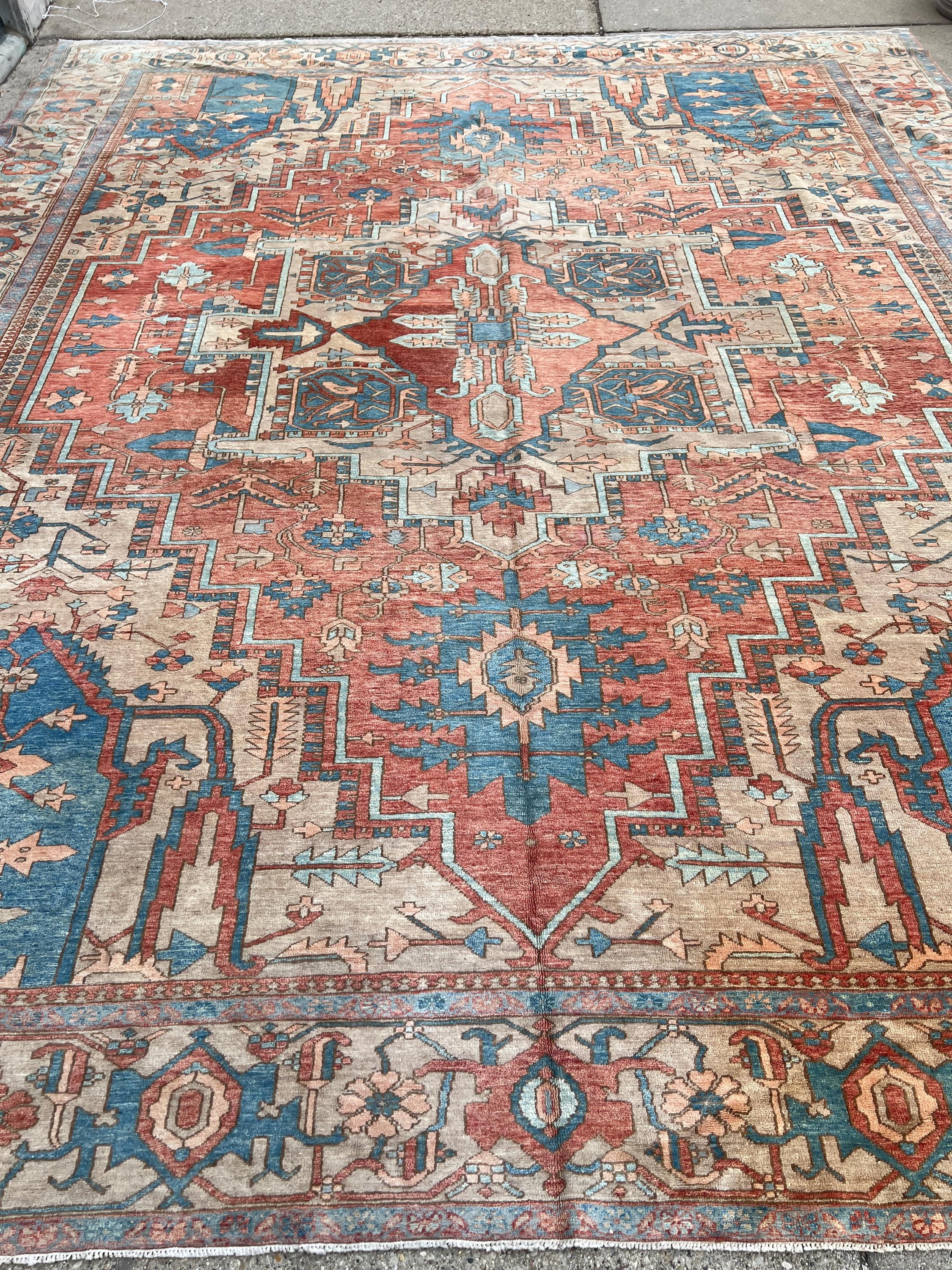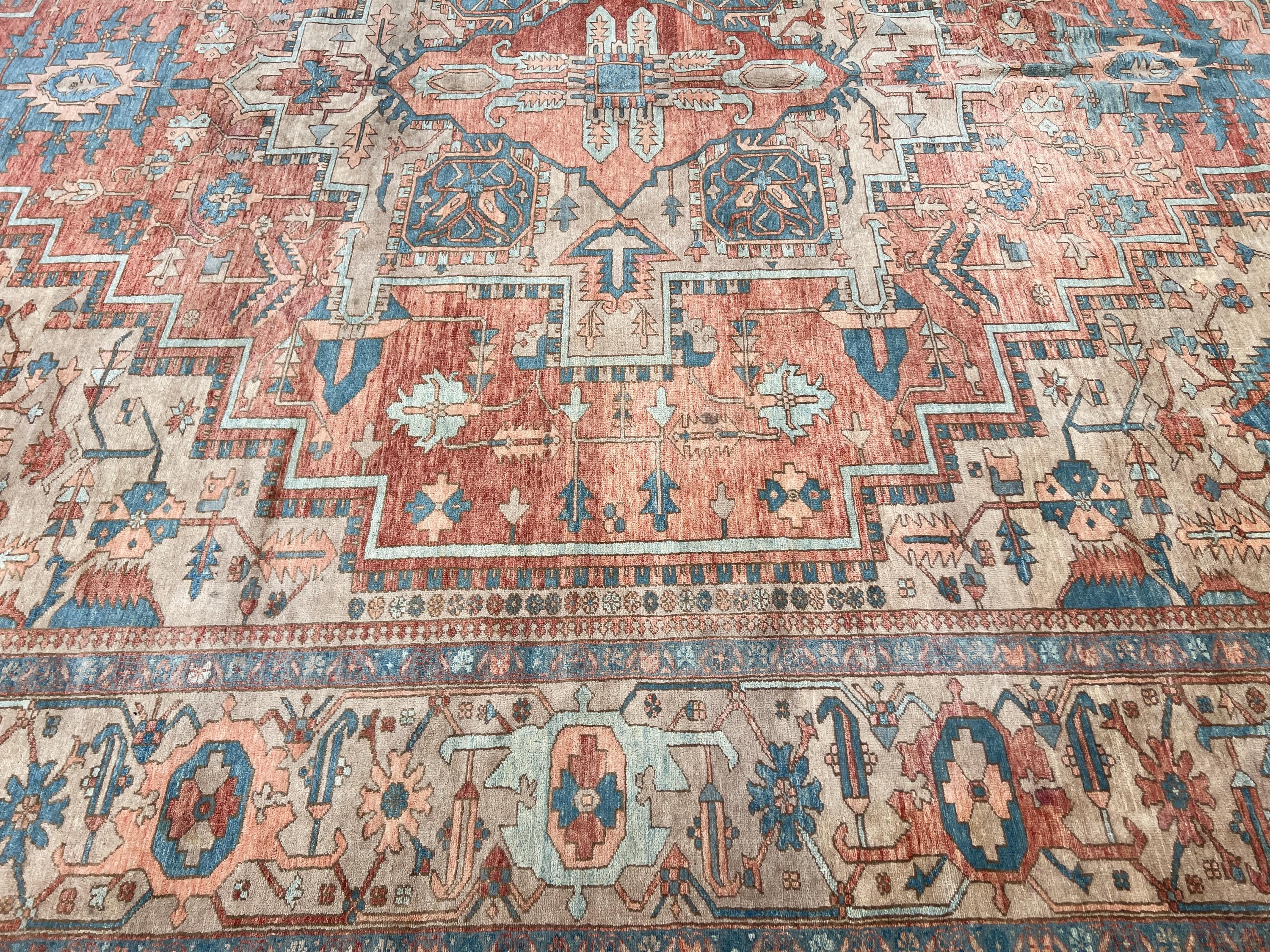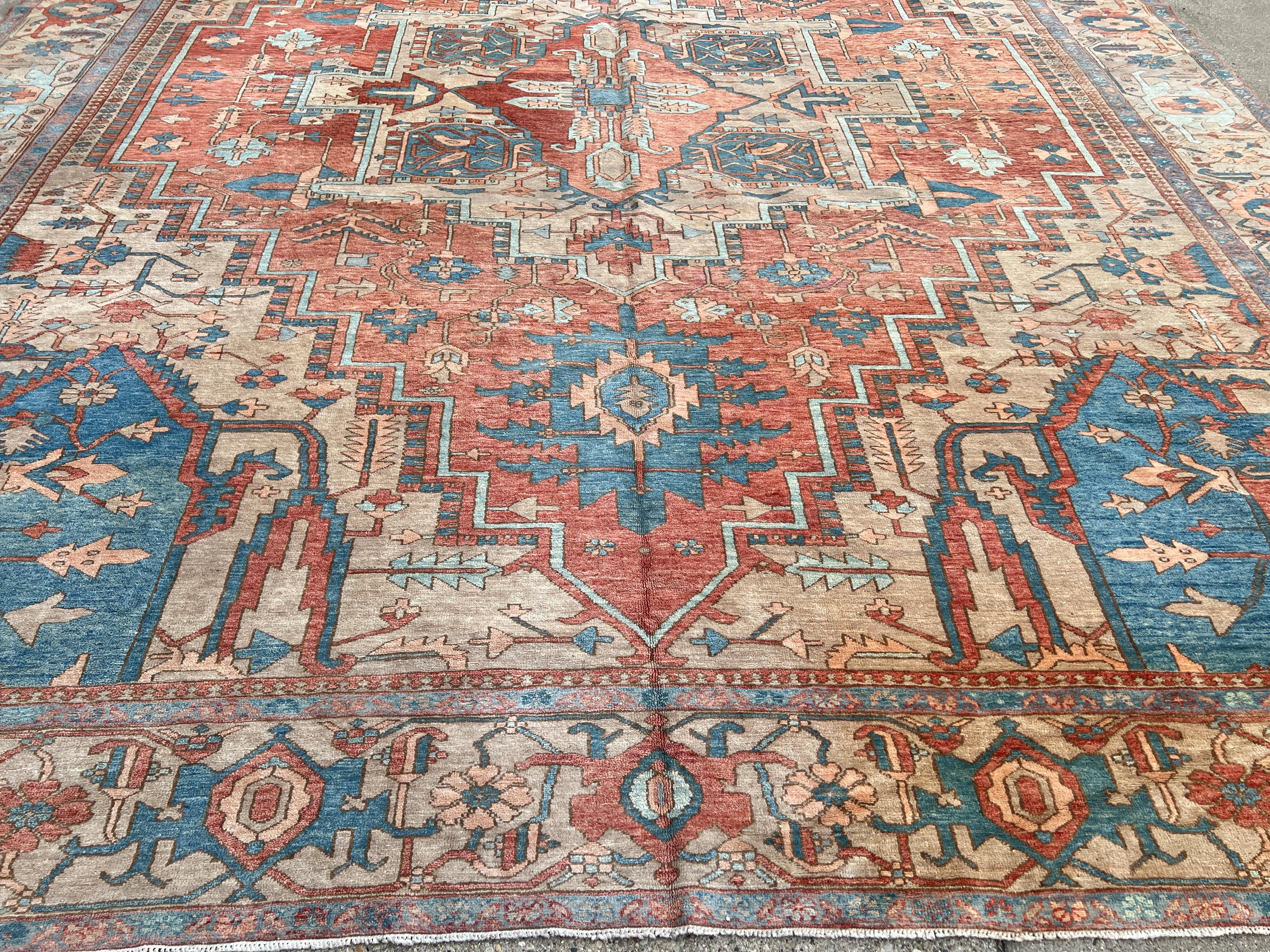 This gorgeous Oriental rug is a 12'7" x 15' Azerbaijani, circa 1970s. This hand knotted rug is made with 100% wool using vegetable dye and is in good condition.