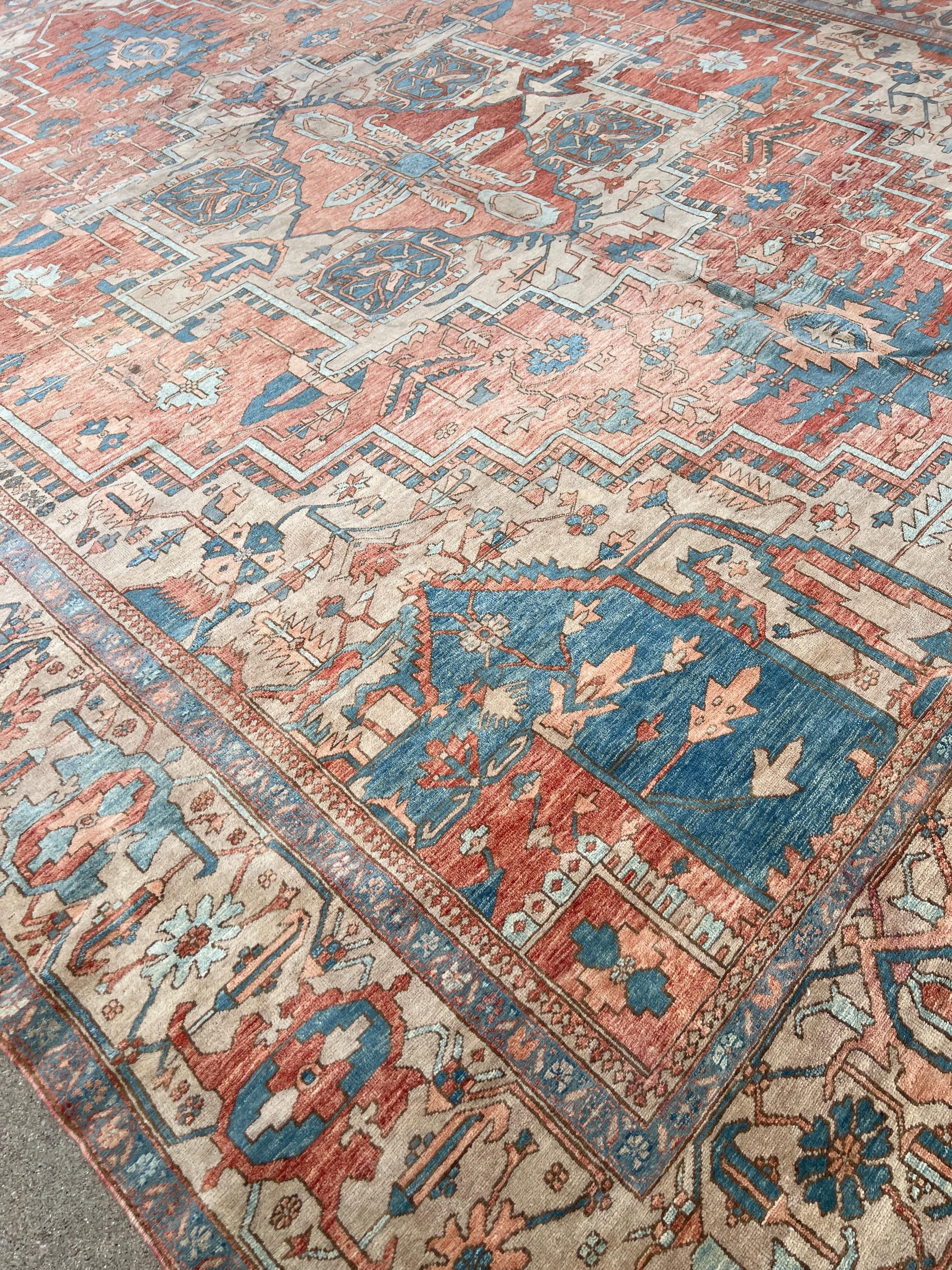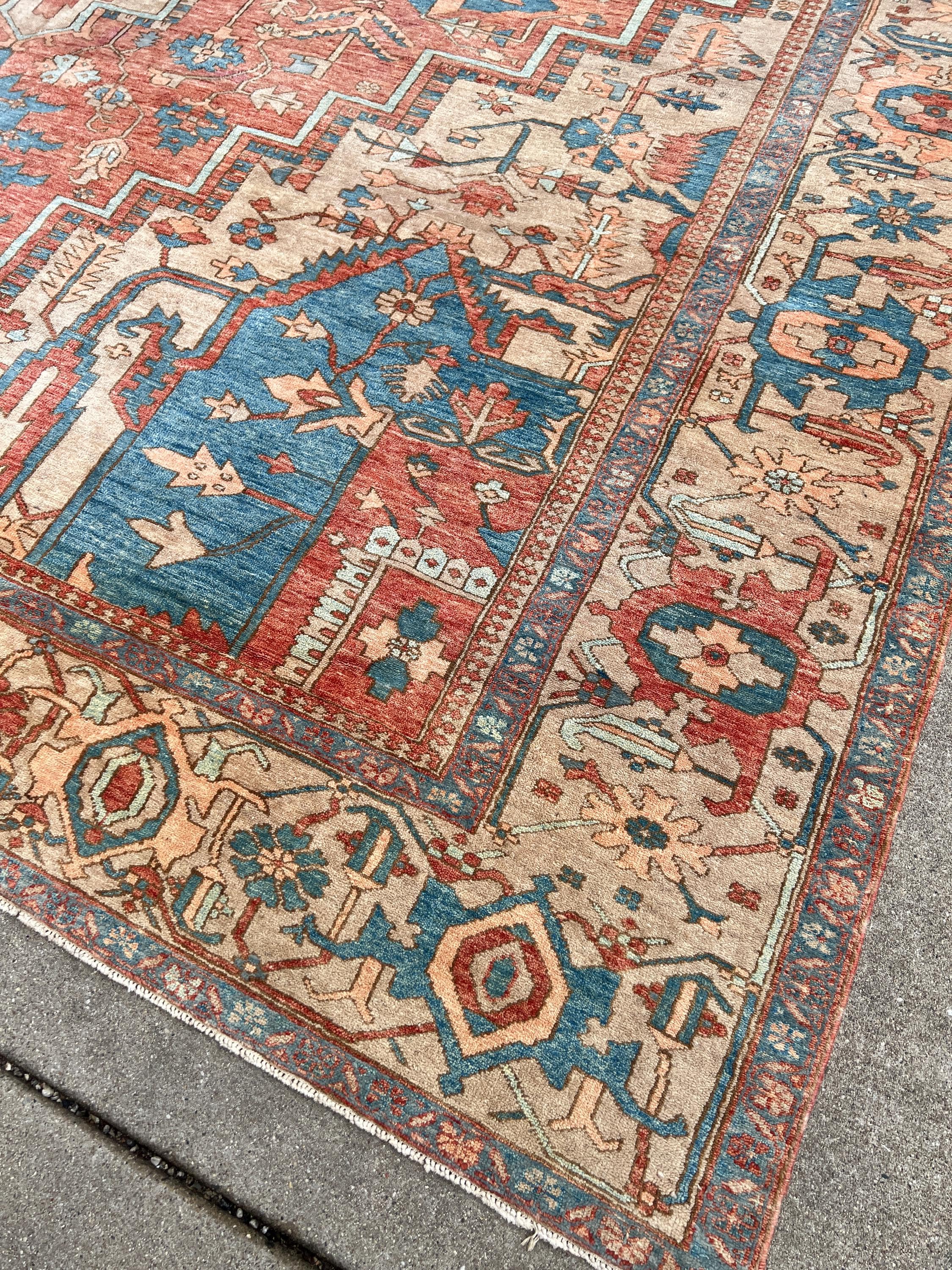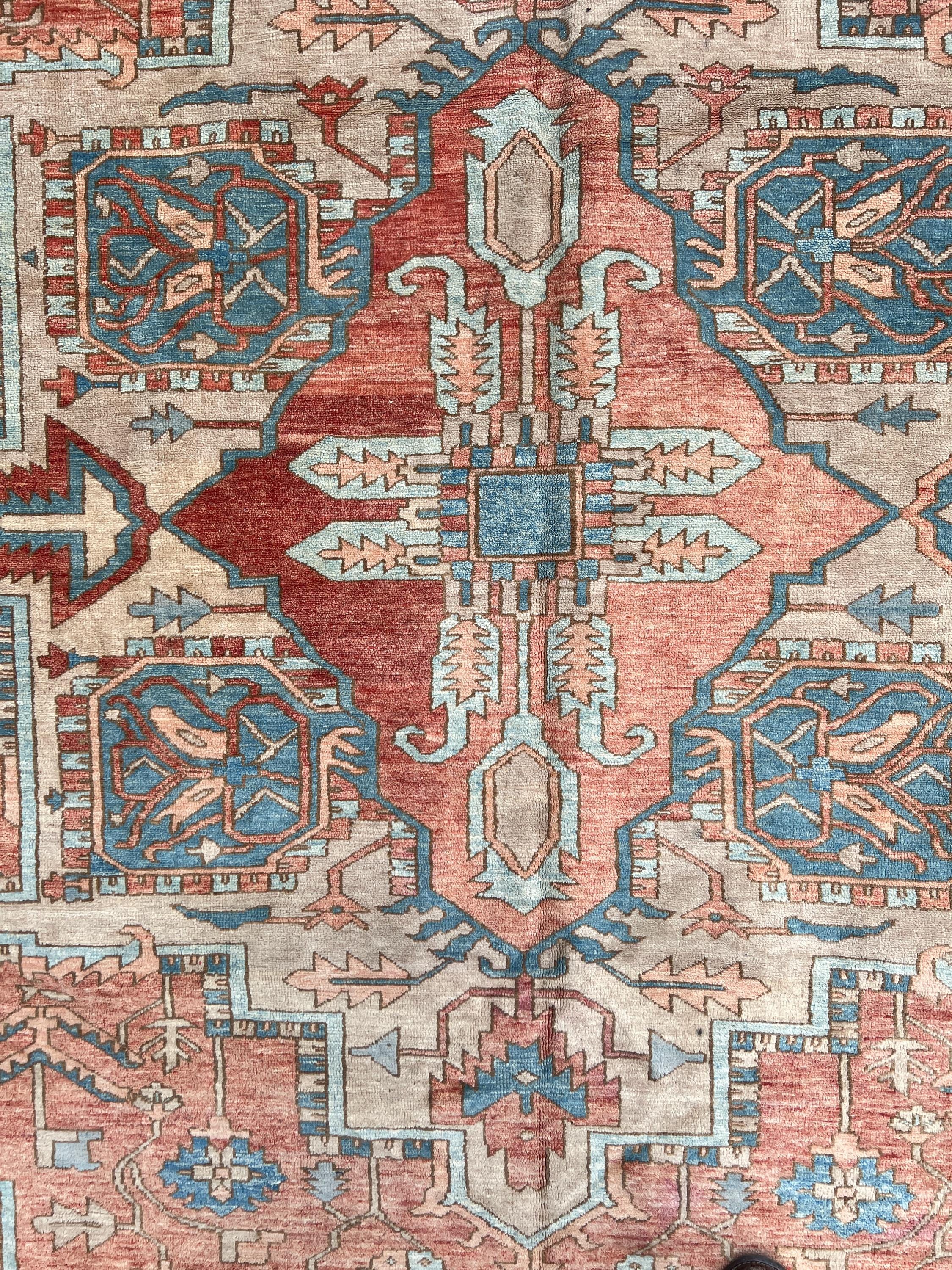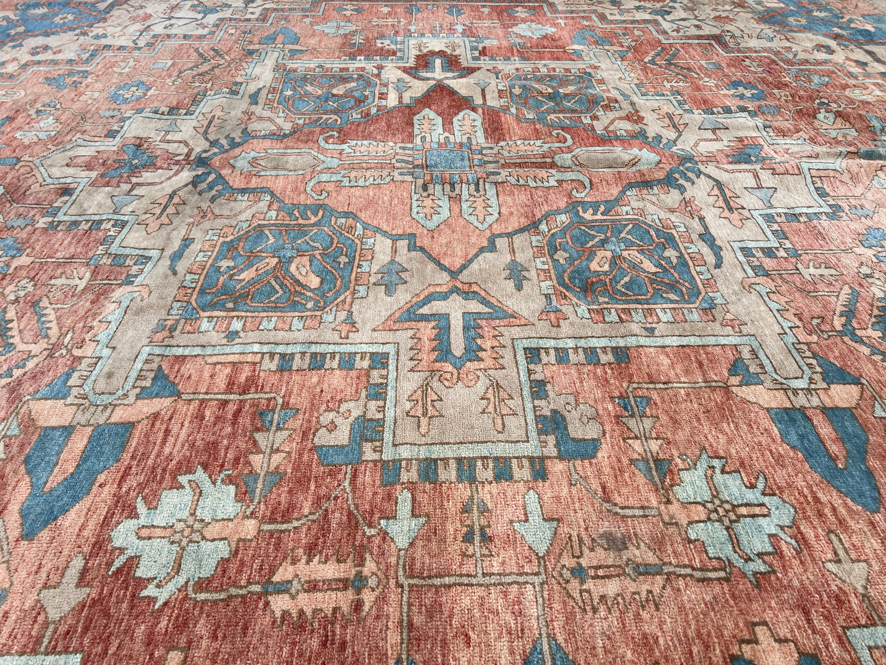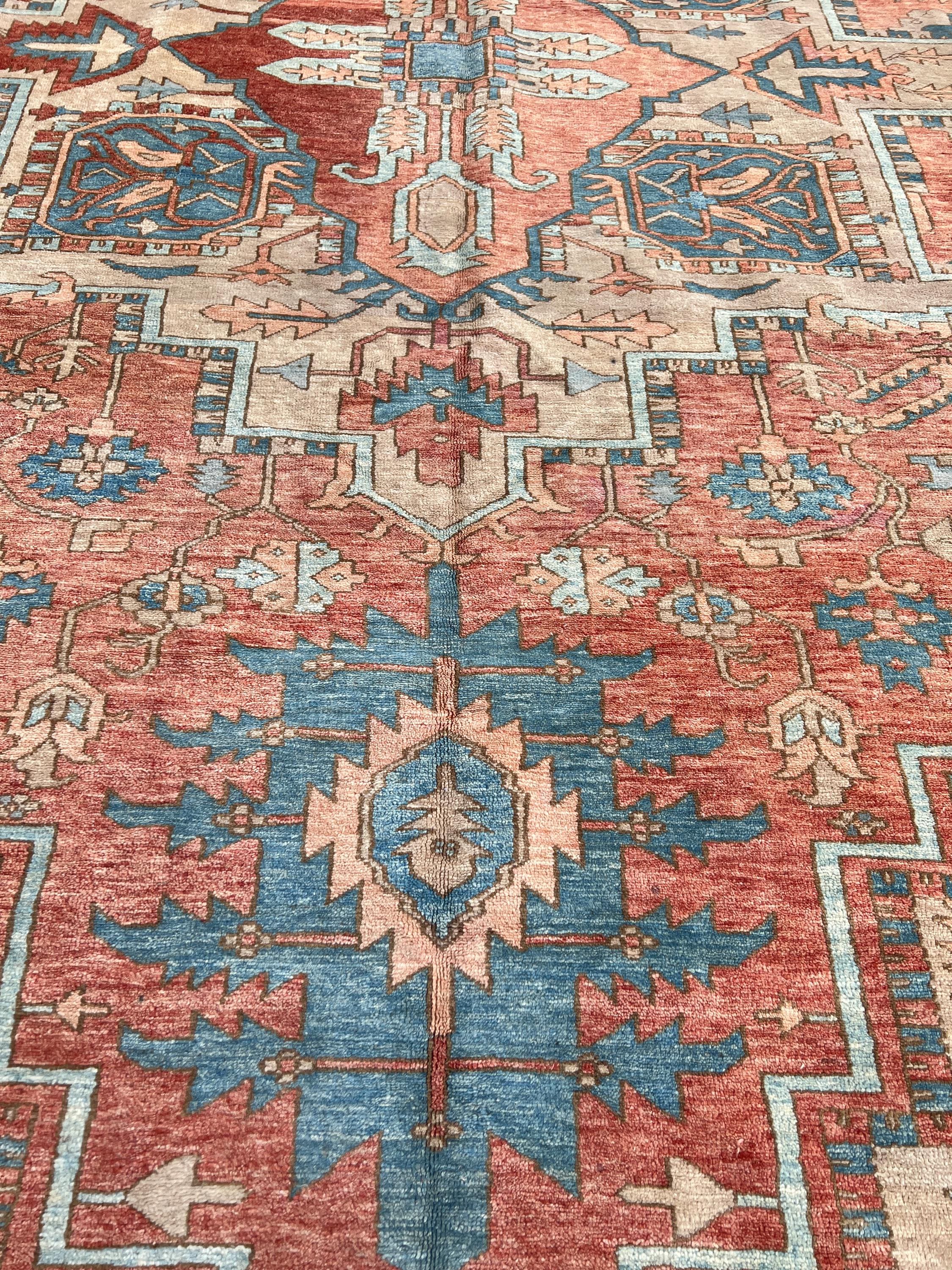 This gorgeous Oriental rug is a 12'7" x 15' Azerbaijani, circa 1970s. This hand knotted rug is made with 100% wool using vegetable dye and is in good condition.