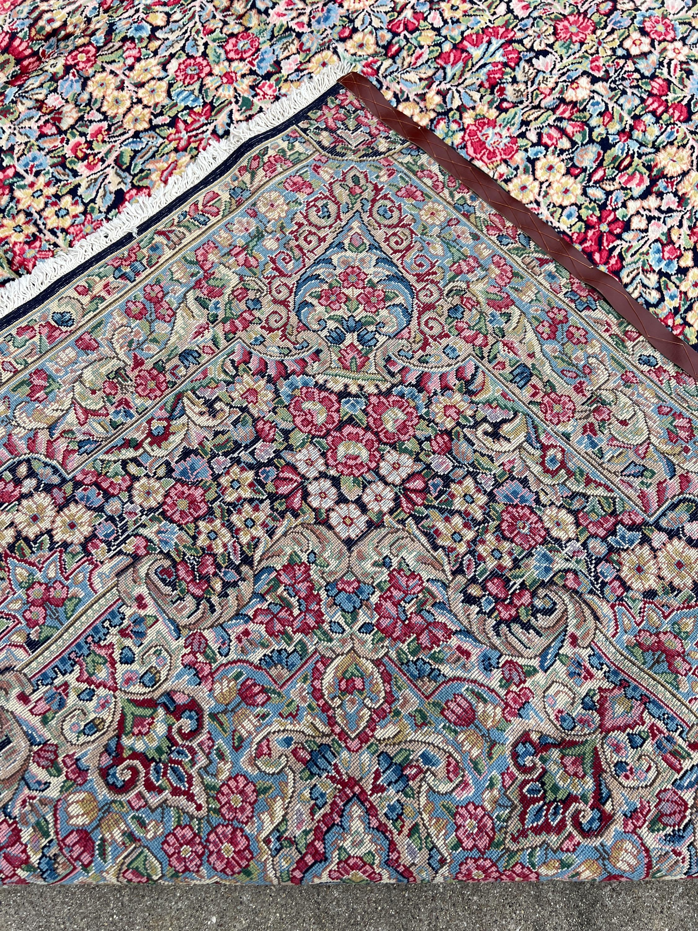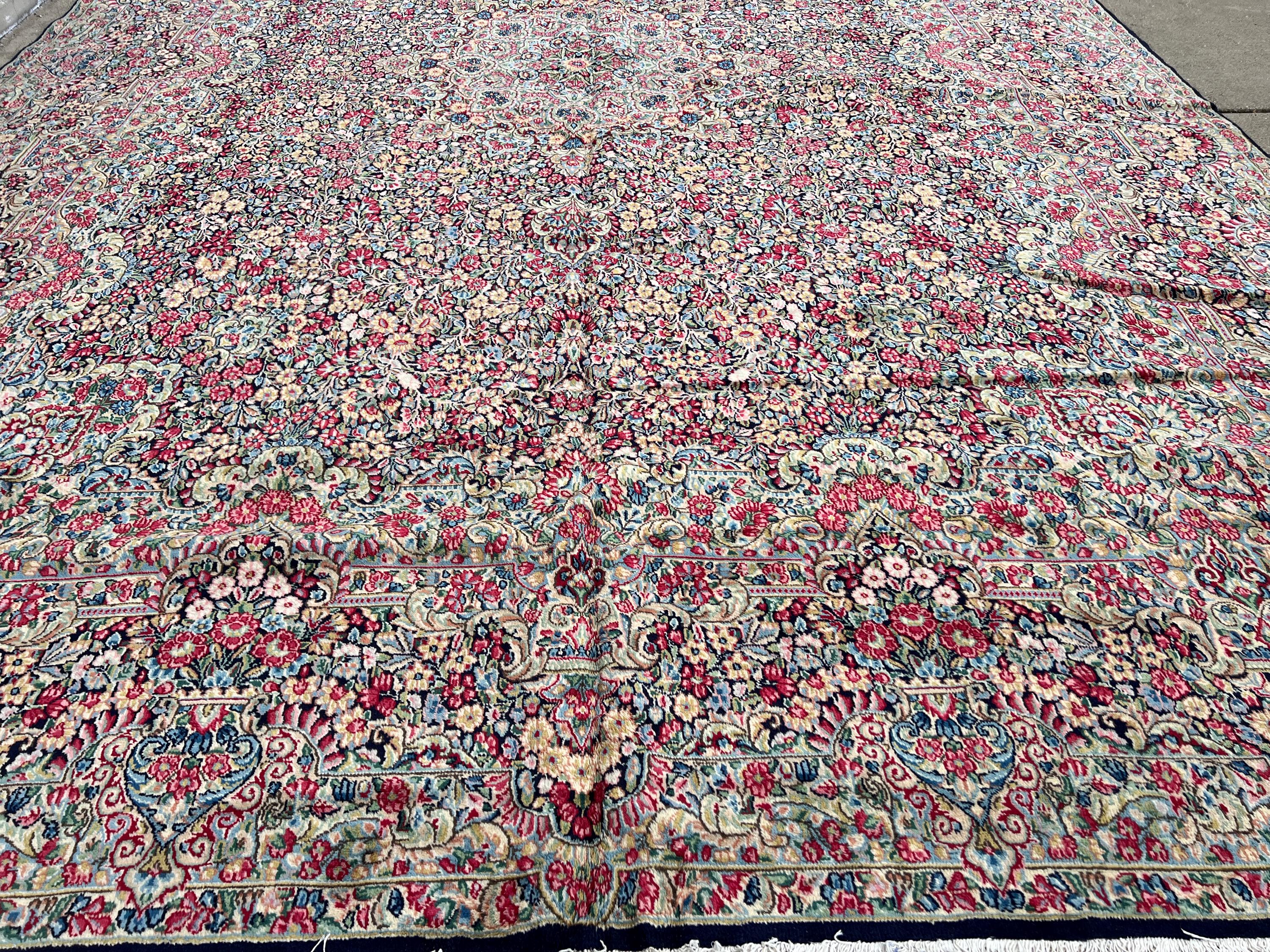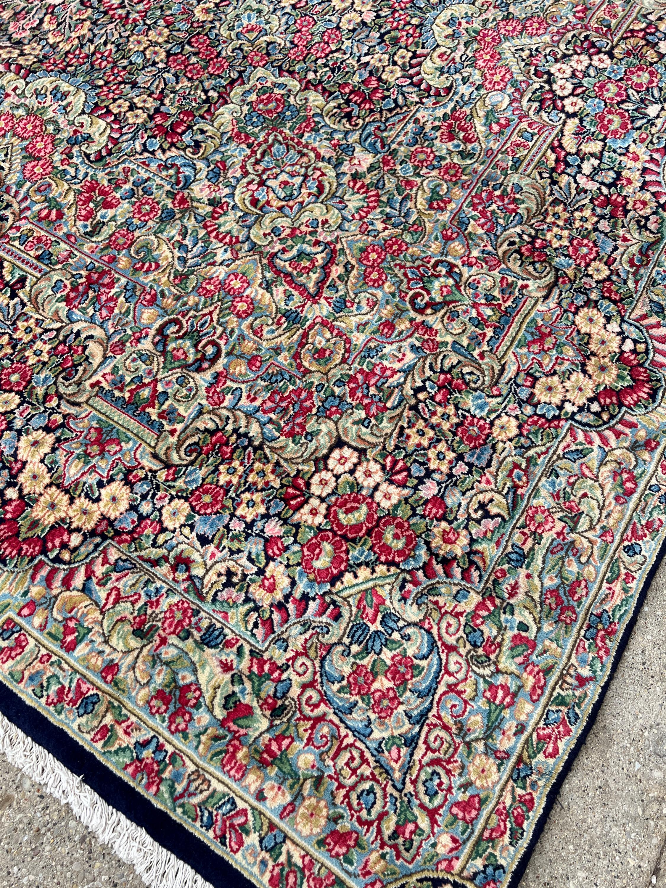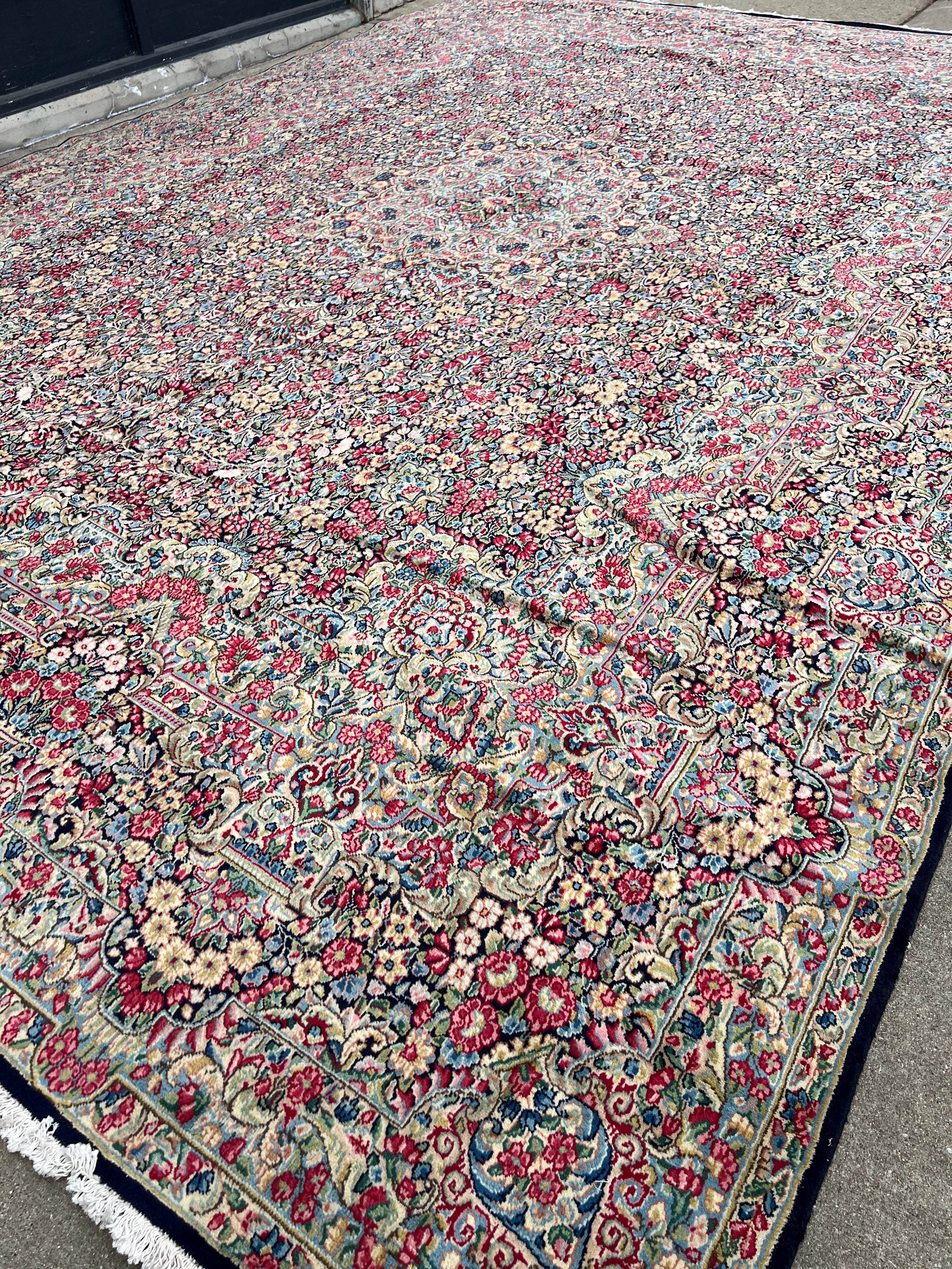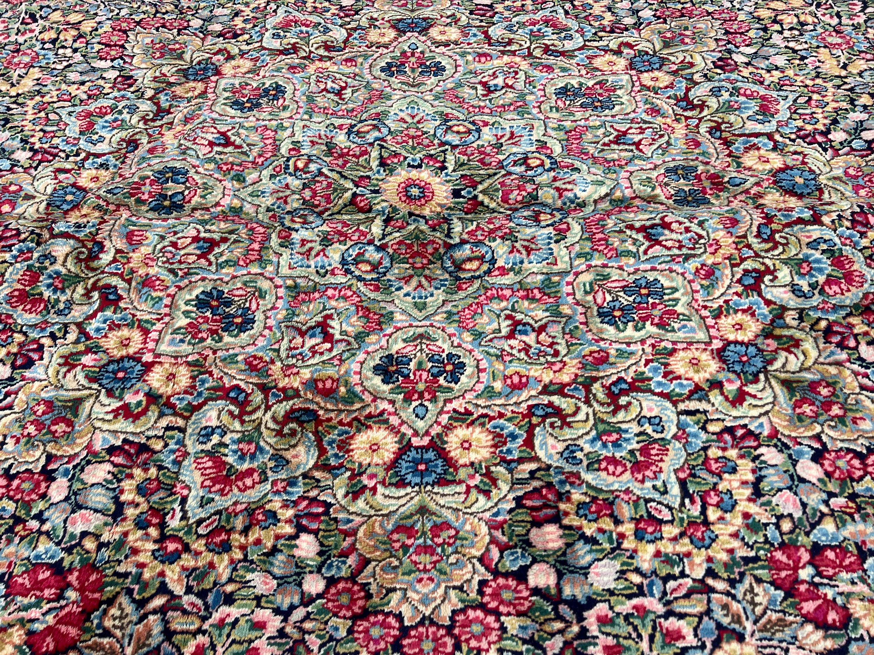 This absolutely stunning Oriental rug is a brand new 12’9" x 19'2" Indian with a dark blue background. This very fine handmade rug is made with 100% wool.