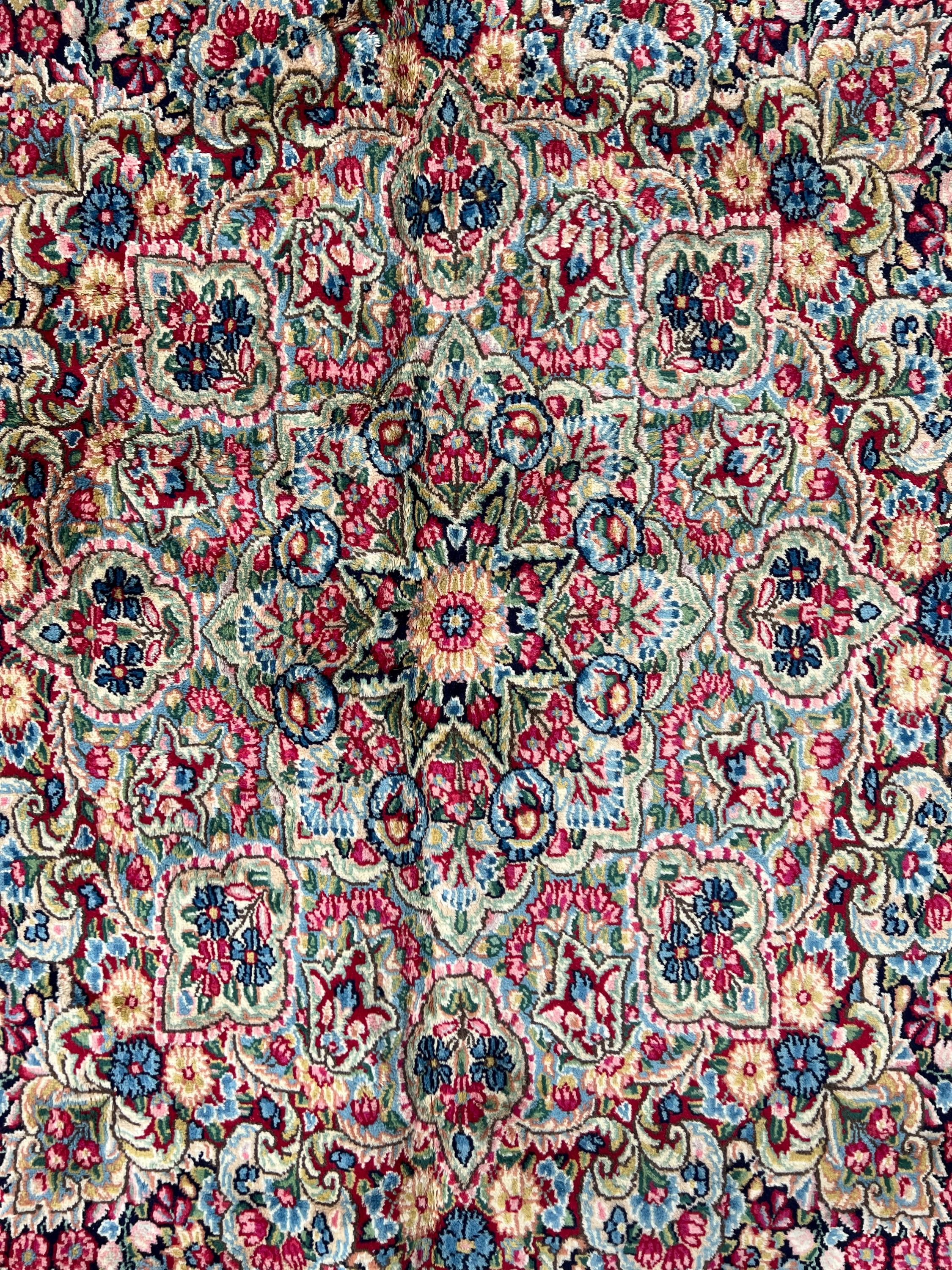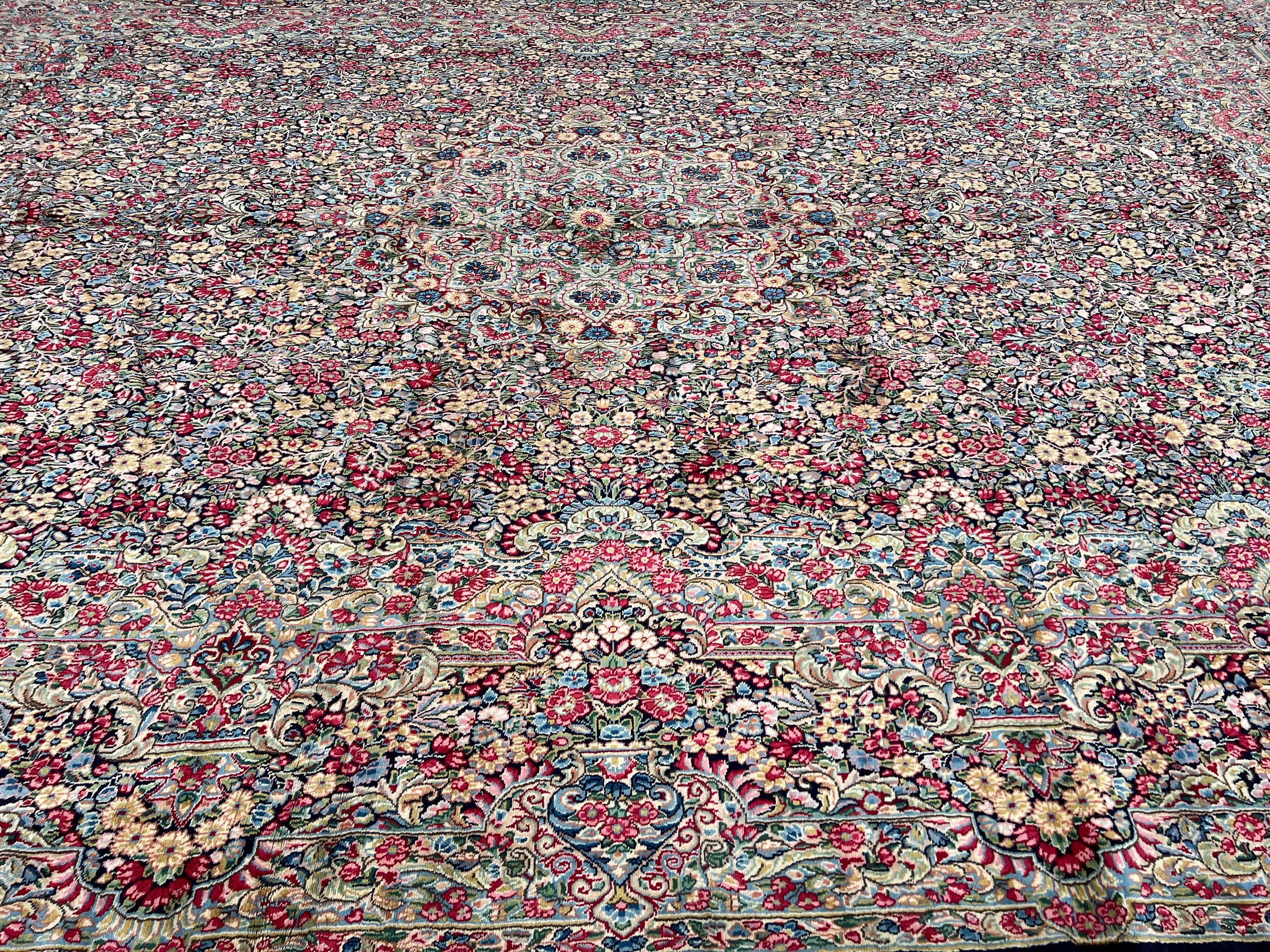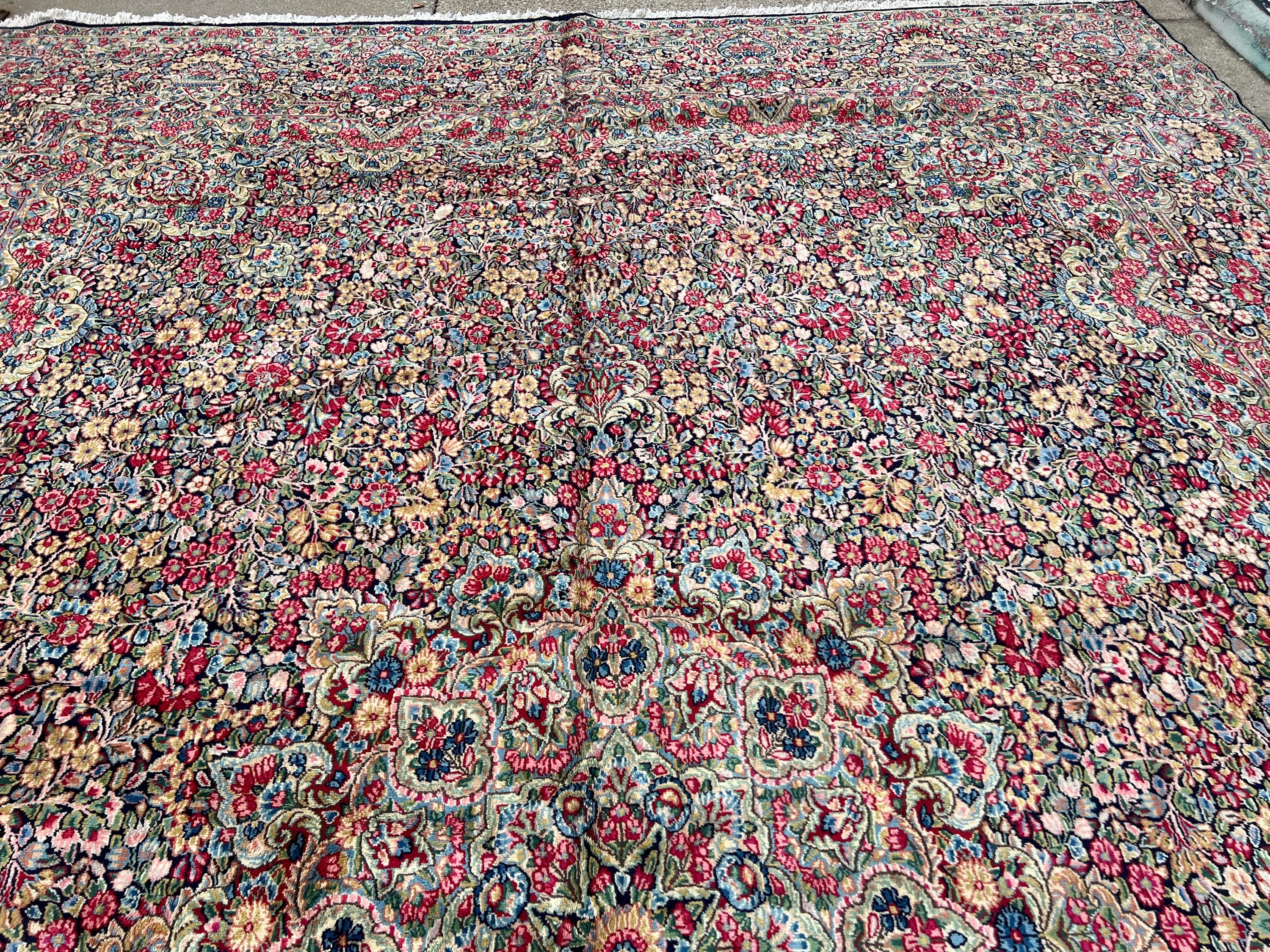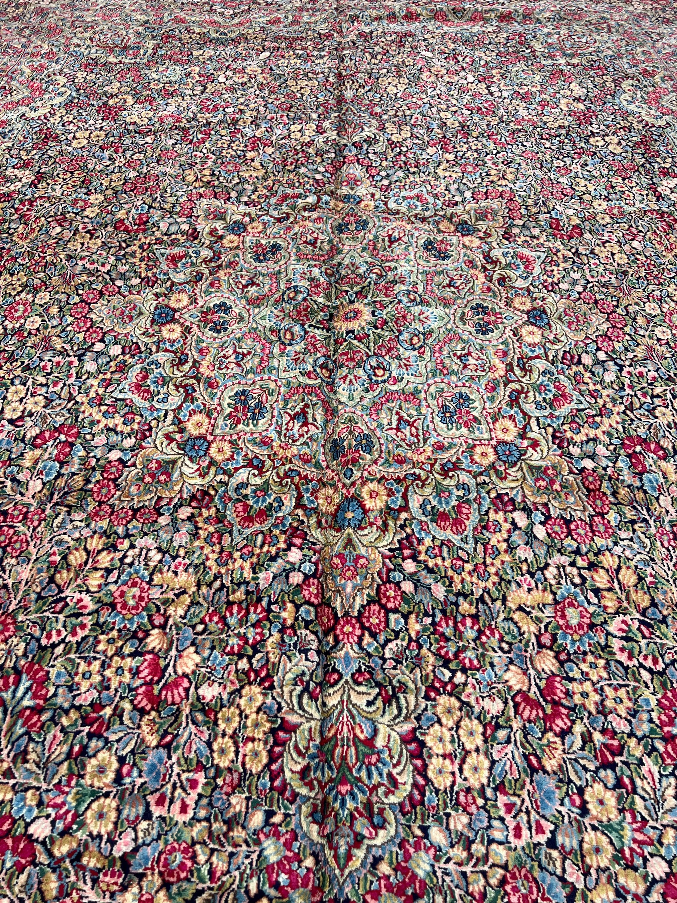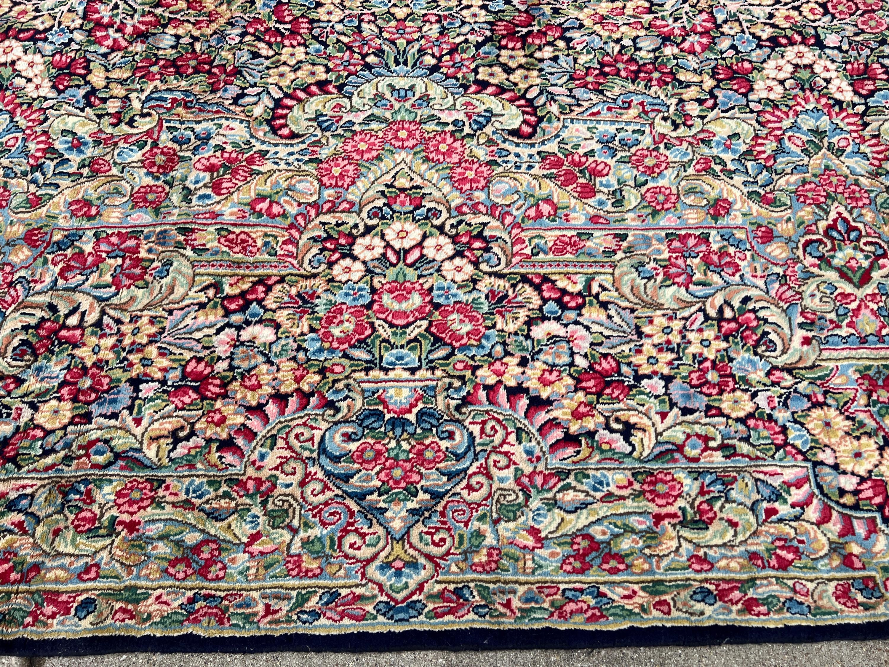 This absolutely stunning Oriental rug is a brand new 12’9" x 19'2" Indian with a dark blue background. This very fine handmade rug is made with 100% wool.
