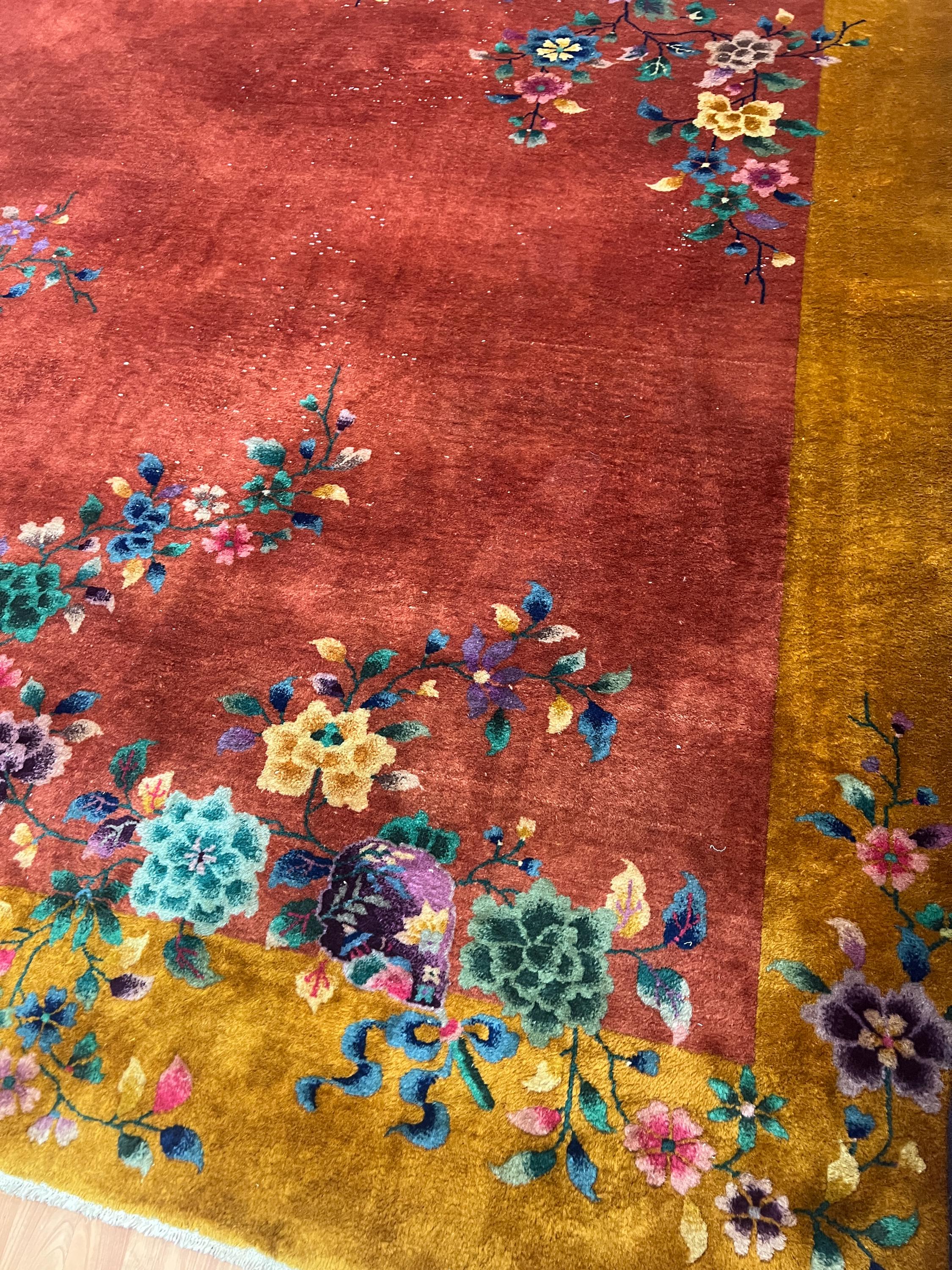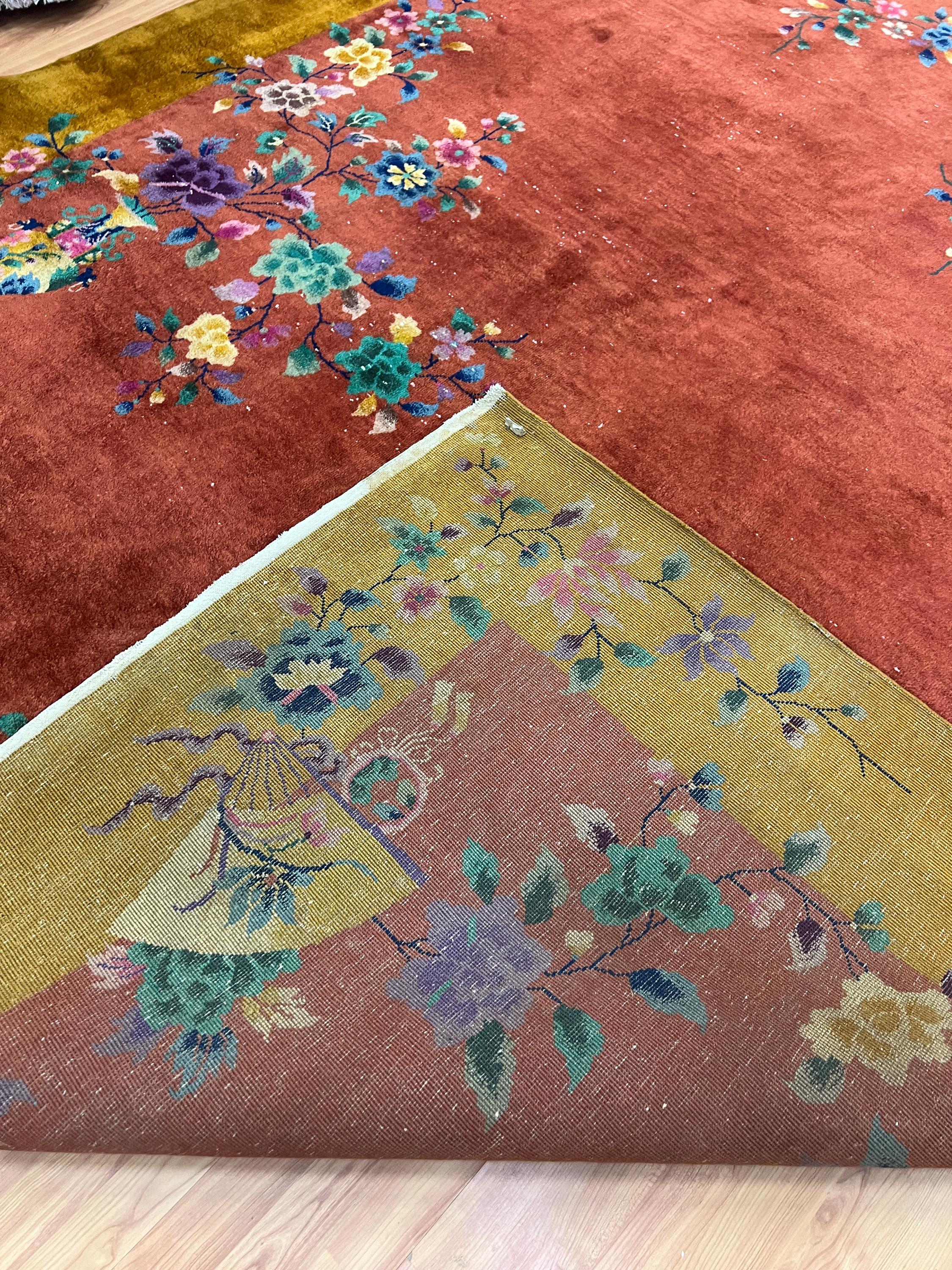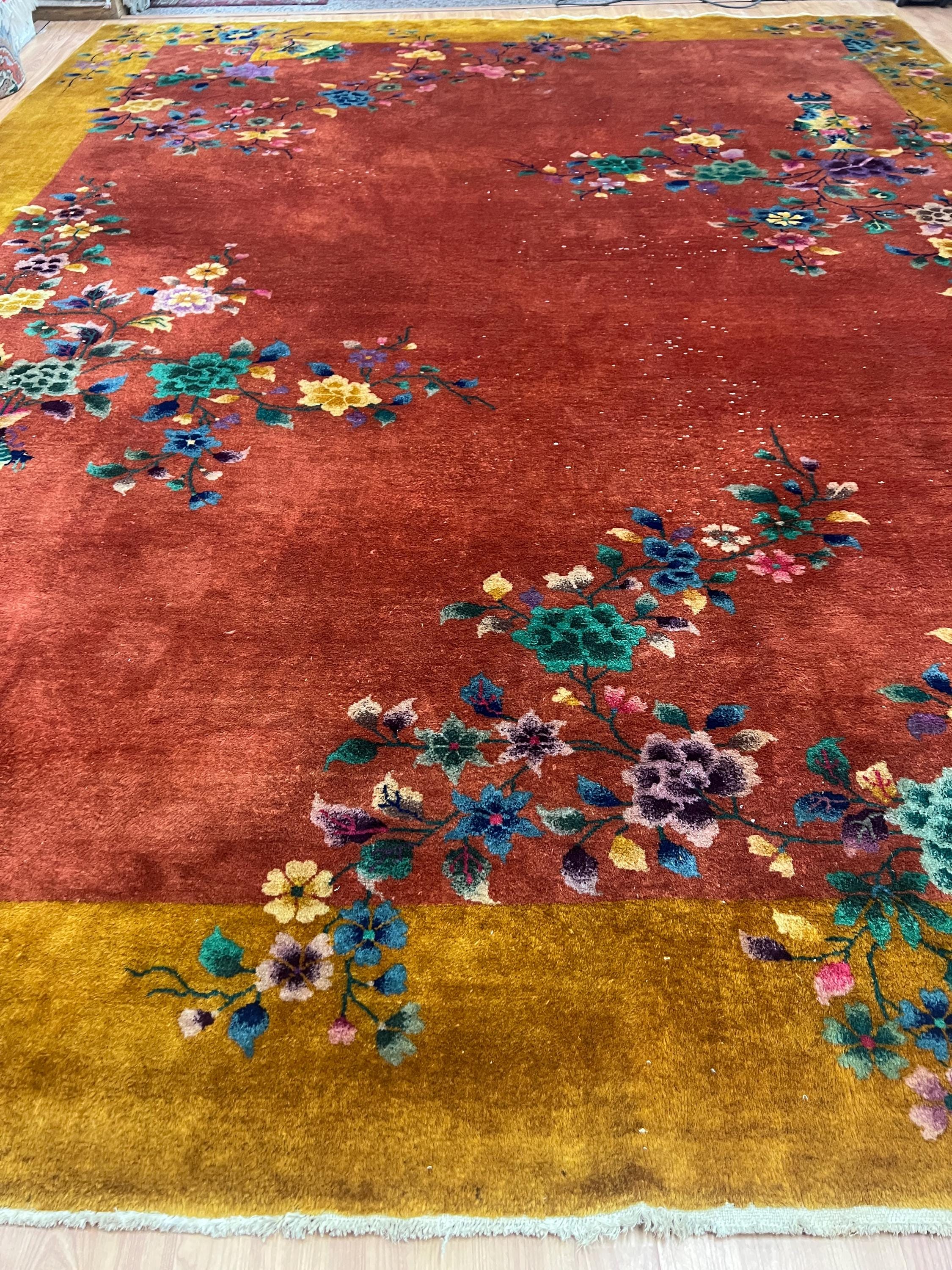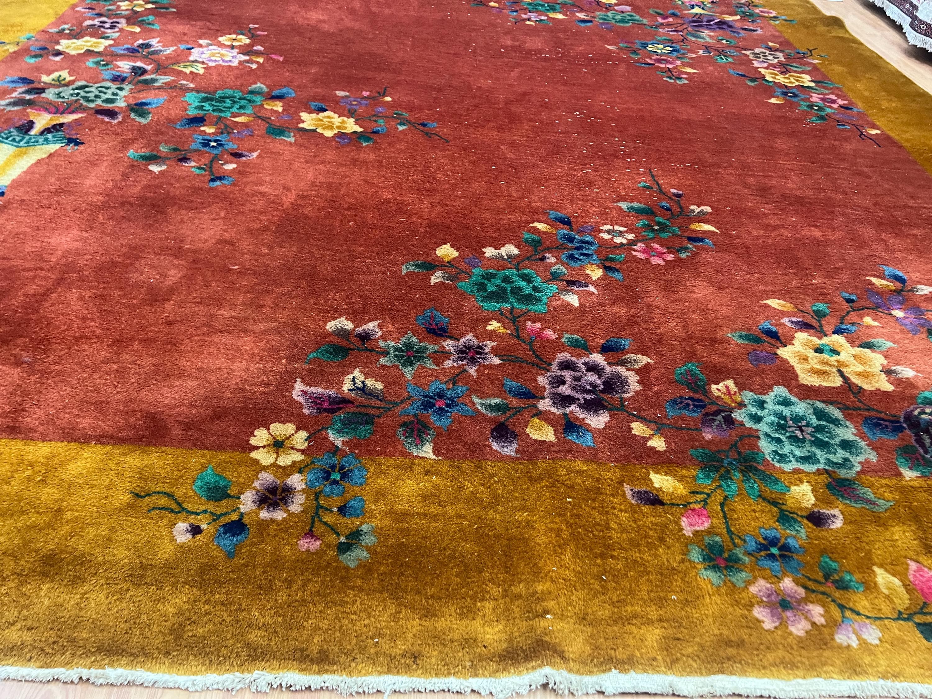 This beautiful Oriental rug is an antique 8'8" x 11'10" Chinese Art Deco, circa 1920s. This hand knotted rug is made with a 100% wool, has a full pile and is in good condition. This rug was recently professionally hand washed.