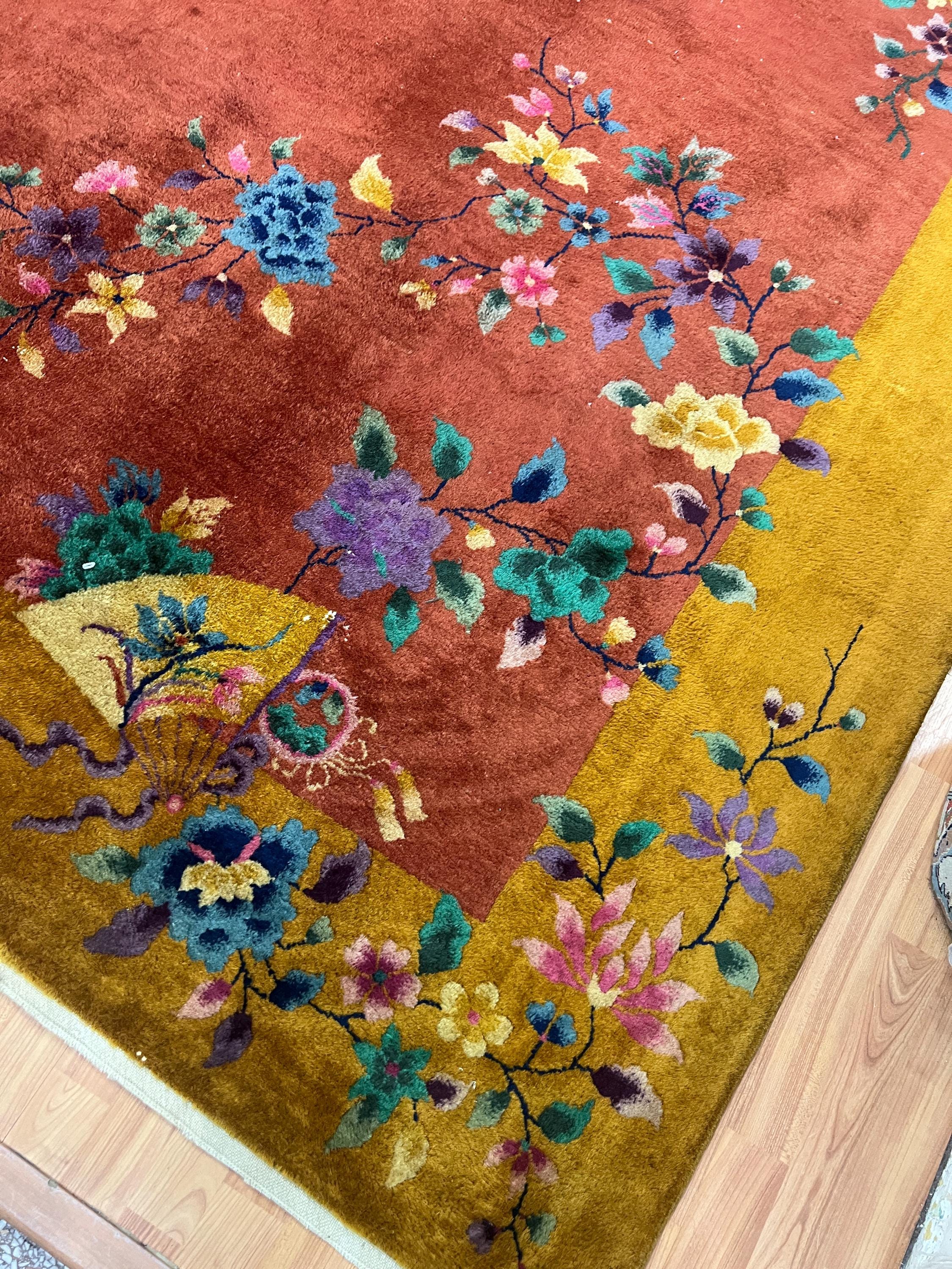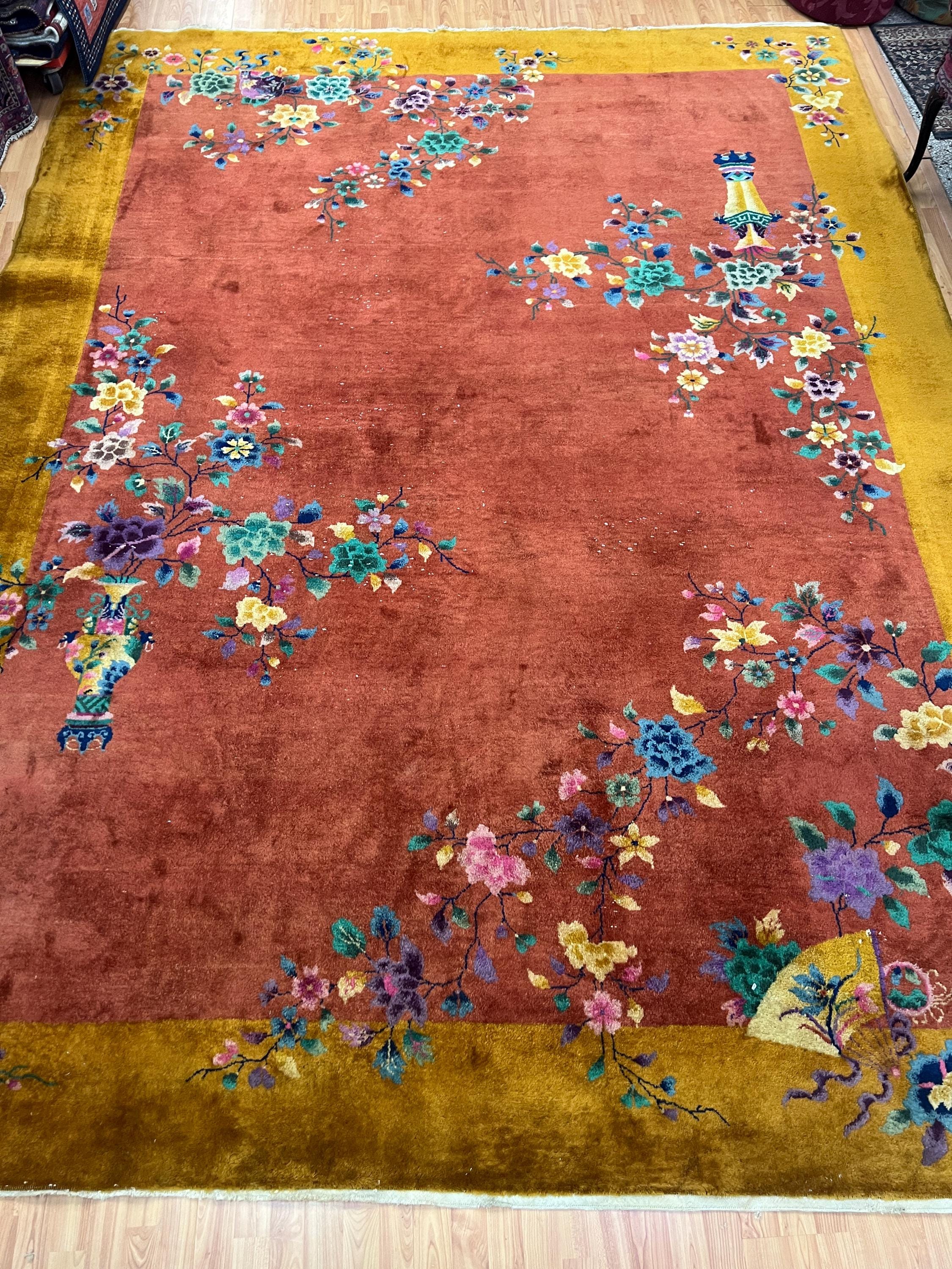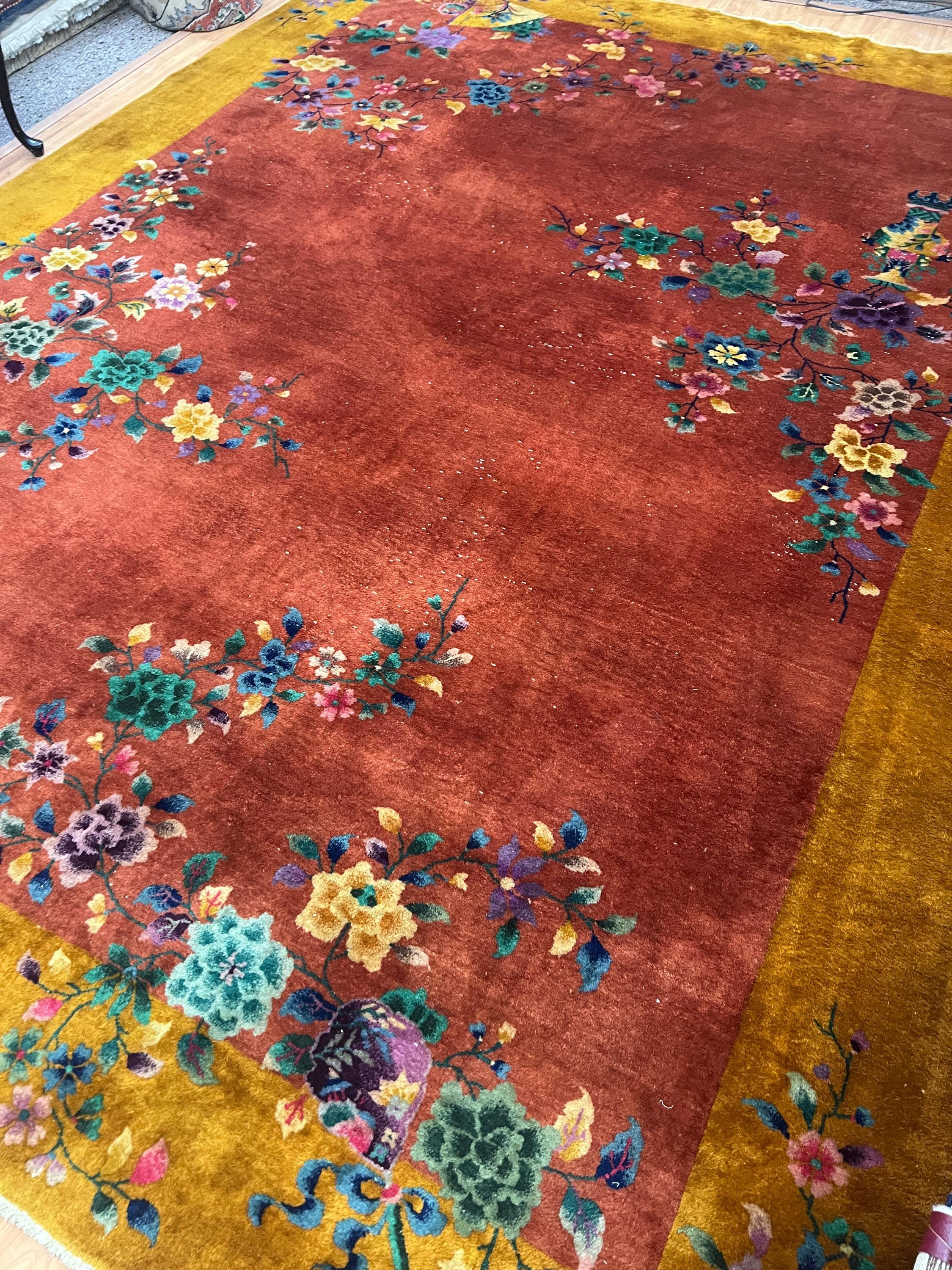 This beautiful Oriental rug is an antique 8'8" x 11'10" Chinese Art Deco, circa 1920s. This hand knotted rug is made with a 100% wool, has a full pile and is in good condition. This rug was recently professionally hand washed.