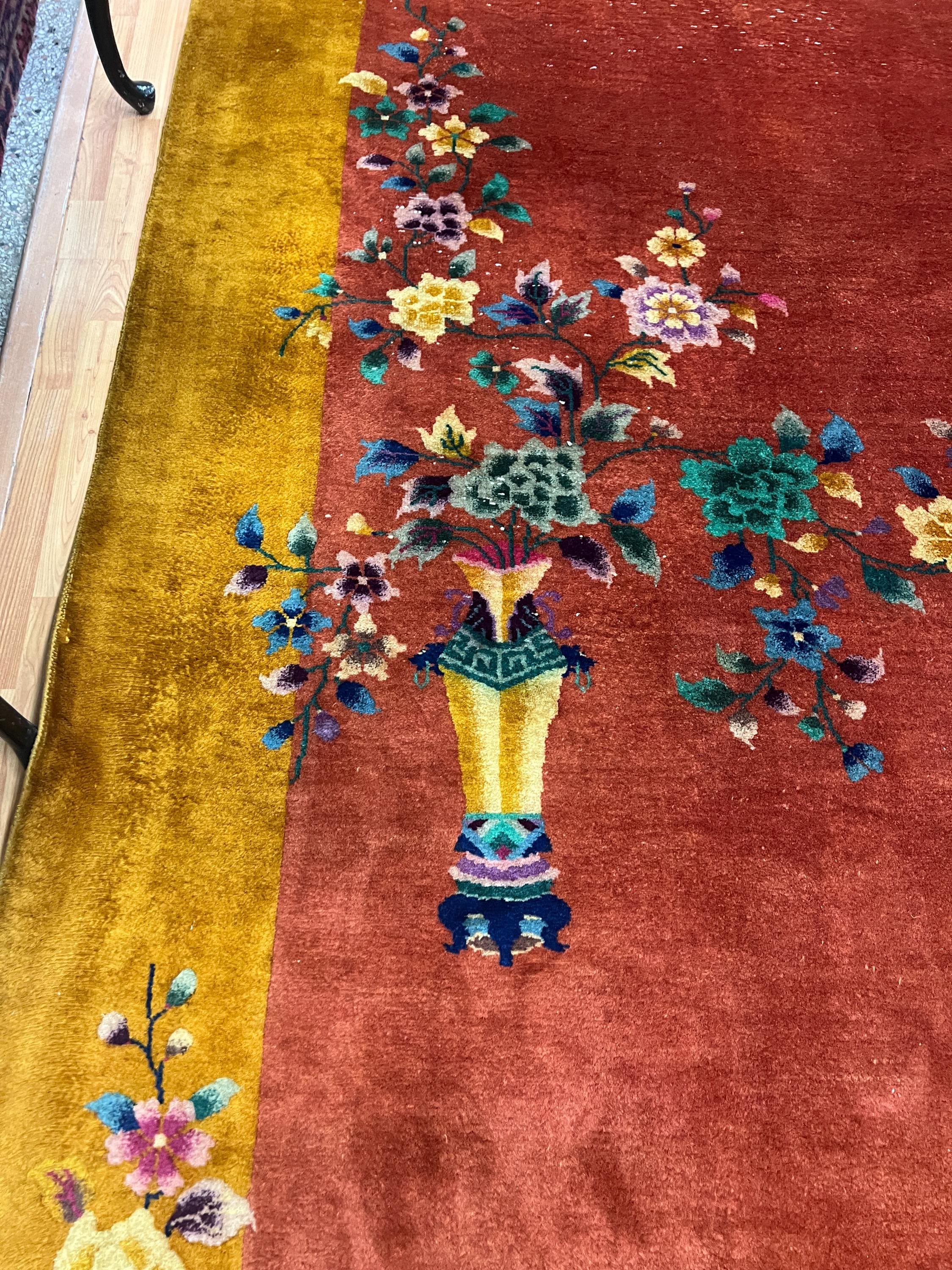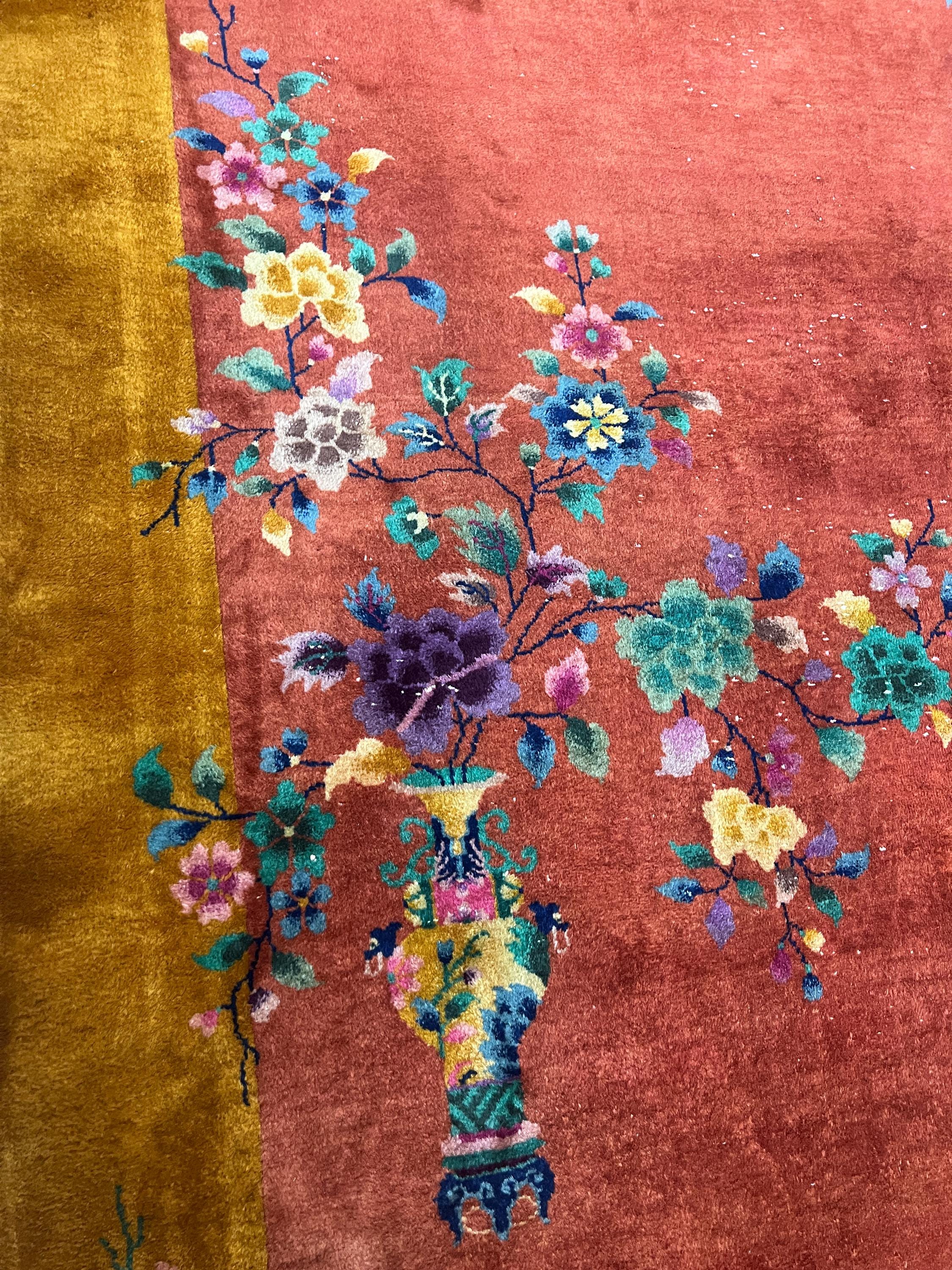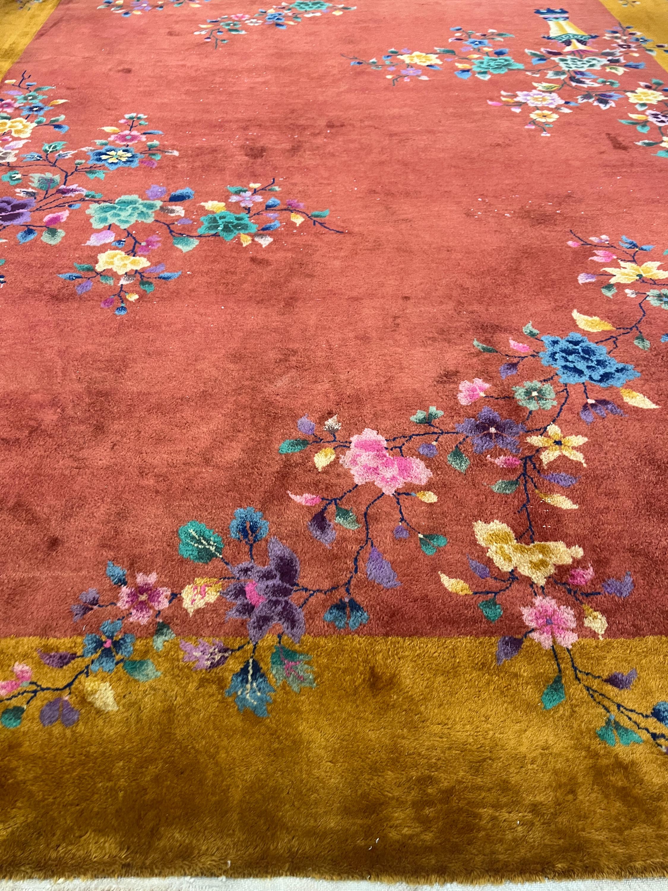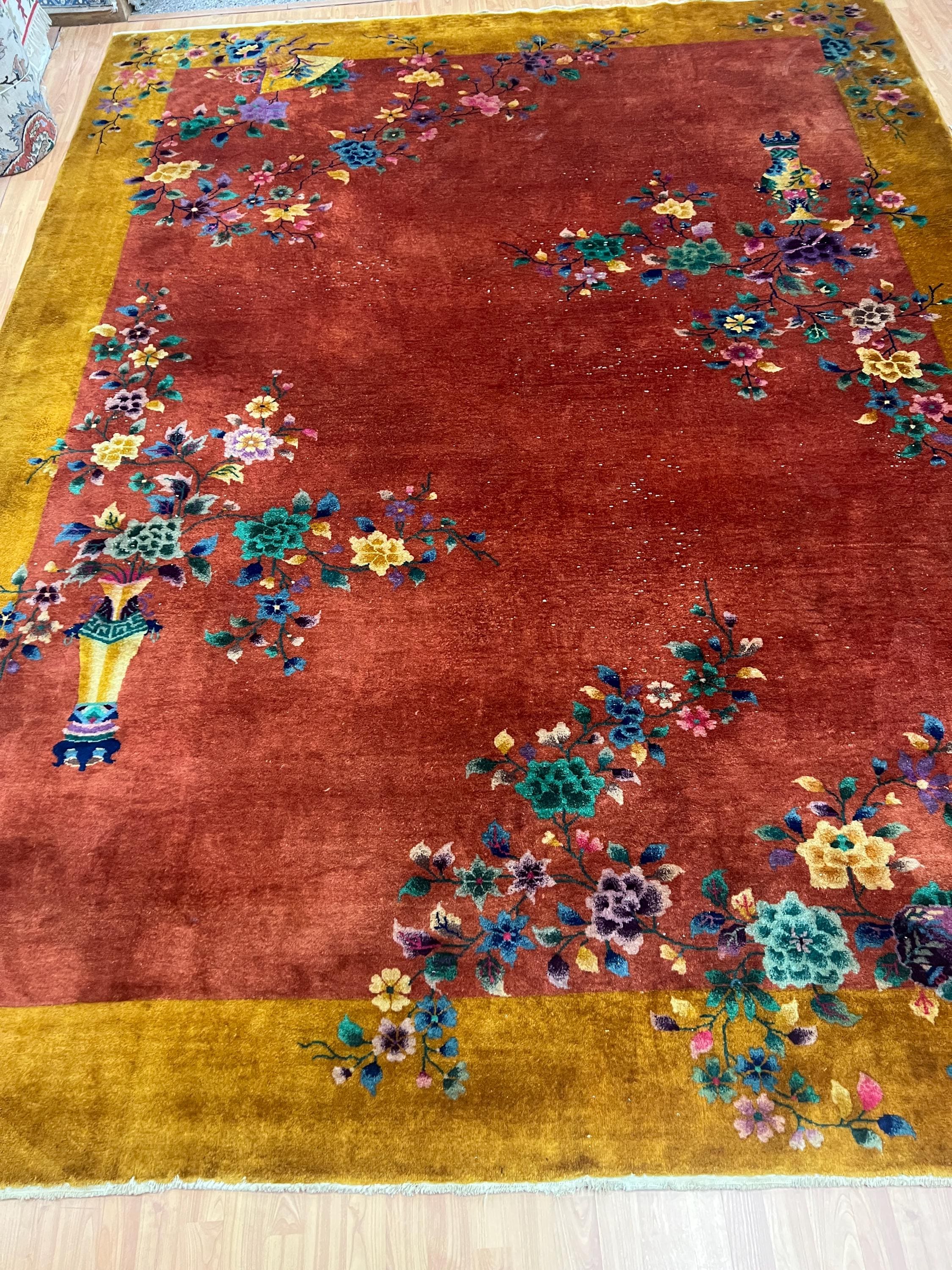 This beautiful Oriental rug is an antique 8'8" x 11'10" Chinese Art Deco, circa 1920s. This hand knotted rug is made with a 100% wool, has a full pile and is in good condition. This rug was recently professionally hand washed.
