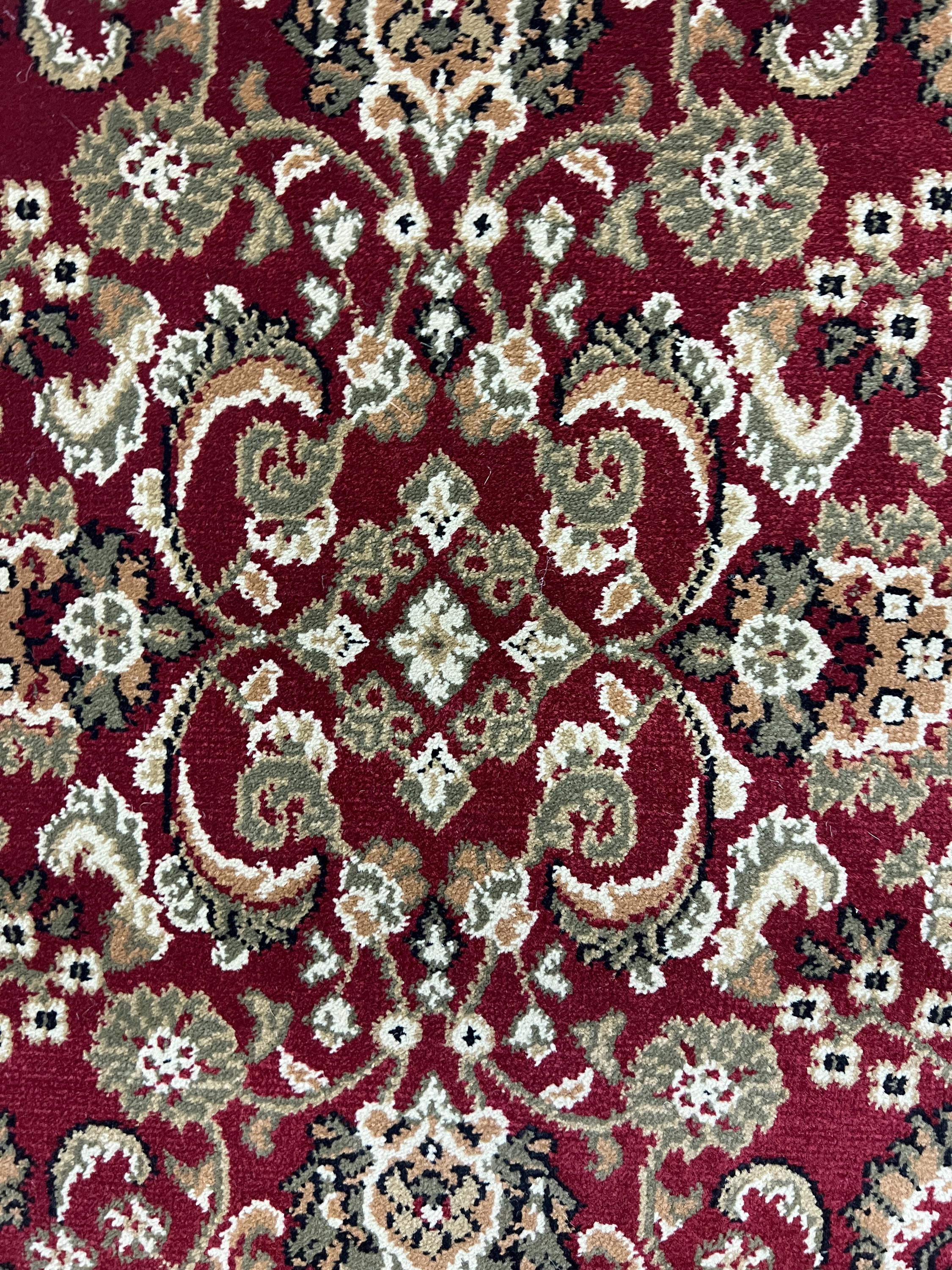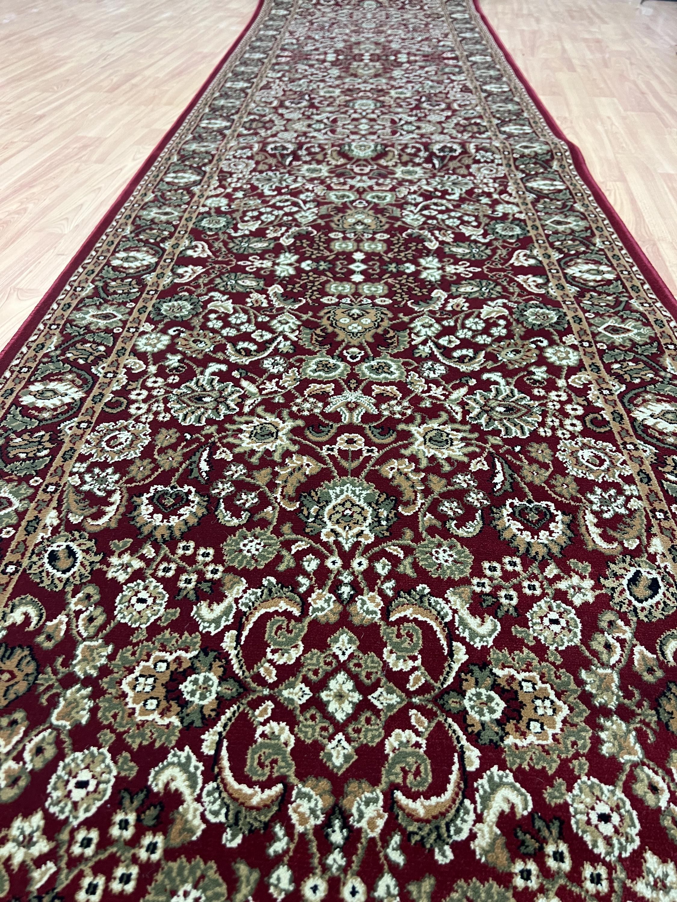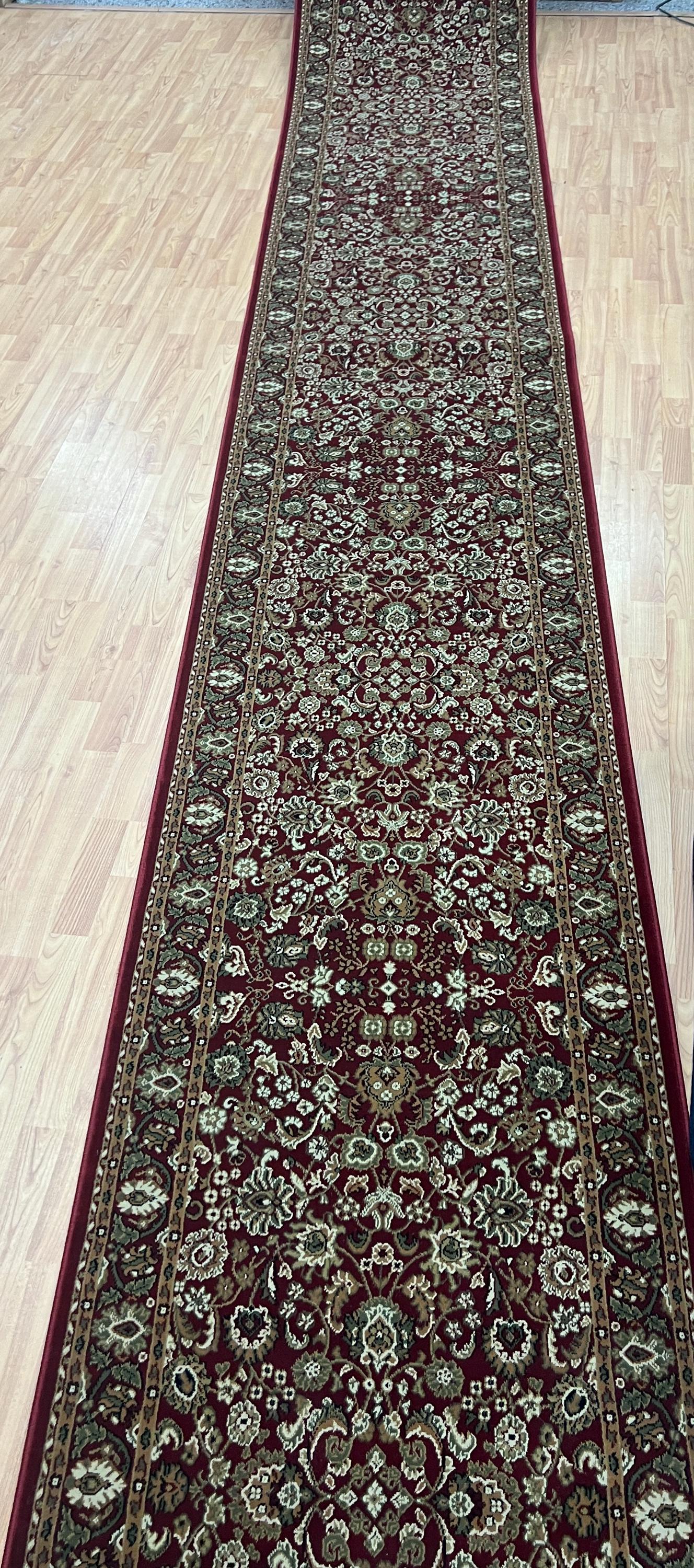 This marvelous Oriental rug is brand new 2'7" x 27'1" Turkish floor runner. This machine made runner is made with 100% wool and has a full pile.