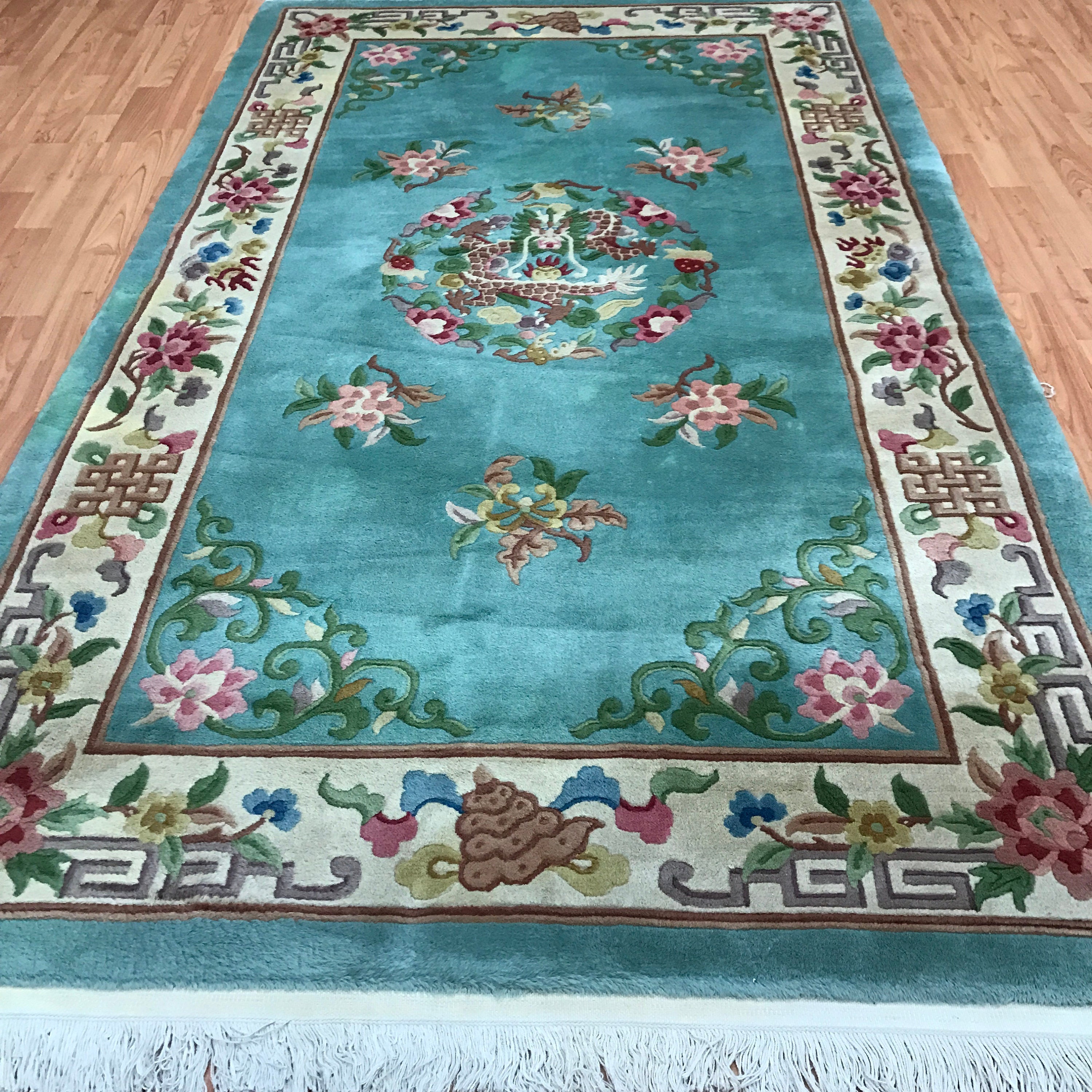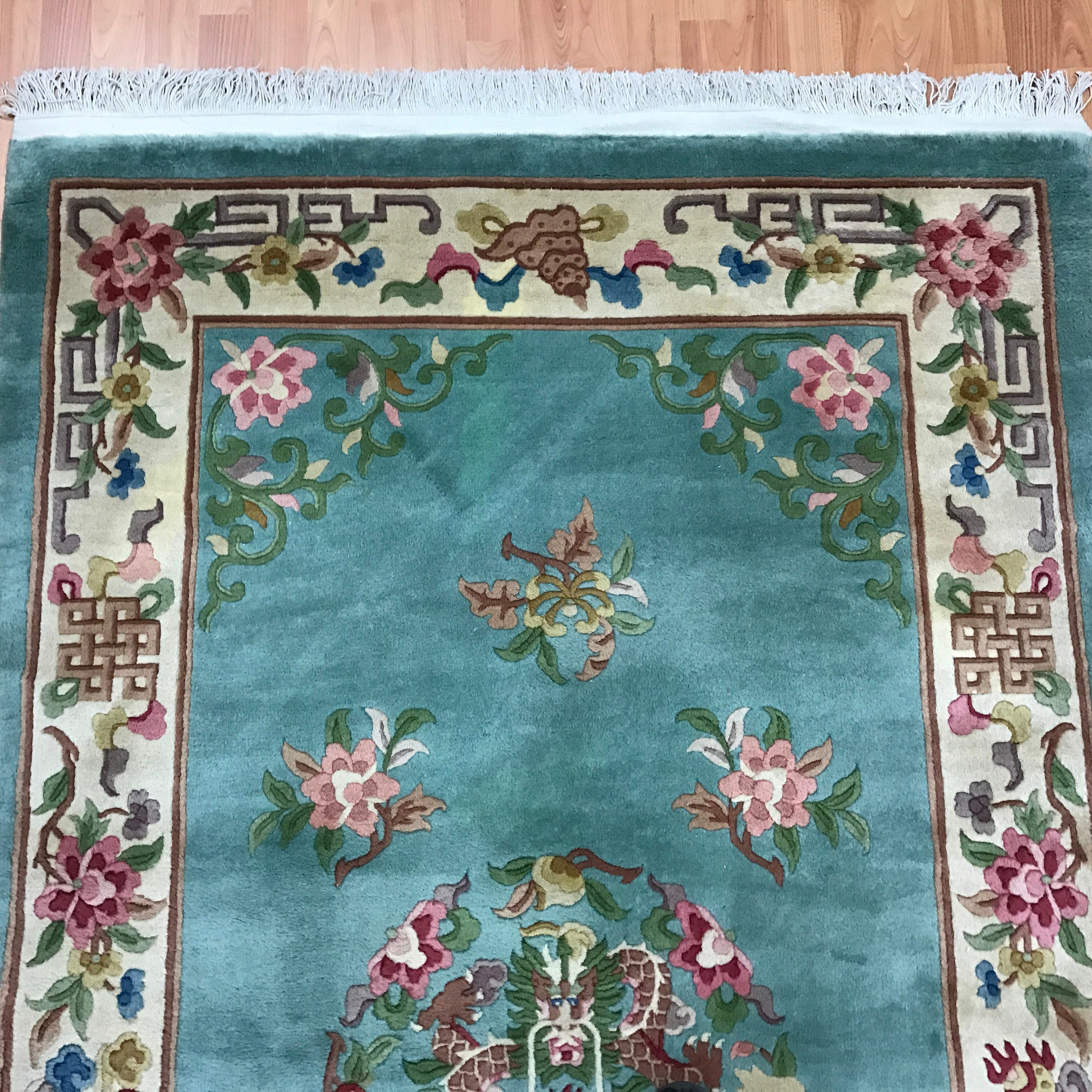 This beautiful Oriental rug is a 4' x 7' Chinese Art Deco with a dragon design. This hand knotted Chinese rug is made with 100% wool and is in good condition.