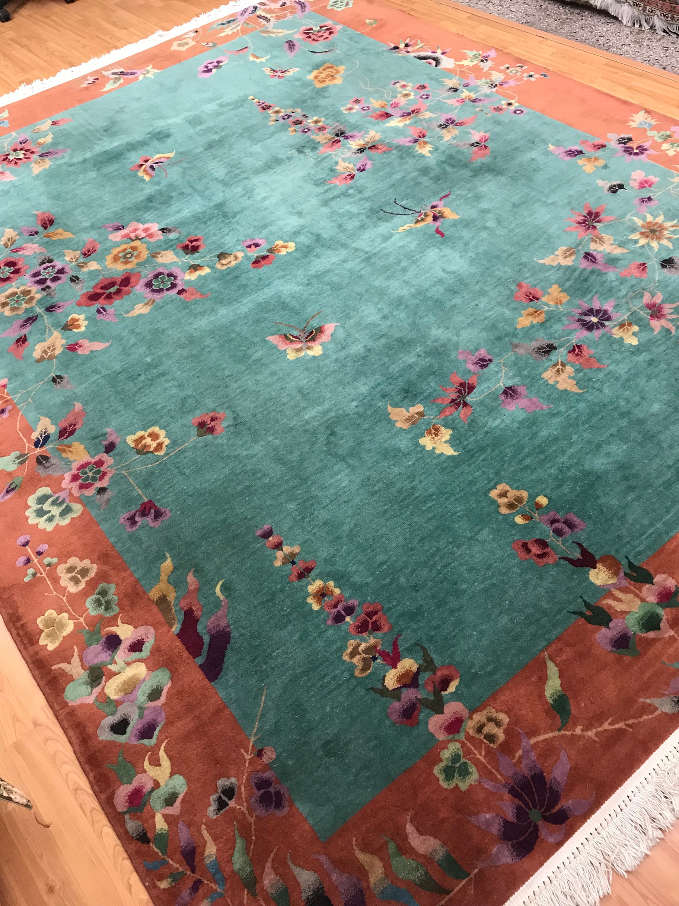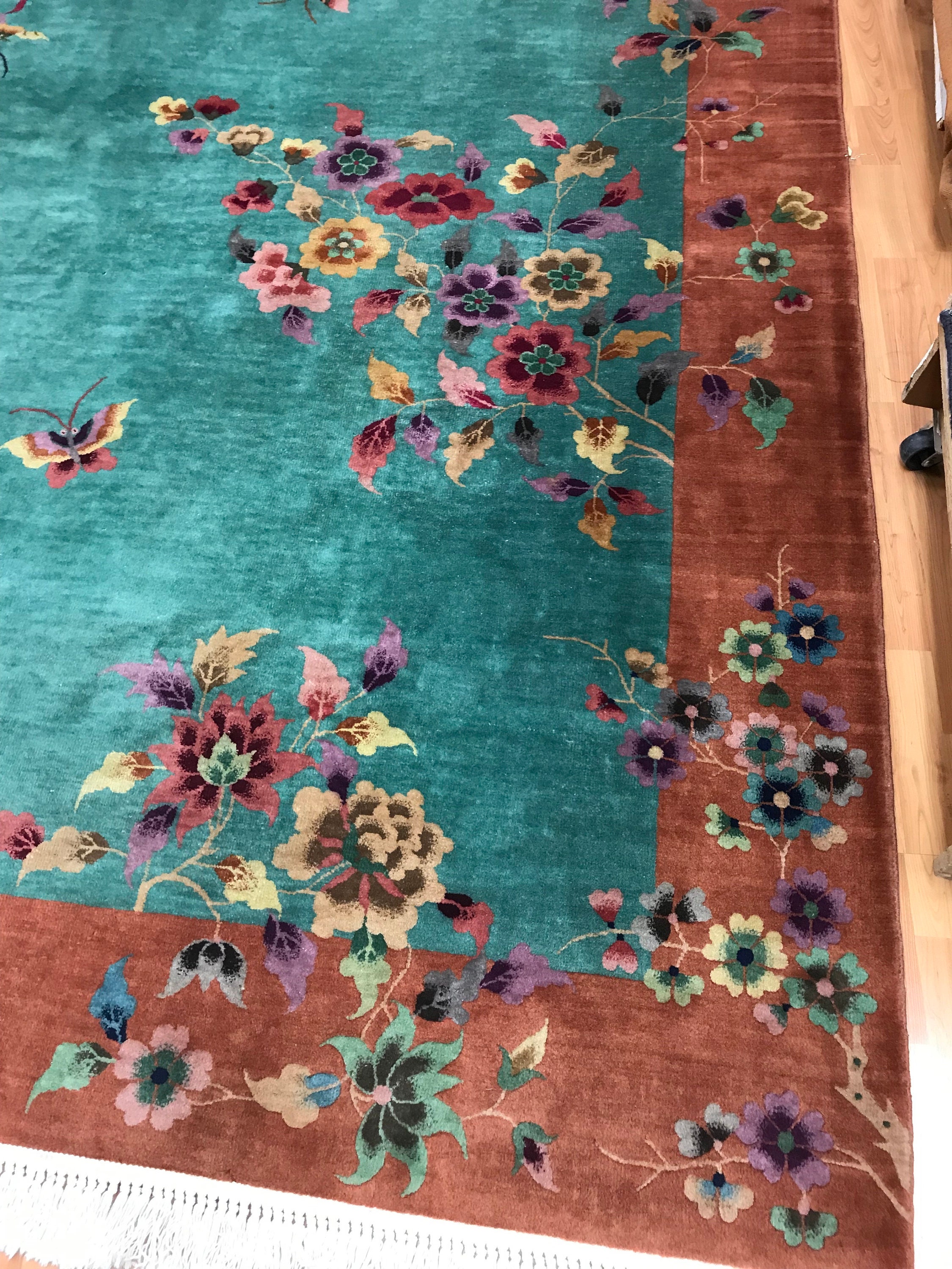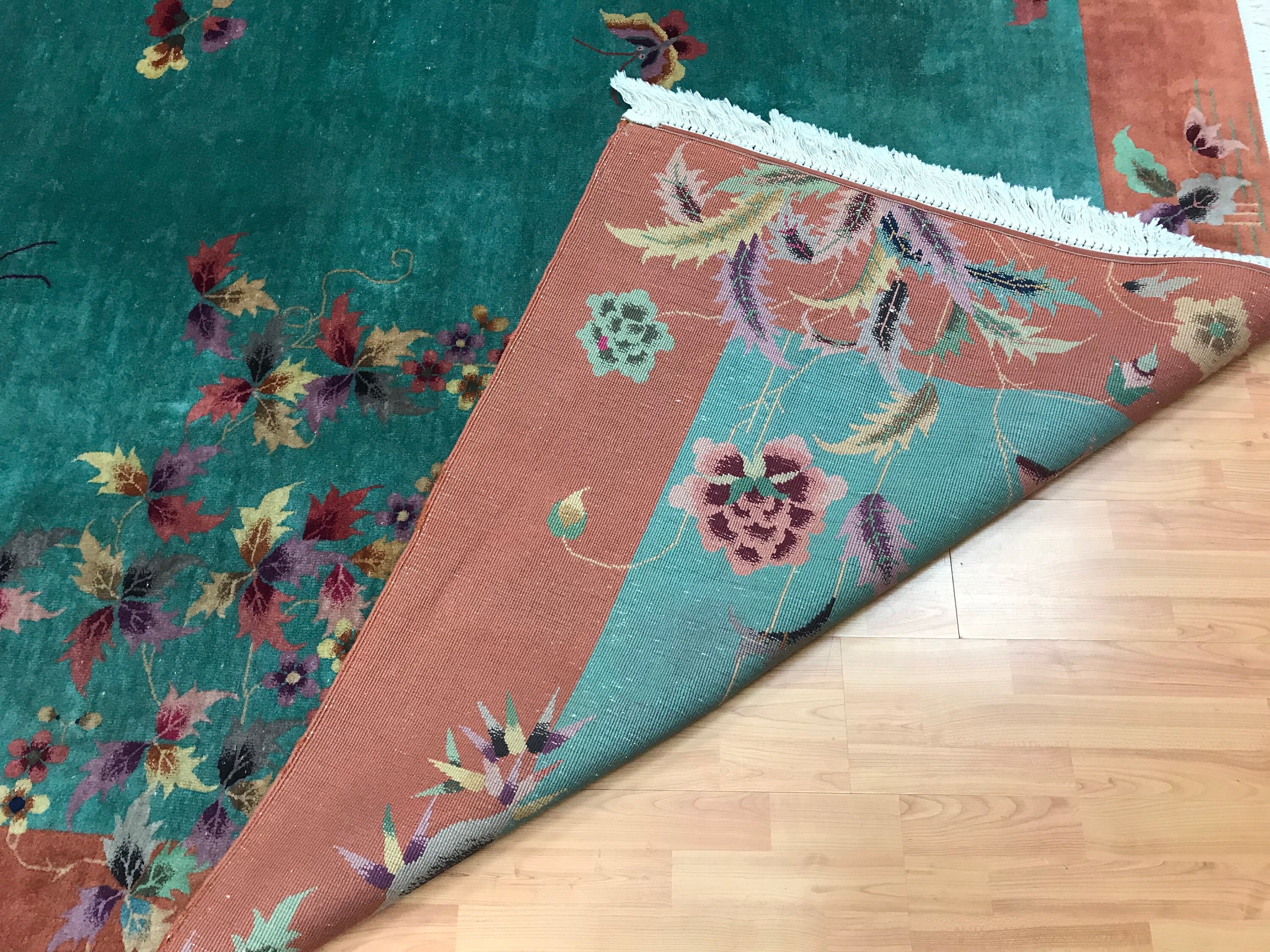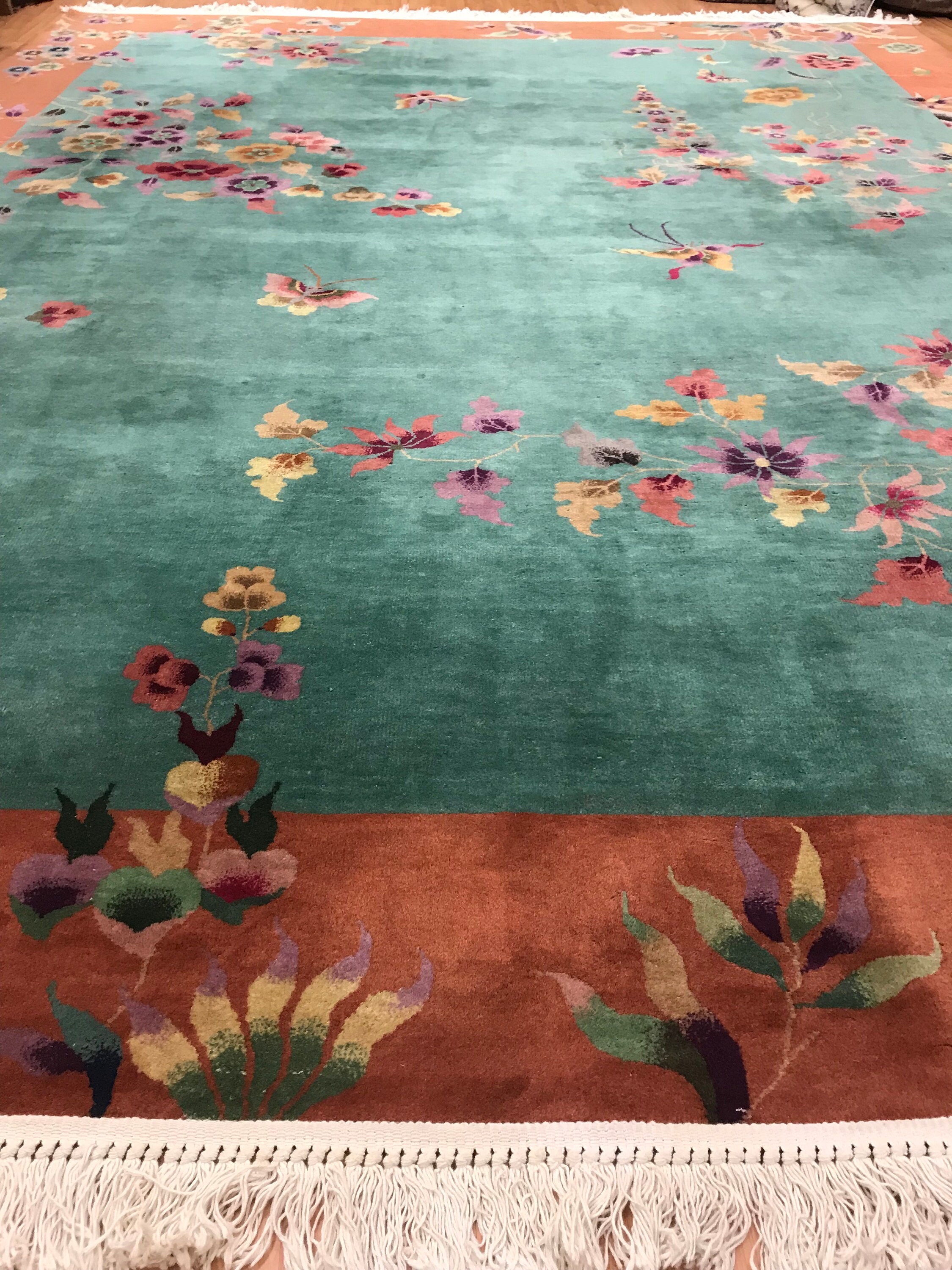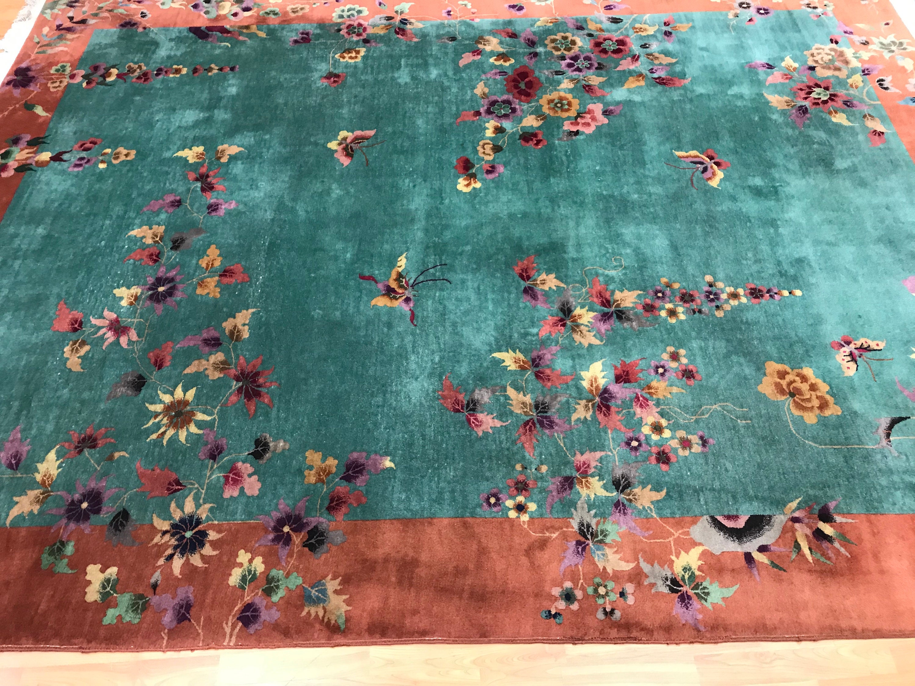 This beautiful Oriental rug is an antique 8'9" x 11'5" Chinese Art Deco, circa 1930s. This hand knotted Chinese rug has a beautiful traditional Chinese design and is made with a 100% wool. This Chinese Art Deco rug is in good condition and has had a new fringe put on it.