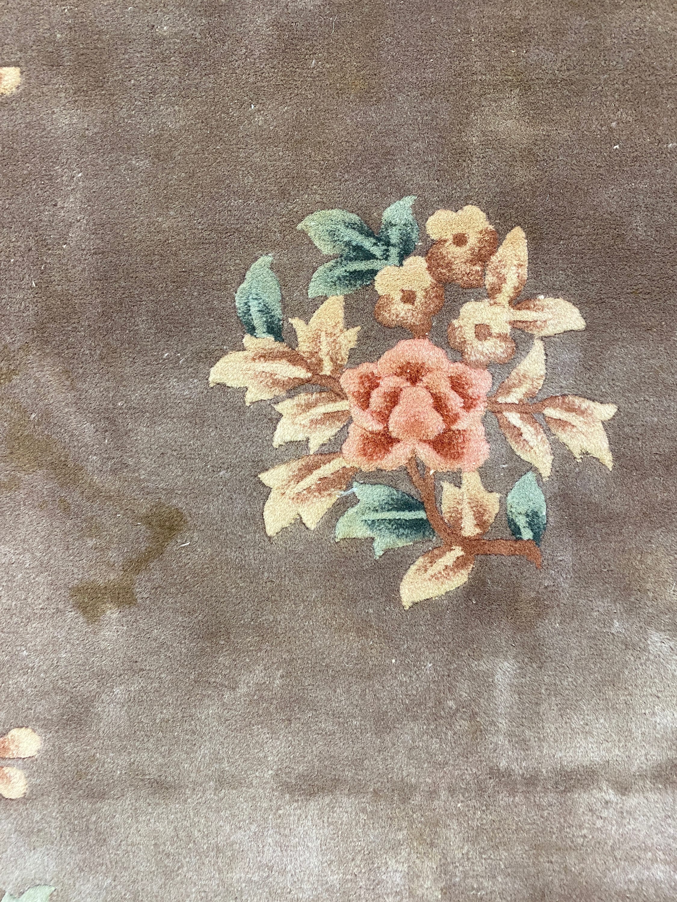 This beautiful Oriental rug is a 8' x 10' Chinese Aubusson, circa 1990s. This hand made Chinese rug is made with 100% wool, is in good condition and was recently hand washed. This rug has one spot on it, as can be seen in the picture.